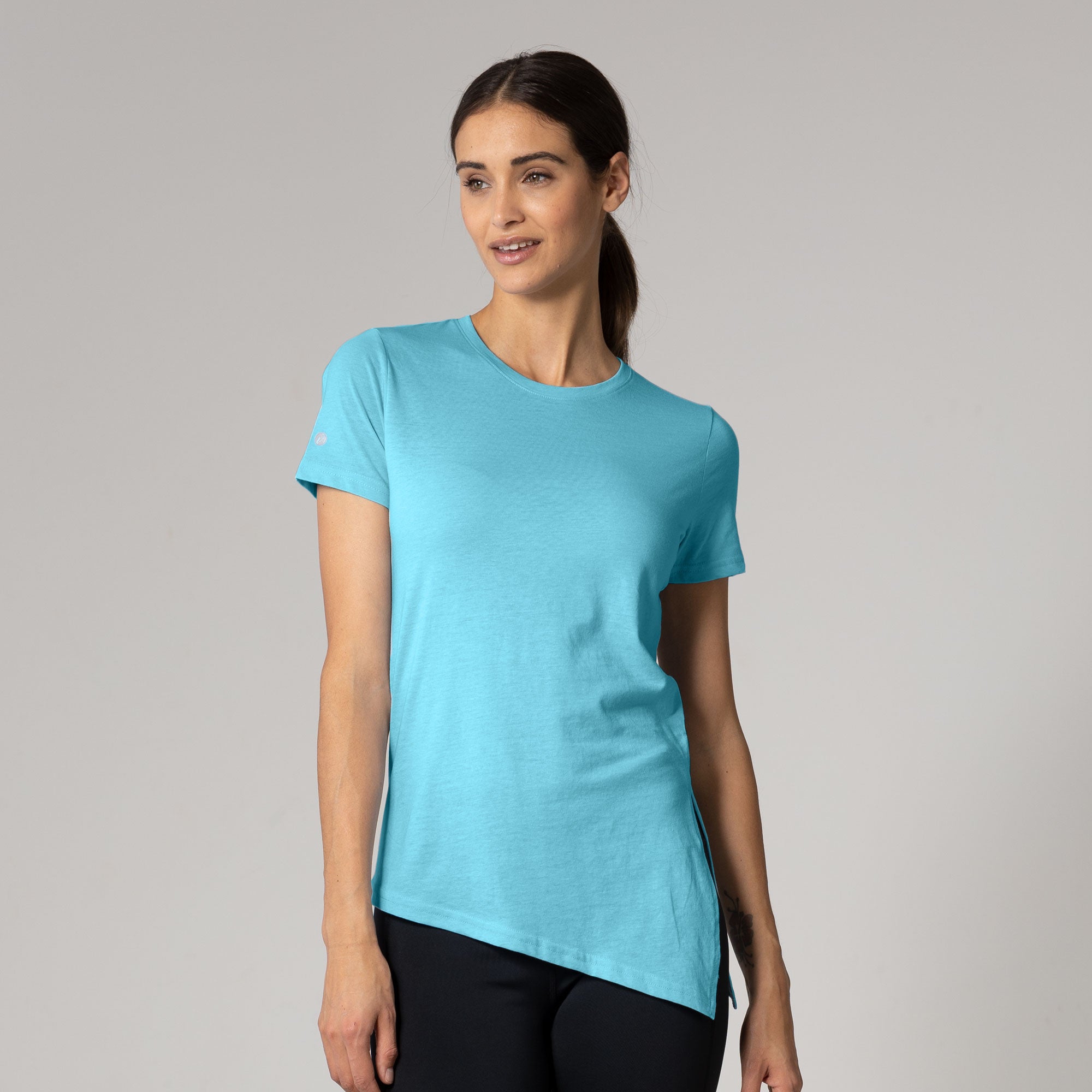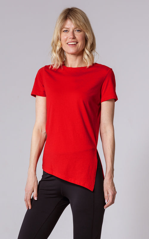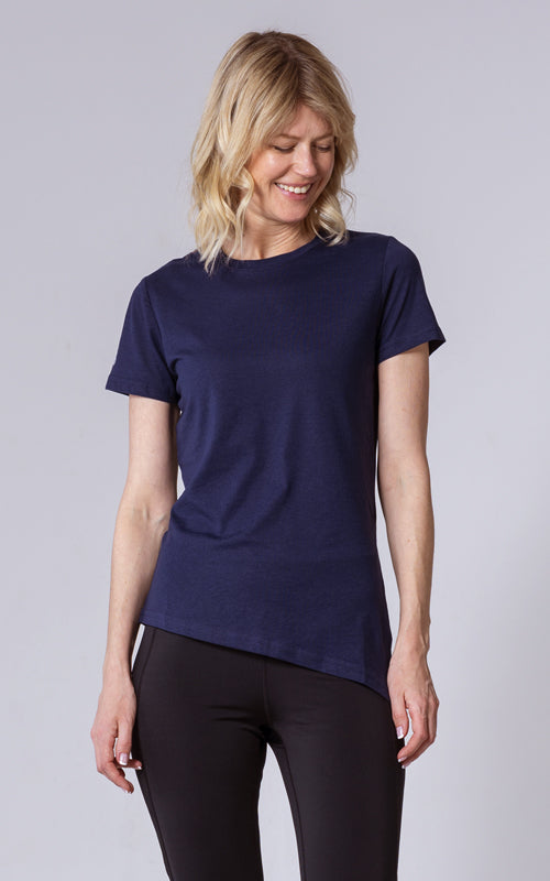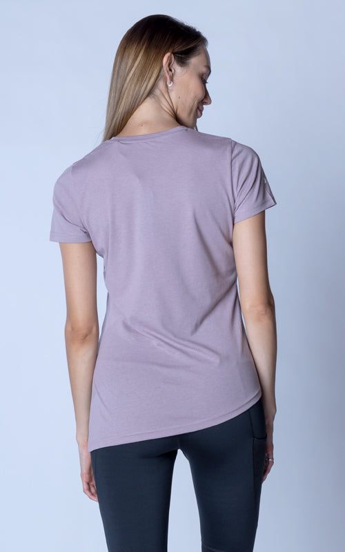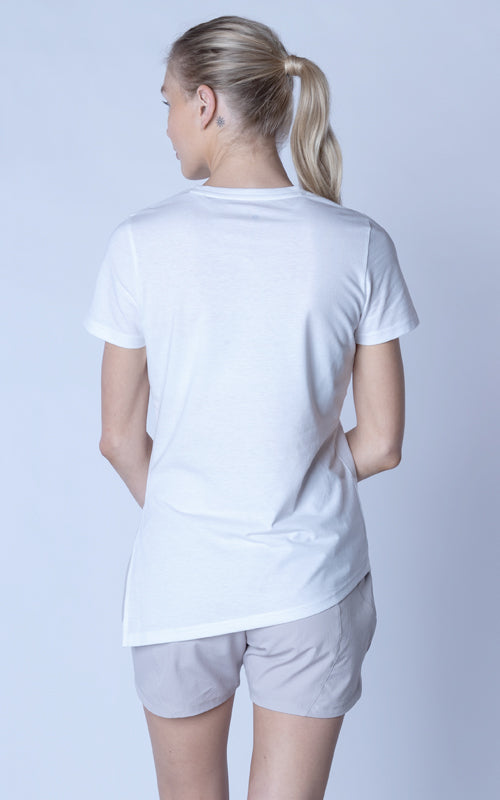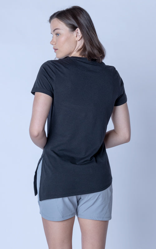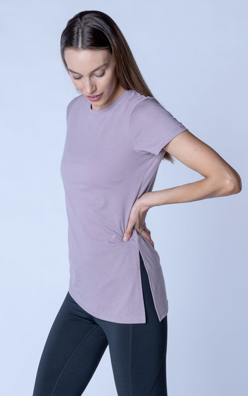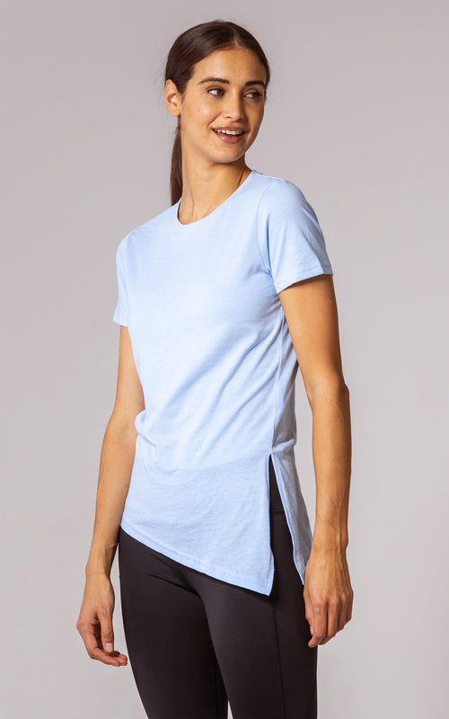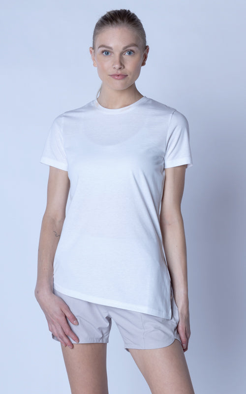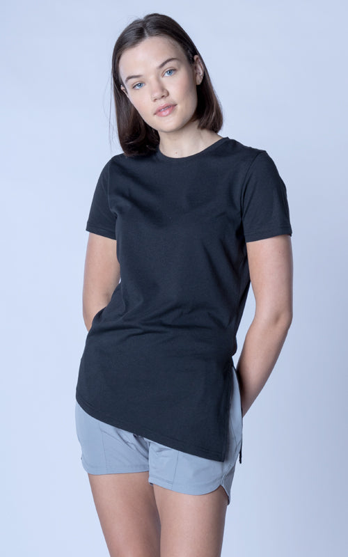 The Birch t-shirt offers a unique twist on the classic crew neck design, combining casual elegance with functional style. Made from a soft blend of 65% polyester and 35% cotton, this t-shirt provides a comfortable feel with the added benefit of performance-ready fabric. The standout feature is its asymmetrical hem with a long side slit, which introduces a touch of flair and versatility to your wardrobe. You can wear it open for a relaxed, flowing look or tie it at the side for a more defined silhouette. Perfect for both active and leisurely days, the Birch T-Shirt is designed to keep you comfortable while offering multiple styling options.