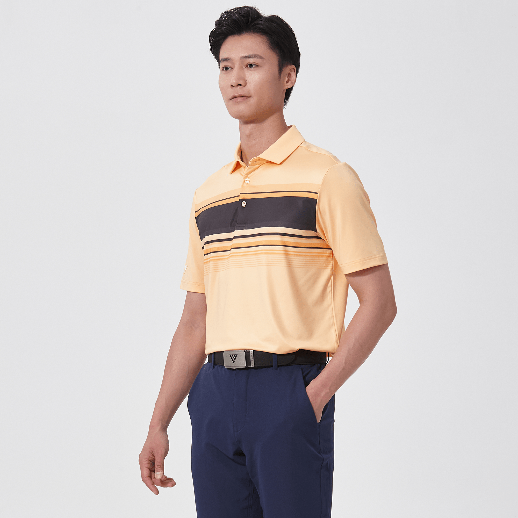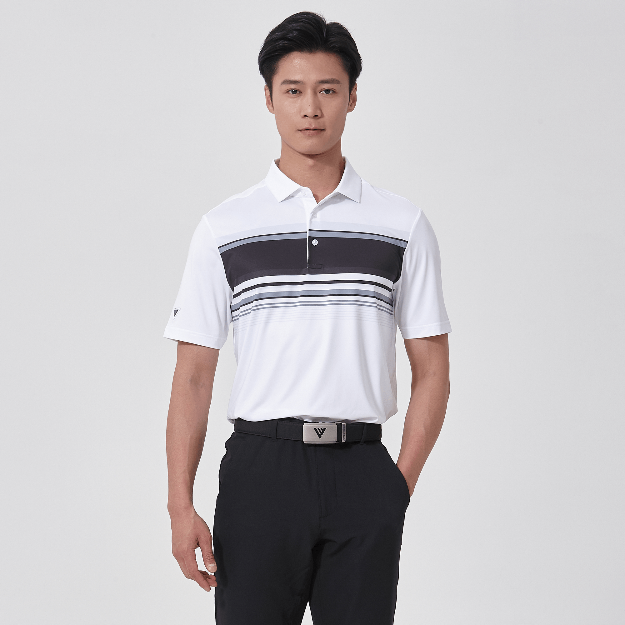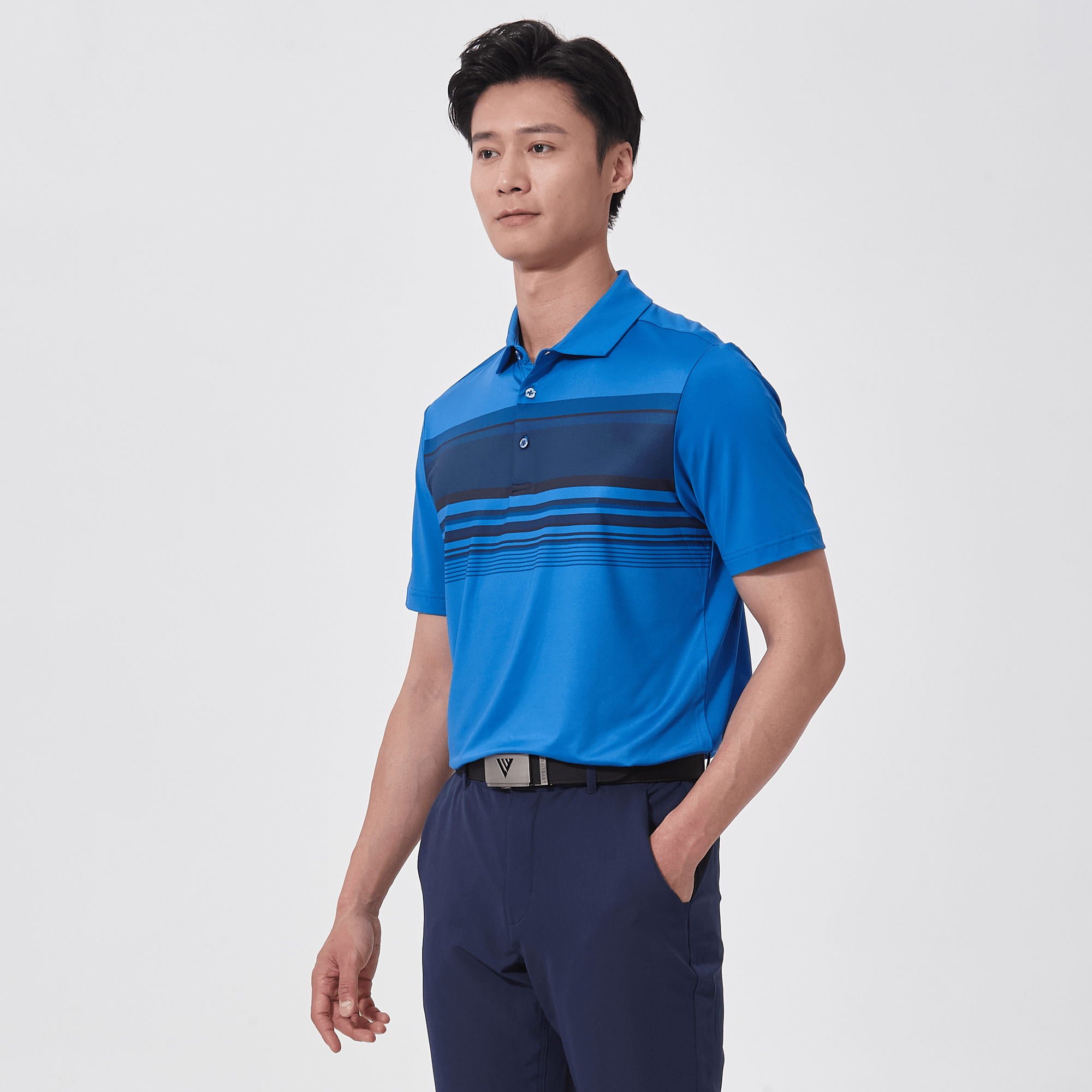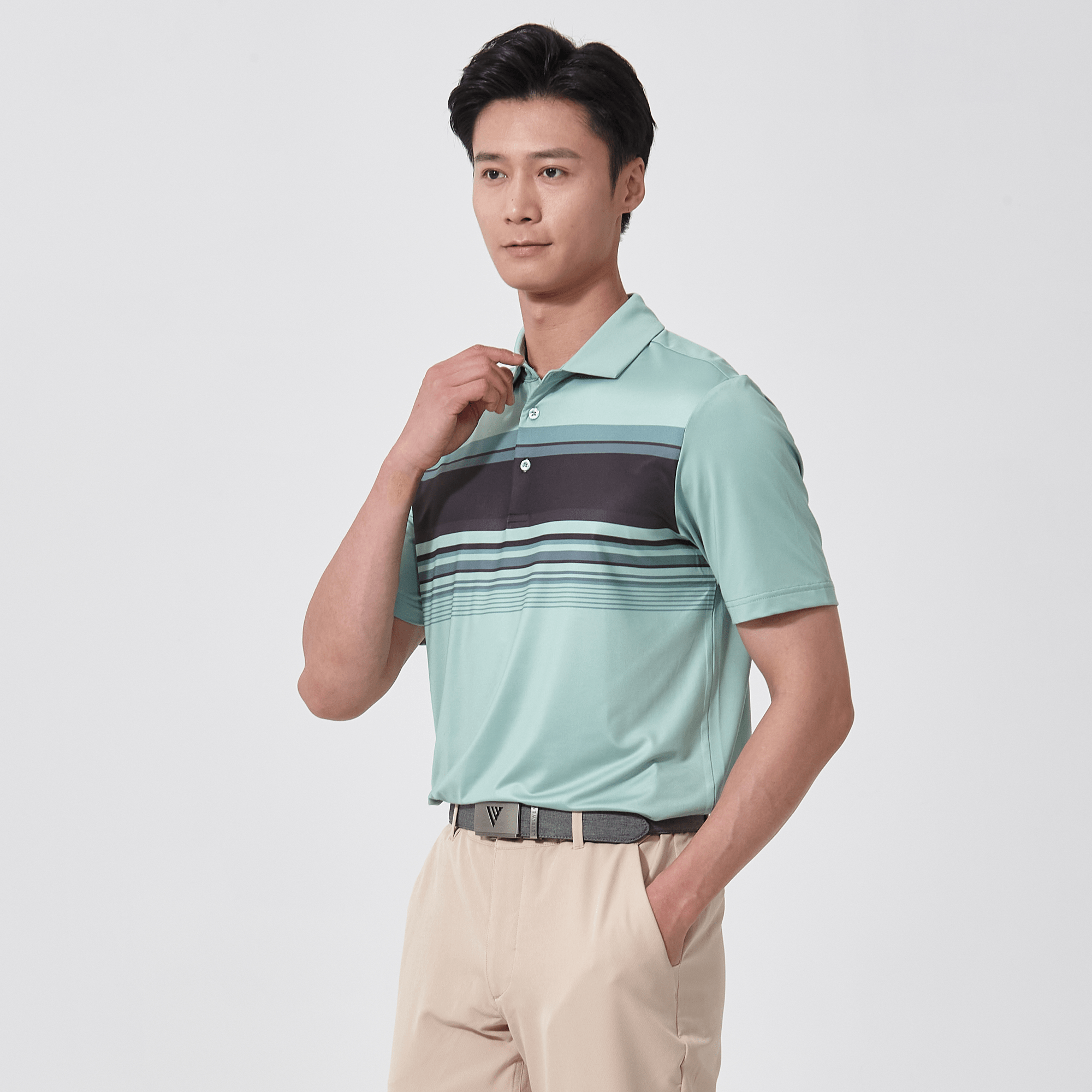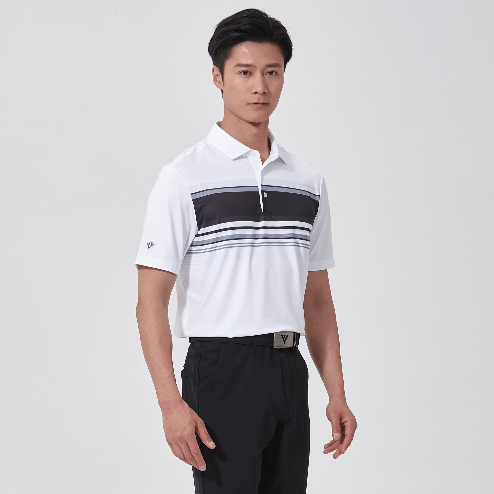 Elevate your game with the Onward men's polo, designed for avid golfers. This shirt features UPF50+ protection and moisture-wicking technology to keep you dry and shielded on sunny days. Its anti-bacterial properties ensure lasting freshness during play. The stylish stripe print across the front chest and a neat self-fabric collar with a built-in collar stay enhance its sophisticated and classic appearance. Tailored with a high-low hem and side slits for greater mobility, this polo is made from 92% recycled polyester and 8% spandex, blending eco-conscious fashion with functional design.