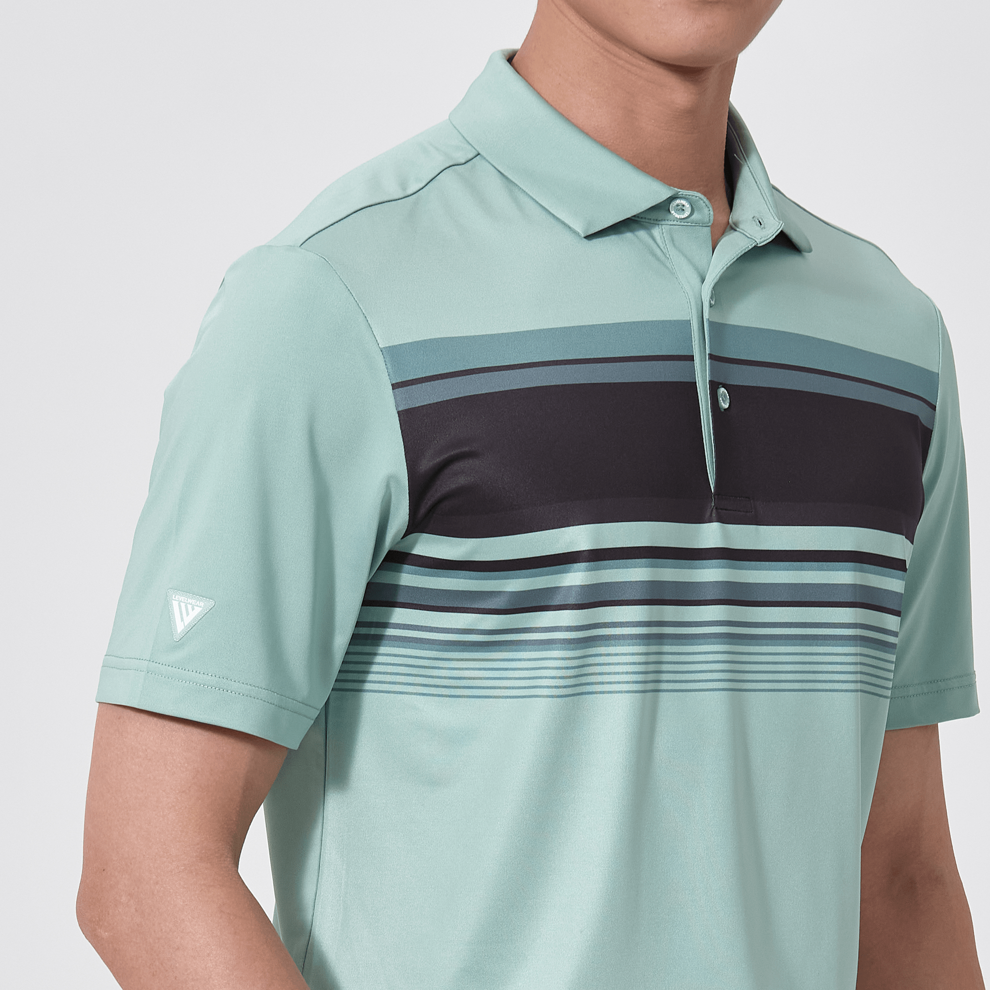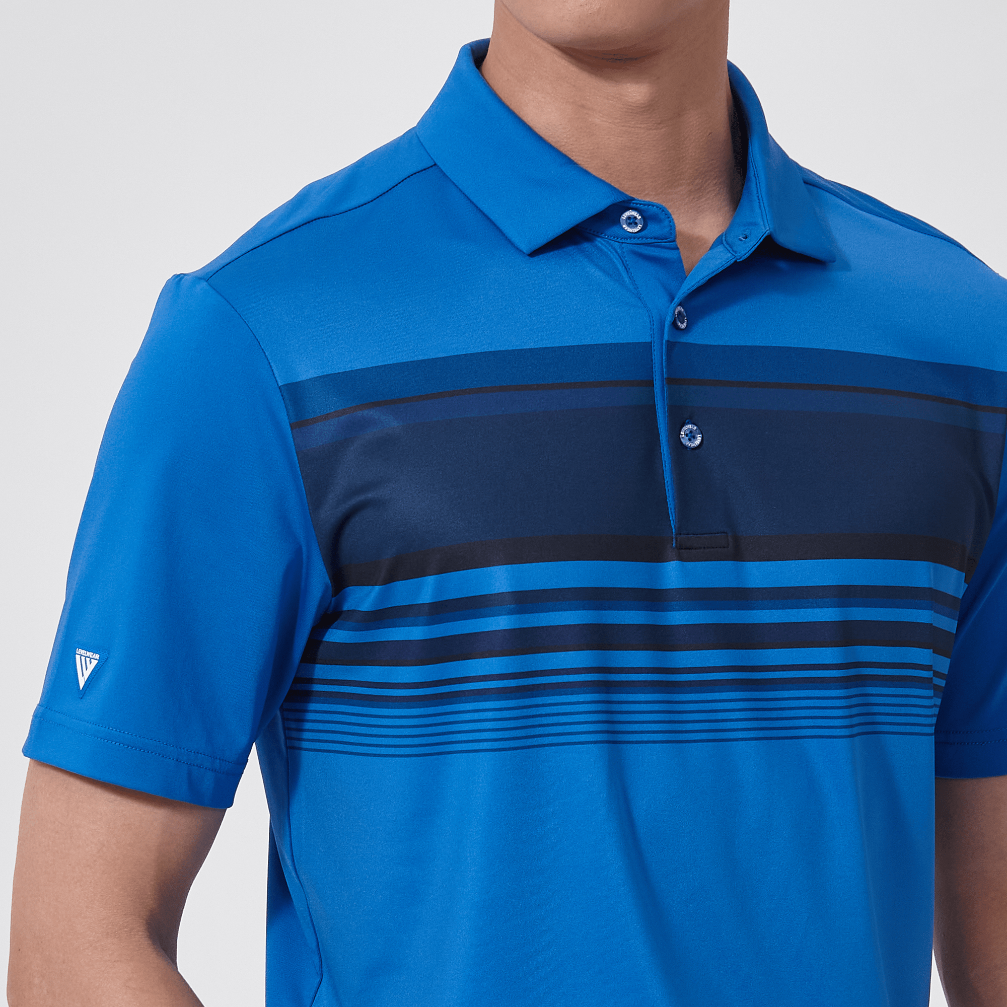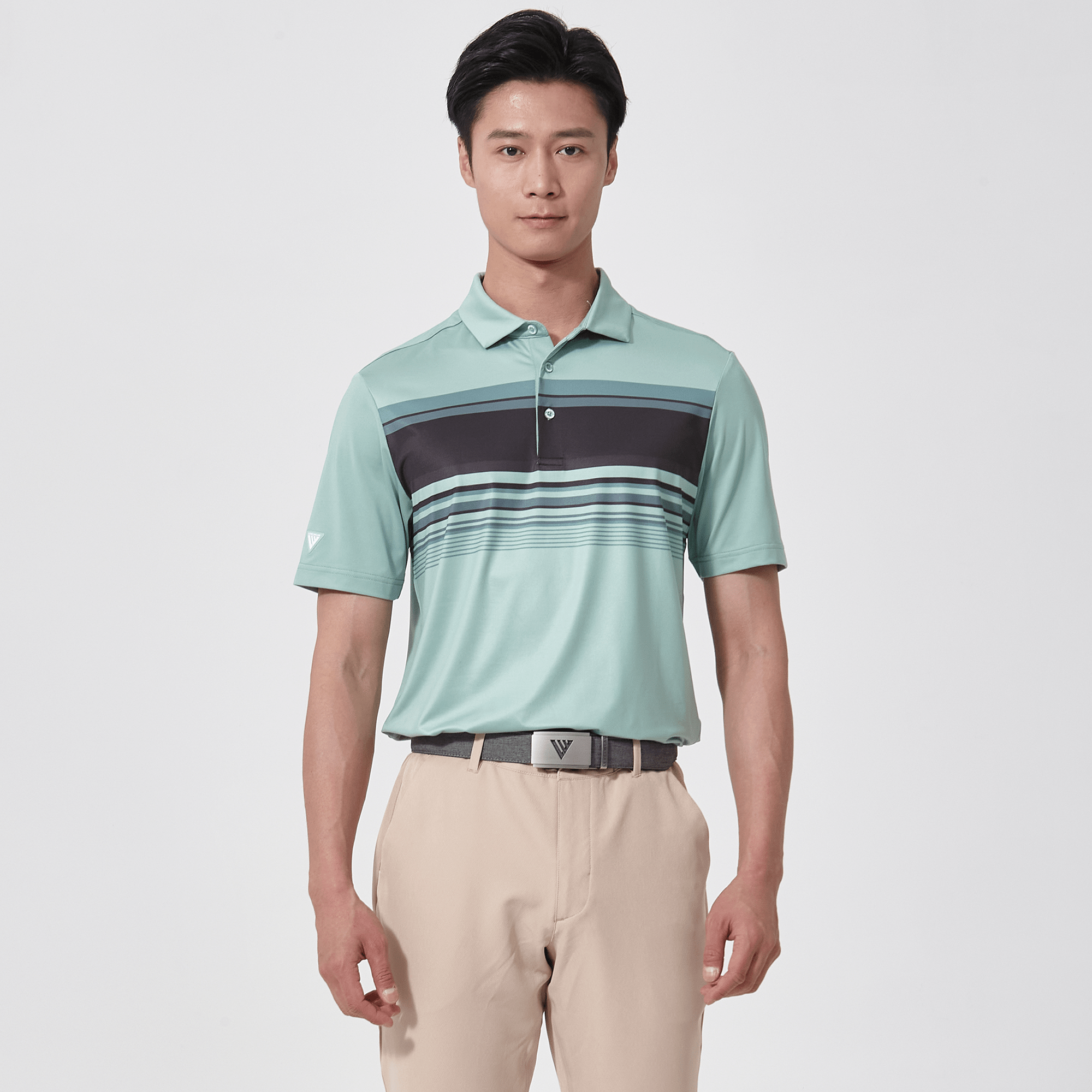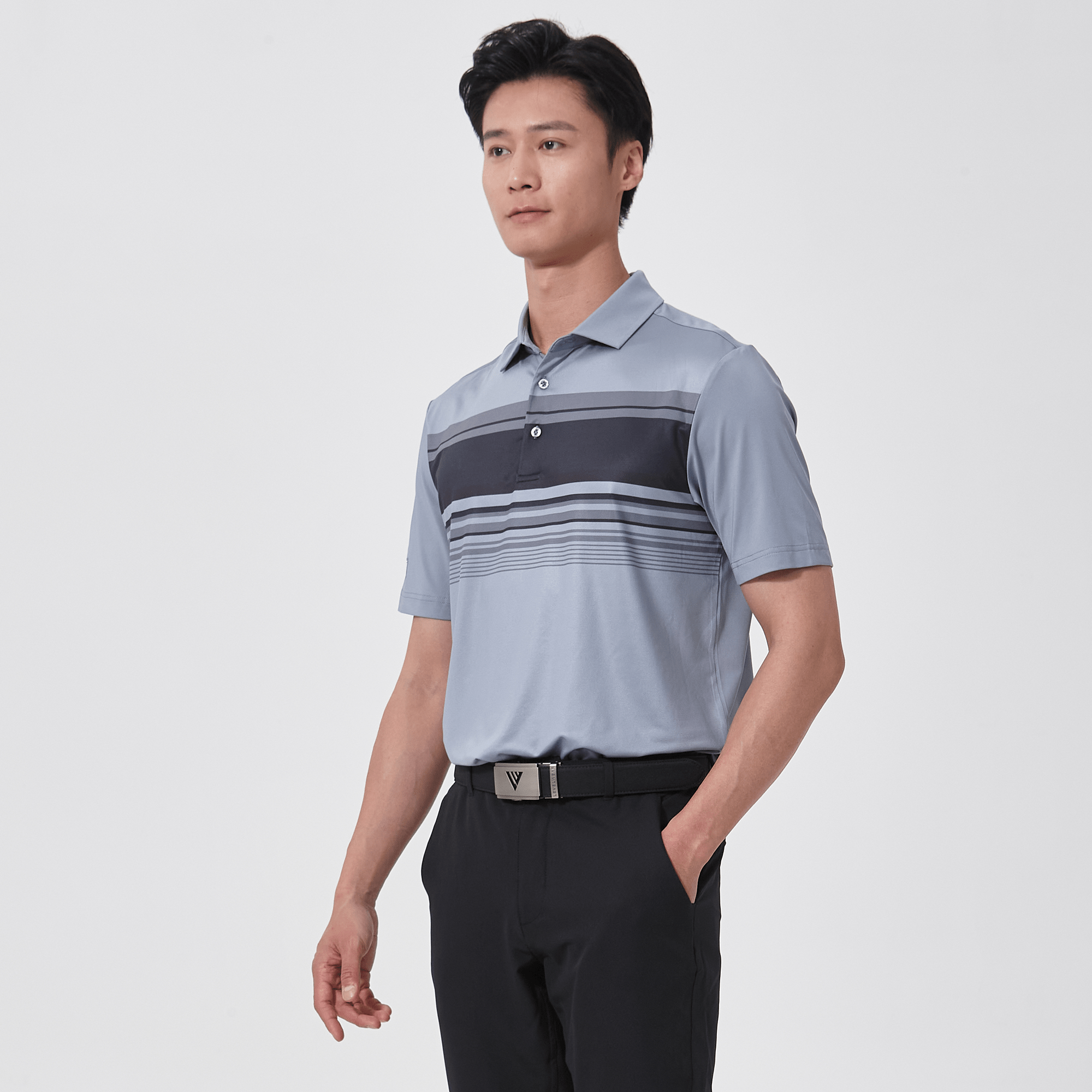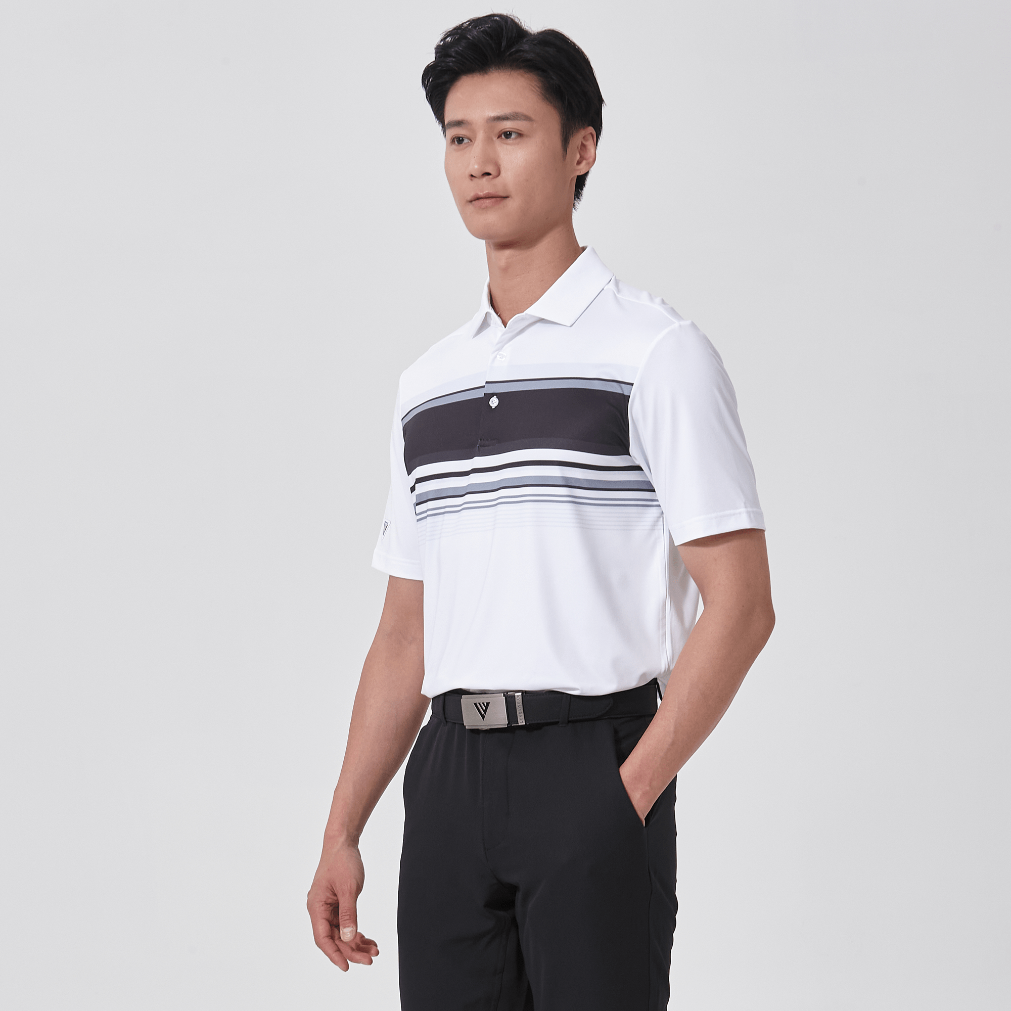 Elevate your game with the Onward men's polo, designed for avid golfers. This shirt features UPF50+ protection and moisture-wicking technology to keep you dry and shielded on sunny days. Its anti-bacterial properties ensure lasting freshness during play. The stylish stripe print across the front chest and a neat self-fabric collar with a built-in collar stay enhance its sophisticated and classic appearance. Tailored with a high-low hem and side slits for greater mobility, this polo is made from 92% recycled polyester and 8% spandex, blending eco-conscious fashion with functional design.
