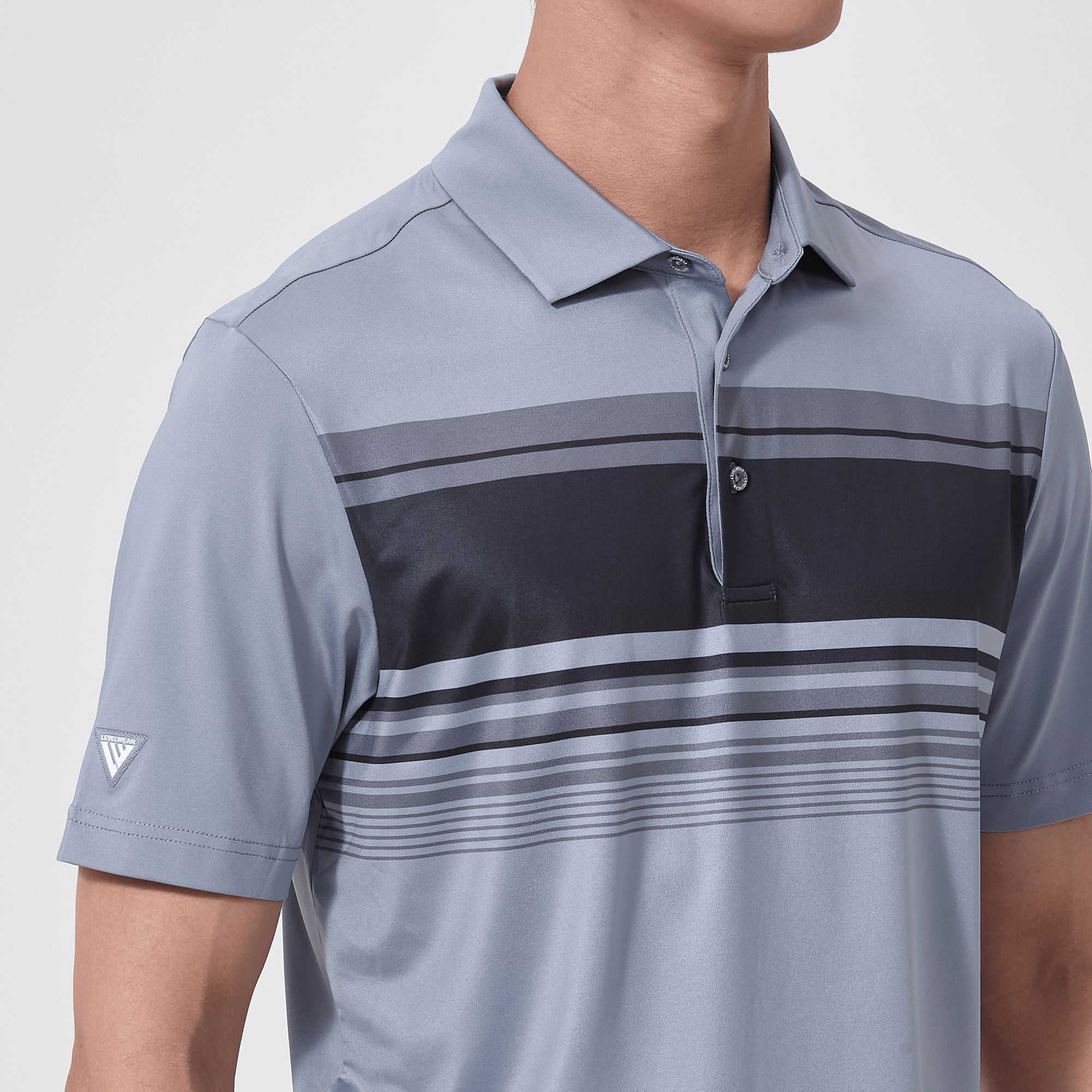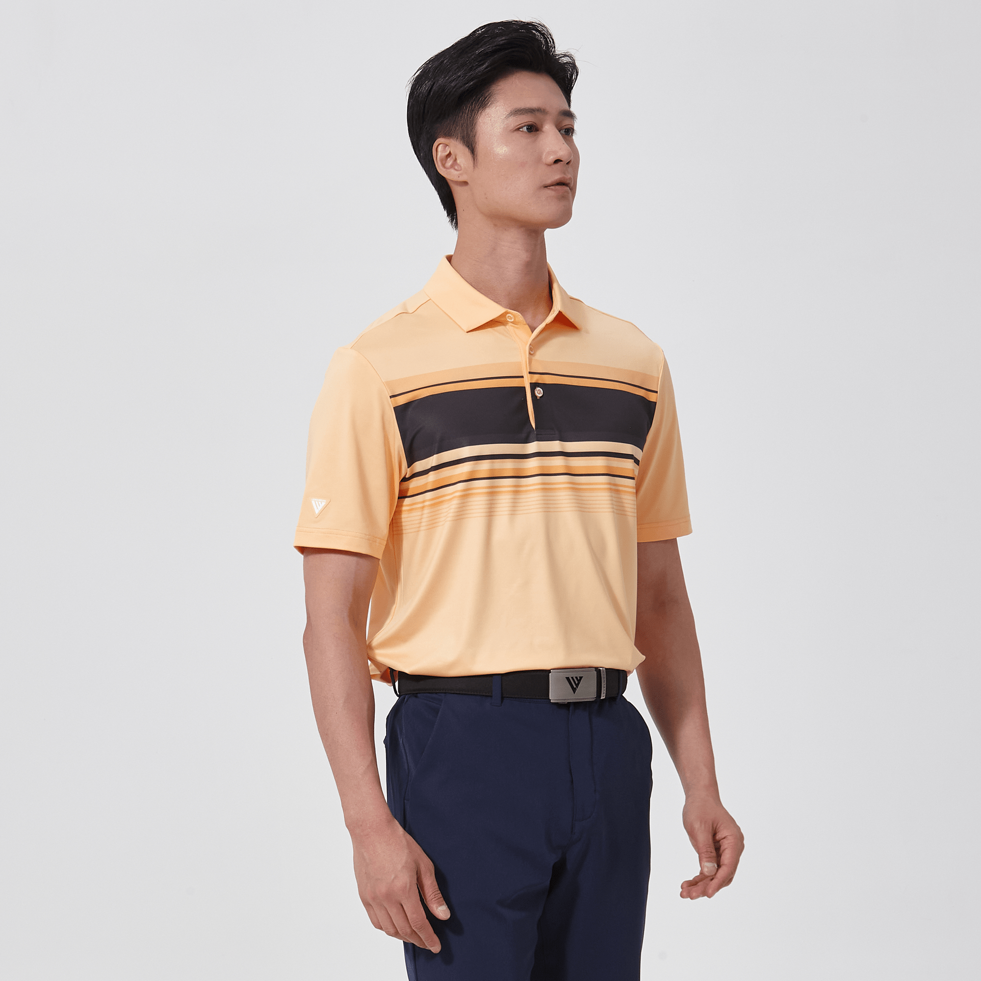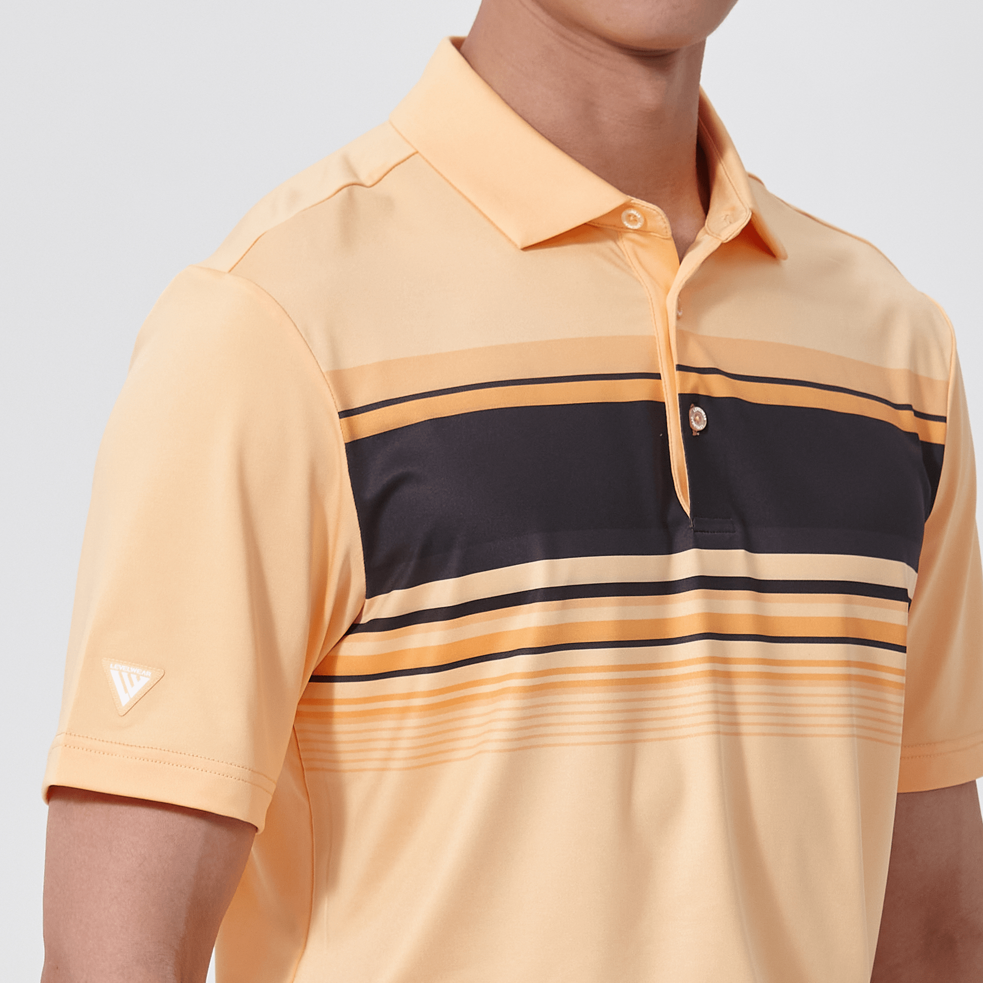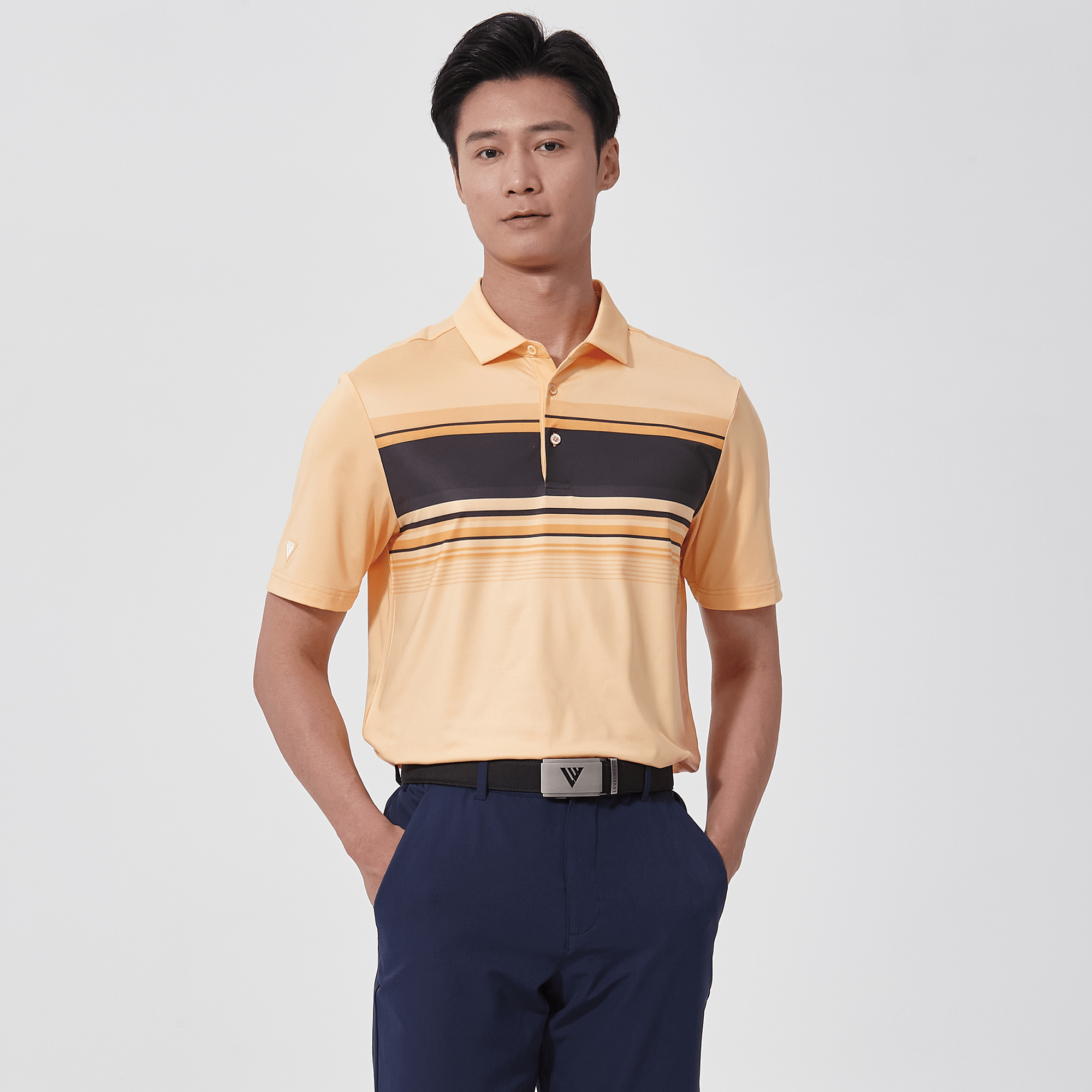 Elevate your game with the Onward men's polo, designed for avid golfers. This shirt features UPF50+ protection and moisture-wicking technology to keep you dry and shielded on sunny days. Its anti-bacterial properties ensure lasting freshness during play. The stylish stripe print across the front chest and a neat self-fabric collar with a built-in collar stay enhance its sophisticated and classic appearance. Tailored with a high-low hem and side slits for greater mobility, this polo is made from 92% recycled polyester and 8% spandex, blending eco-conscious fashion with functional design.