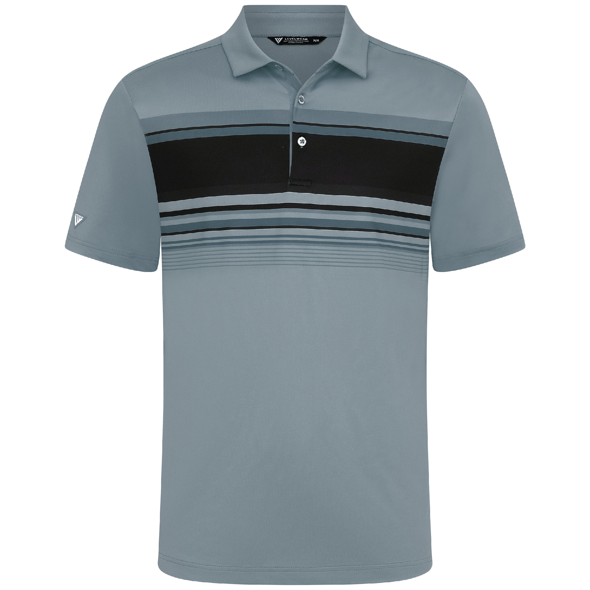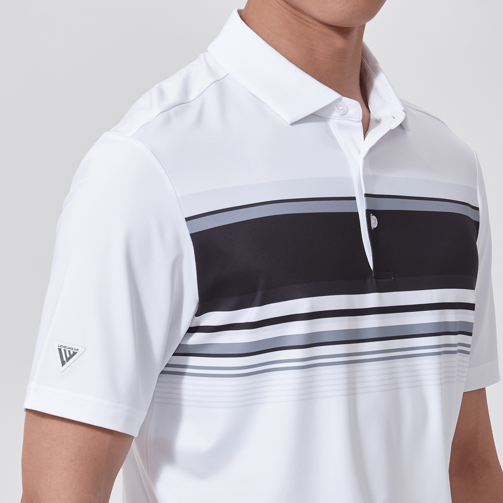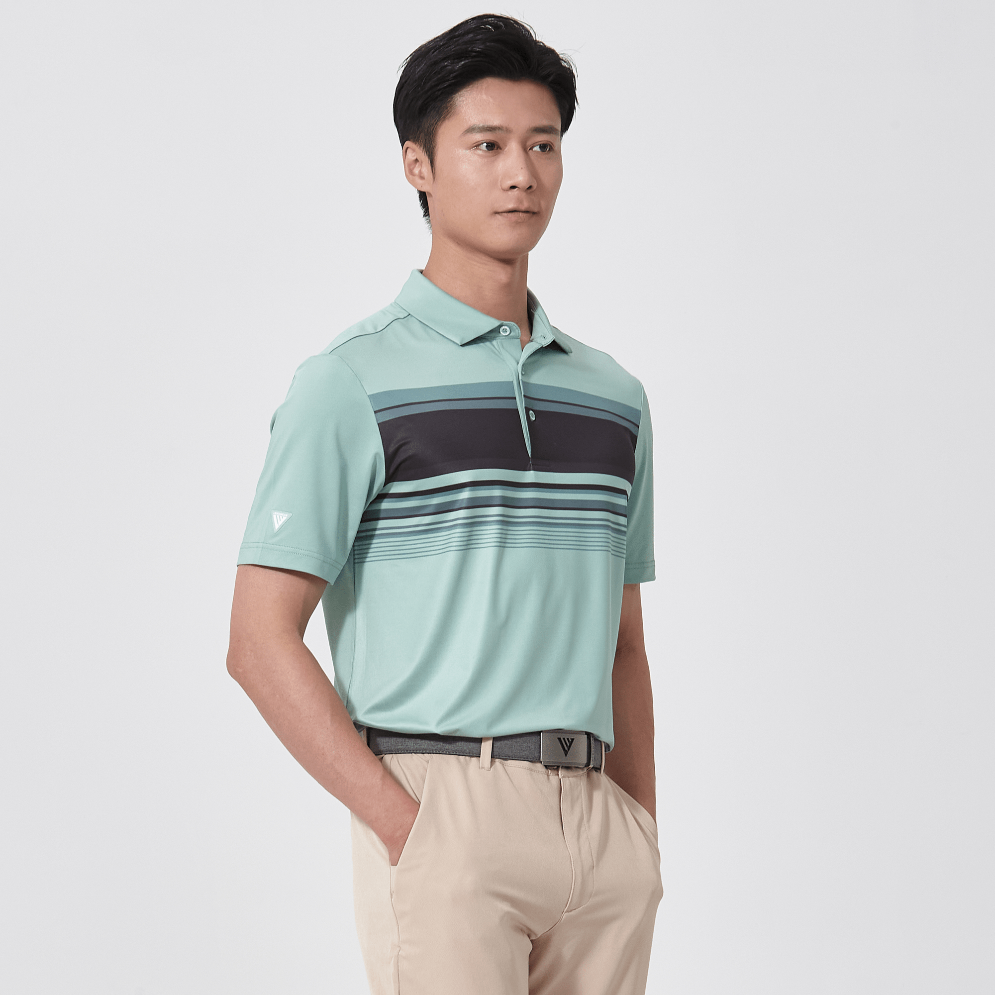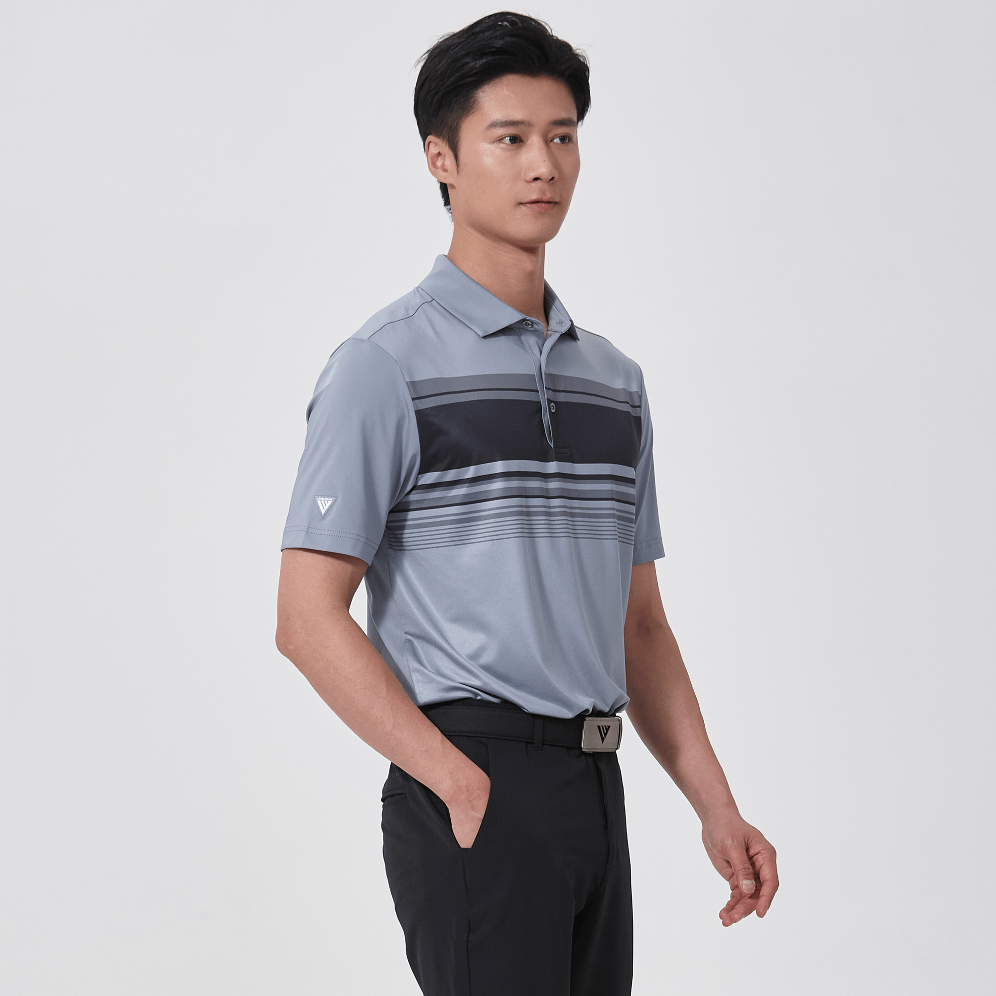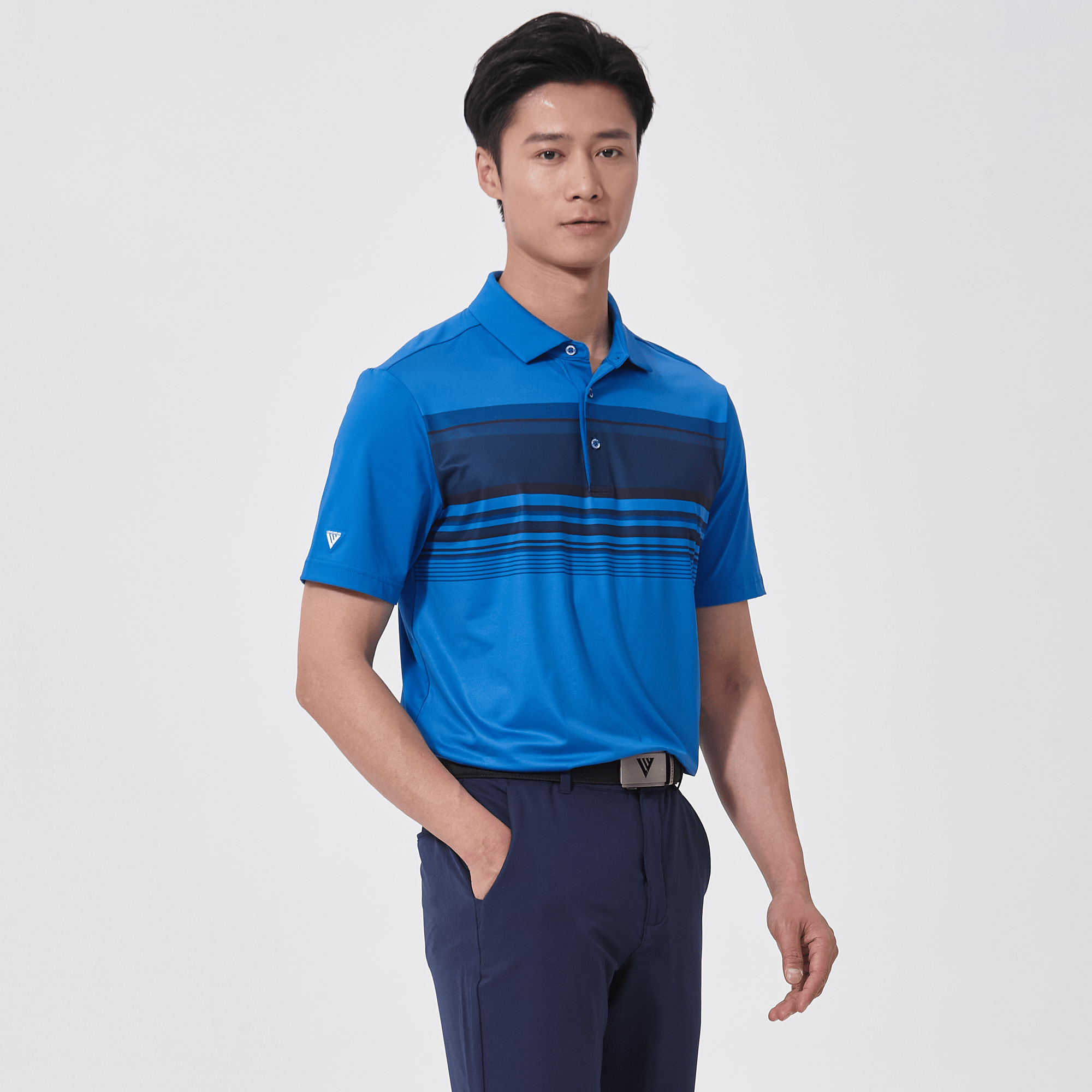 Elevate your game with the Onward men's polo, designed for avid golfers. This shirt features UPF50+ protection and moisture-wicking technology to keep you dry and shielded on sunny days. Its anti-bacterial properties ensure lasting freshness during play. The stylish stripe print across the front chest and a neat self-fabric collar with a built-in collar stay enhance its sophisticated and classic appearance. Tailored with a high-low hem and side slits for greater mobility, this polo is made from 92% recycled polyester and 8% spandex, blending eco-conscious fashion with functional design.