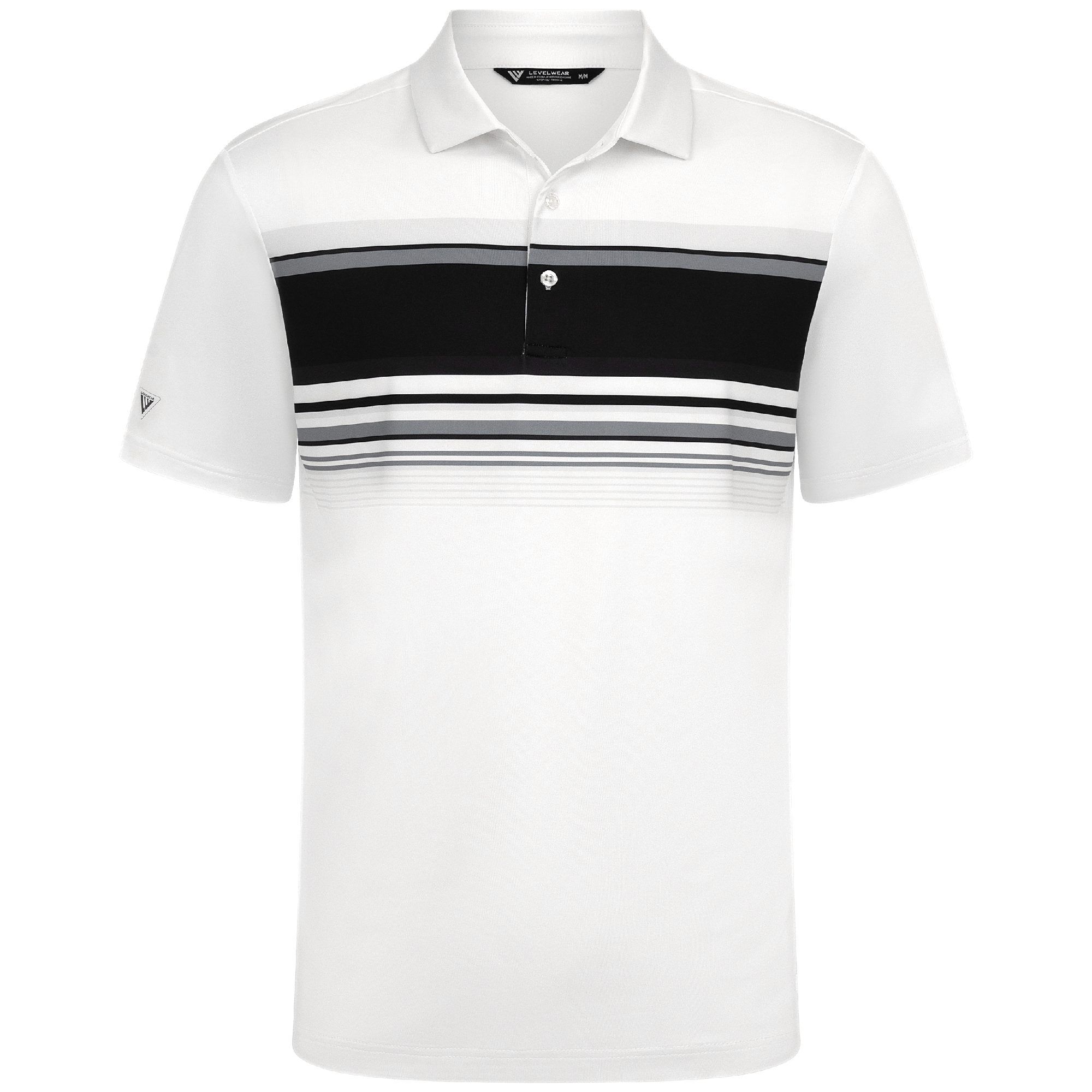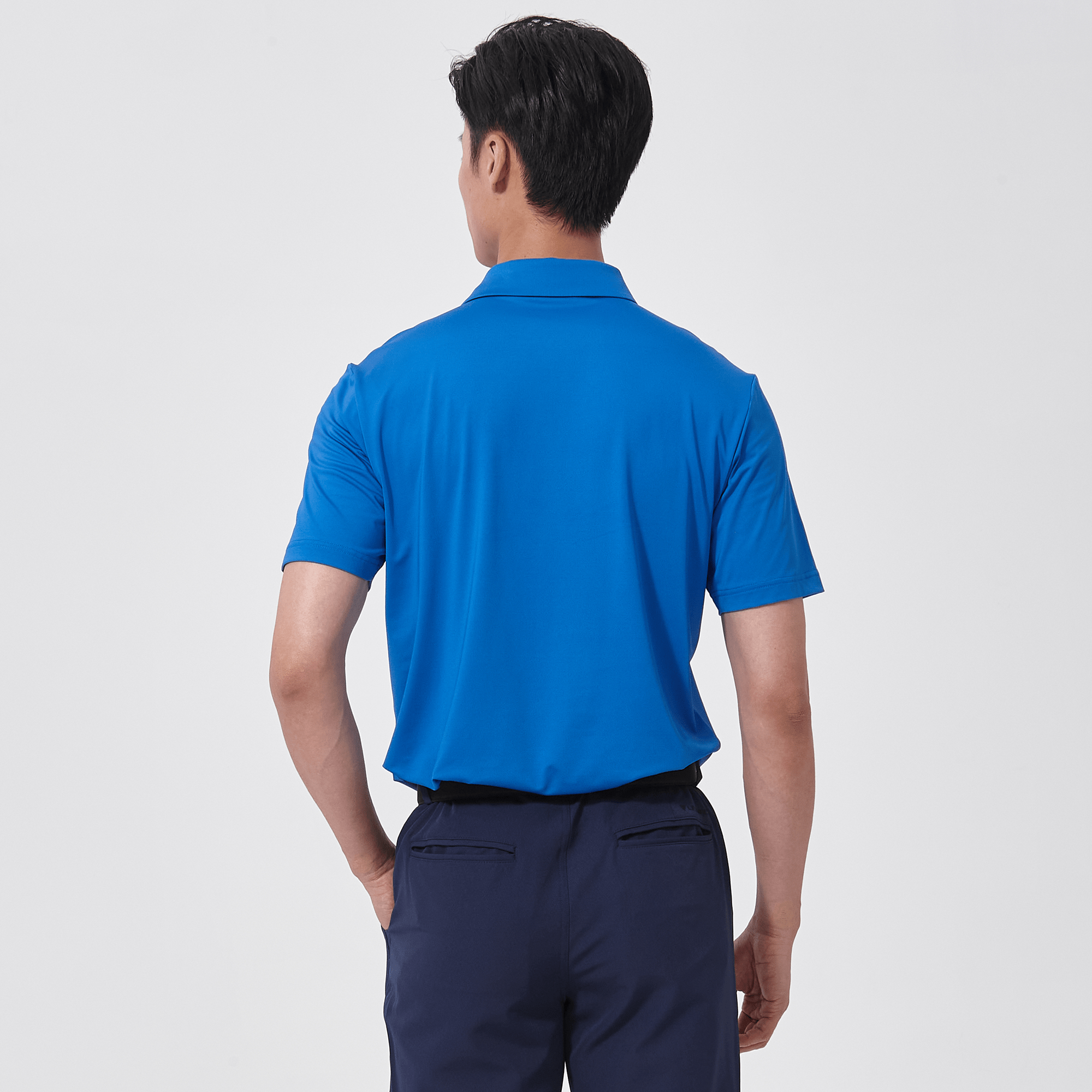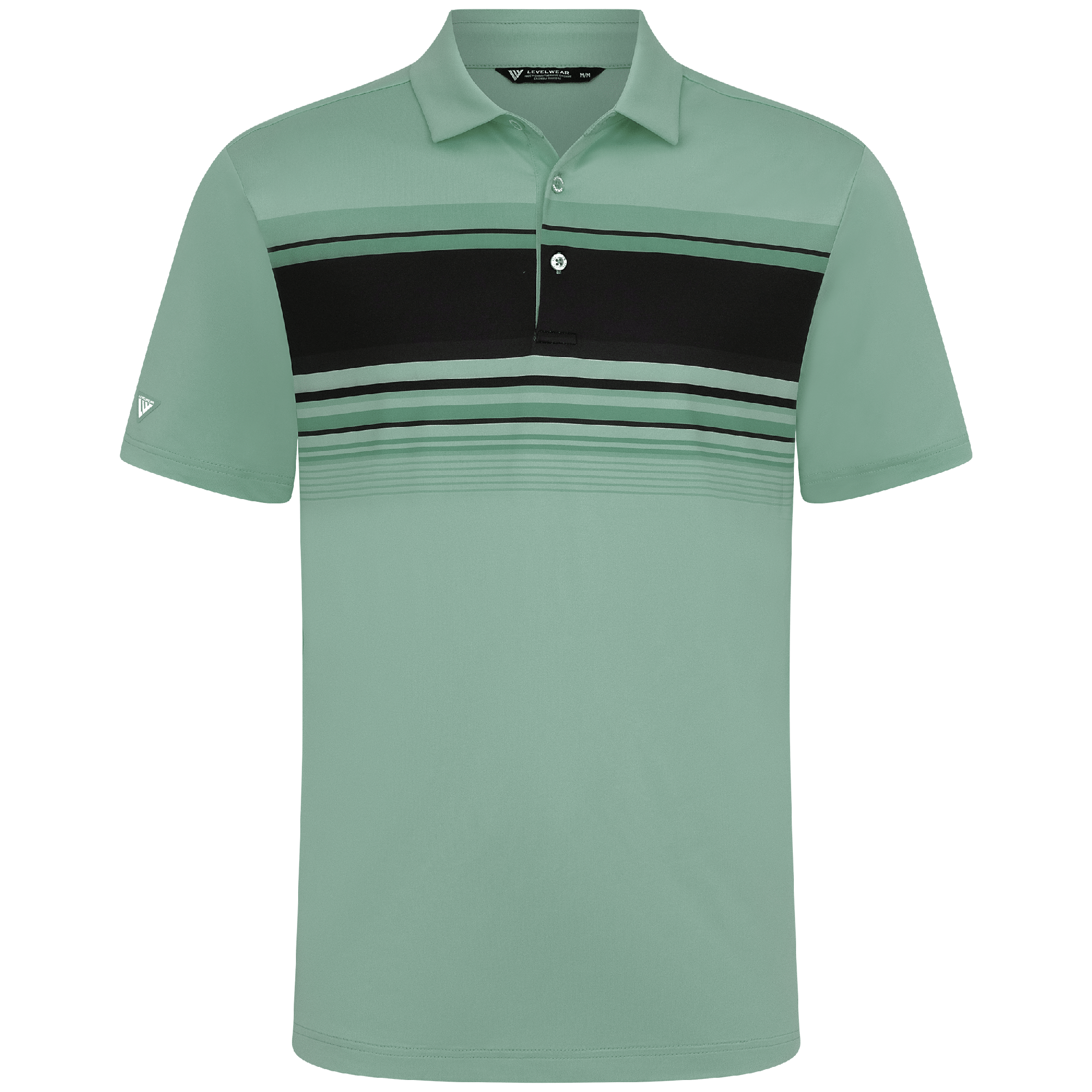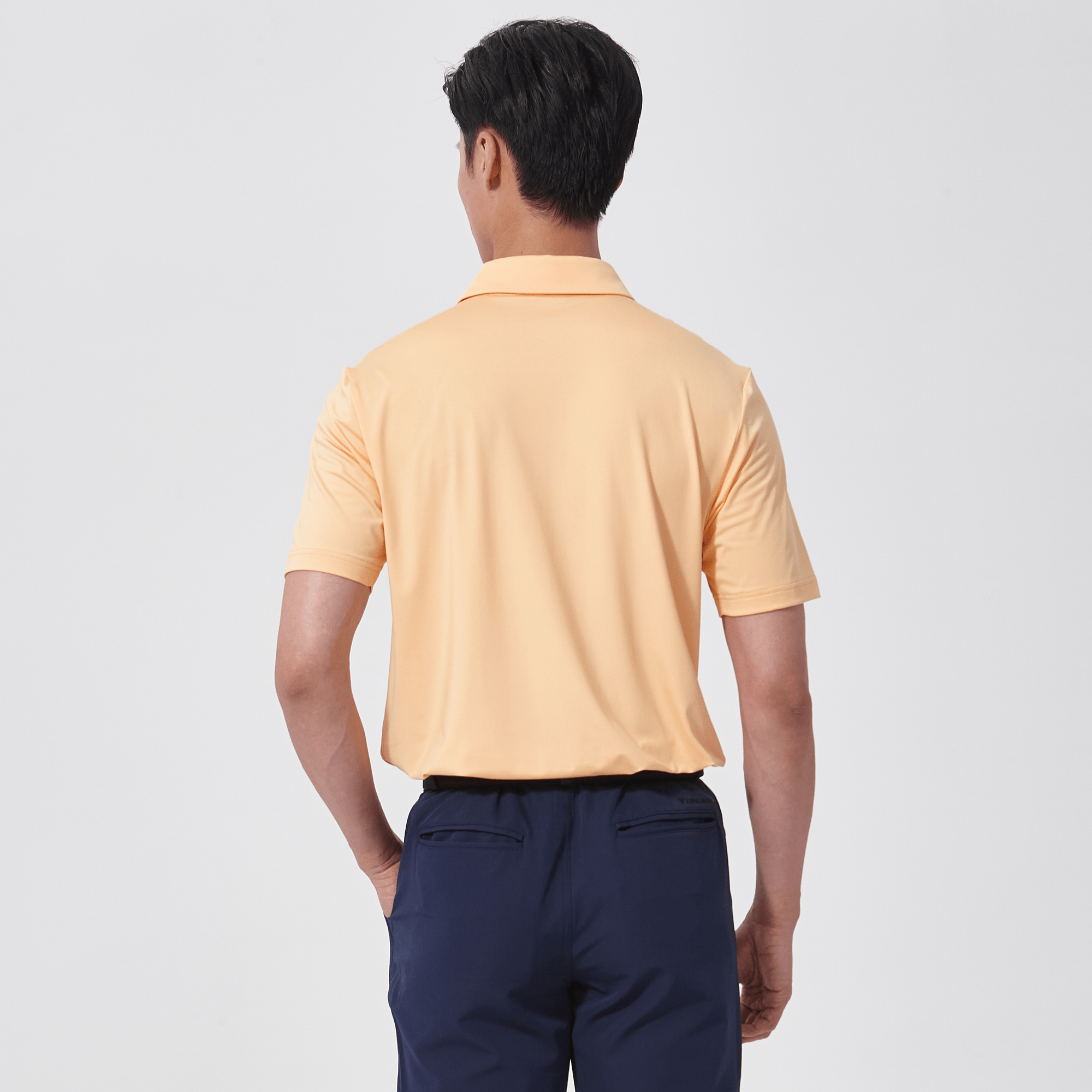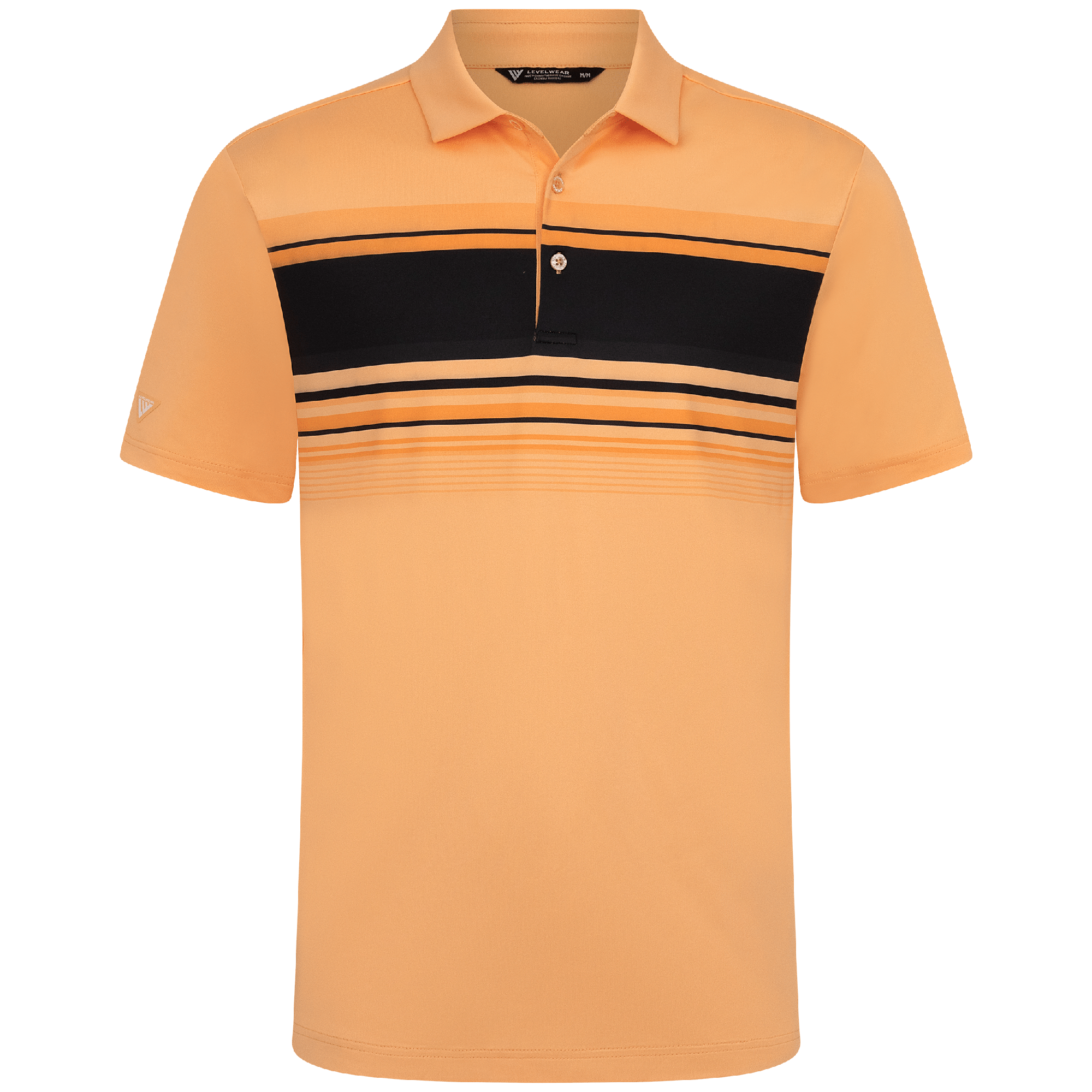 Elevate your game with the Onward men's polo, designed for avid golfers. This shirt features UPF50+ protection and moisture-wicking technology to keep you dry and shielded on sunny days. Its anti-bacterial properties ensure lasting freshness during play. The stylish stripe print across the front chest and a neat self-fabric collar with a built-in collar stay enhance its sophisticated and classic appearance. Tailored with a high-low hem and side slits for greater mobility, this polo is made from 92% recycled polyester and 8% spandex, blending eco-conscious fashion with functional design.