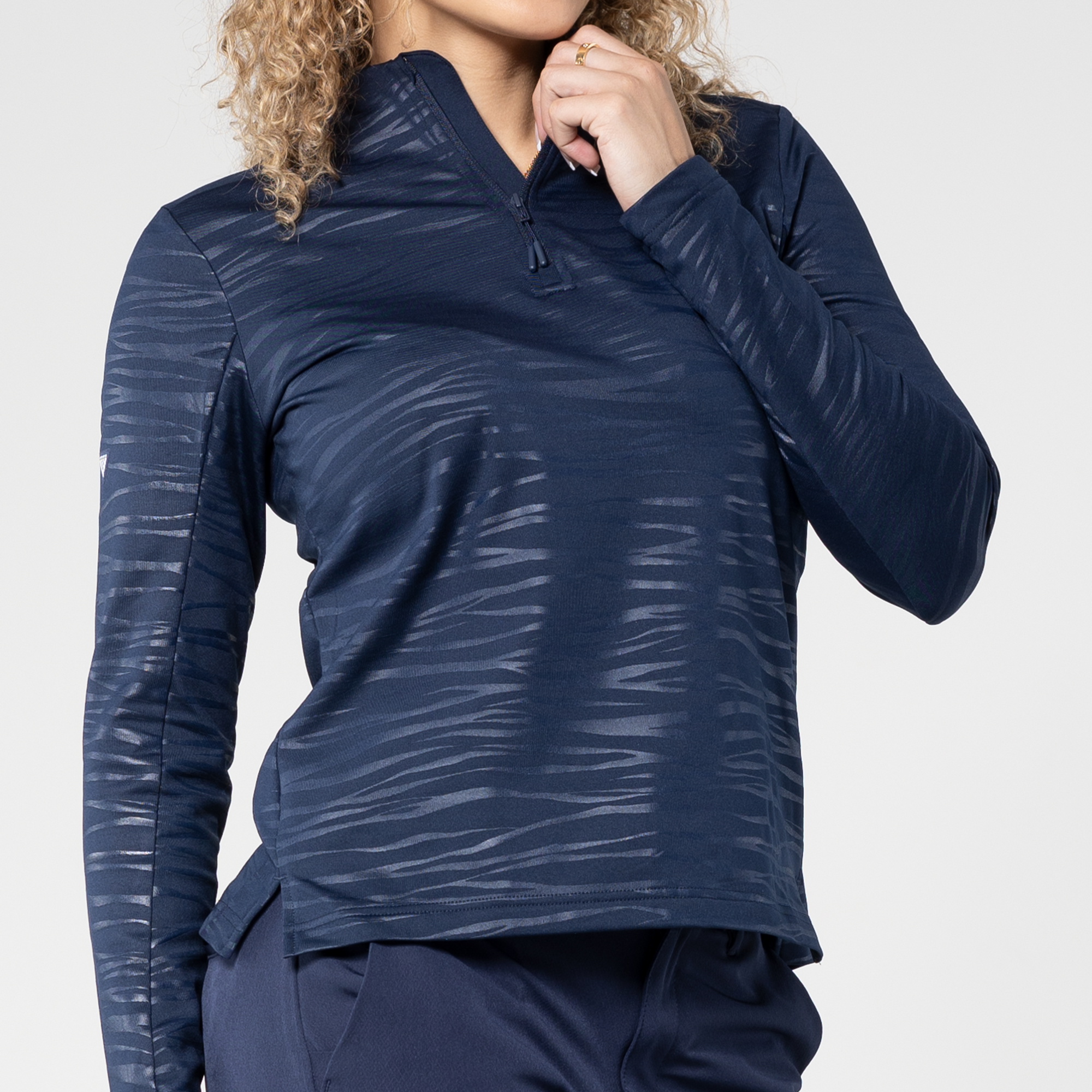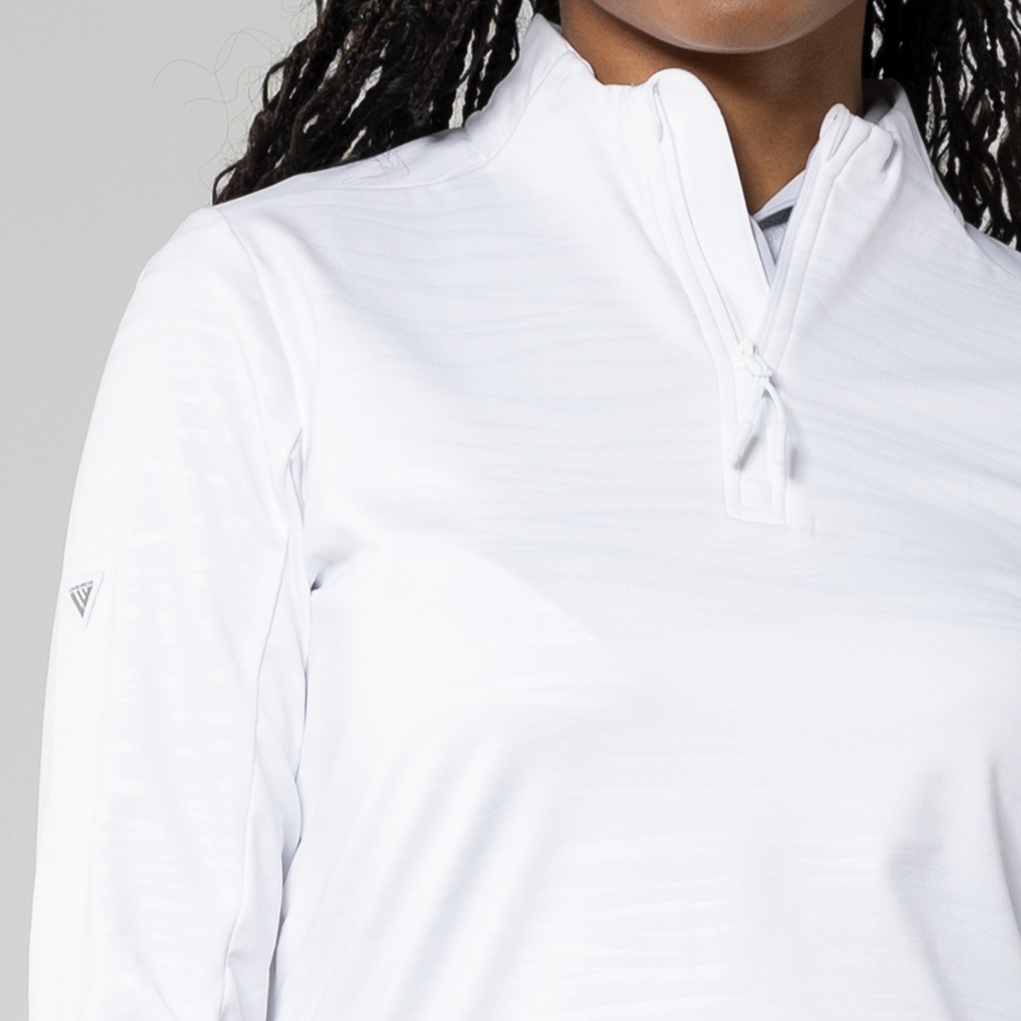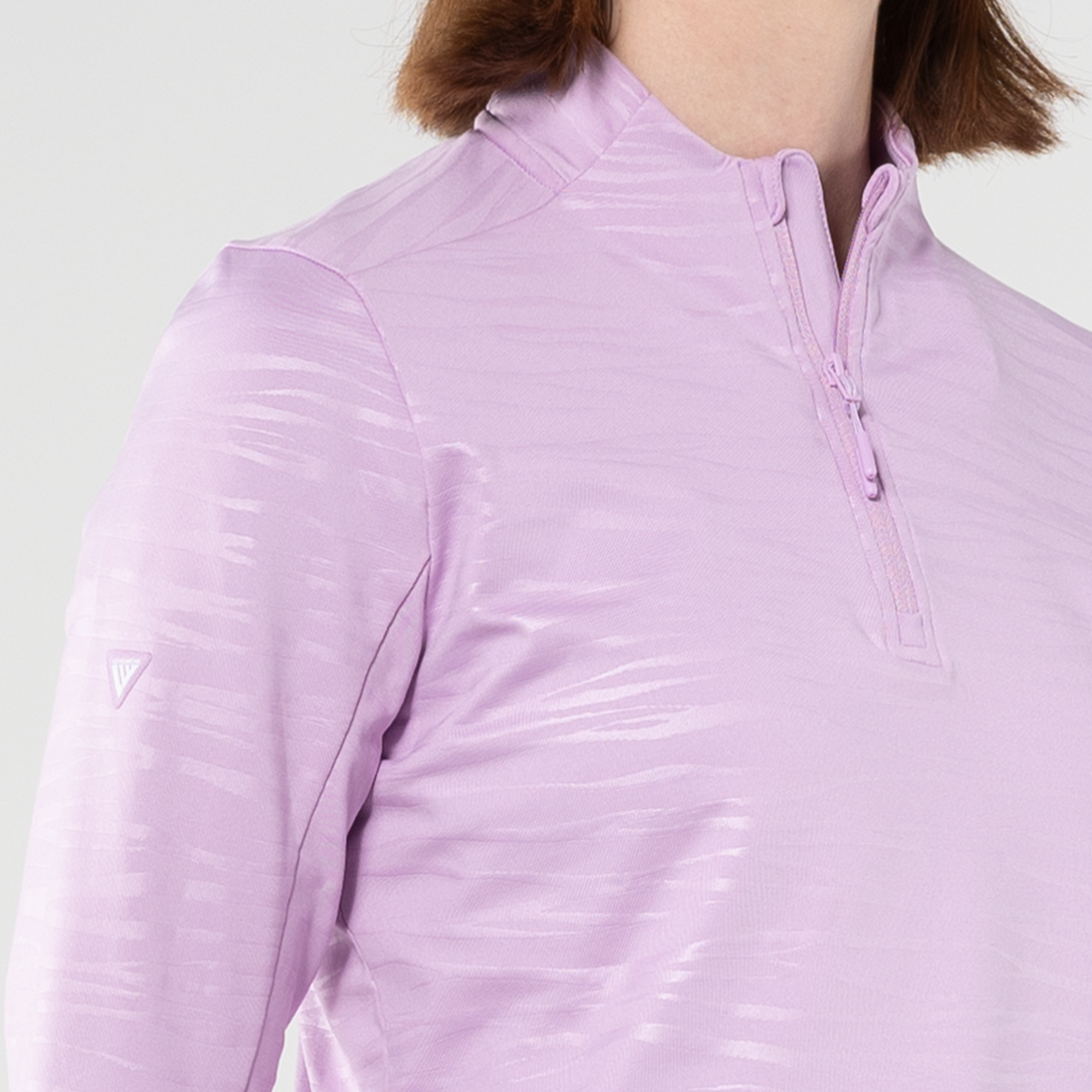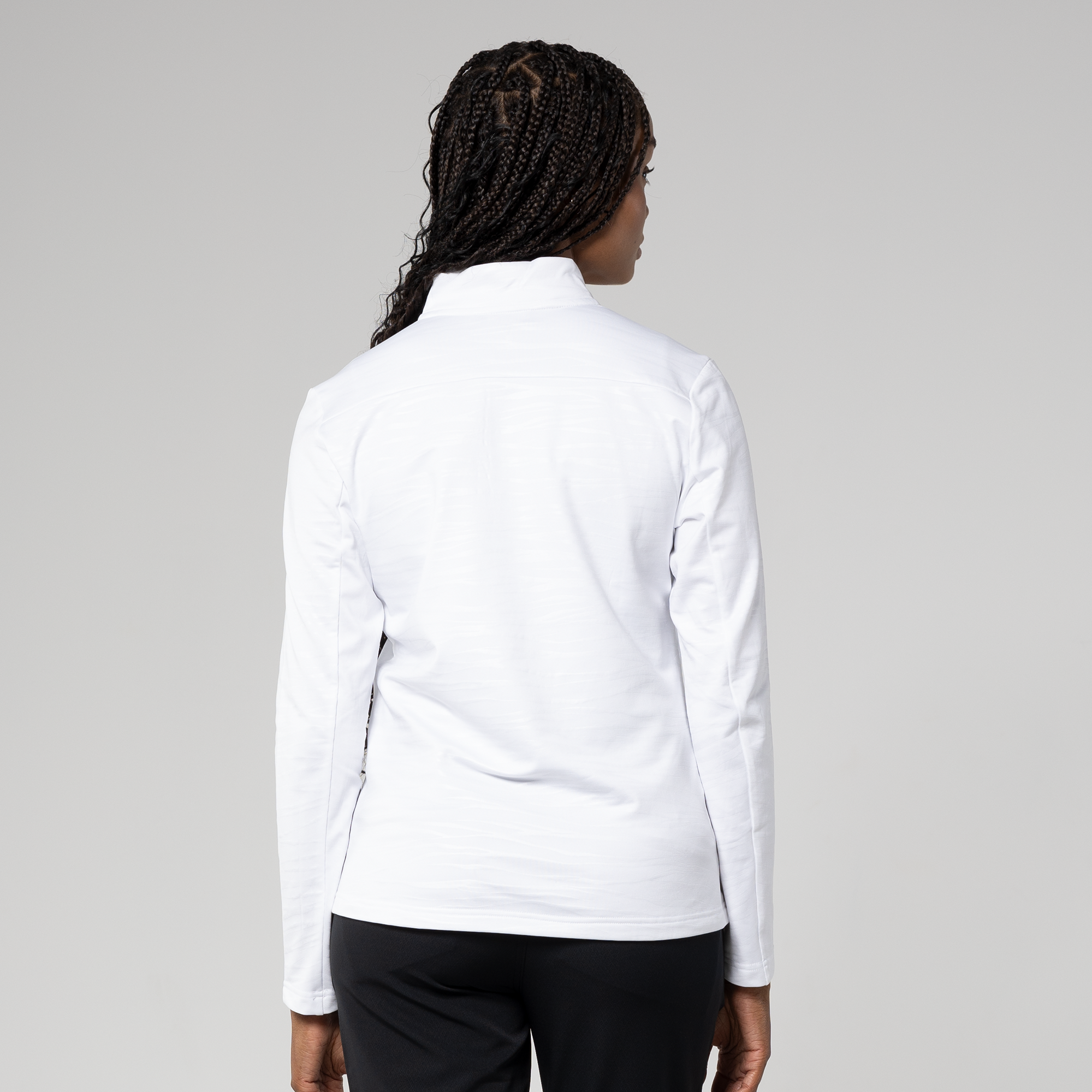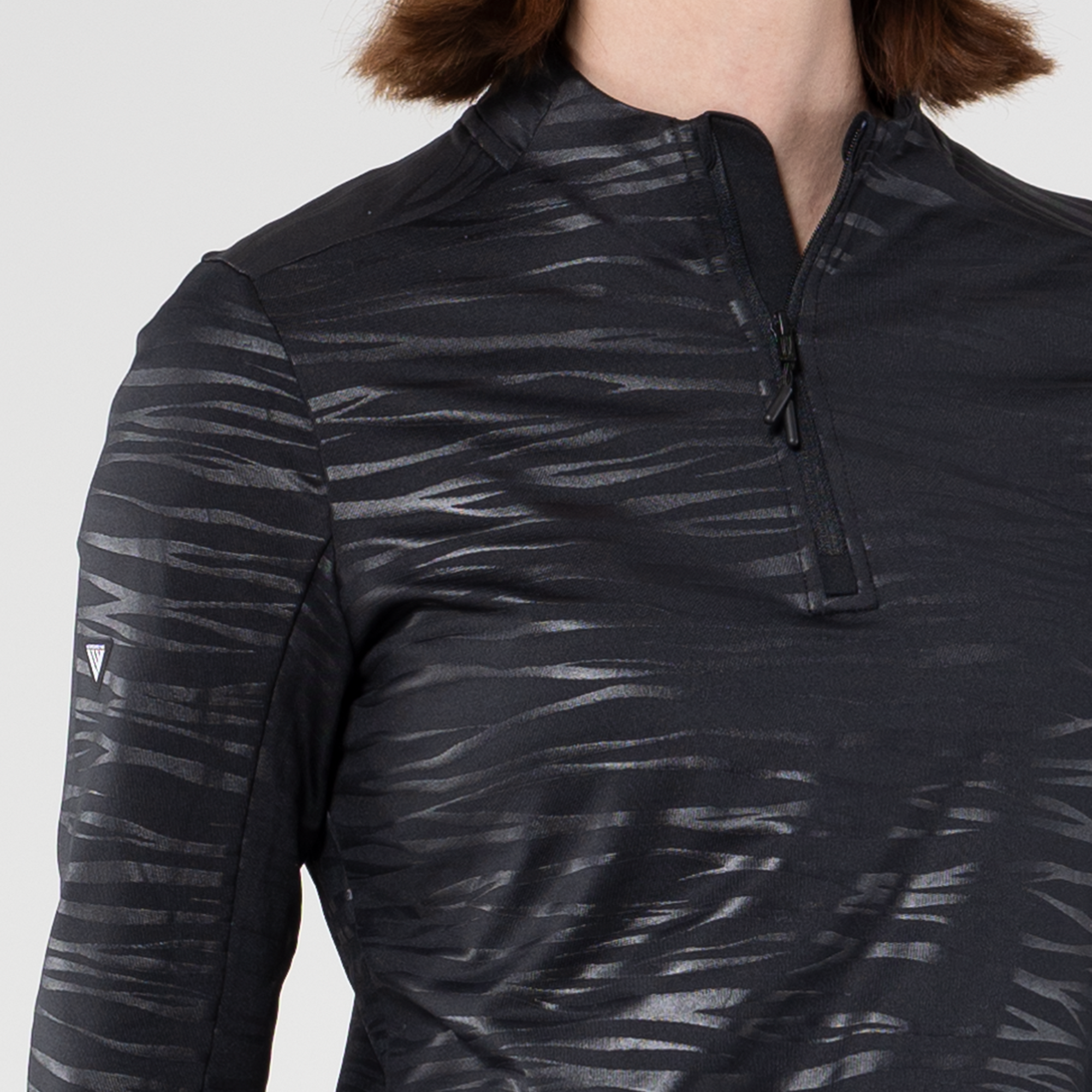 Enhance your active wardrobe with the Patina midlayer. Crafted from a blend of 88% polyester and 12% spandex, it seamlessly blends comfort and flexibility. The tonal debossed linear print and angular yoke seams add a contemporary touch, making this midlayer the ideal choice for both style and performance during your workouts.