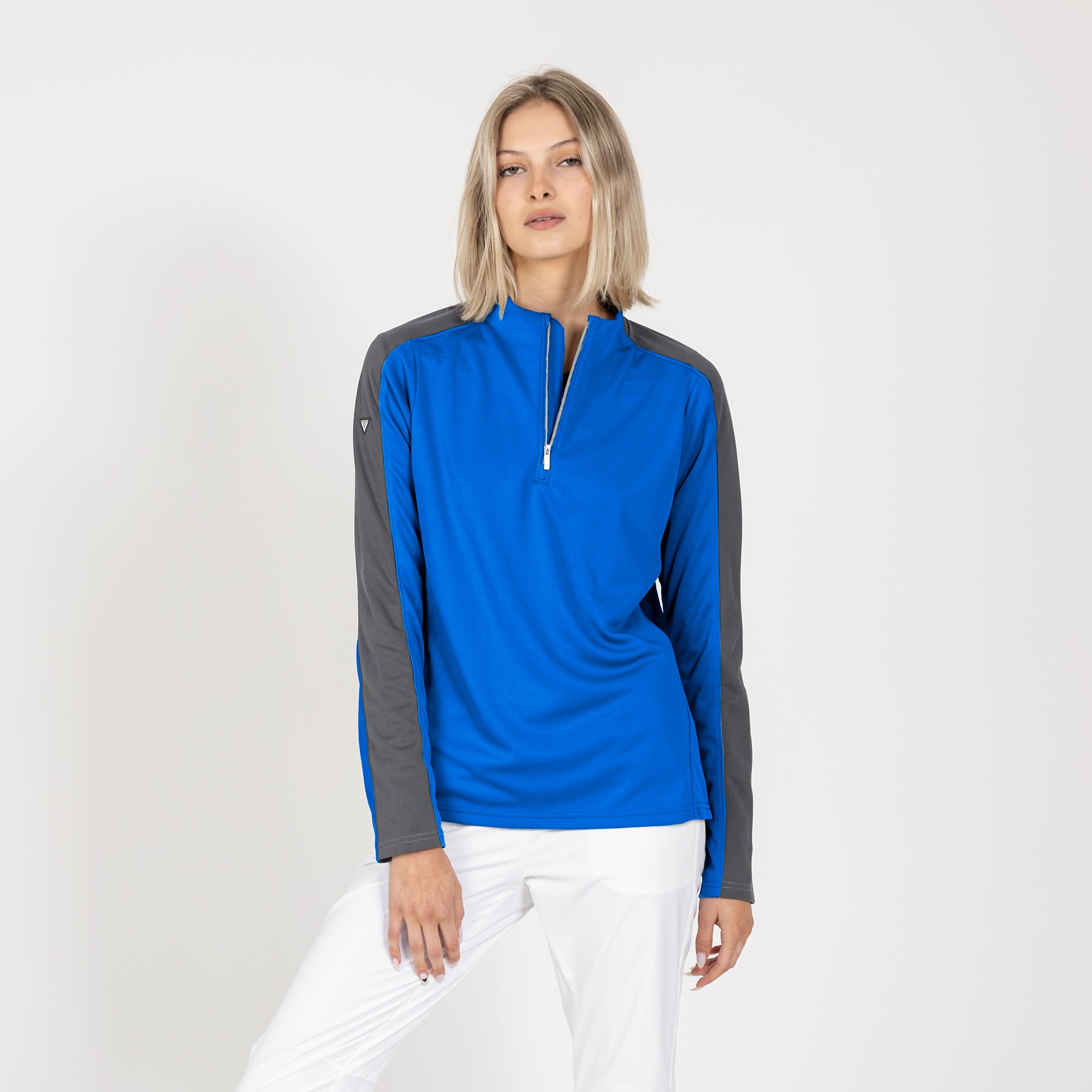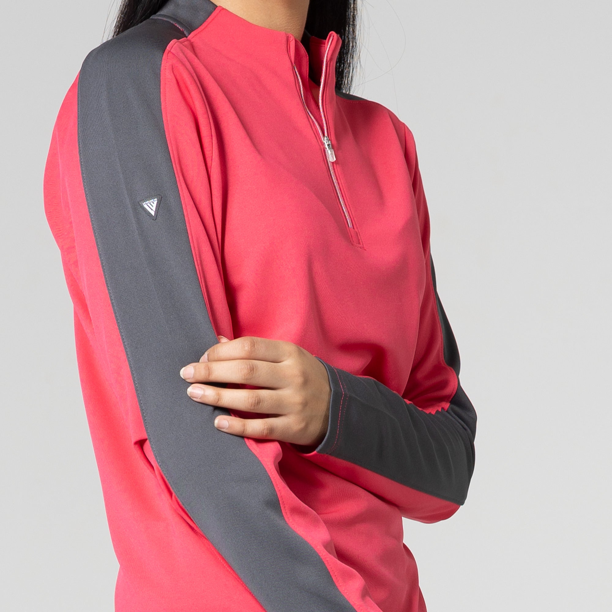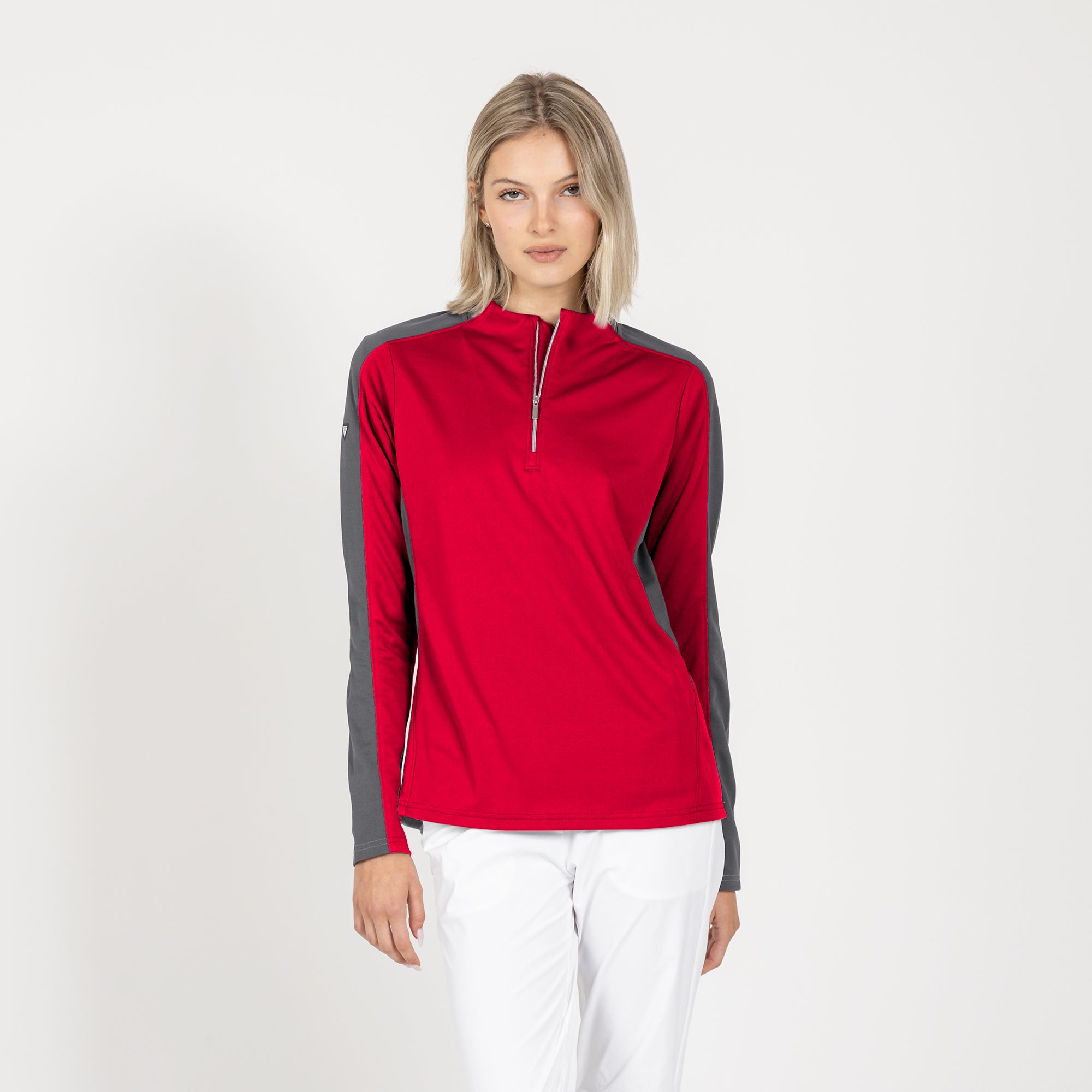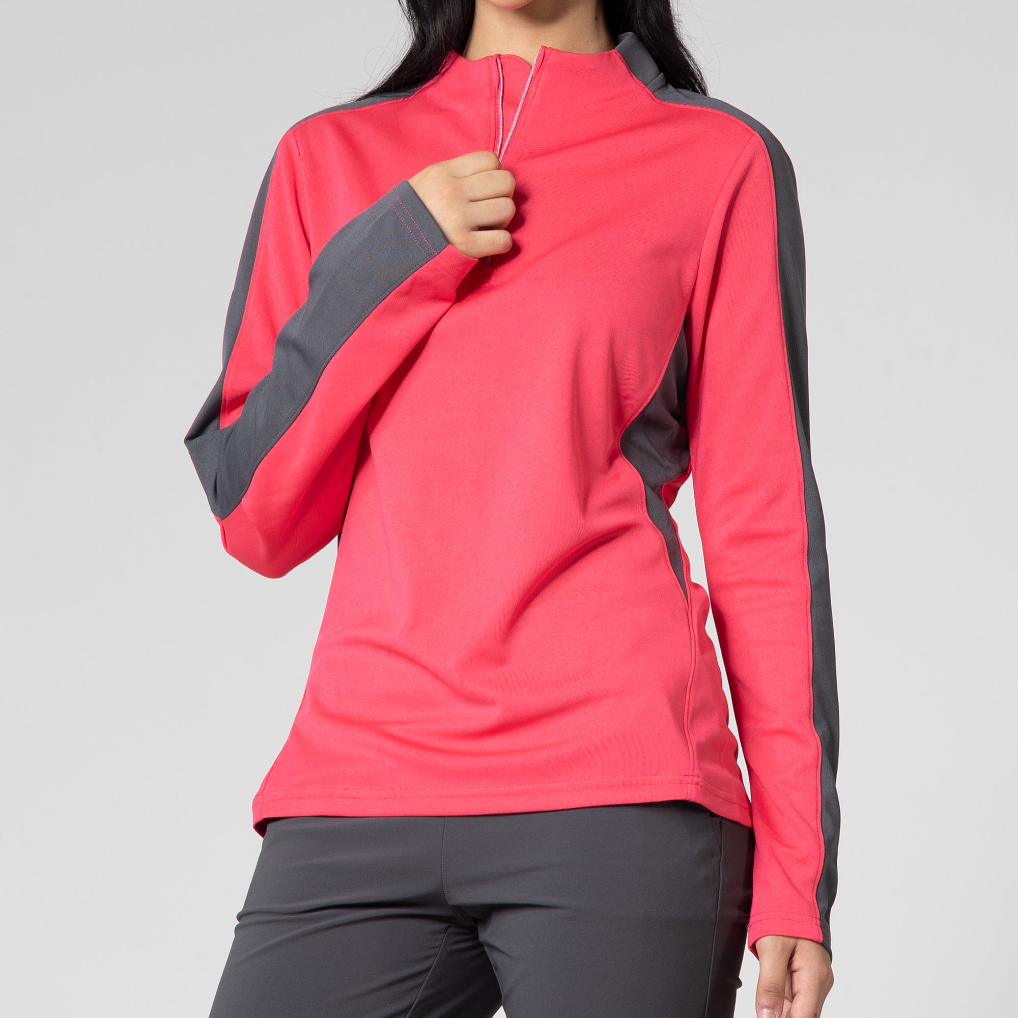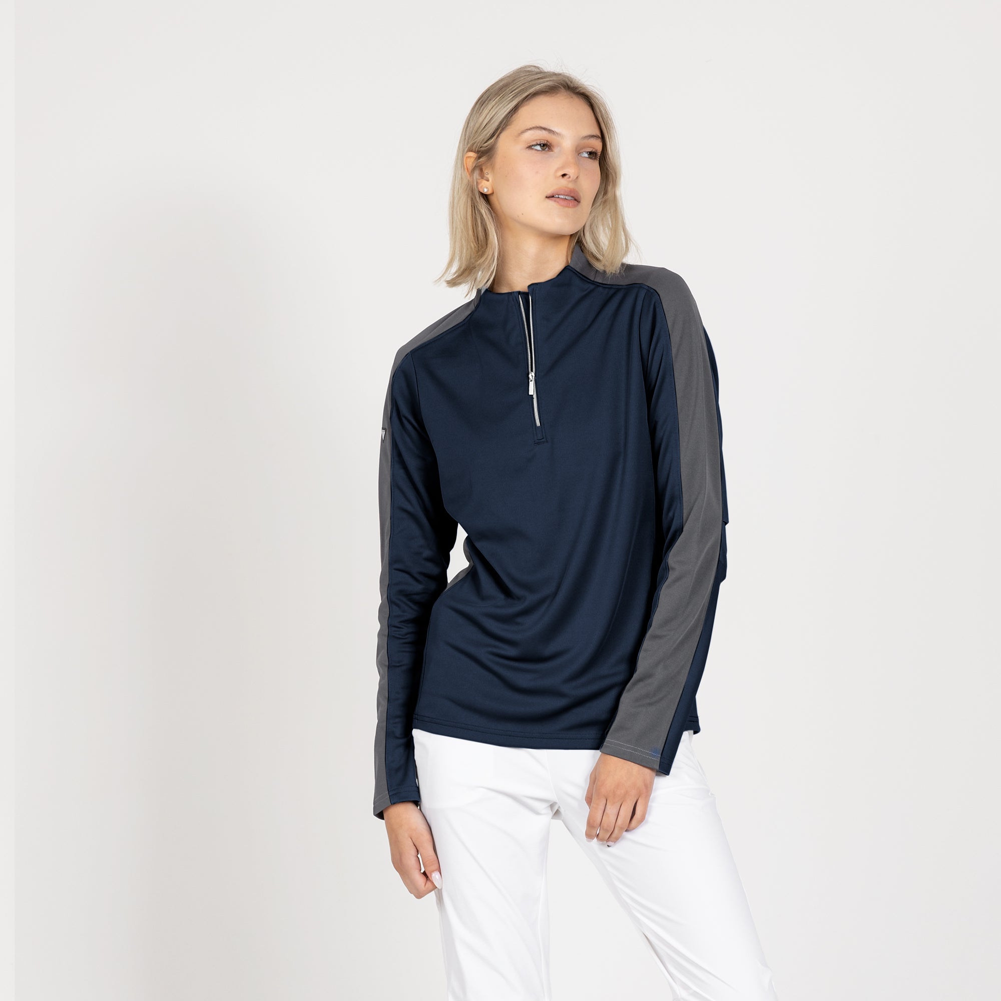 Enhance your golf and active lifestyle wardrobe with the Remi Pullover, designed for practicality and a fashionable look on the course and beyond. This 100% polyester pullover features moisture-wicking technology to ensure you stay dry and comfortable throughout your activities. The Remi boasts bold color blocking for a contemporary aesthetic and includes a metallic zipper for a sleek, refined touch. Its design incorporates forwarded side seams and elbow darts that improve the garment's fit, allowing for better movement and alignment with your body. Ideal for a day on the golf course or any outdoor activity, the Remi pullover is a stylish and functional choice for active wear.
