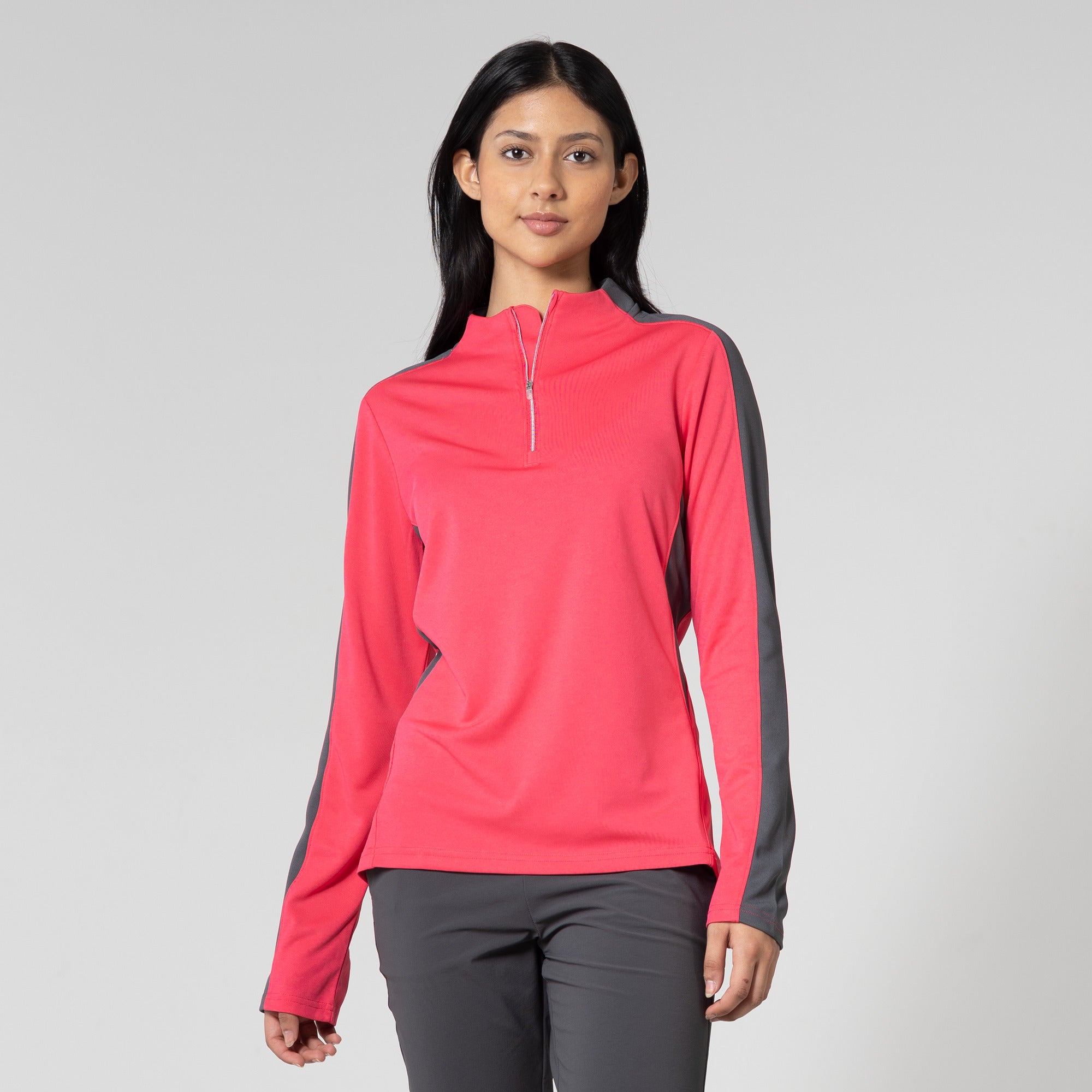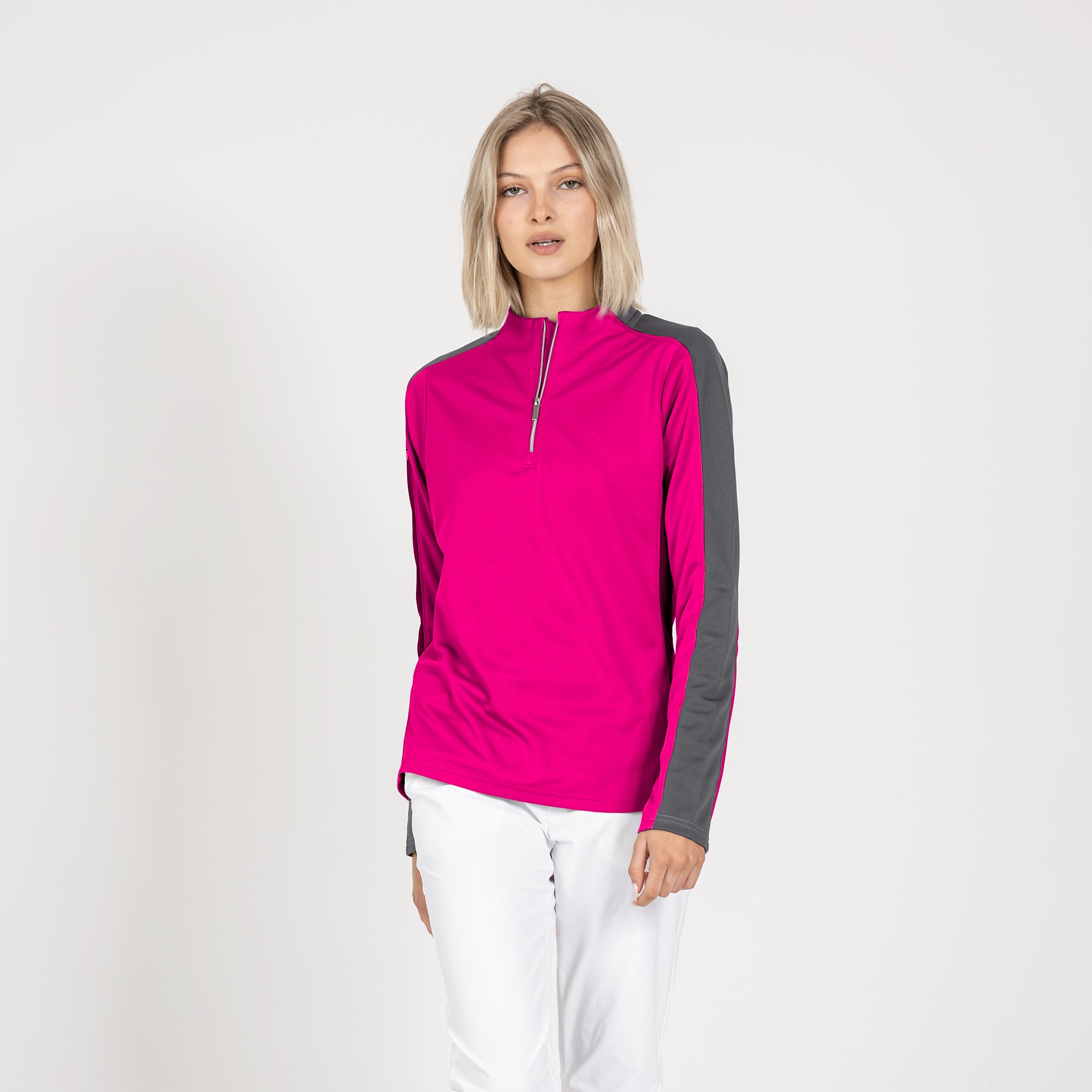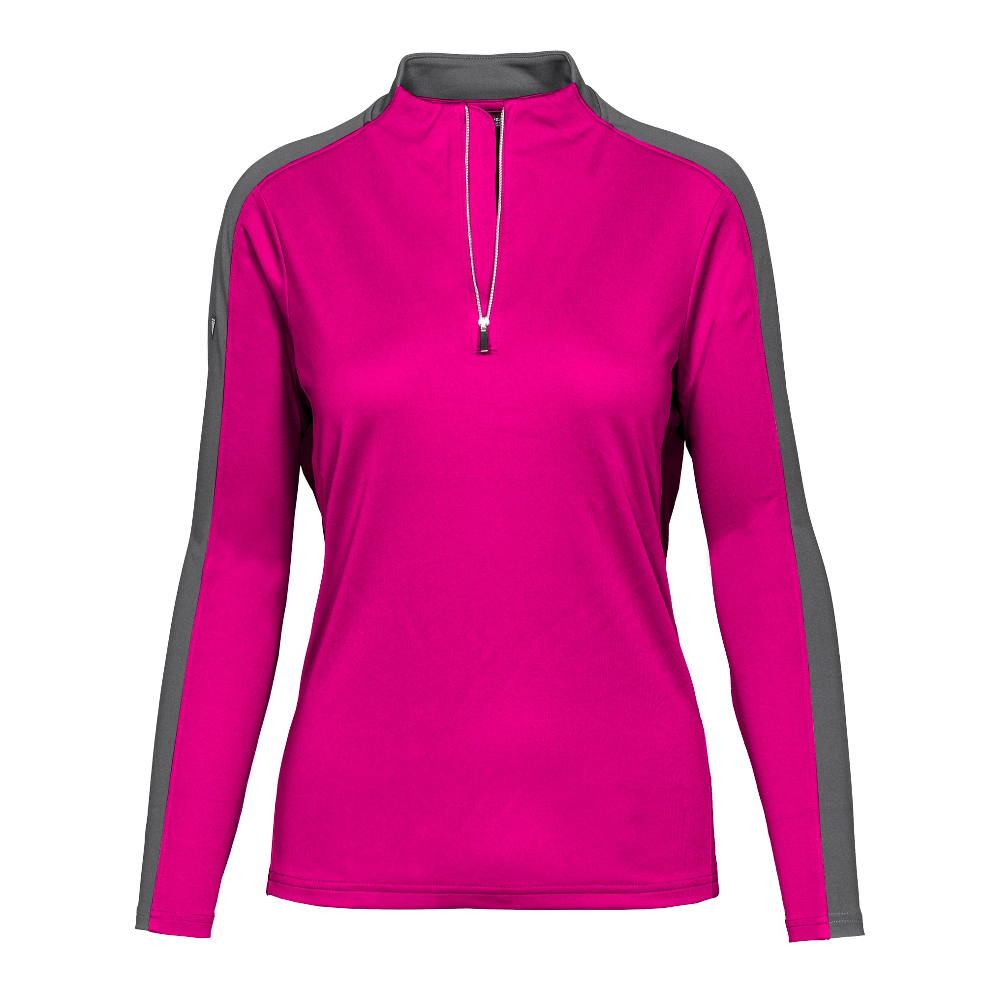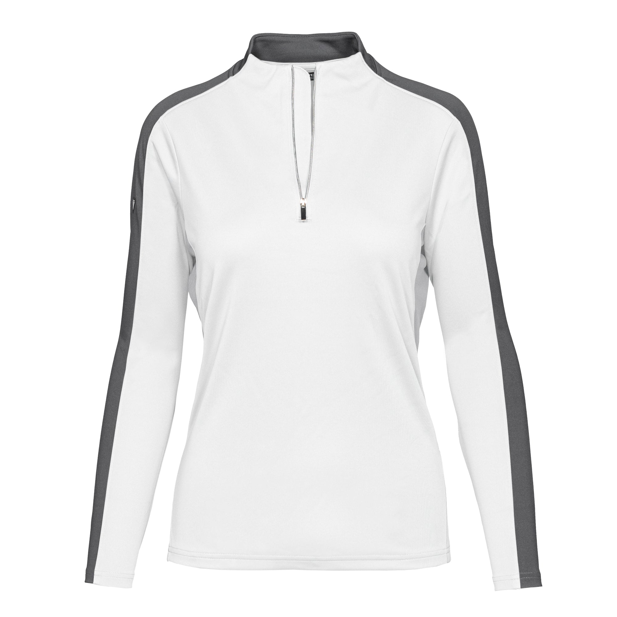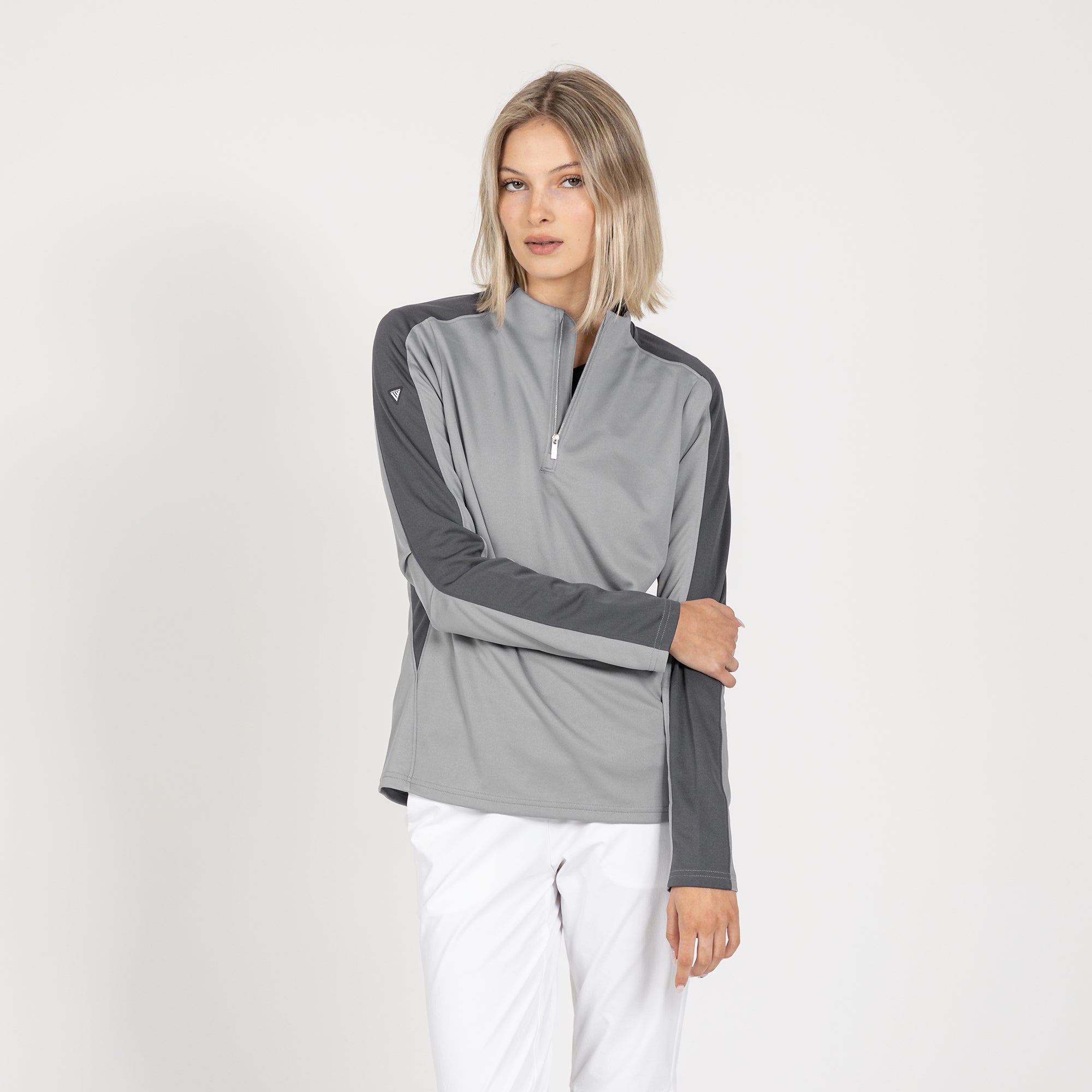 Enhance your golf and active lifestyle wardrobe with the Remi Pullover, designed for practicality and a fashionable look on the course and beyond. This 100% polyester pullover features moisture-wicking technology to ensure you stay dry and comfortable throughout your activities. The Remi boasts bold color blocking for a contemporary aesthetic and includes a metallic zipper for a sleek, refined touch. Its design incorporates forwarded side seams and elbow darts that improve the garment's fit, allowing for better movement and alignment with your body. Ideal for a day on the golf course or any outdoor activity, the Remi pullover is a stylish and functional choice for active wear.