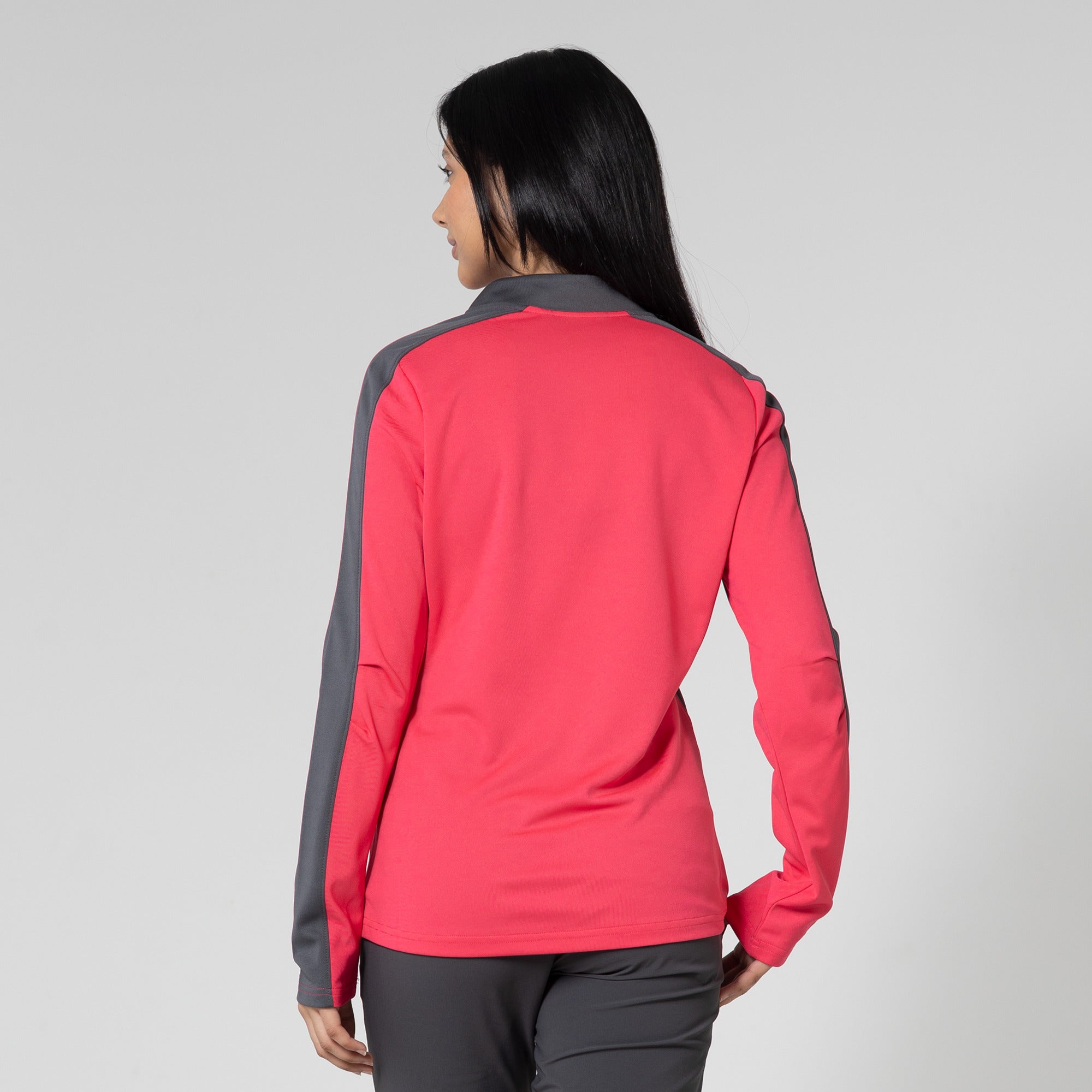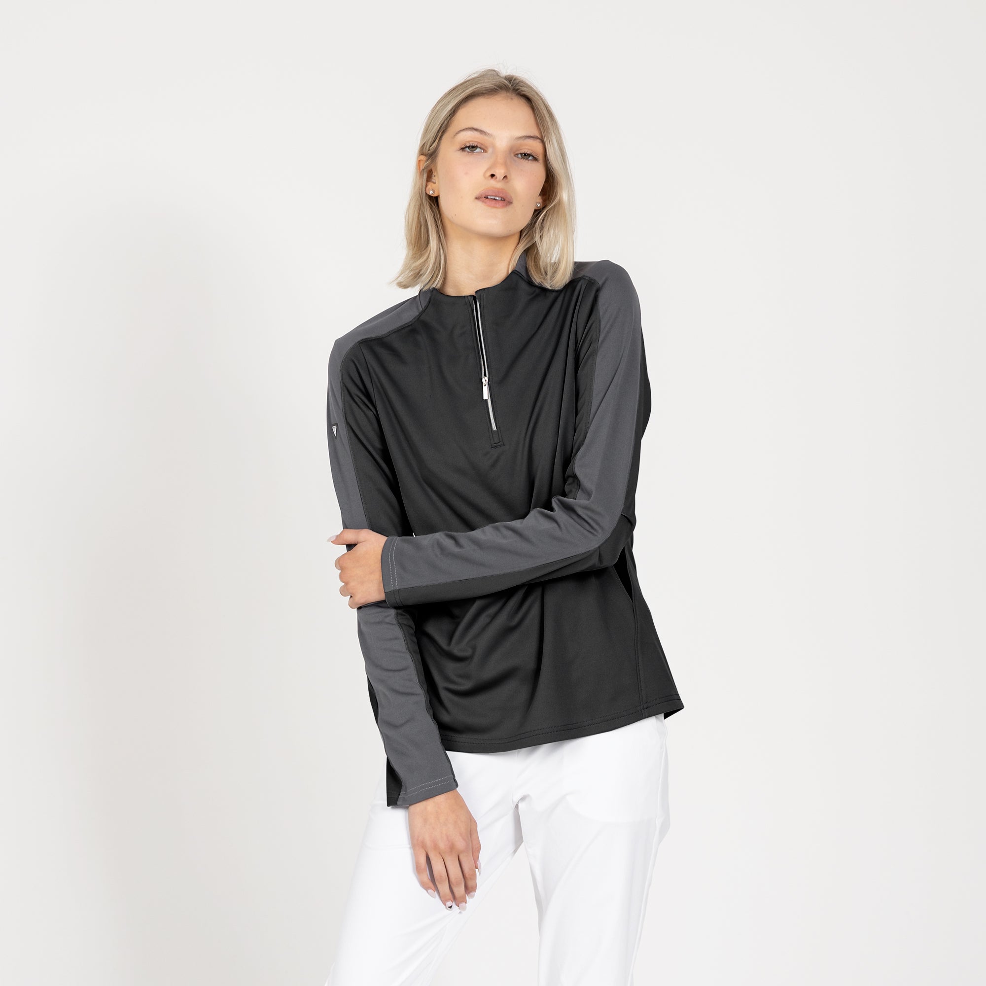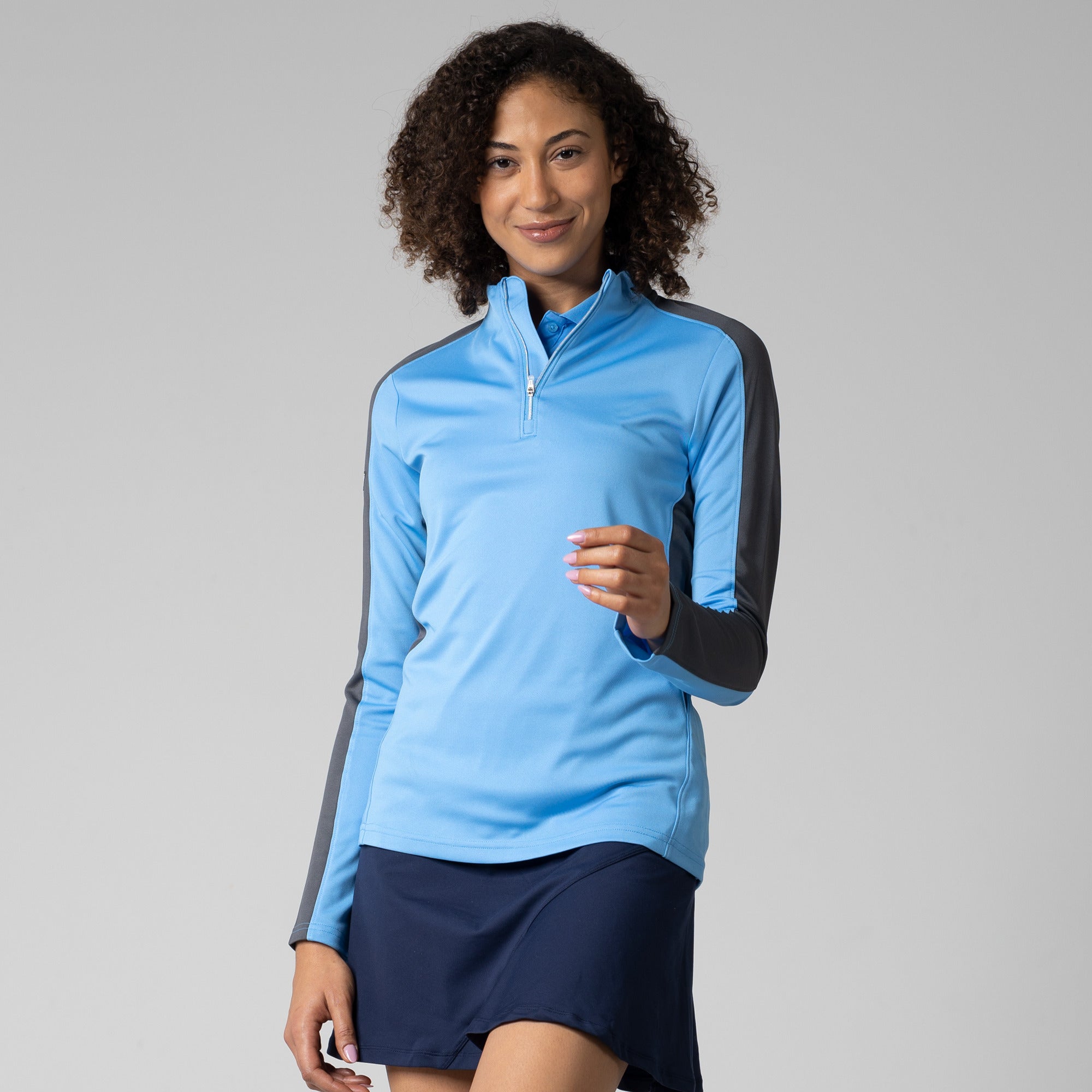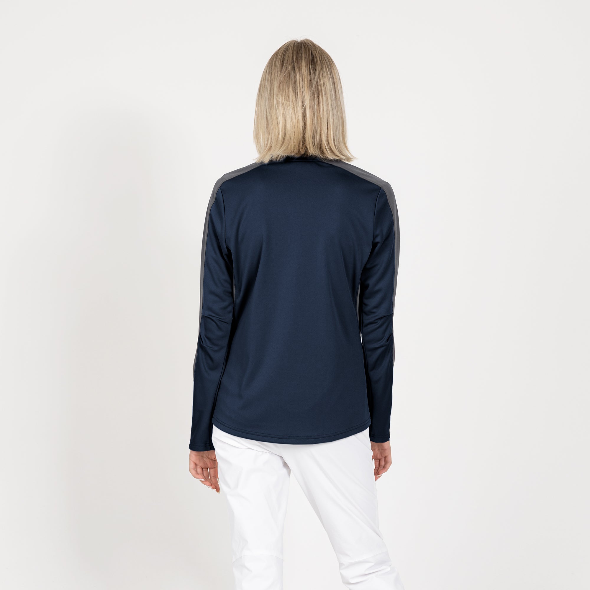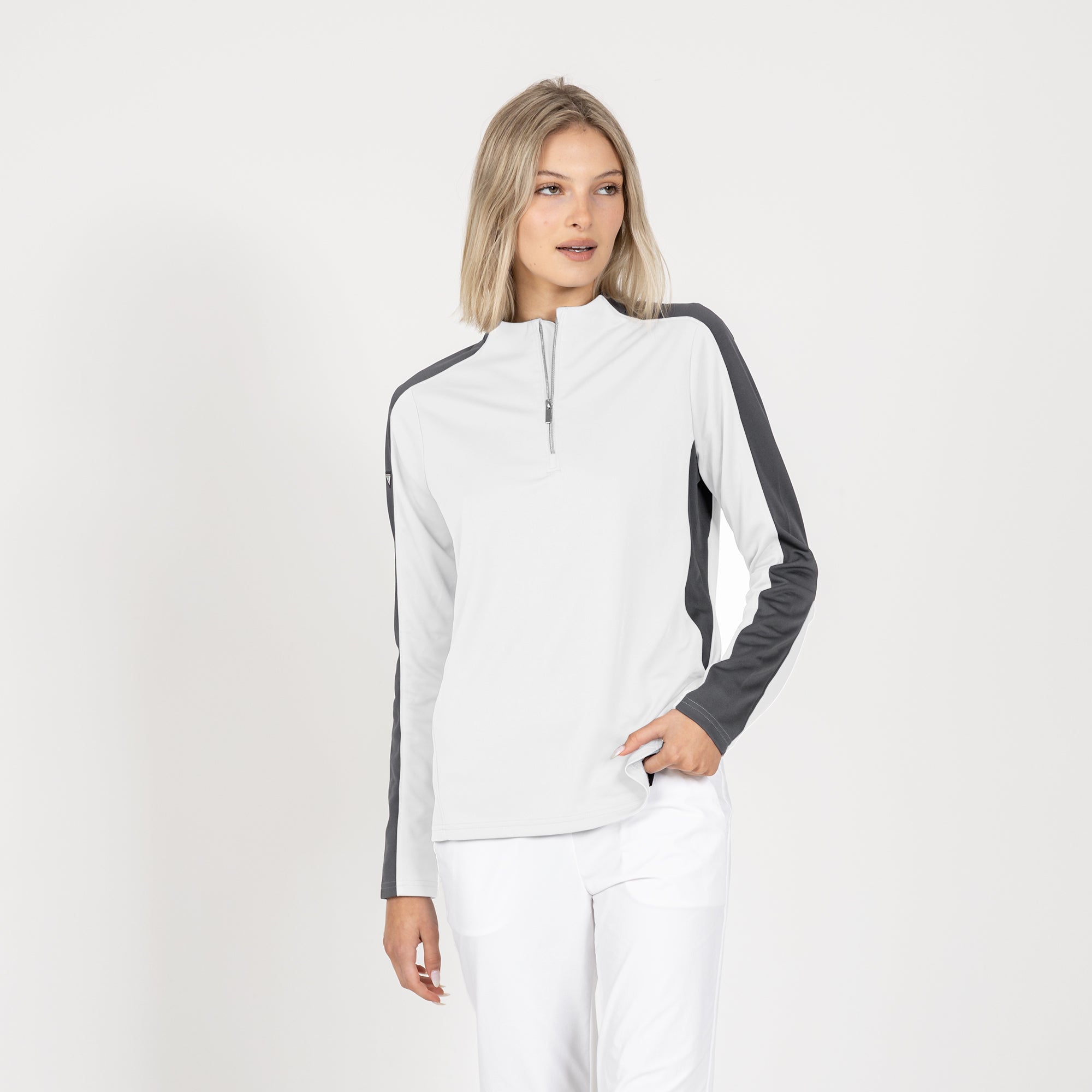 Enhance your golf and active lifestyle wardrobe with the Remi Pullover, designed for practicality and a fashionable look on the course and beyond. This 100% polyester pullover features moisture-wicking technology to ensure you stay dry and comfortable throughout your activities. The Remi boasts bold color blocking for a contemporary aesthetic and includes a metallic zipper for a sleek, refined touch. Its design incorporates forwarded side seams and elbow darts that improve the garment's fit, allowing for better movement and alignment with your body. Ideal for a day on the golf course or any outdoor activity, the Remi pullover is a stylish and functional choice for active wear.