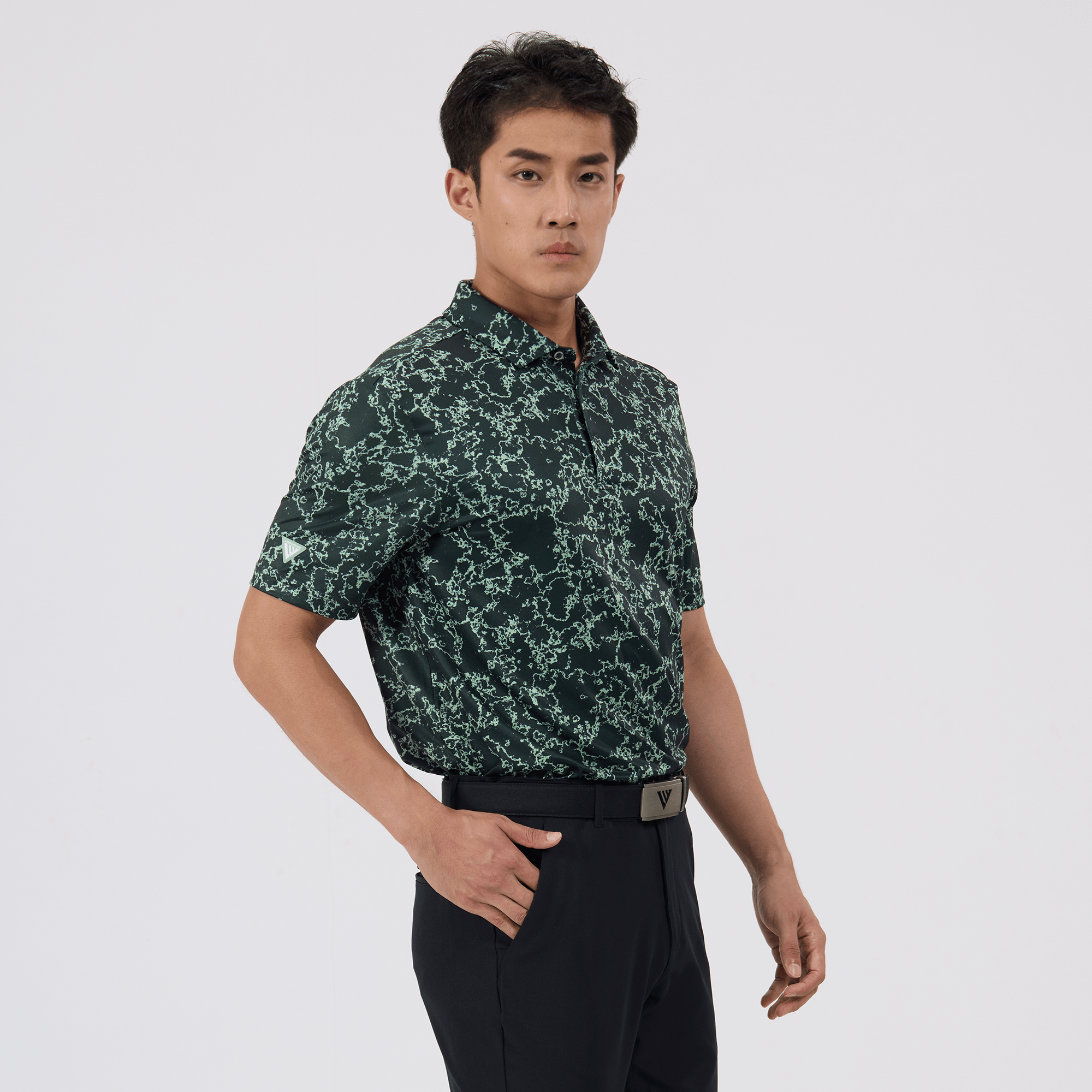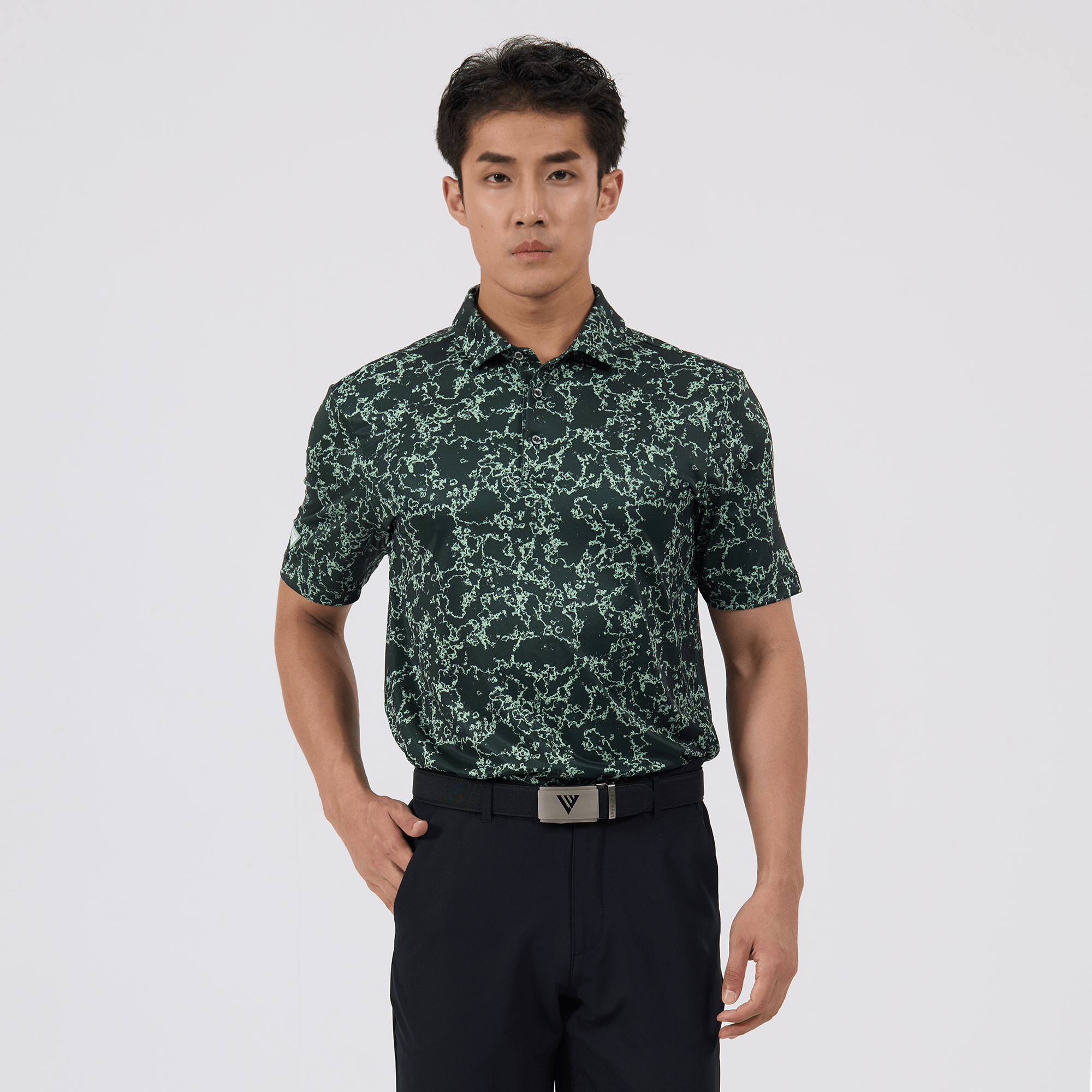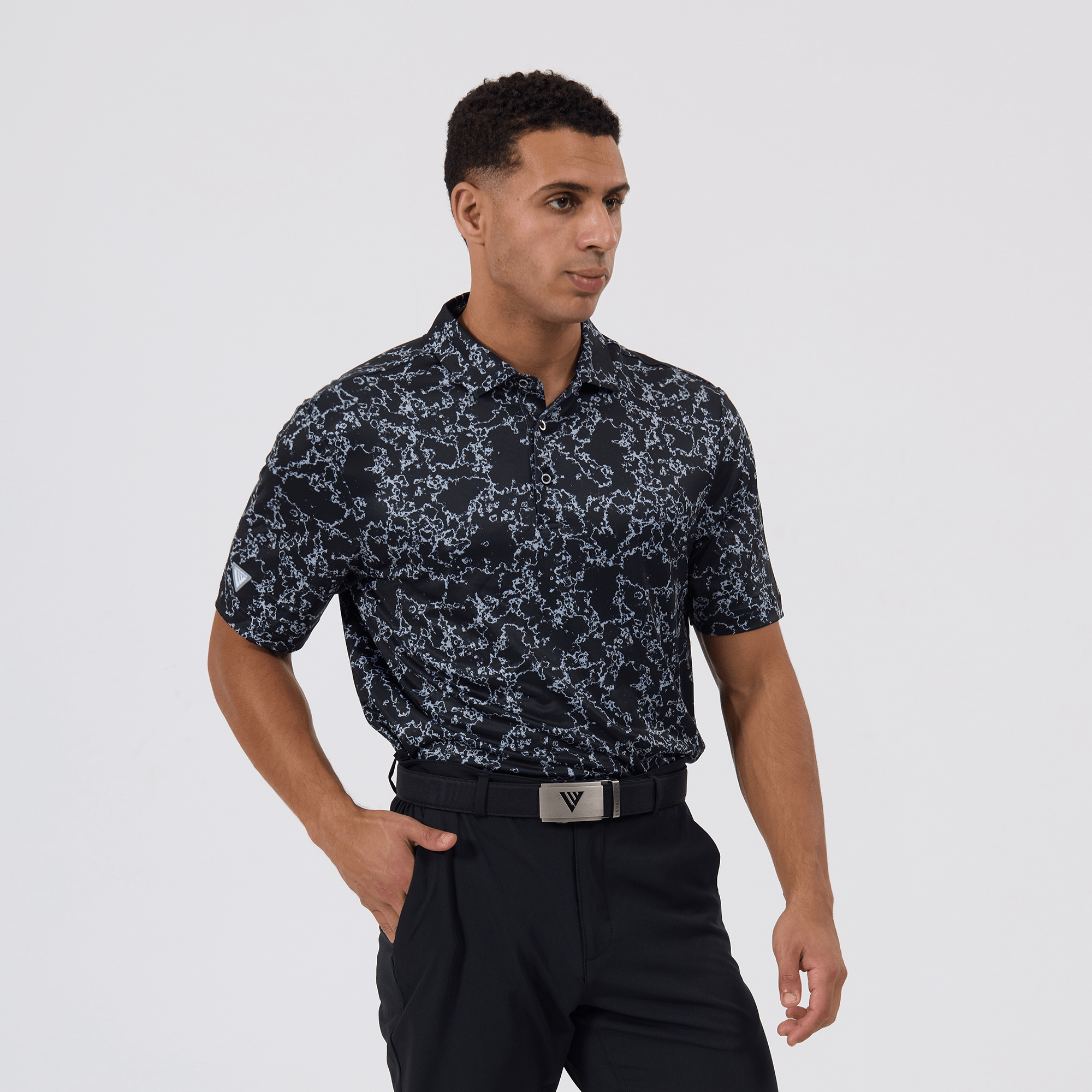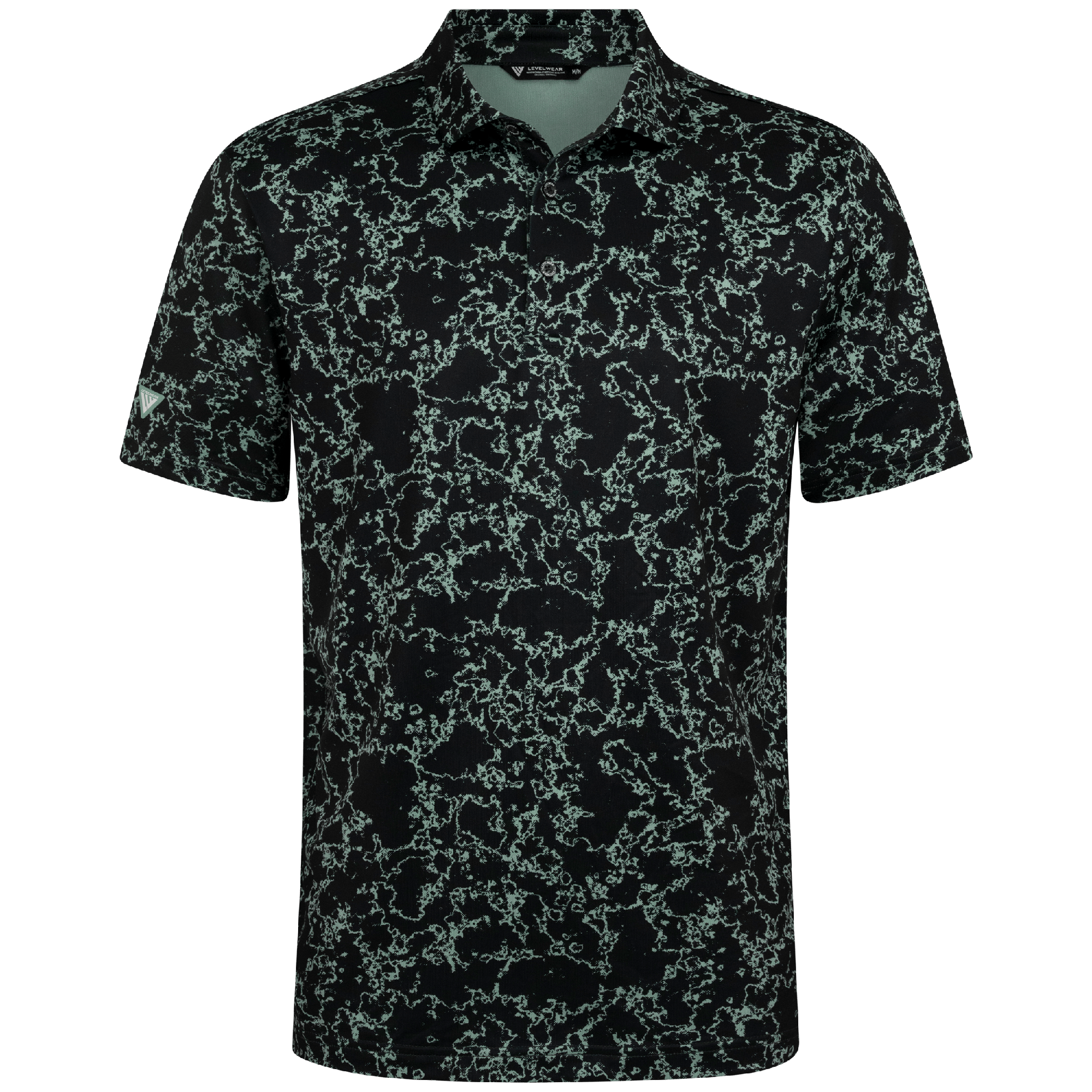 Introducing the men's Camoflow polo, a modern twist on classic camouflage, designed for both the golf enthusiast and the style conscious. This polo is made from a blend of 91% polyester and 9% spandex, offering a flexible fit that moves with you. It features advanced moisture-wicking and anti-bacterial properties to ensure you stay cool and fresh, while UPF 50+ protection shields you from the sun's harmful rays during long hours outdoors. The self-fabric collar with built-in collar stay keeps the neckline neat and structured, and the high-low hem with side slits provides enhanced mobility and a contemporary silhouette. With its unique, updated take on camouflage, the Camoflow polo is perfect for golfers looking to make a statement on the course and in casual settings.