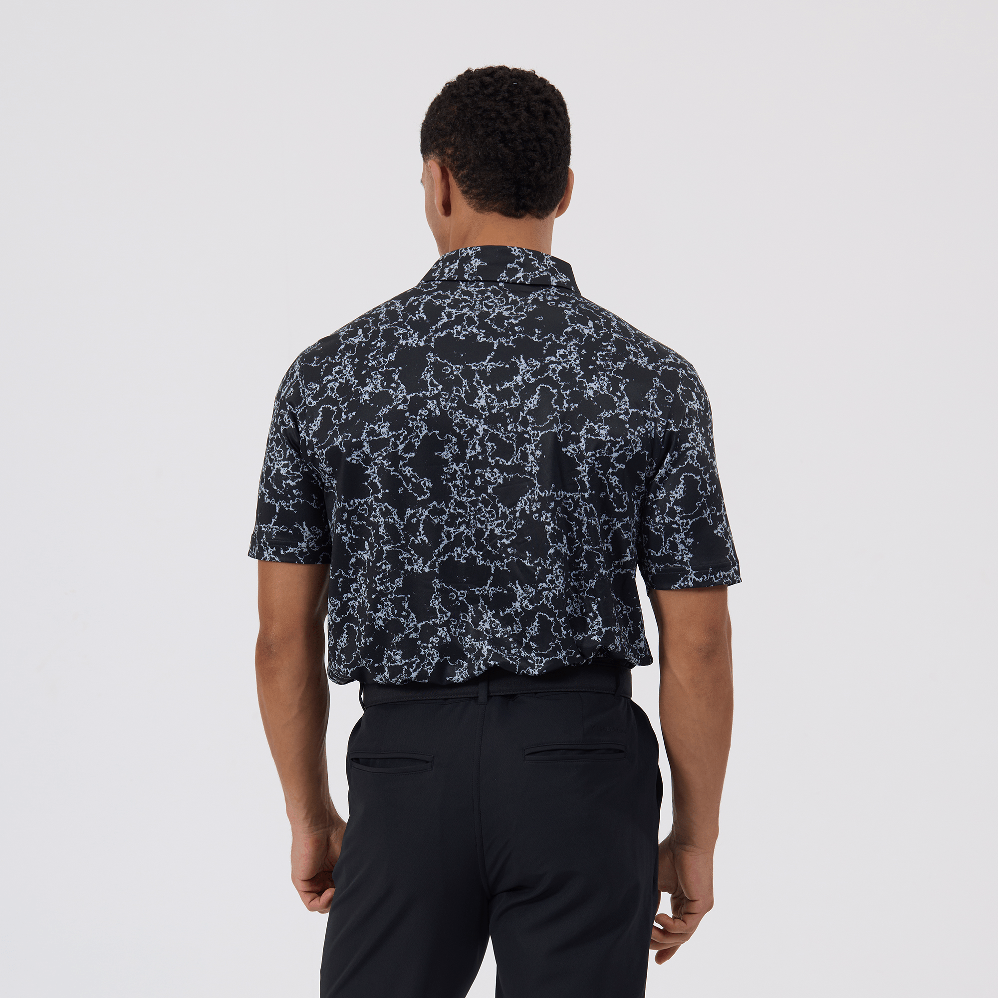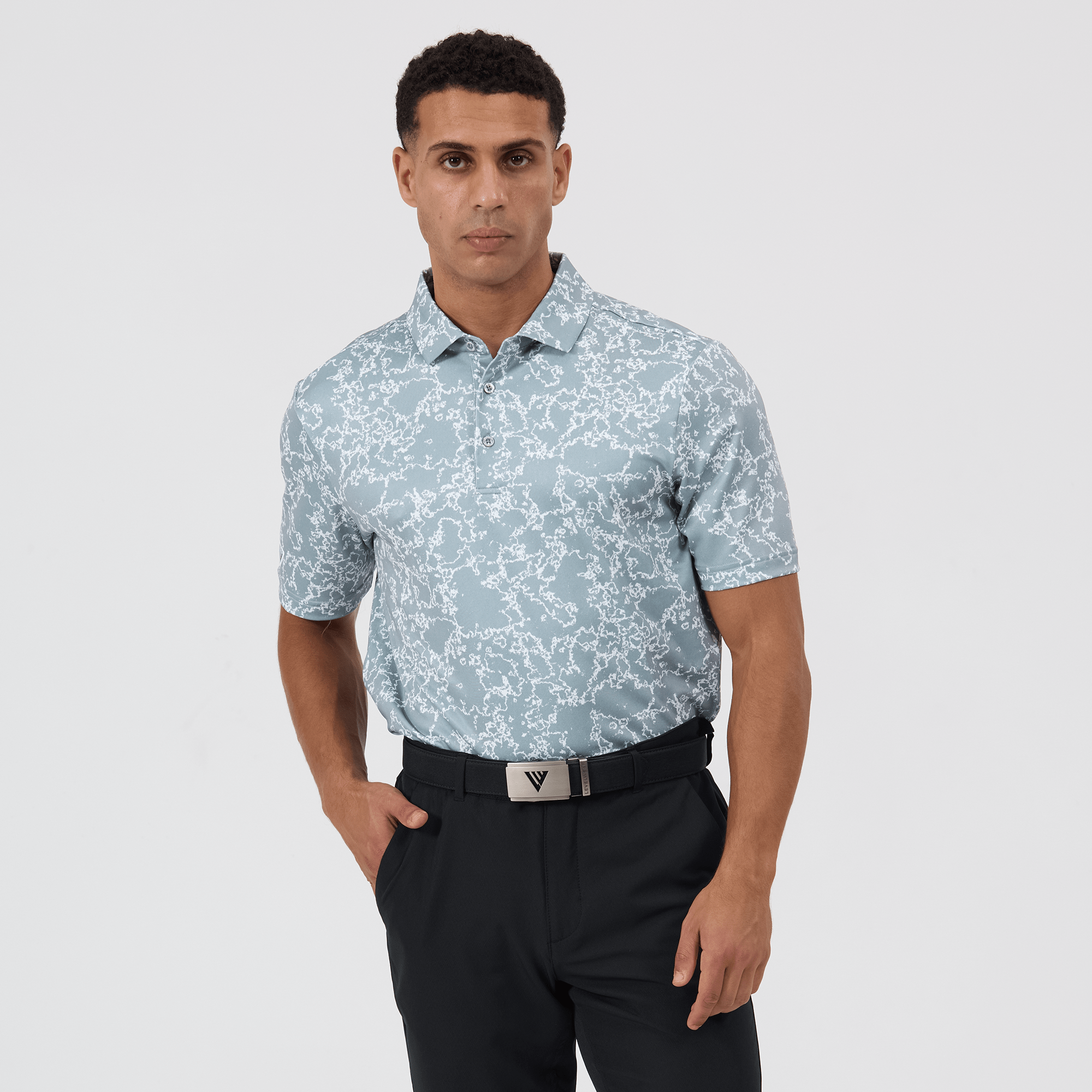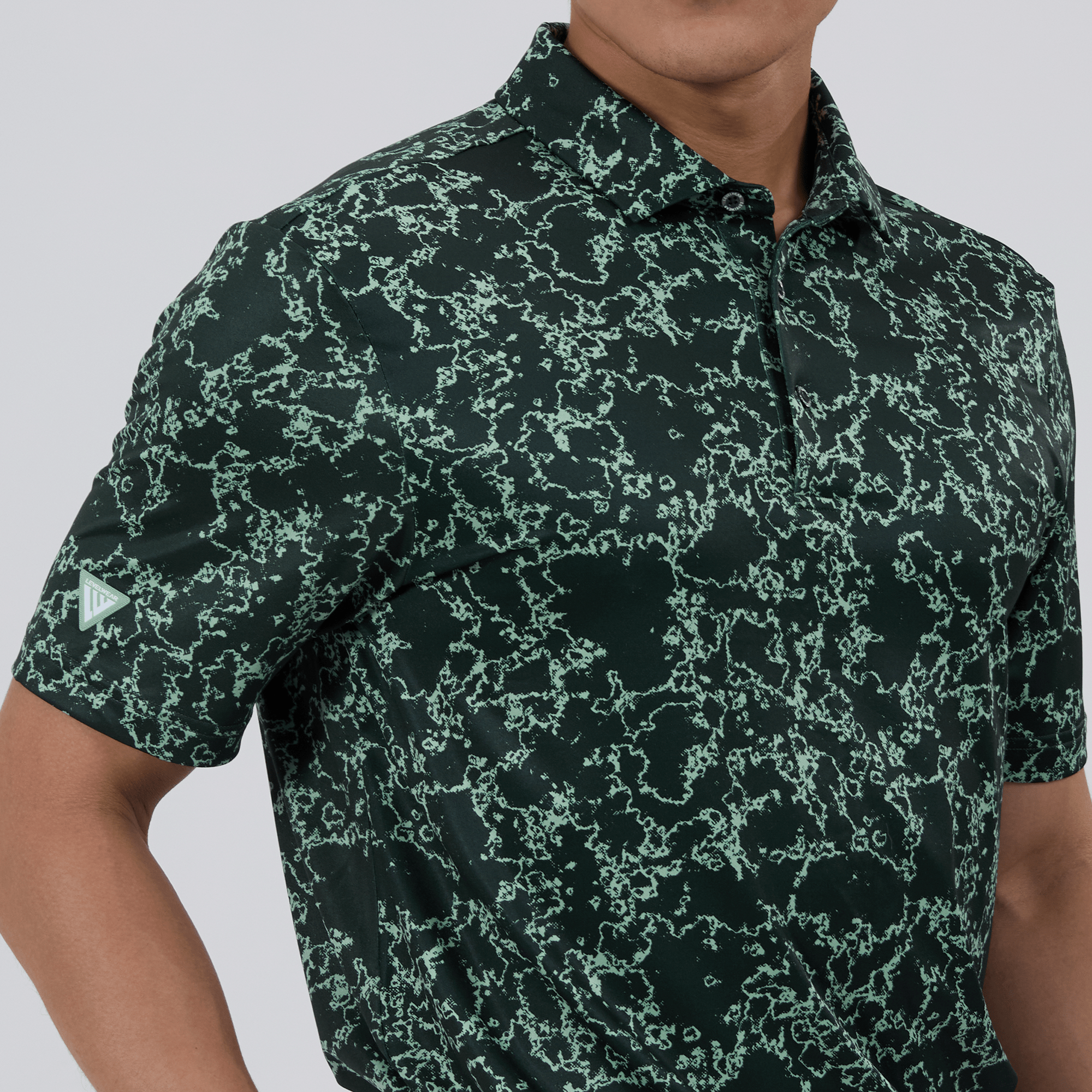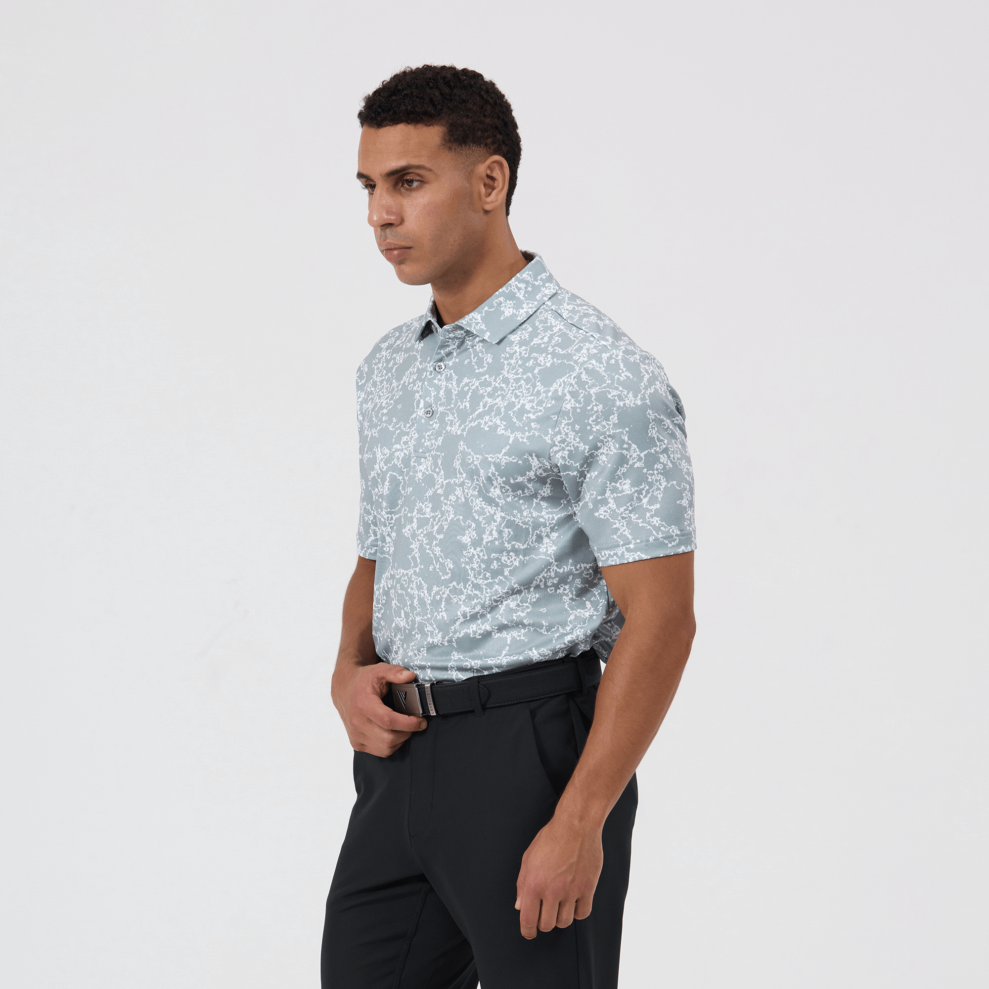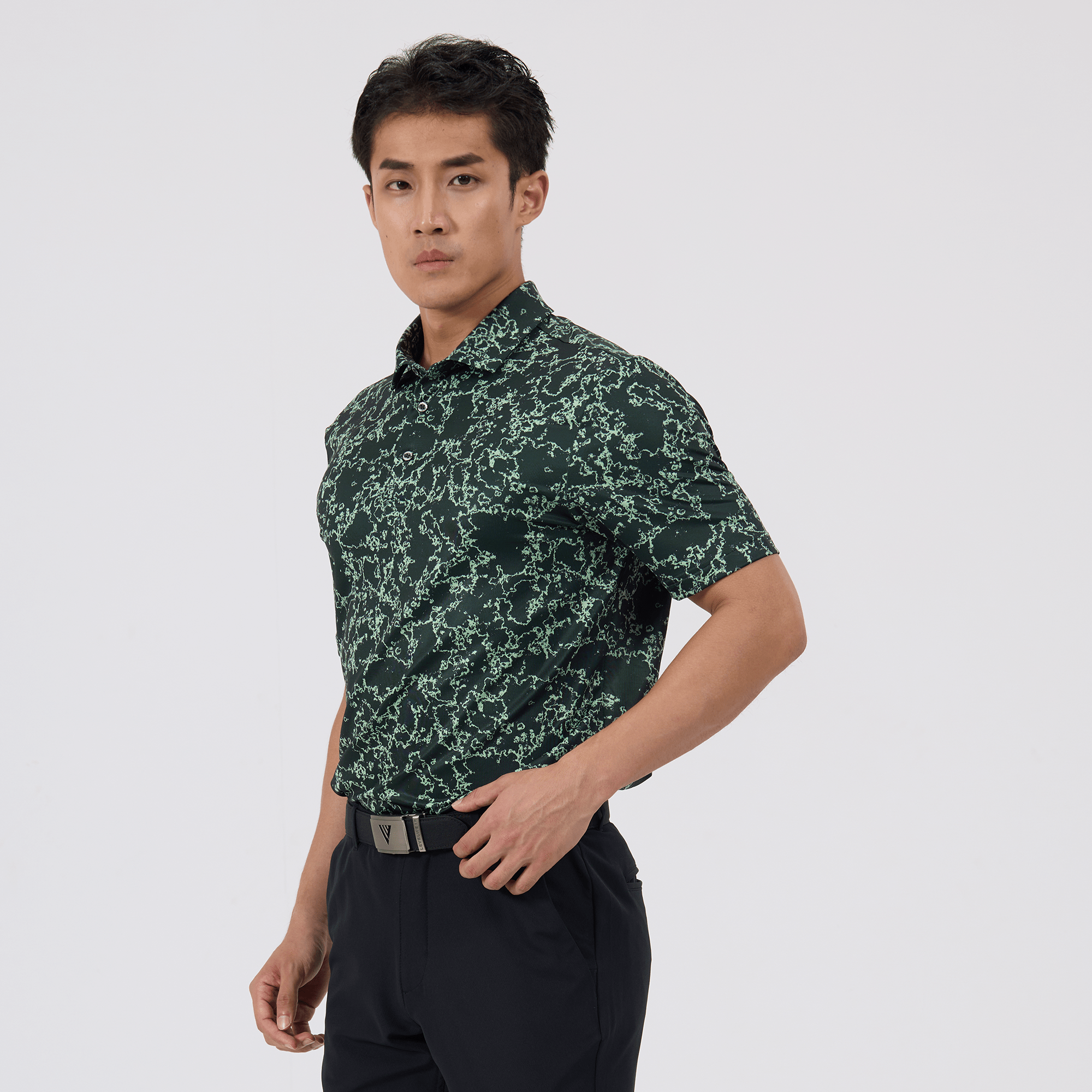 Introducing the men's Camoflow polo, a modern twist on classic camouflage, designed for both the golf enthusiast and the style conscious. This polo is made from a blend of 91% polyester and 9% spandex, offering a flexible fit that moves with you. It features advanced moisture-wicking and anti-bacterial properties to ensure you stay cool and fresh, while UPF 50+ protection shields you from the sun's harmful rays during long hours outdoors. The self-fabric collar with built-in collar stay keeps the neckline neat and structured, and the high-low hem with side slits provides enhanced mobility and a contemporary silhouette. With its unique, updated take on camouflage, the Camoflow polo is perfect for golfers looking to make a statement on the course and in casual settings.