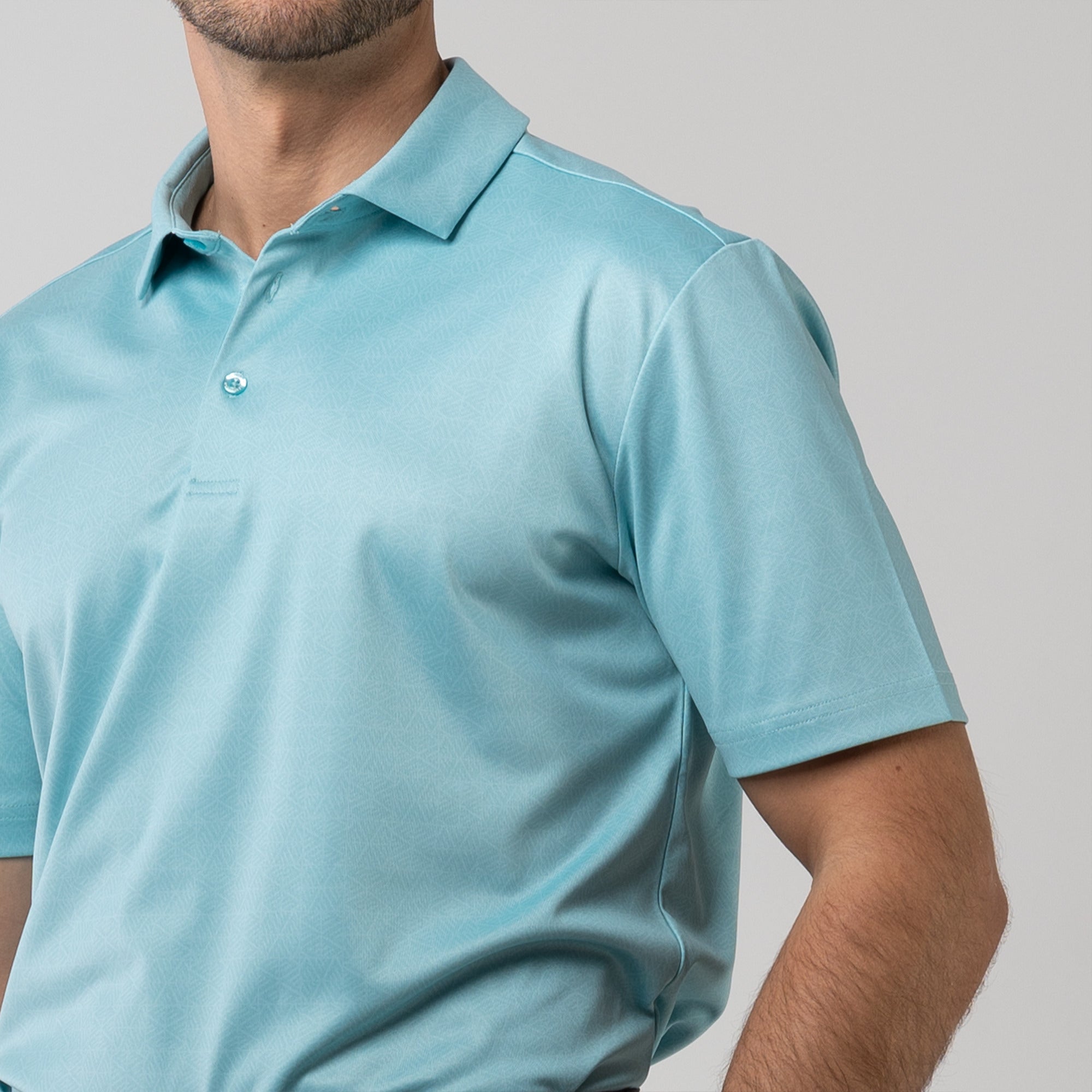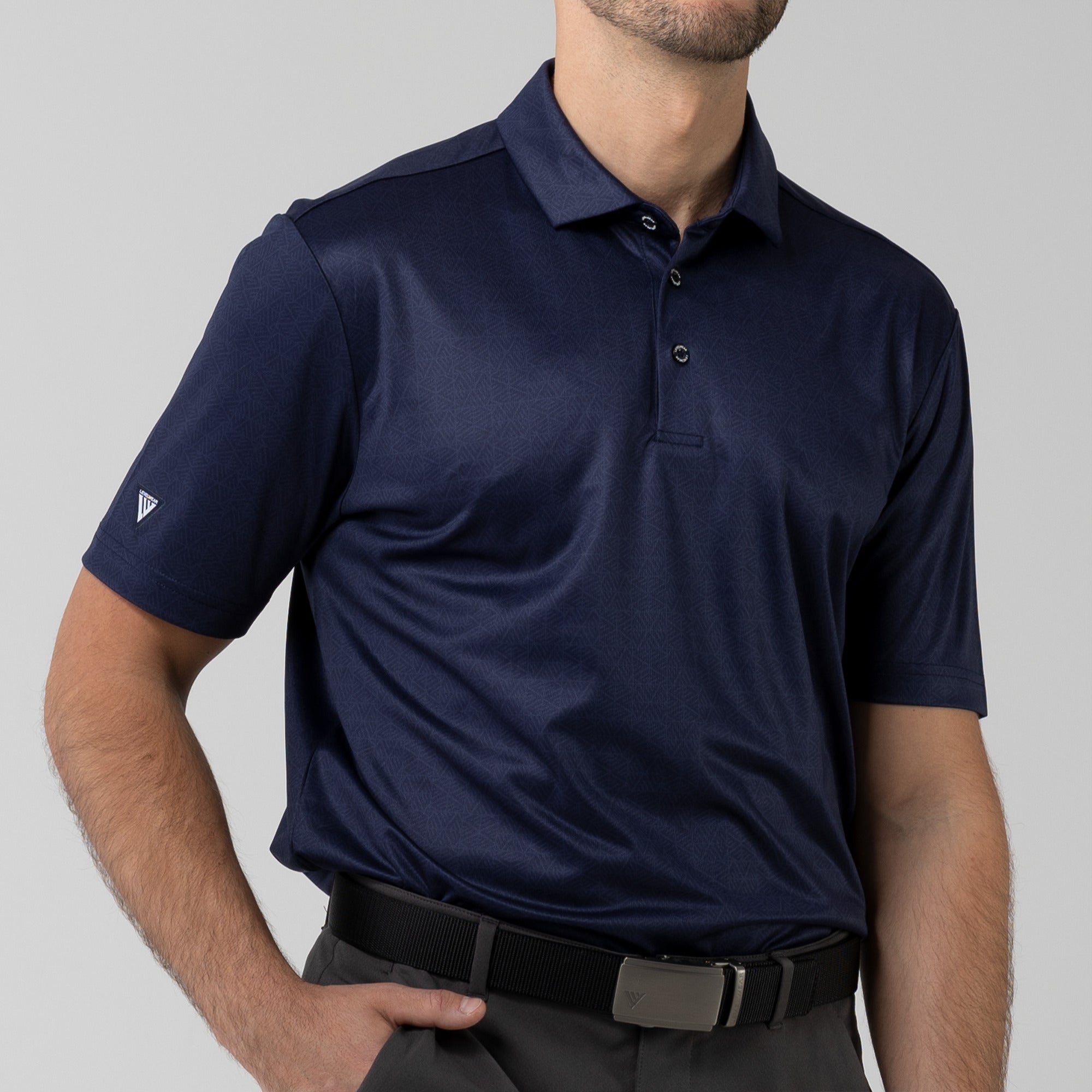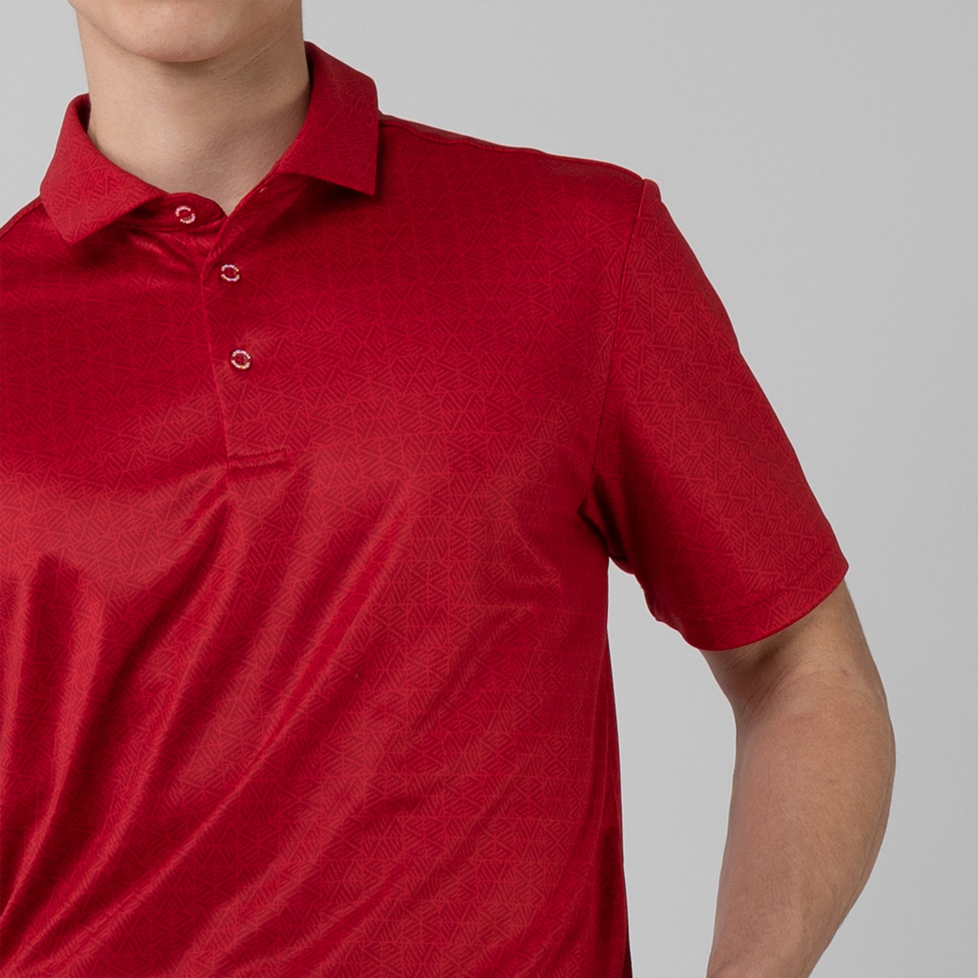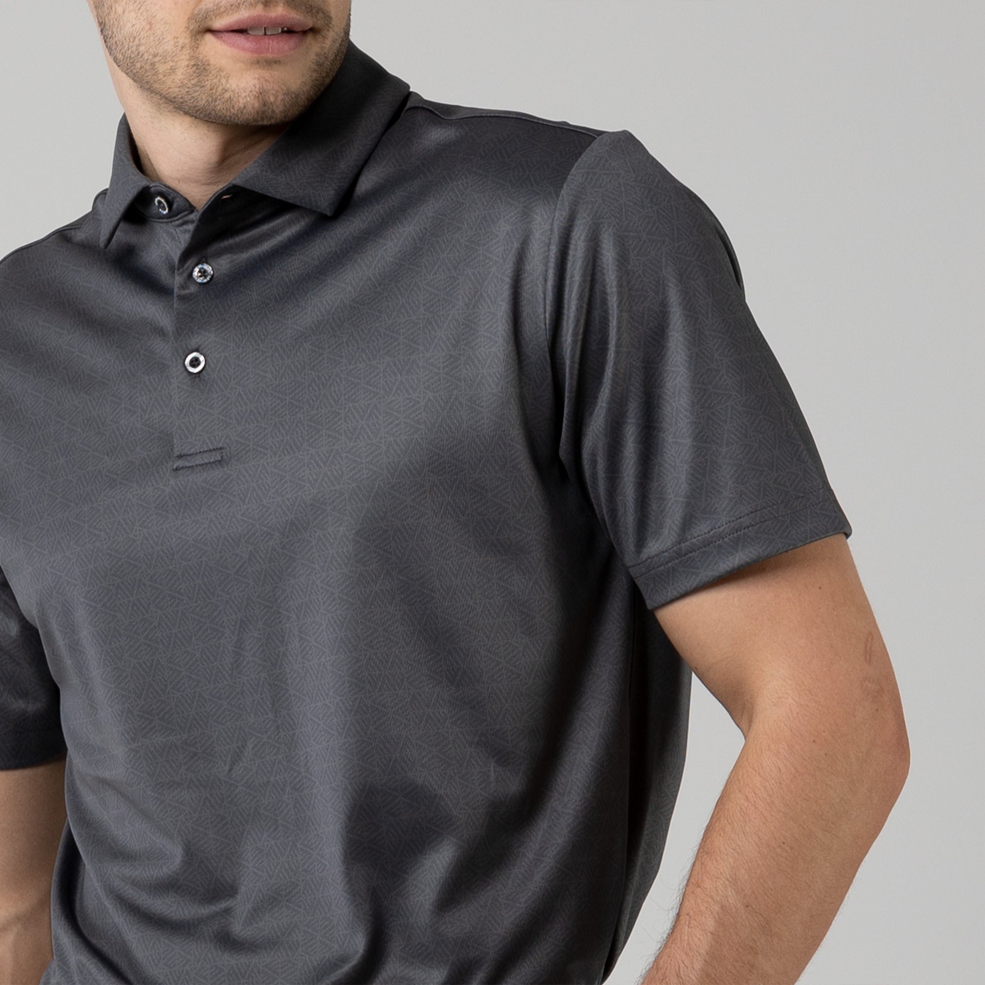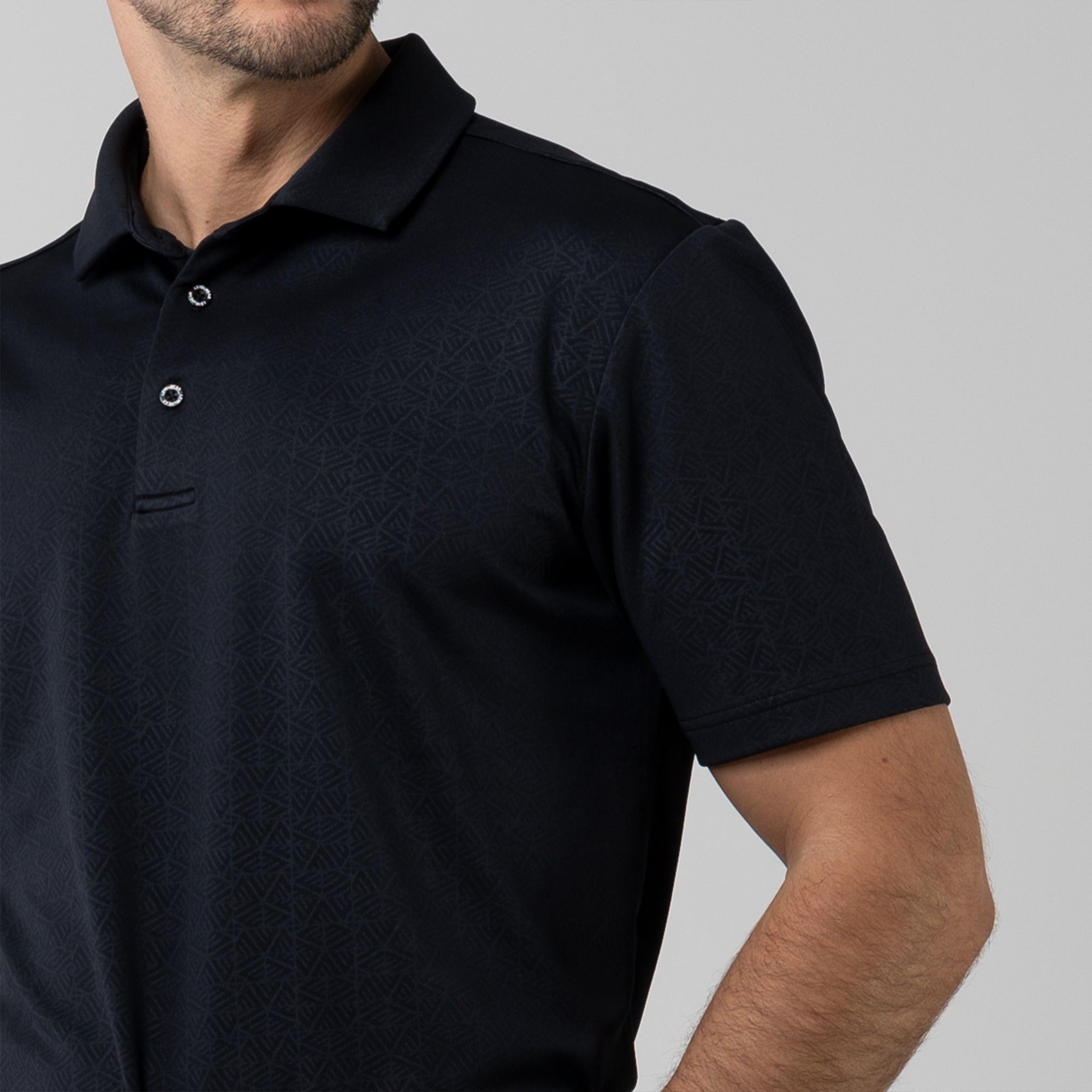 The men's Reveal polo is made from 100% polyester, is lightweight and designed to handle the rigors of an active day with its moisture-wicking technology that ensures you stay dry as you move from hole to hole. The self-fabric collar contributes to a clean, streamlined look, maintaining its shape even after multiple wears. It features a high-low hem with side slits for an enhanced range of motion and a contemporary fit that looks just as good at the 19th hole as it does on the green. Perfect for any golfer, the Reveal Polo combines classic styling with modern fabric technology to keep you comfortable and stylish throughout your game. The Reveal also features a subtle geometric pattern that brings this polo to life.
