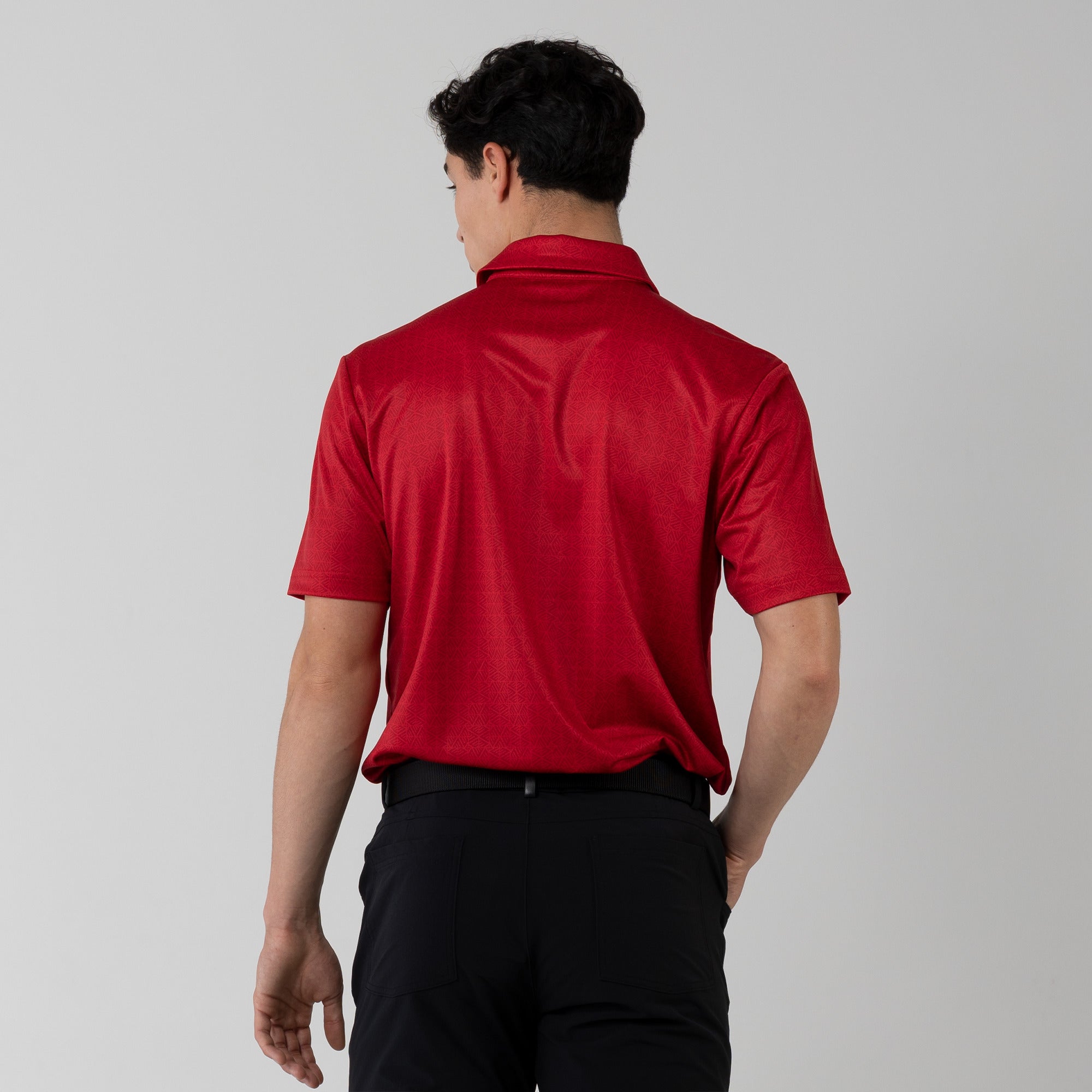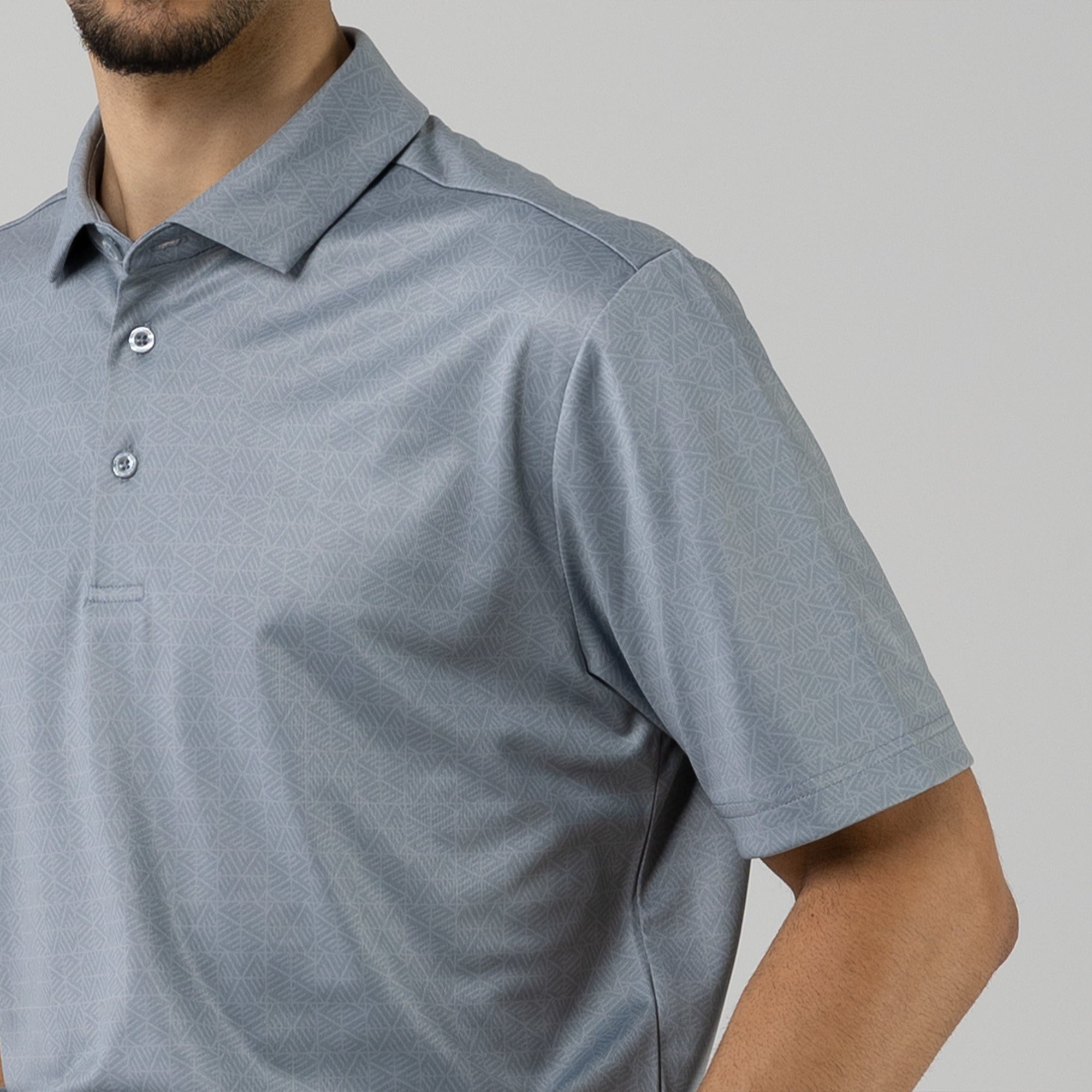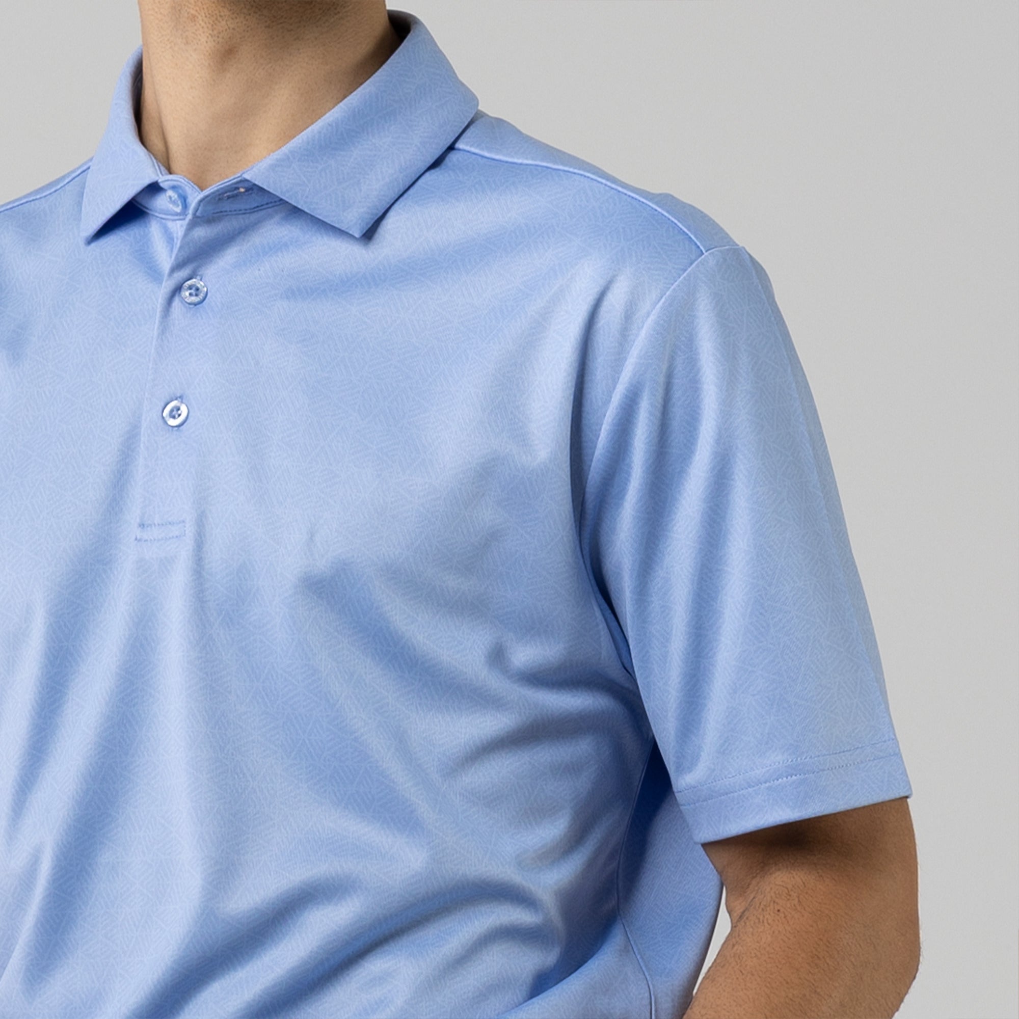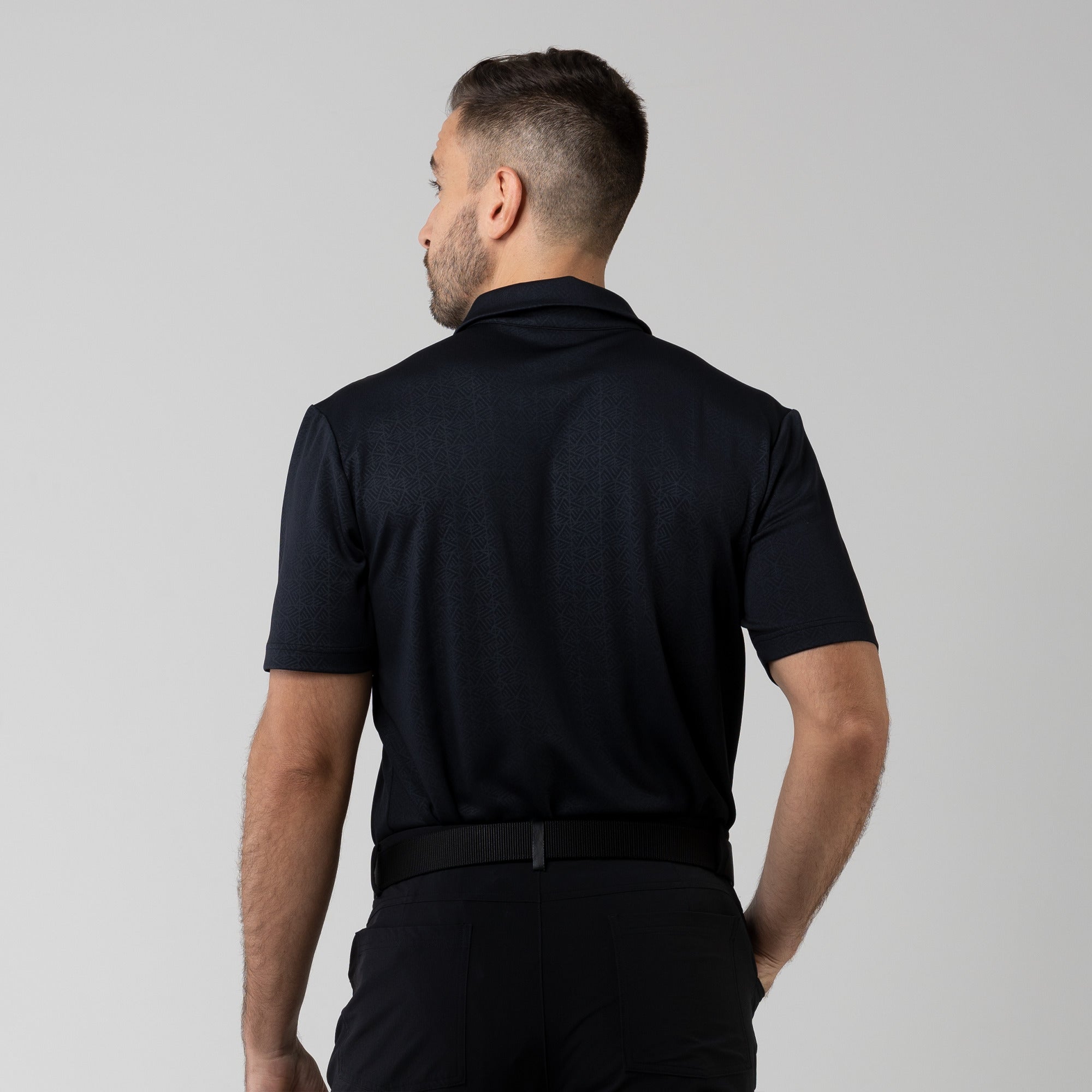 The men's Reveal polo is made from 100% polyester, is lightweight and designed to handle the rigors of an active day with its moisture-wicking technology that ensures you stay dry as you move from hole to hole. The self-fabric collar contributes to a clean, streamlined look, maintaining its shape even after multiple wears. It features a high-low hem with side slits for an enhanced range of motion and a contemporary fit that looks just as good at the 19th hole as it does on the green. Perfect for any golfer, the Reveal Polo combines classic styling with modern fabric technology to keep you comfortable and stylish throughout your game. The Reveal also features a subtle geometric pattern that brings this polo to life.