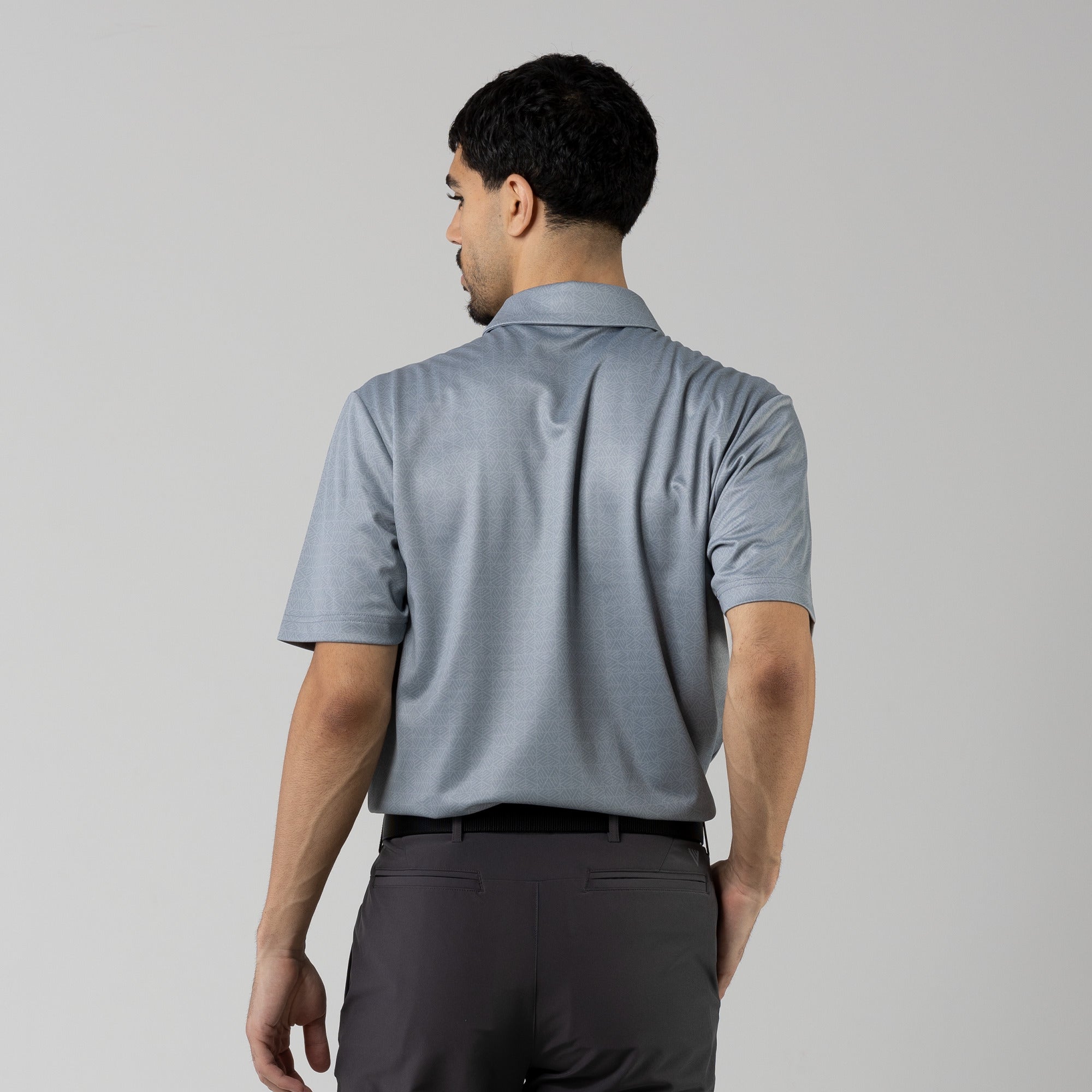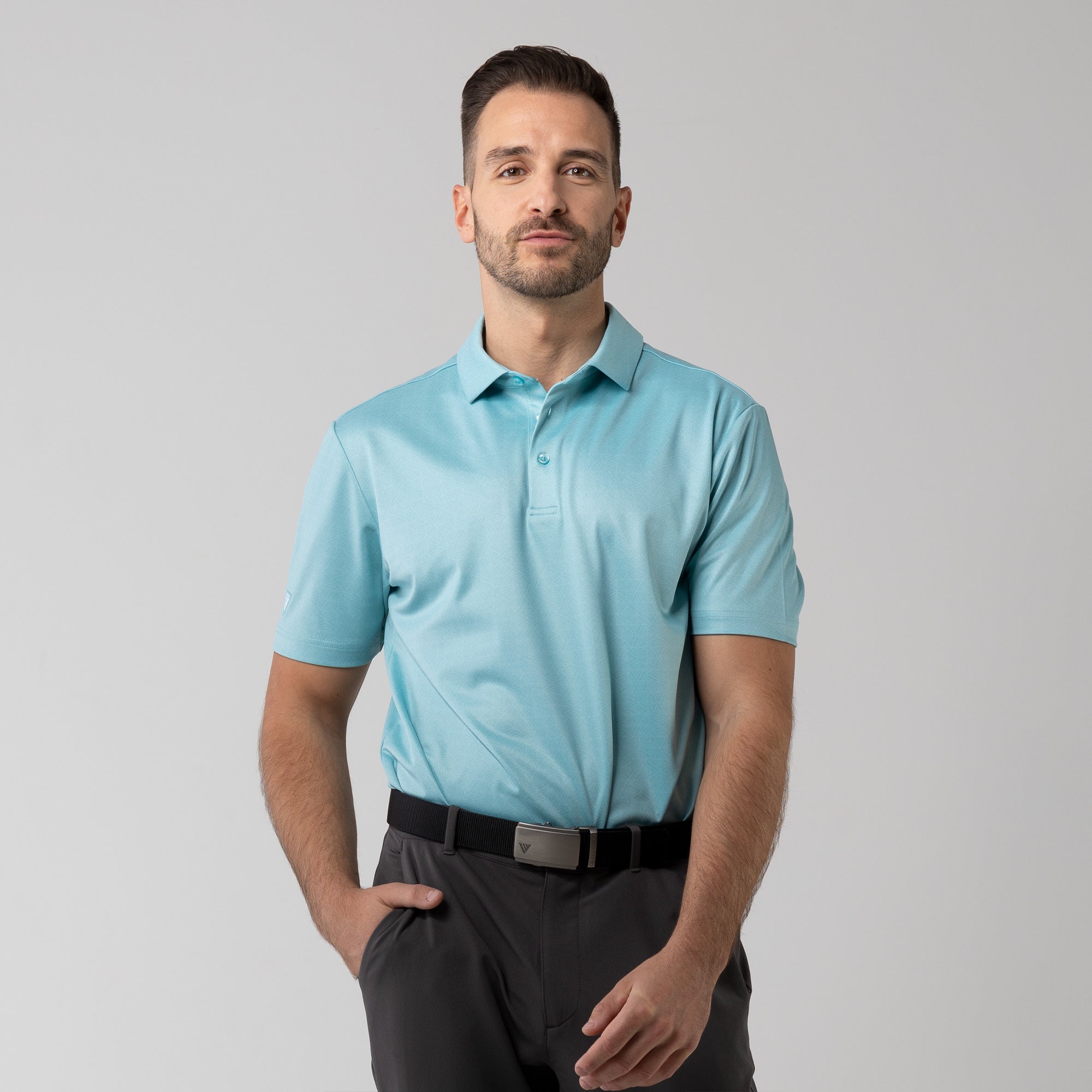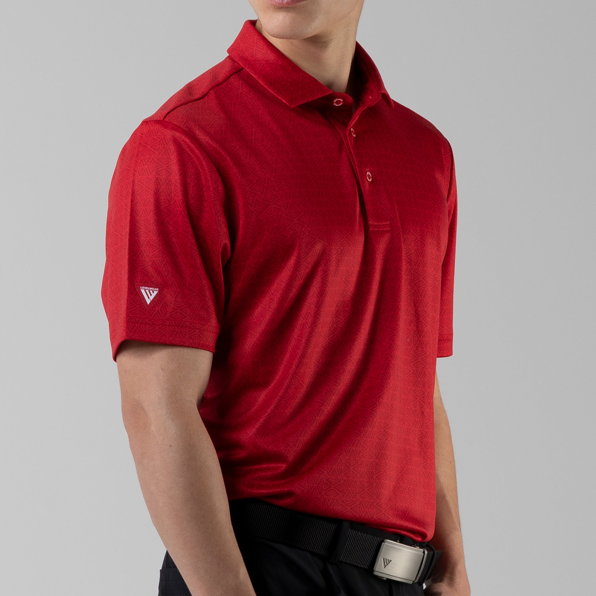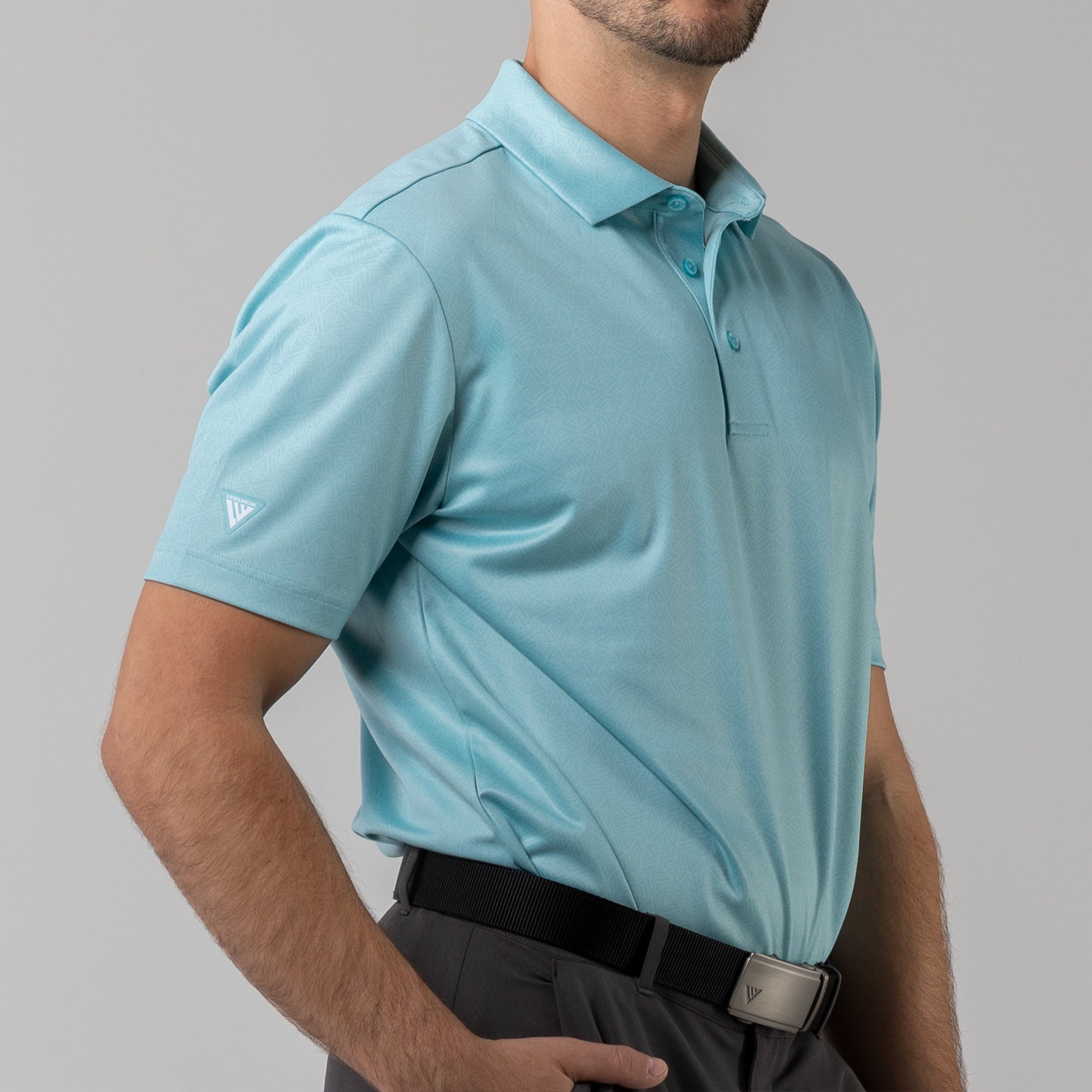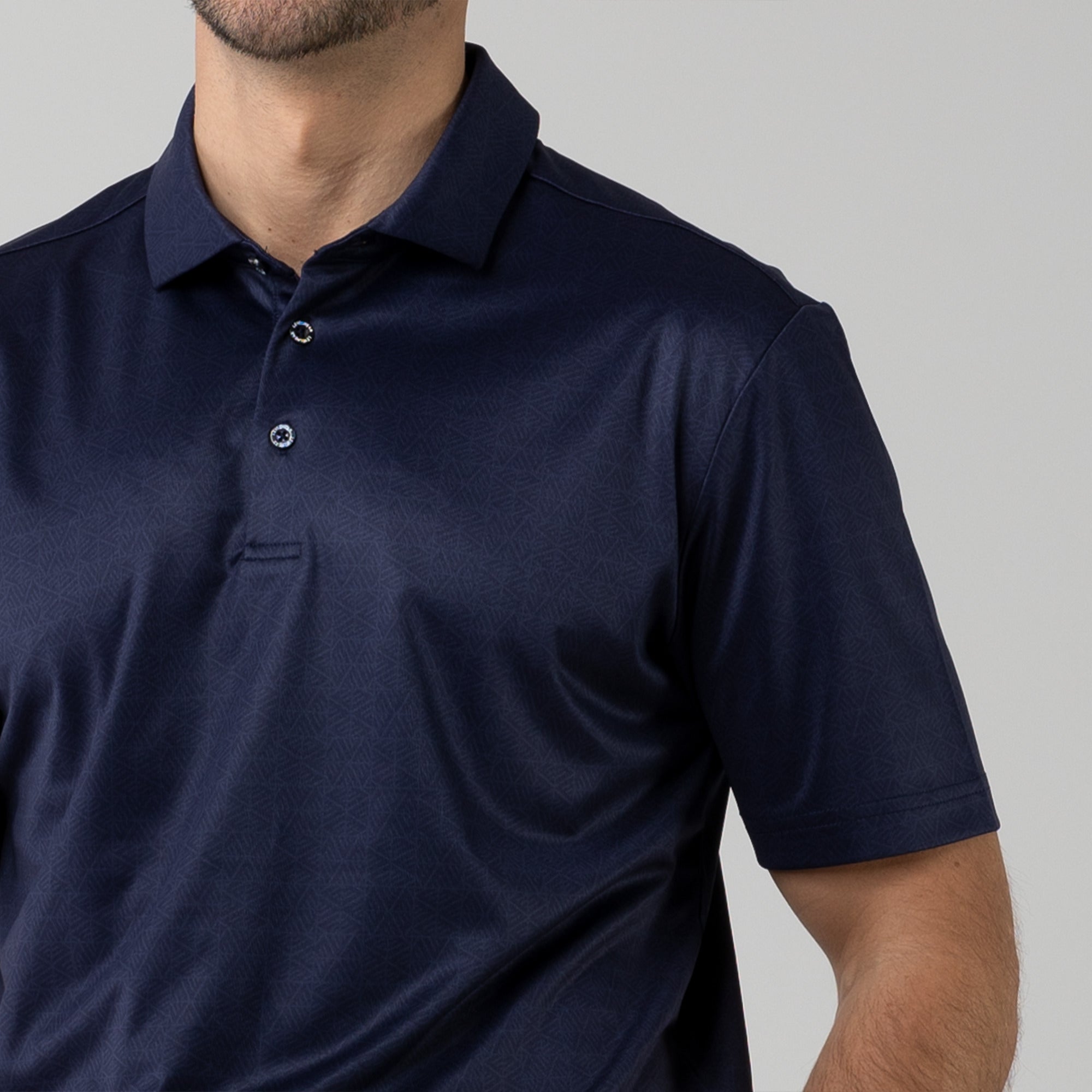 The men's Reveal polo is made from 100% polyester, is lightweight and designed to handle the rigors of an active day with its moisture-wicking technology that ensures you stay dry as you move from hole to hole. The self-fabric collar contributes to a clean, streamlined look, maintaining its shape even after multiple wears. It features a high-low hem with side slits for an enhanced range of motion and a contemporary fit that looks just as good at the 19th hole as it does on the green. Perfect for any golfer, the Reveal Polo combines classic styling with modern fabric technology to keep you comfortable and stylish throughout your game. The Reveal also features a subtle geometric pattern that brings this polo to life.
