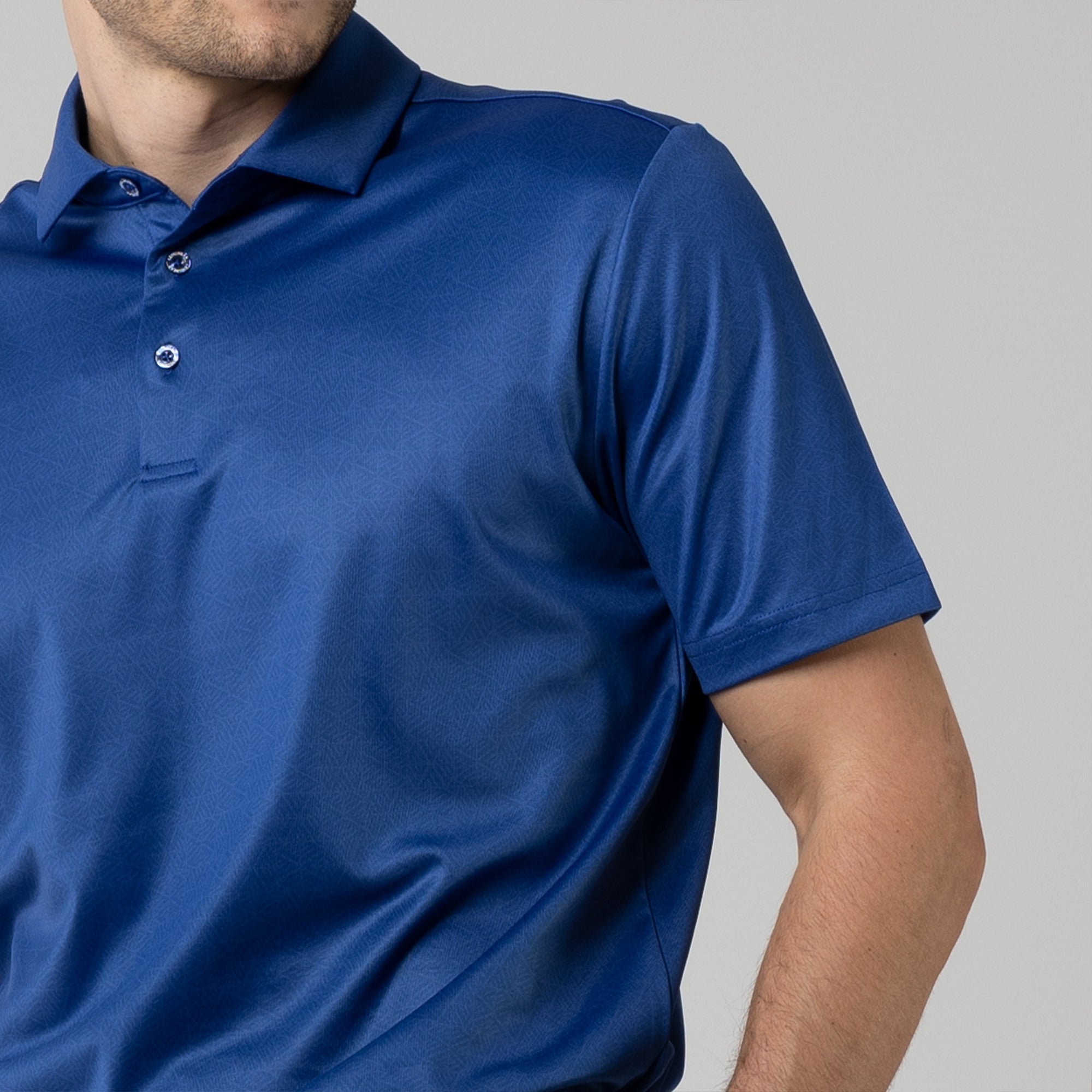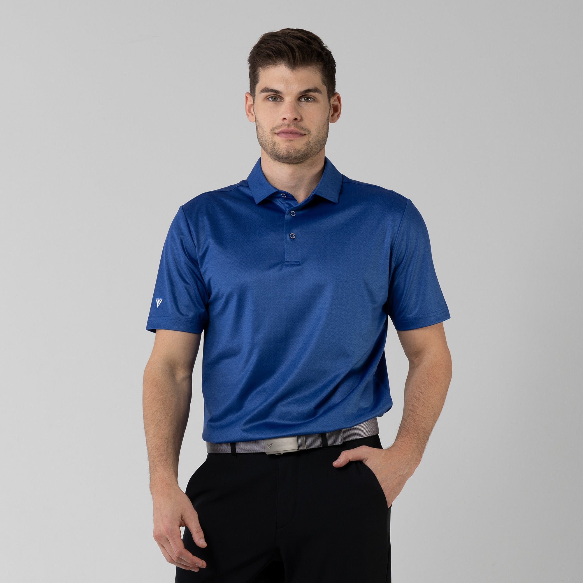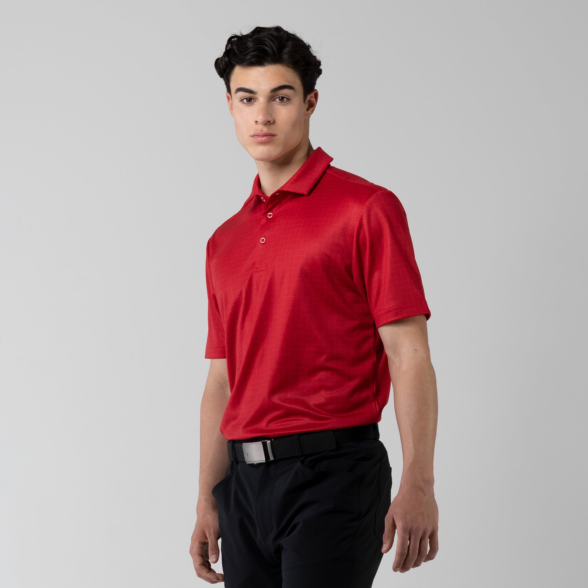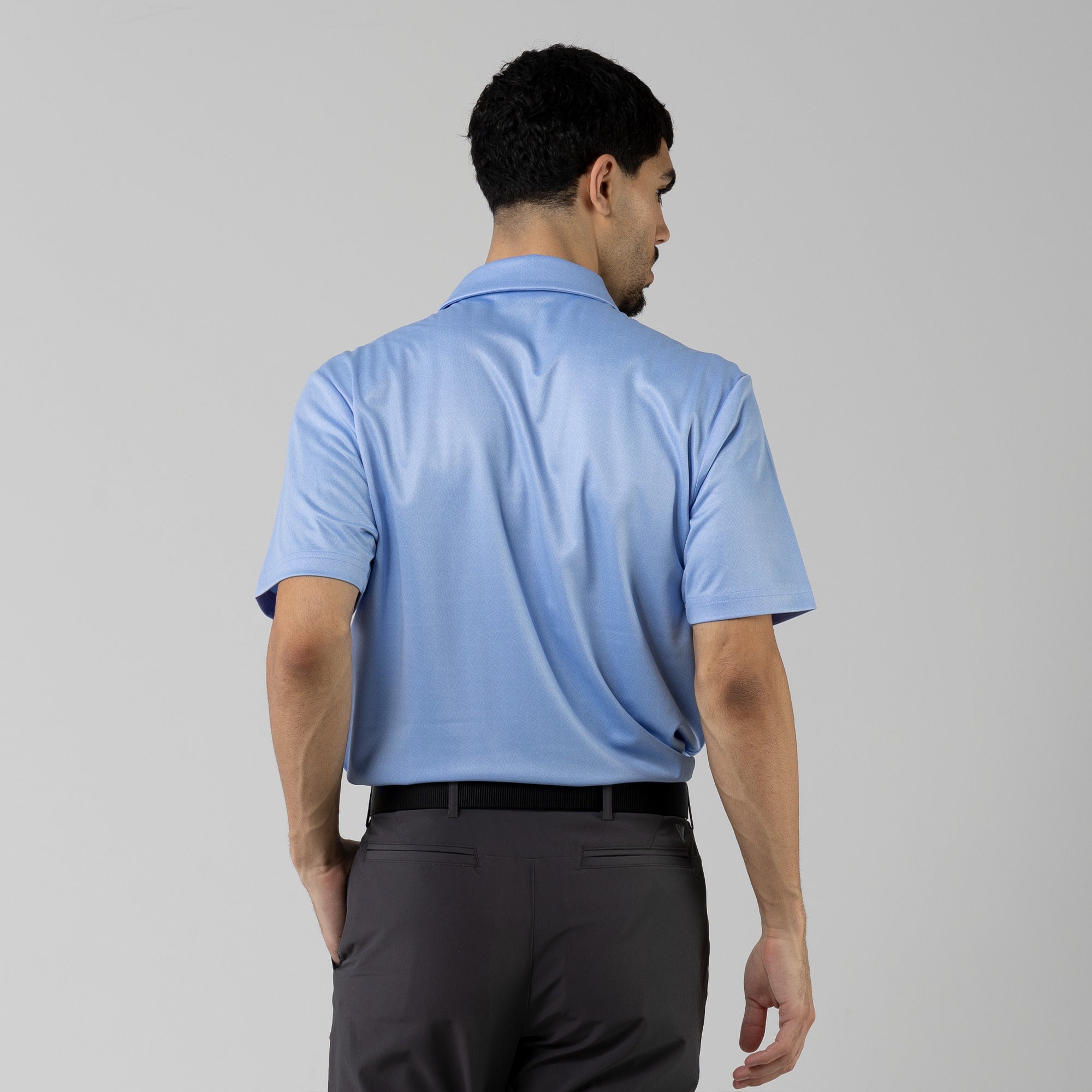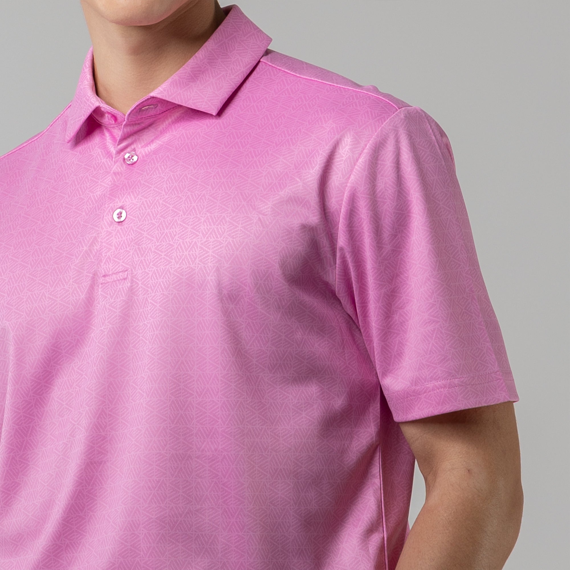 The men's Reveal polo is made from 100% polyester, is lightweight and designed to handle the rigors of an active day with its moisture-wicking technology that ensures you stay dry as you move from hole to hole. The self-fabric collar contributes to a clean, streamlined look, maintaining its shape even after multiple wears. It features a high-low hem with side slits for an enhanced range of motion and a contemporary fit that looks just as good at the 19th hole as it does on the green. Perfect for any golfer, the Reveal Polo combines classic styling with modern fabric technology to keep you comfortable and stylish throughout your game. The Reveal also features a subtle geometric pattern that brings this polo to life.
