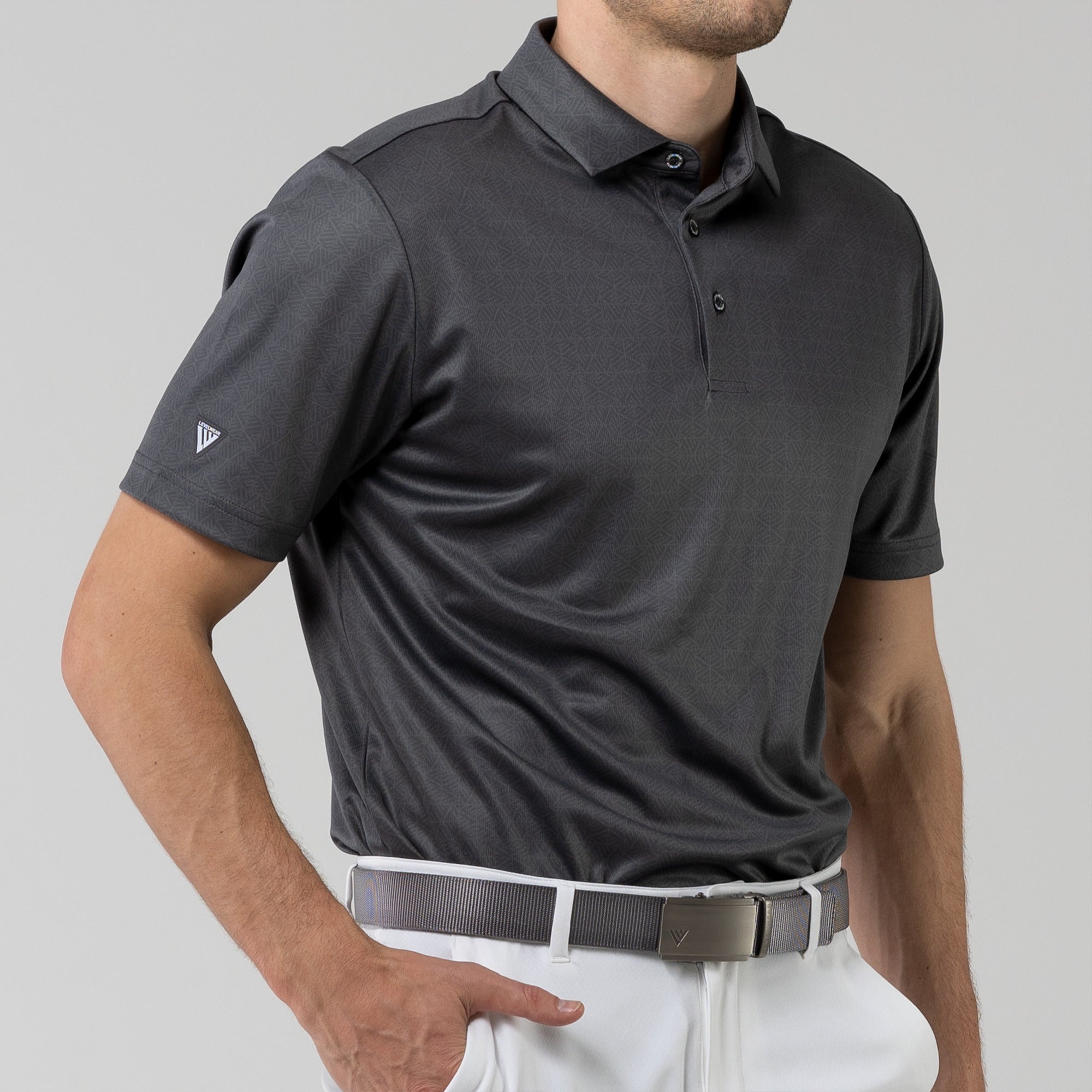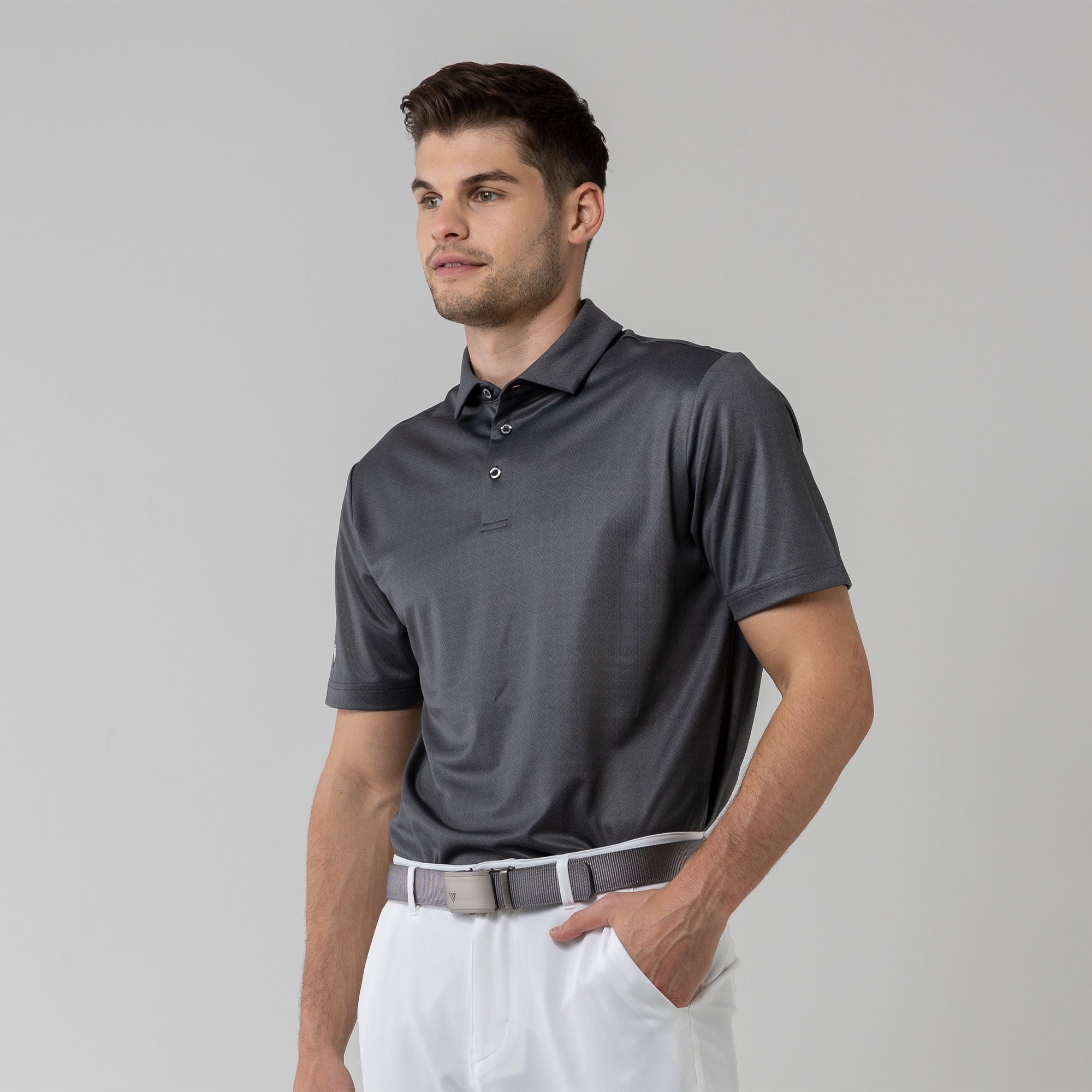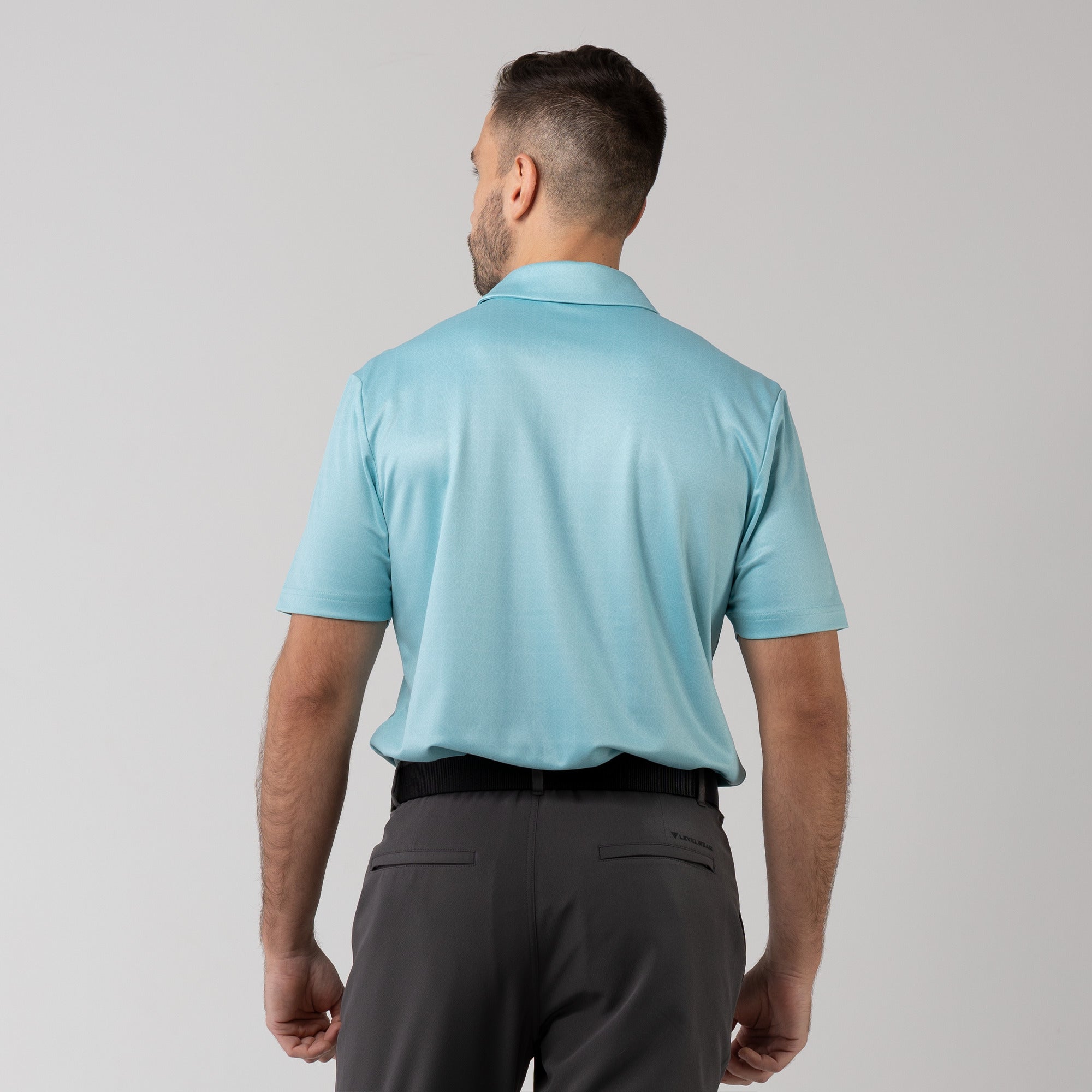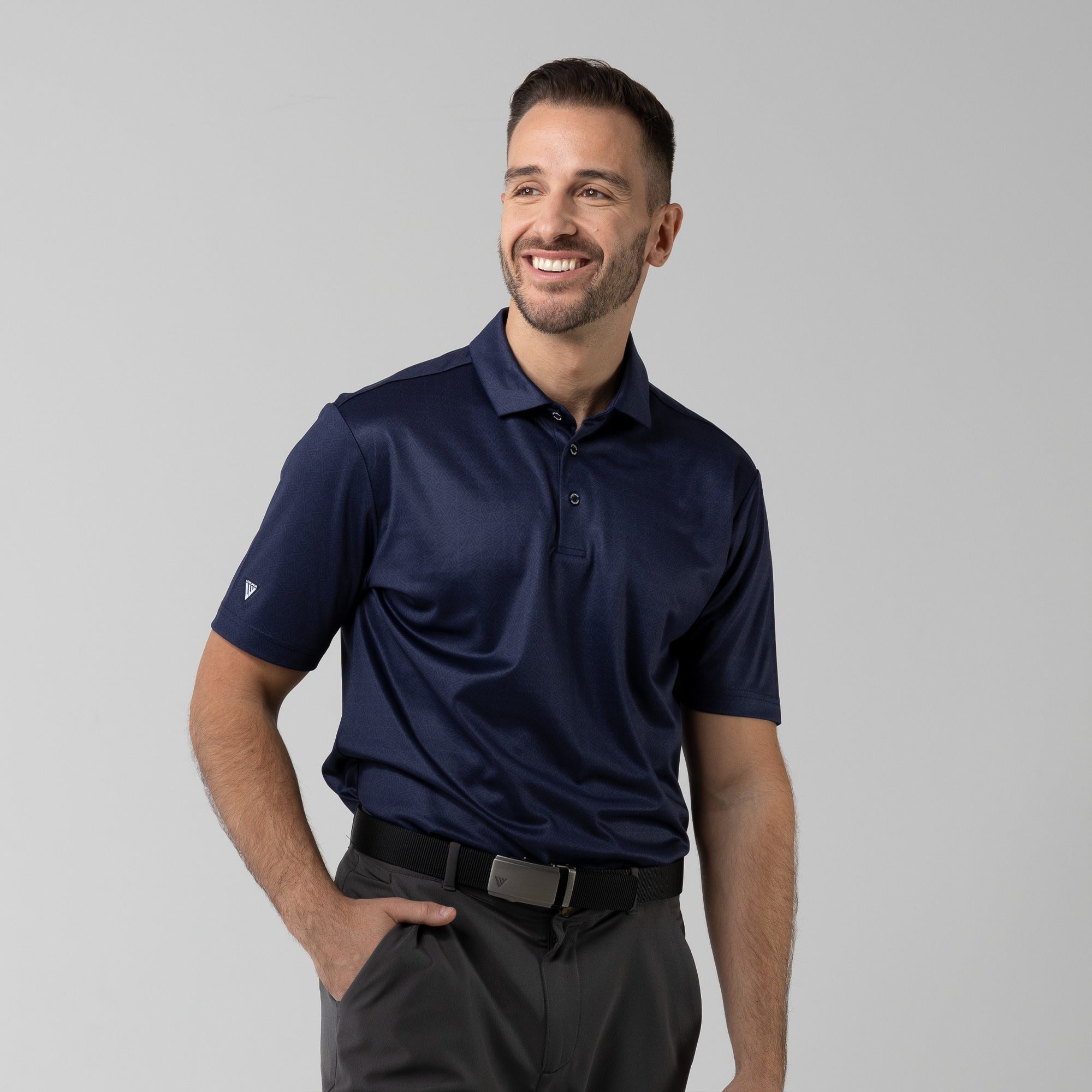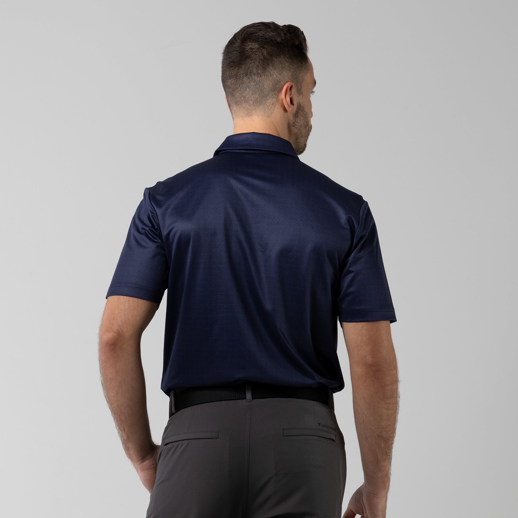 The men's Reveal polo is made from 100% polyester, is lightweight and designed to handle the rigors of an active day with its moisture-wicking technology that ensures you stay dry as you move from hole to hole. The self-fabric collar contributes to a clean, streamlined look, maintaining its shape even after multiple wears. It features a high-low hem with side slits for an enhanced range of motion and a contemporary fit that looks just as good at the 19th hole as it does on the green. Perfect for any golfer, the Reveal Polo combines classic styling with modern fabric technology to keep you comfortable and stylish throughout your game. The Reveal also features a subtle geometric pattern that brings this polo to life.
