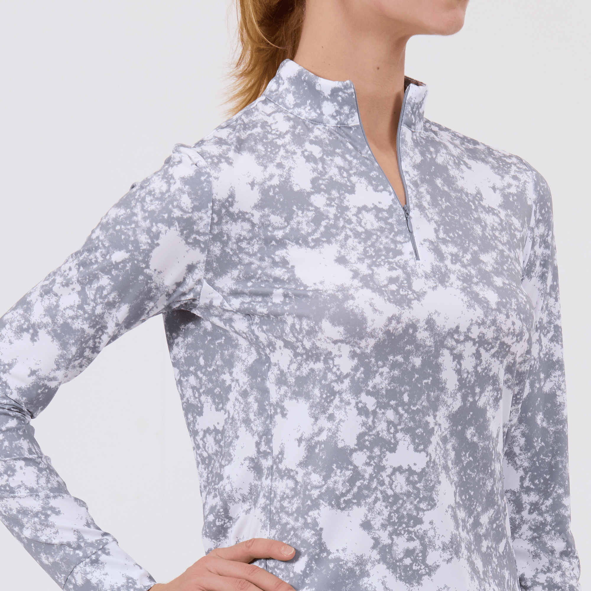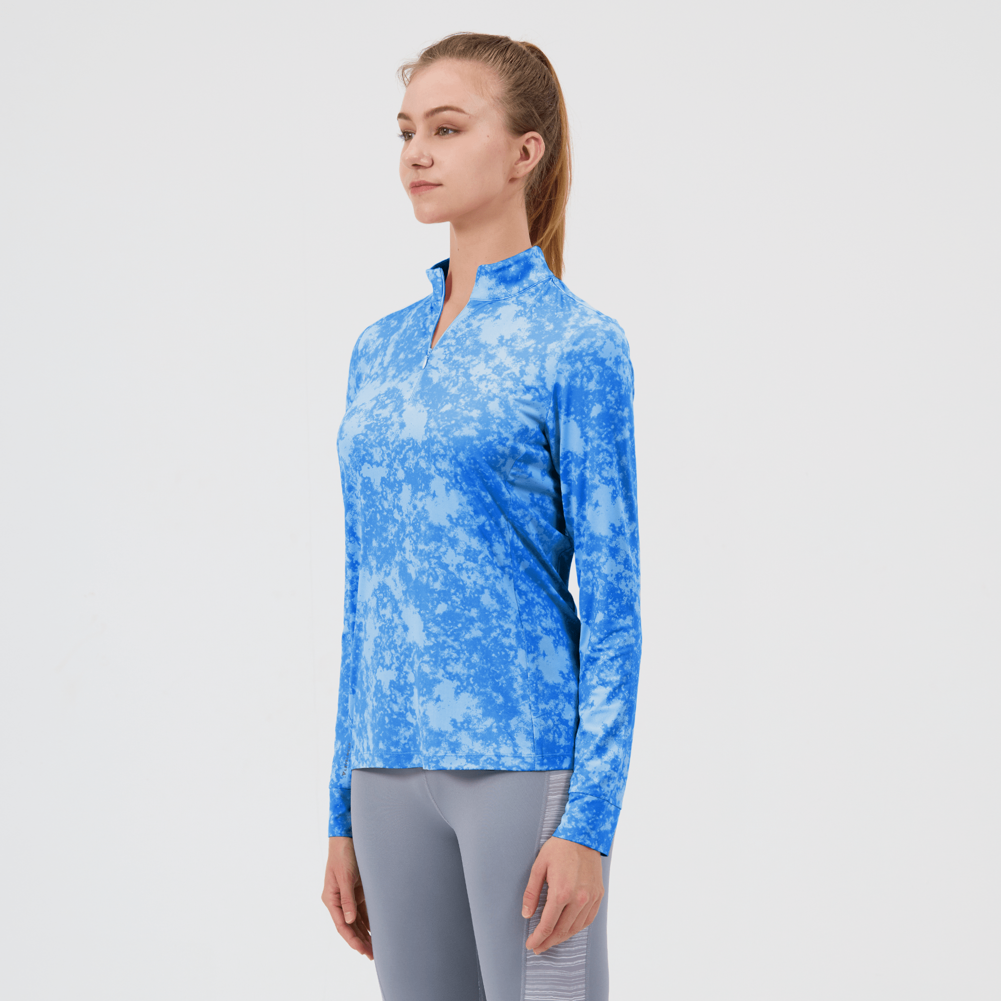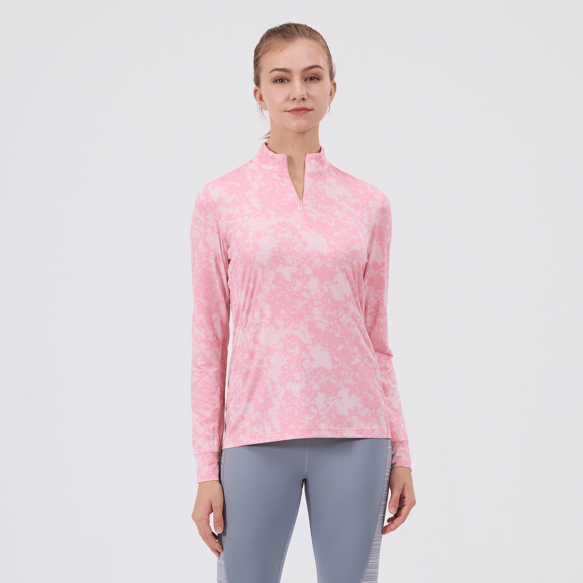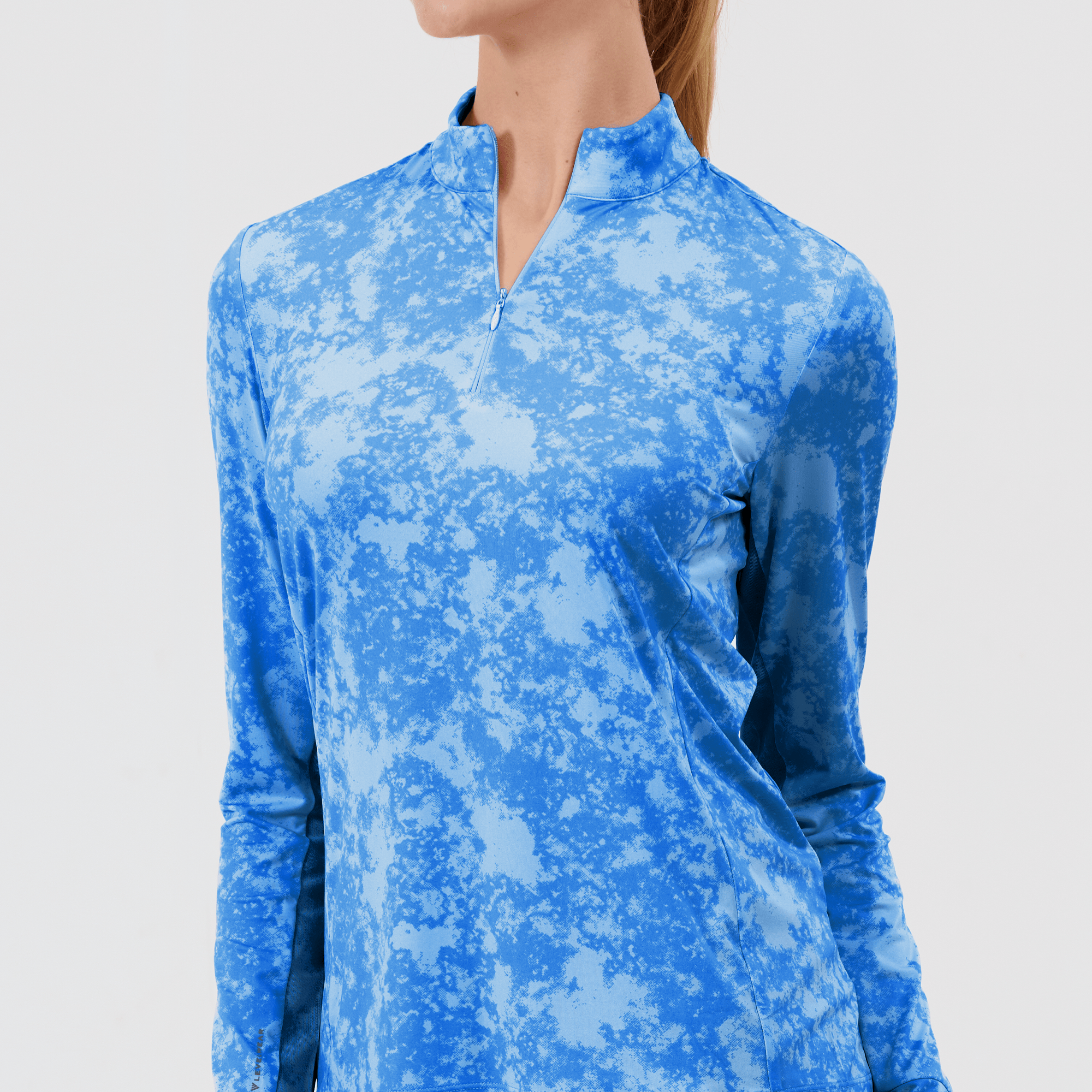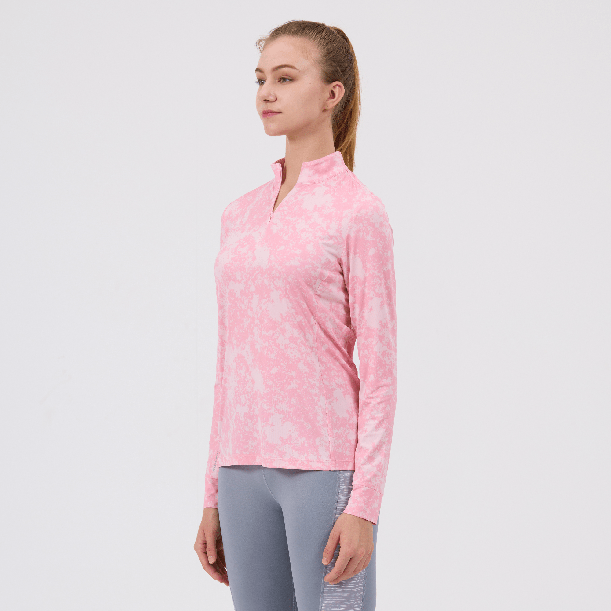 The women's Whisper long sleeve is the perfect lightweight layer for active lifestyles. Made from a blend of 88% polyester and 12% spandex, this top offers UPF 50+ protection and superior moisture-wicking capabilities to keep you comfortable and dry. The stylish all-over print is complemented by contrast solid side panels and mesh underarm panels for added breathability. Its invisible quarter-zip with a stand-up collar allows for adjustable coverage, while the high-low hem detail adds a modern touch to its design, making it an essential addition to your athletic wardrobe.