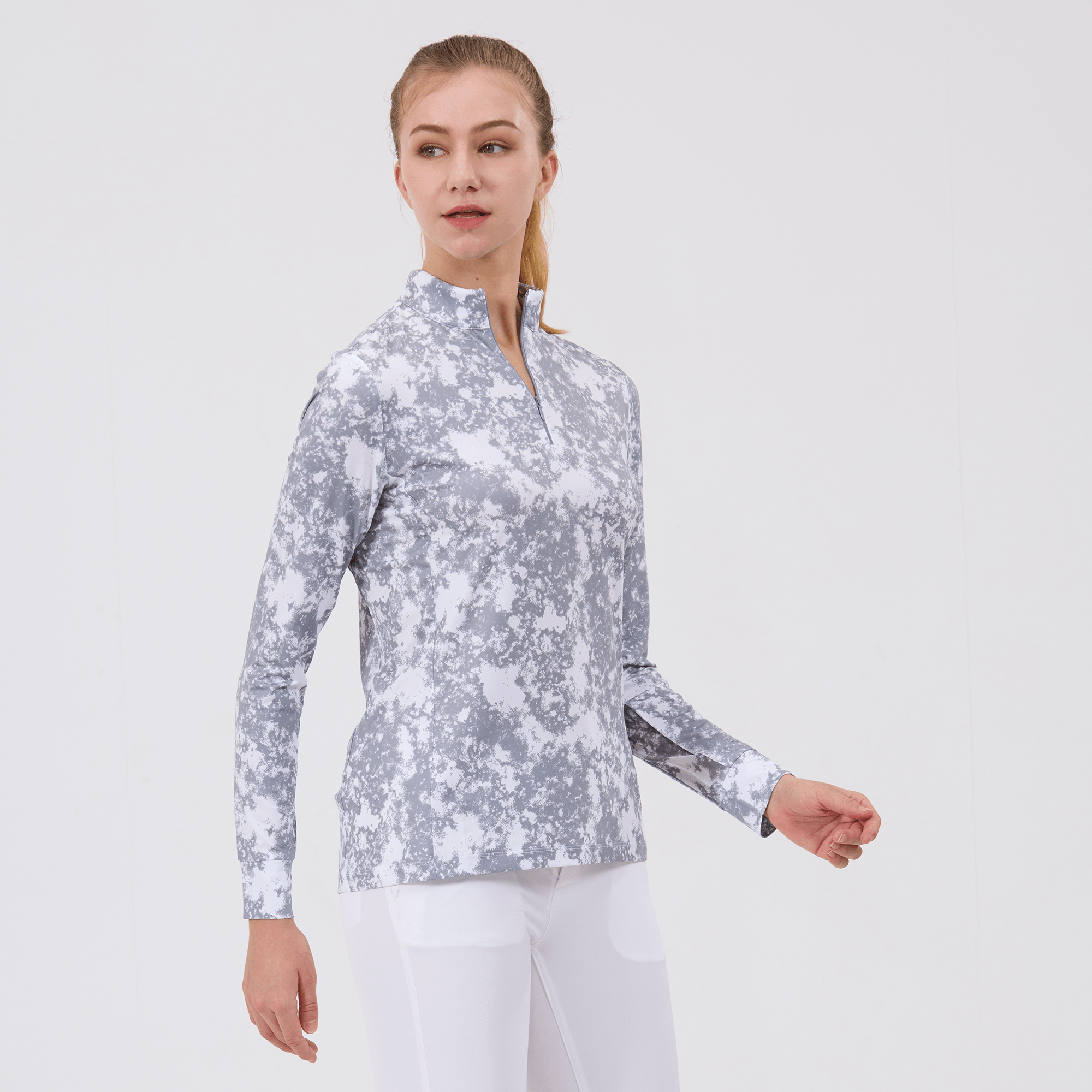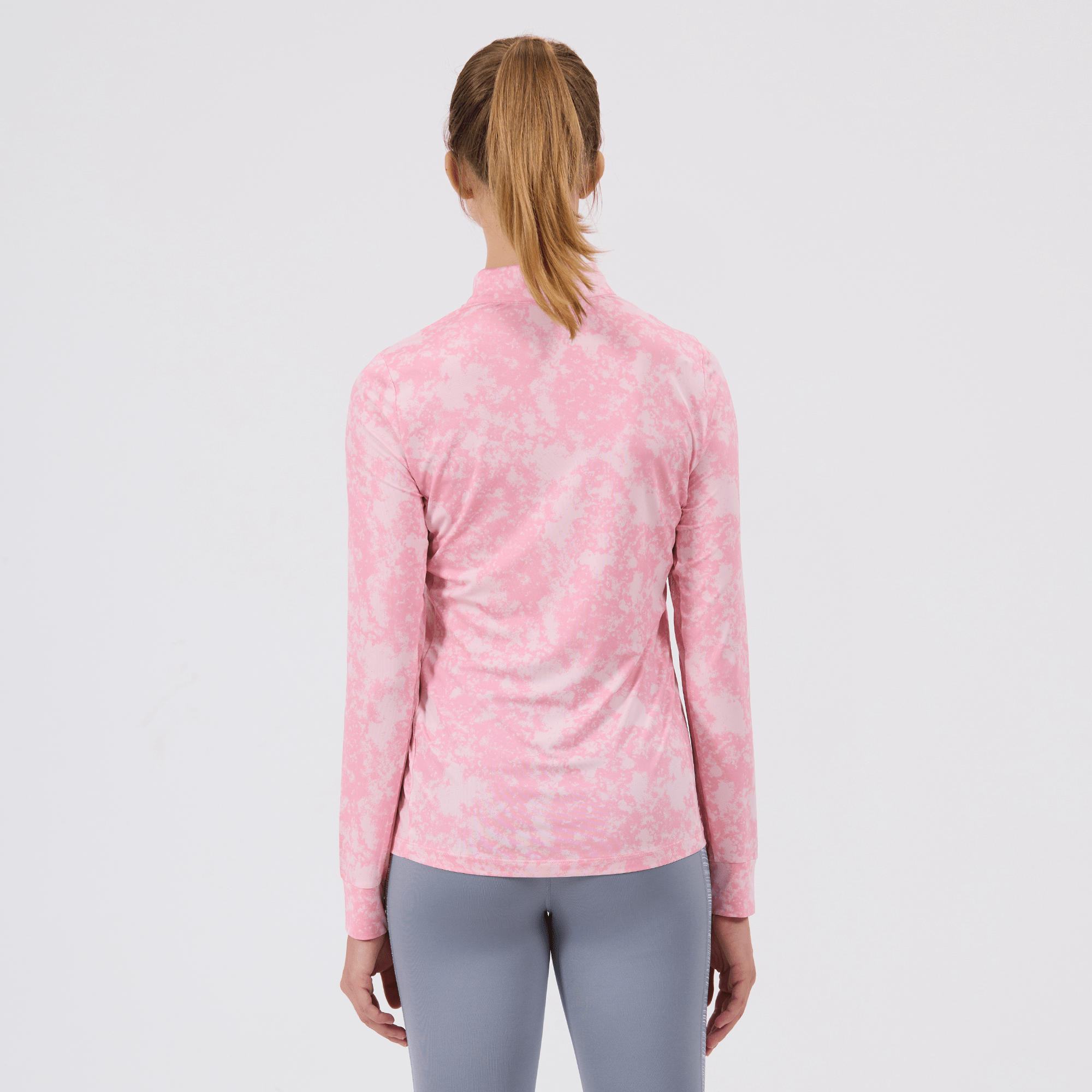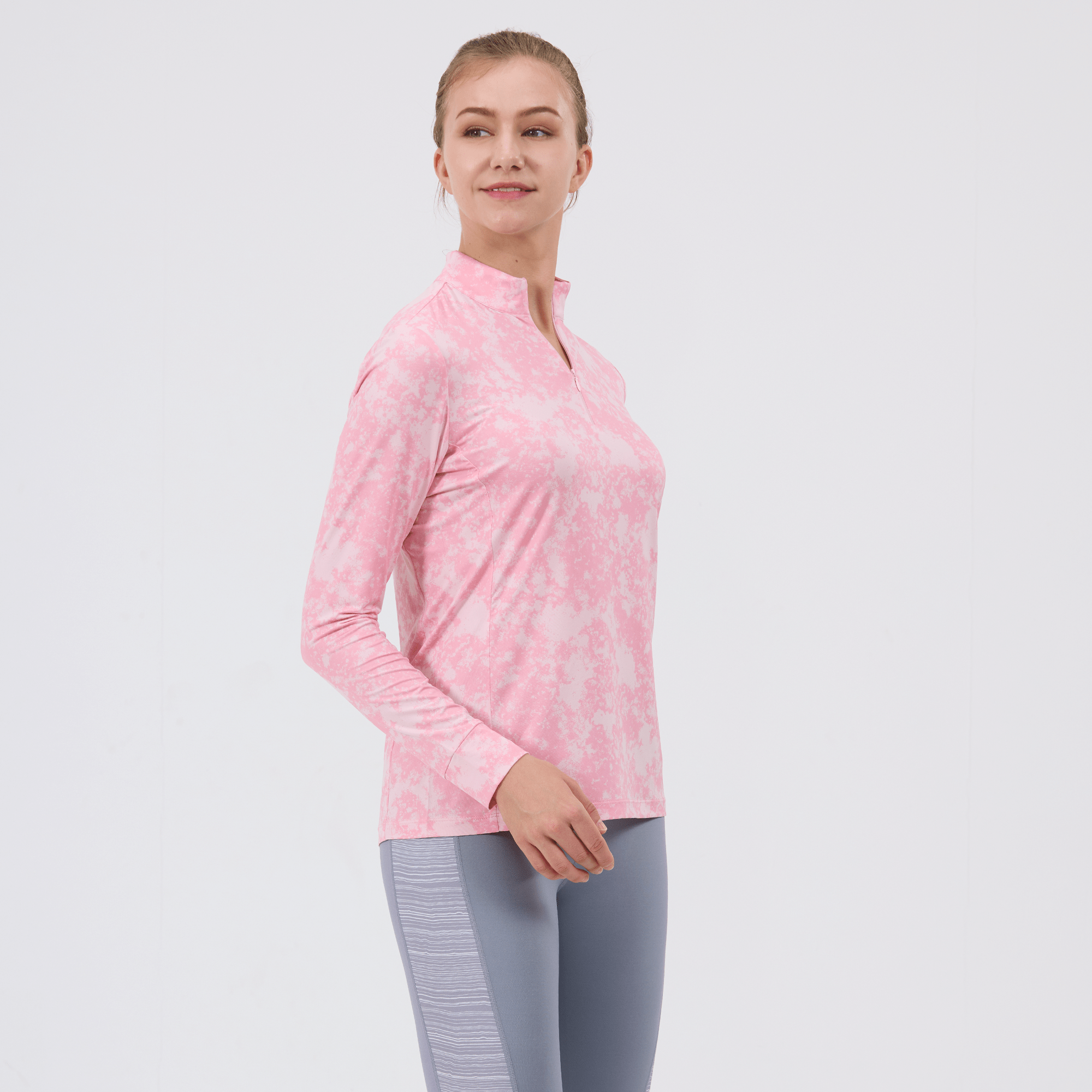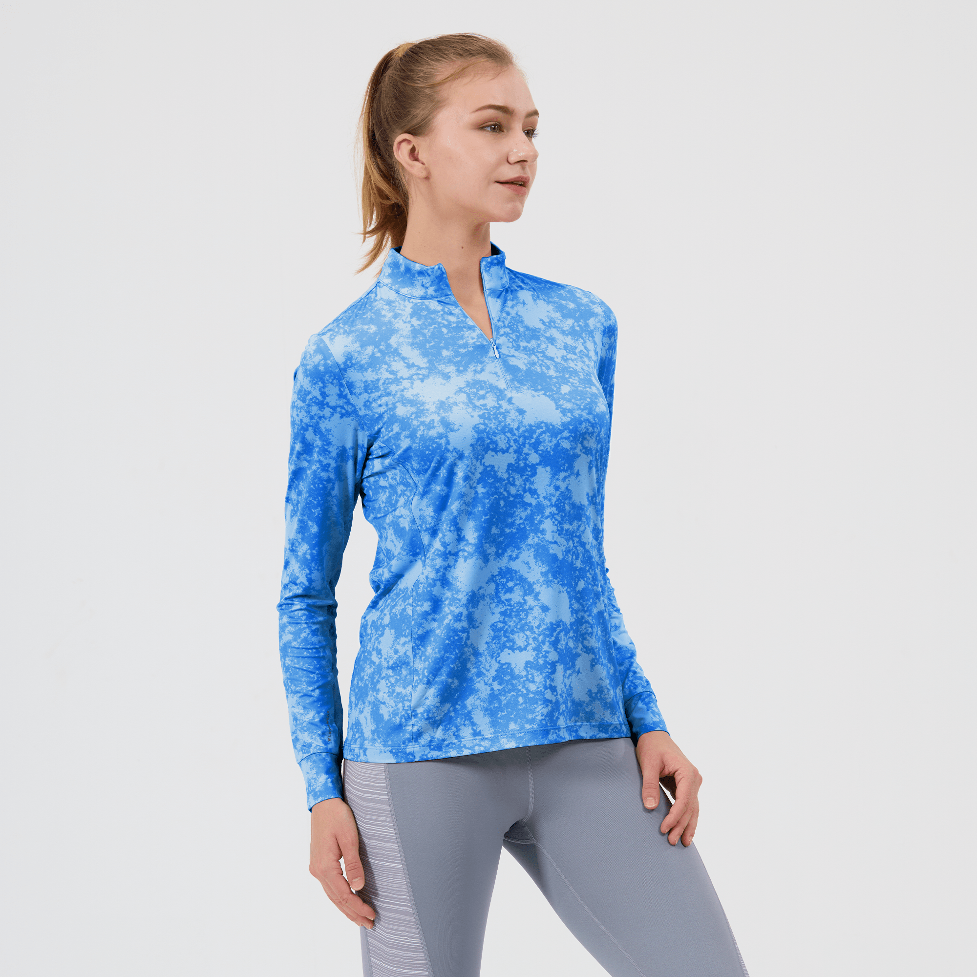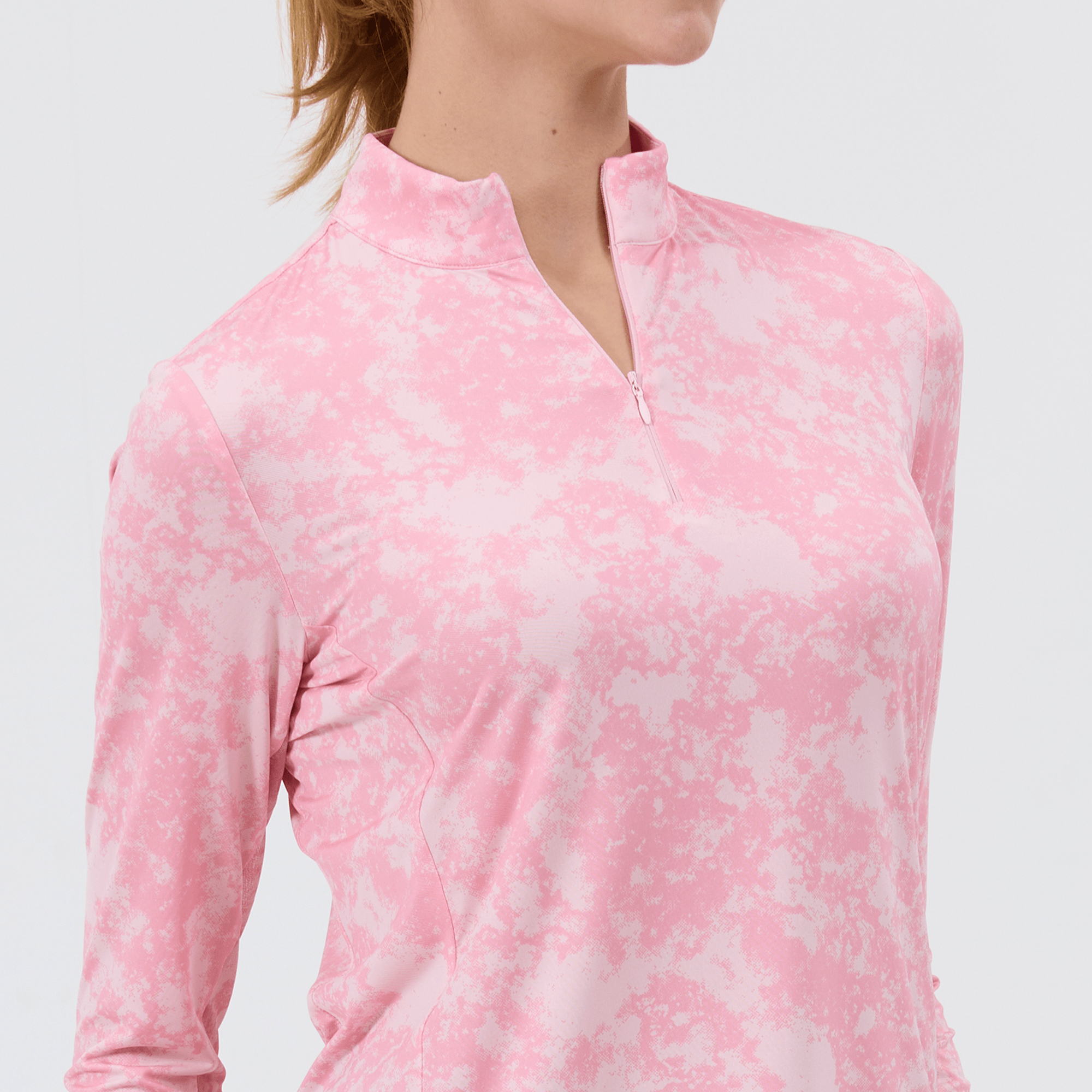The women's Whisper long sleeve is the perfect lightweight layer for active lifestyles. Made from a blend of 88% polyester and 12% spandex, this top offers UPF 50+ protection and superior moisture-wicking capabilities to keep you comfortable and dry. The stylish all-over print is complemented by contrast solid side panels and mesh underarm panels for added breathability. Its invisible quarter-zip with a stand-up collar allows for adjustable coverage, while the high-low hem detail adds a modern touch to its design, making it an essential addition to your athletic wardrobe.