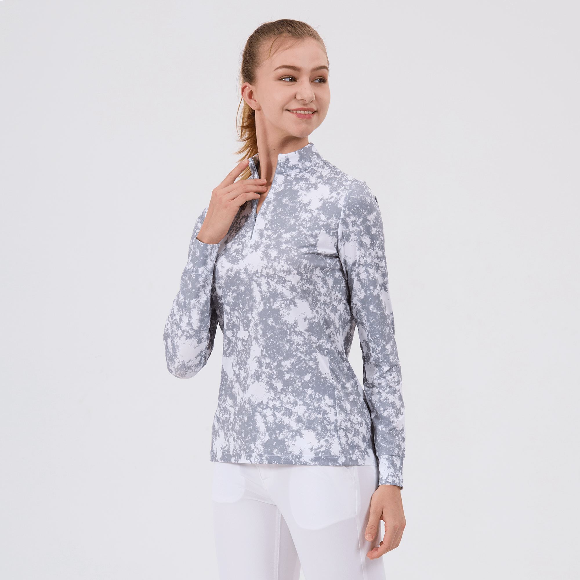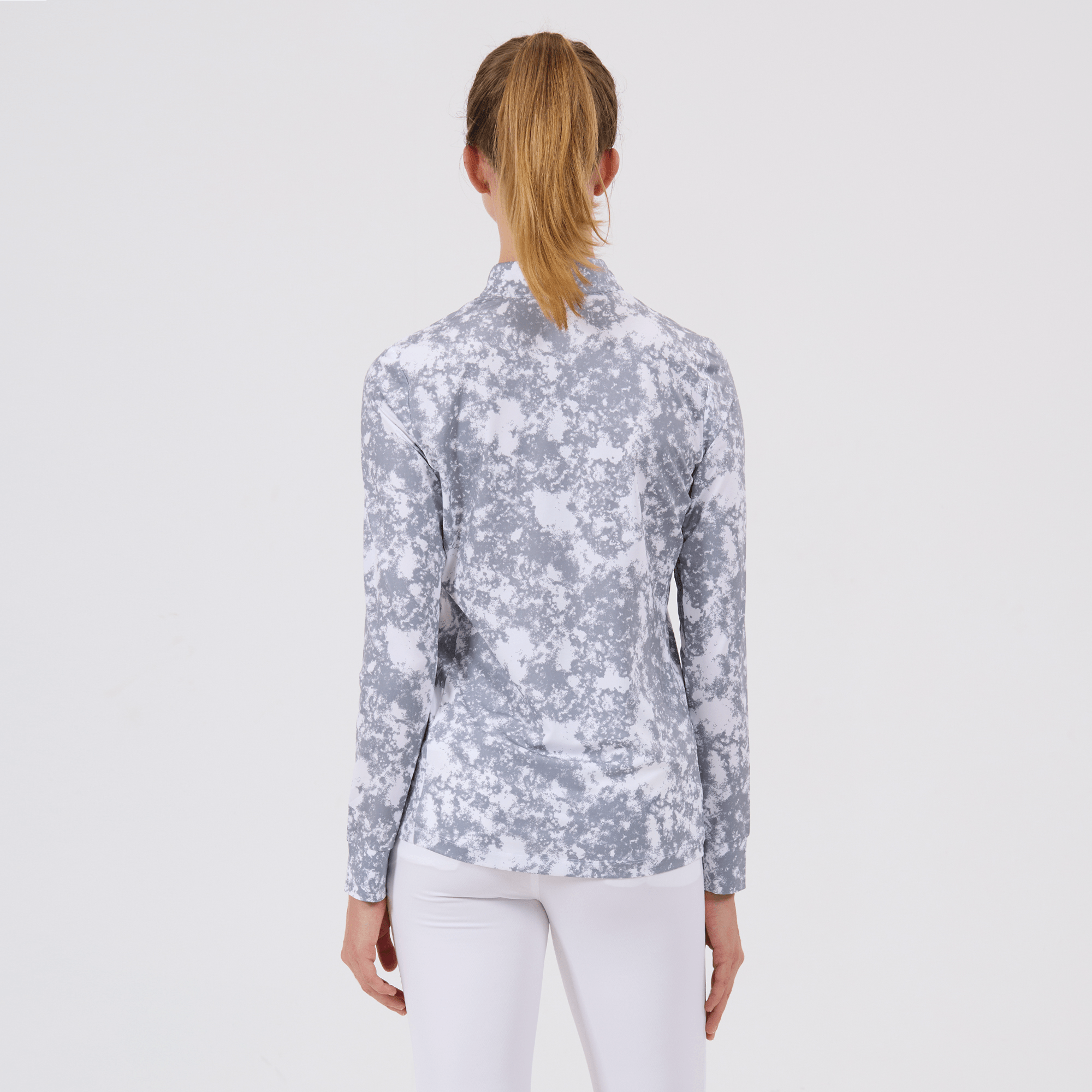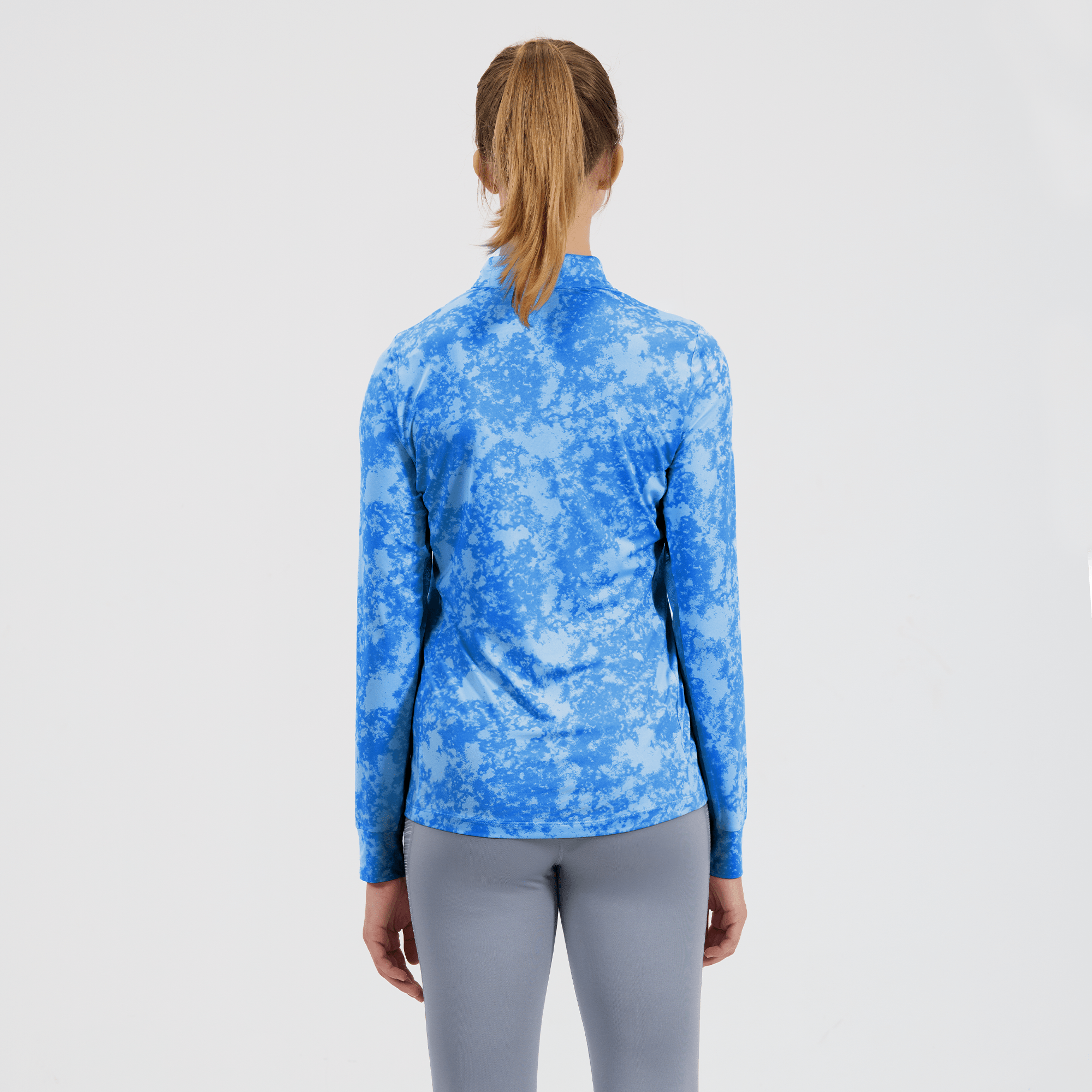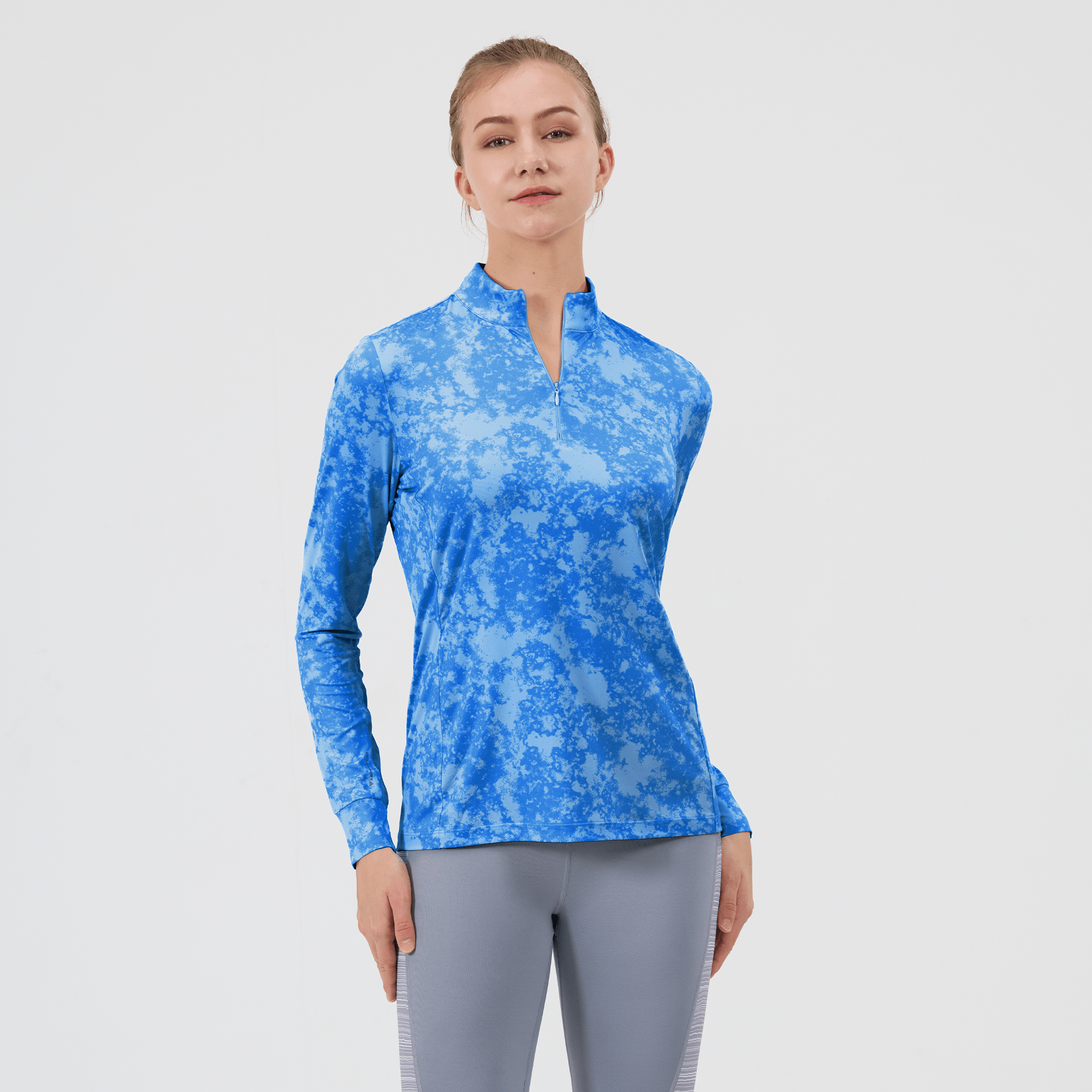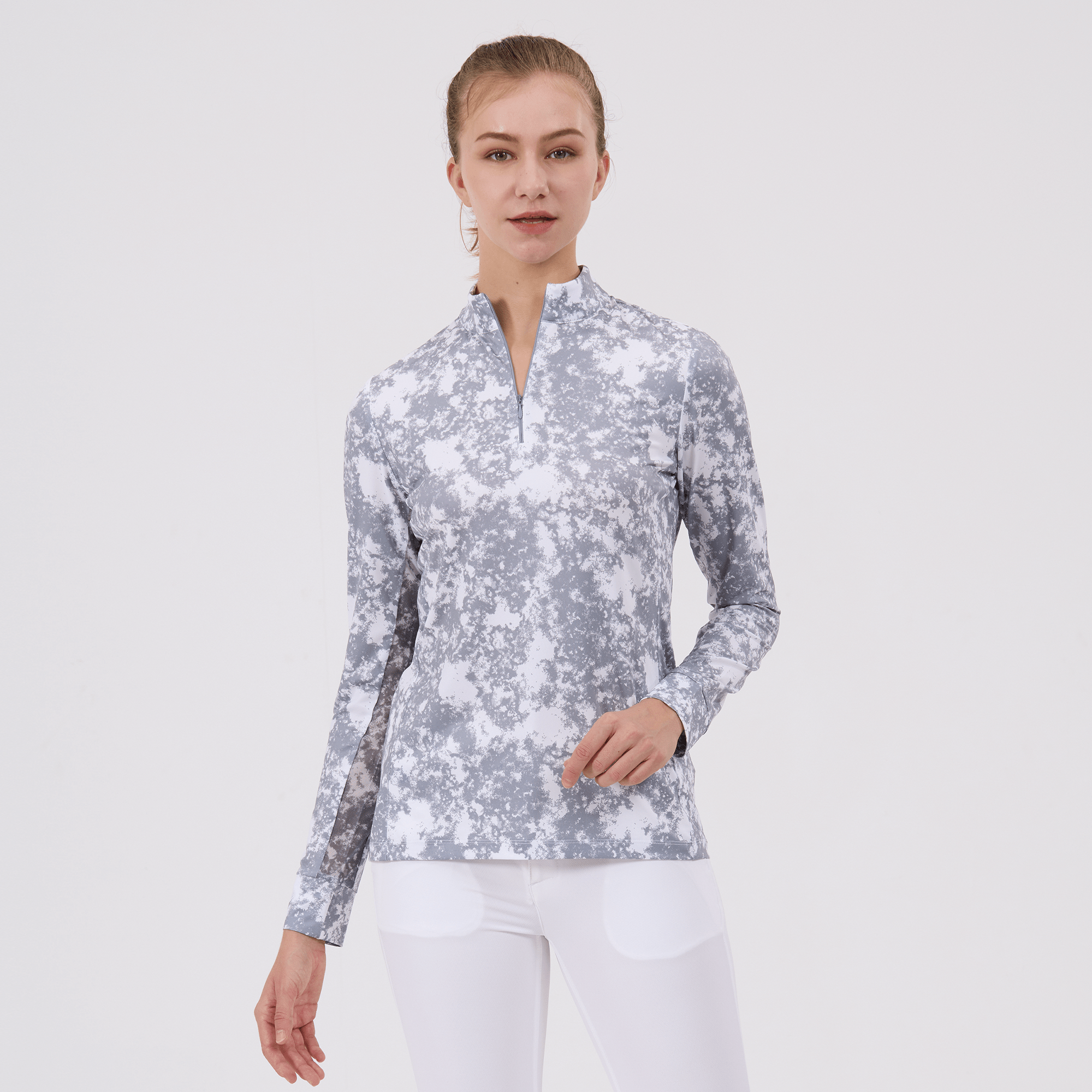 The women's Whisper long sleeve is the perfect lightweight layer for active lifestyles. Made from a blend of 88% polyester and 12% spandex, this top offers UPF 50+ protection and superior moisture-wicking capabilities to keep you comfortable and dry. The stylish all-over print is complemented by contrast solid side panels and mesh underarm panels for added breathability. Its invisible quarter-zip with a stand-up collar allows for adjustable coverage, while the high-low hem detail adds a modern touch to its design, making it an essential addition to your athletic wardrobe.
