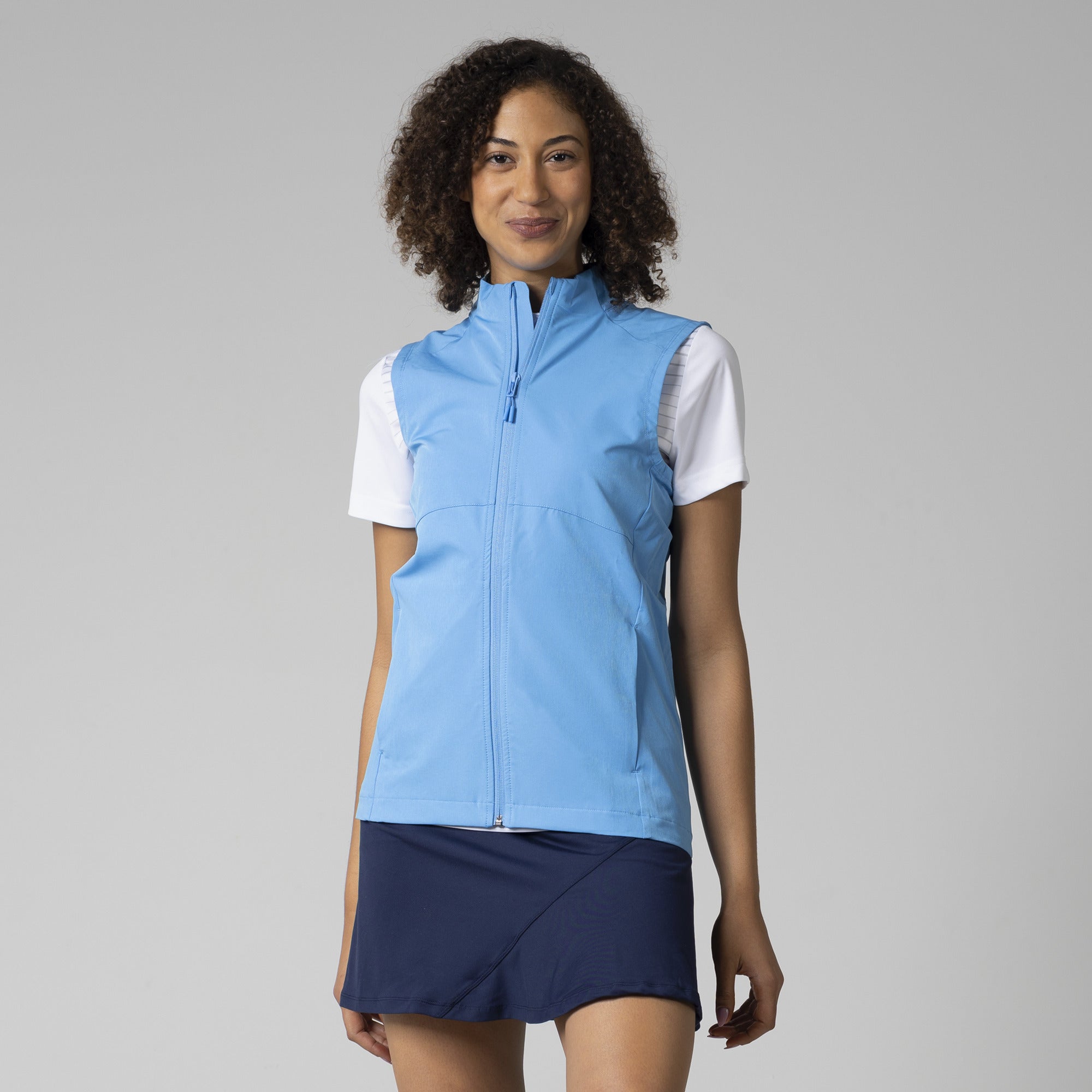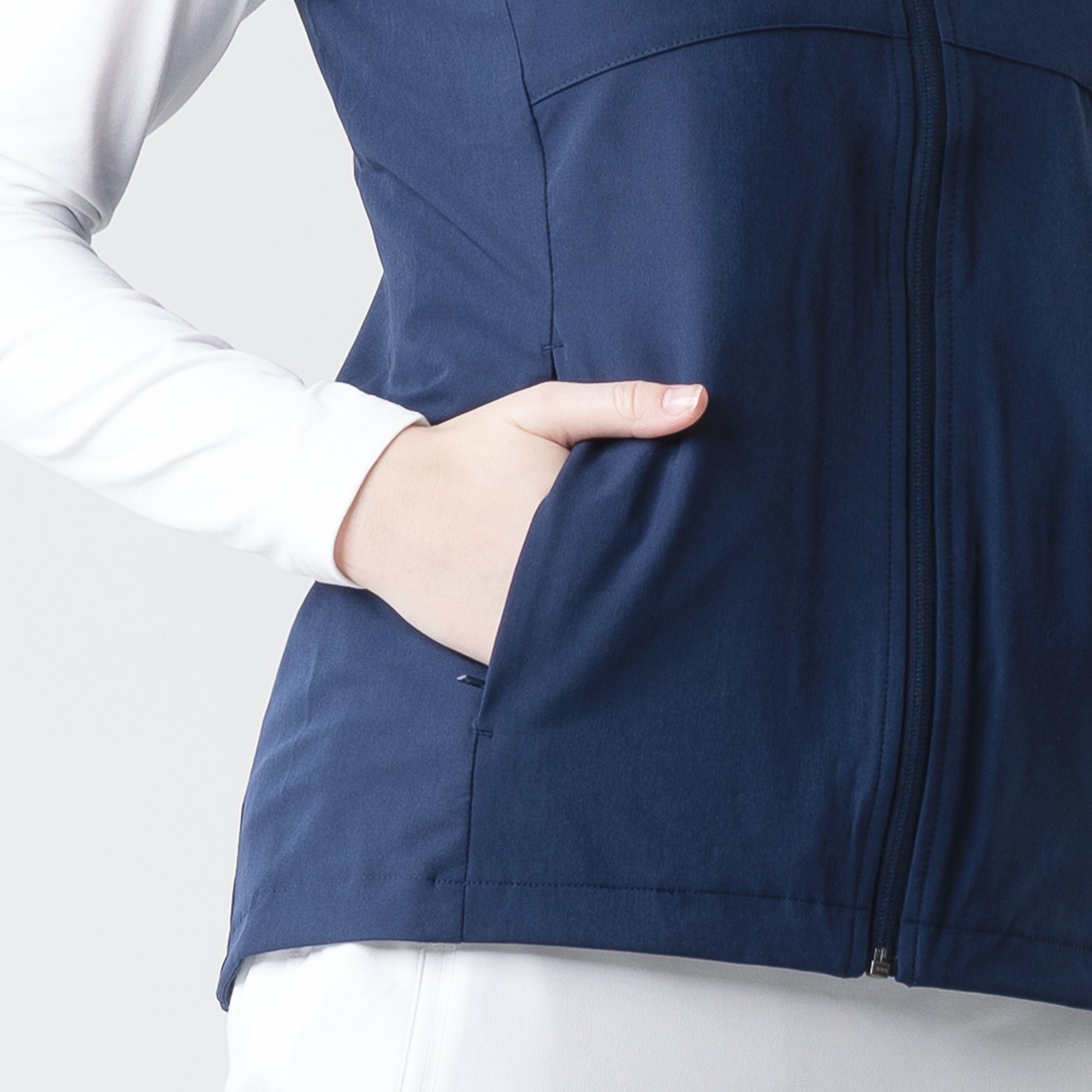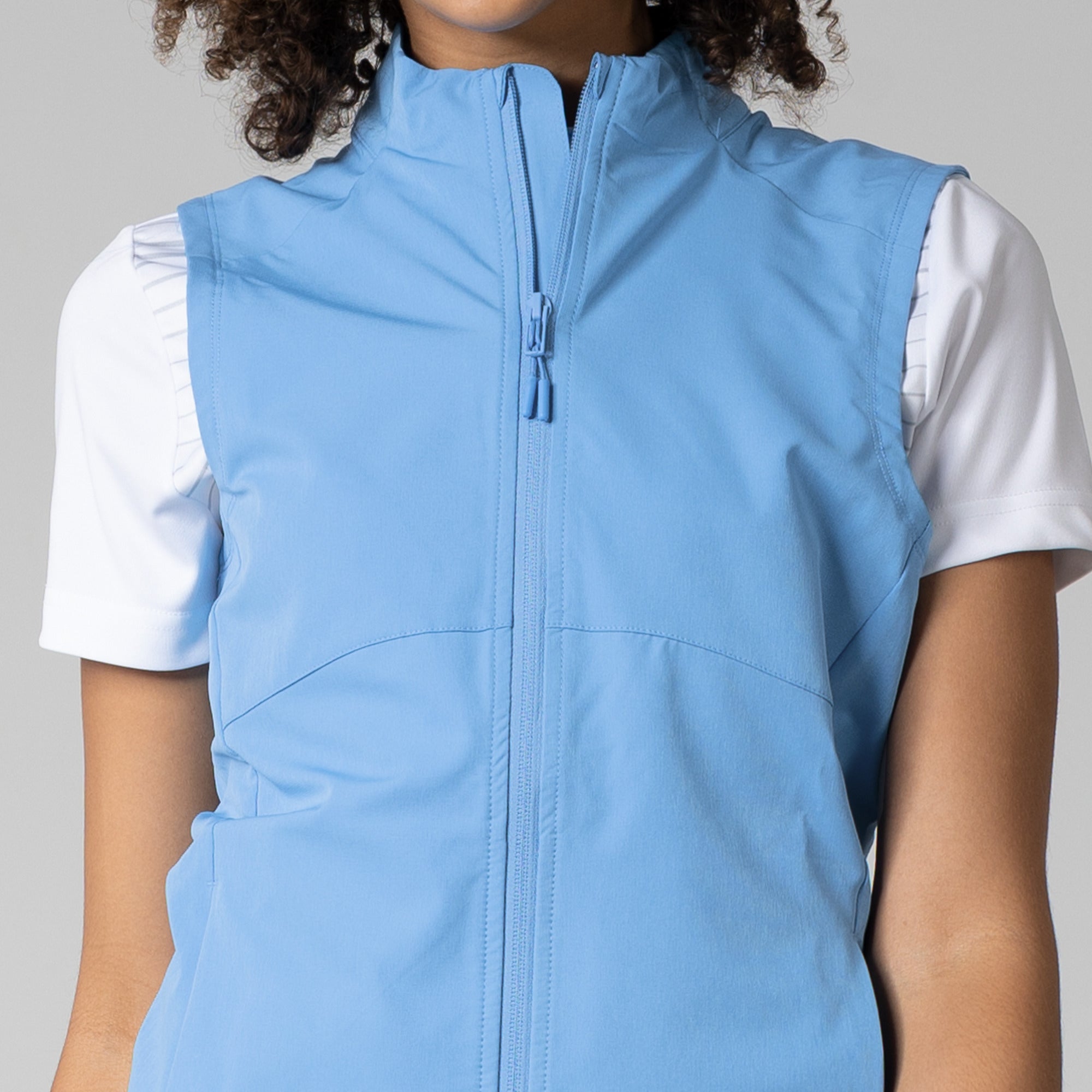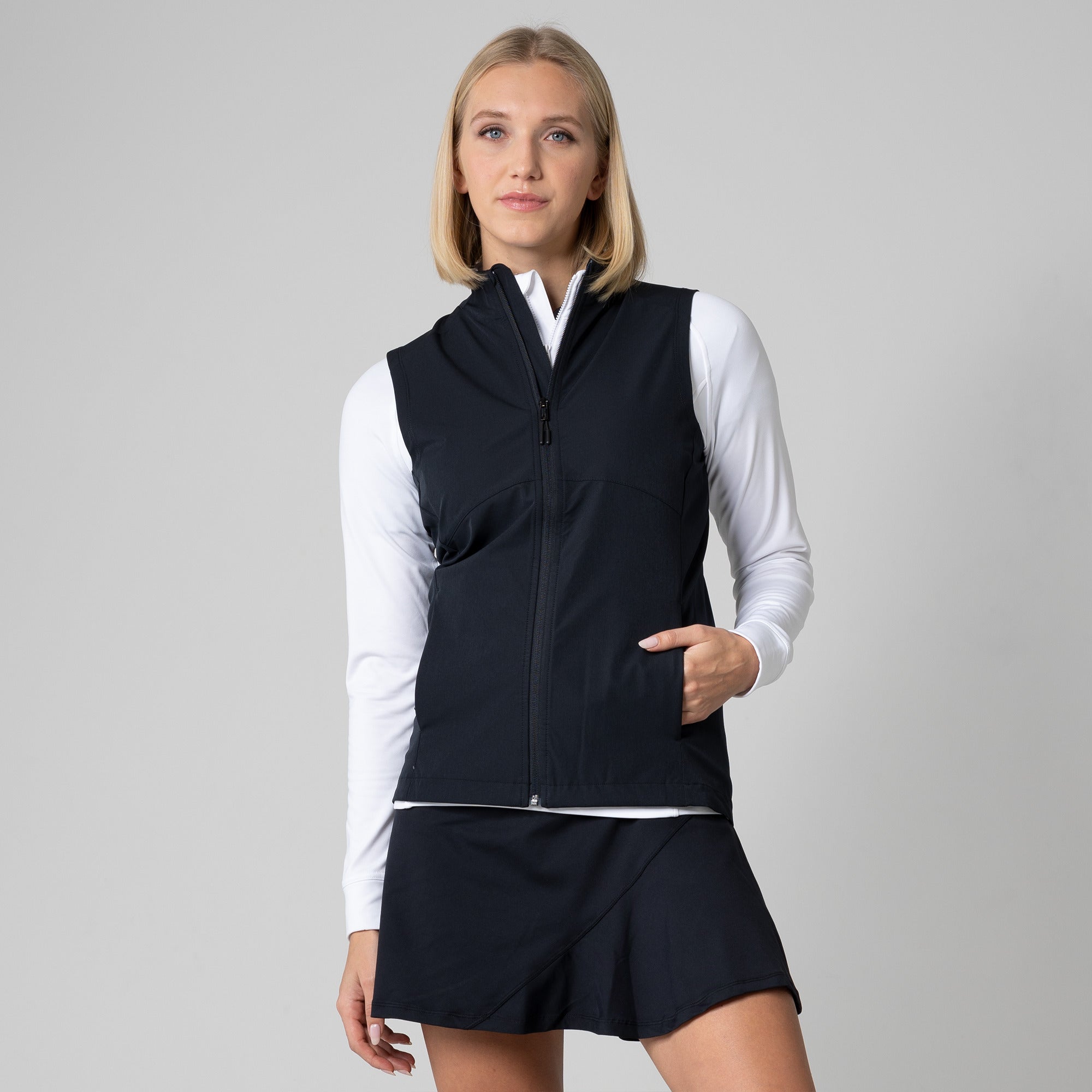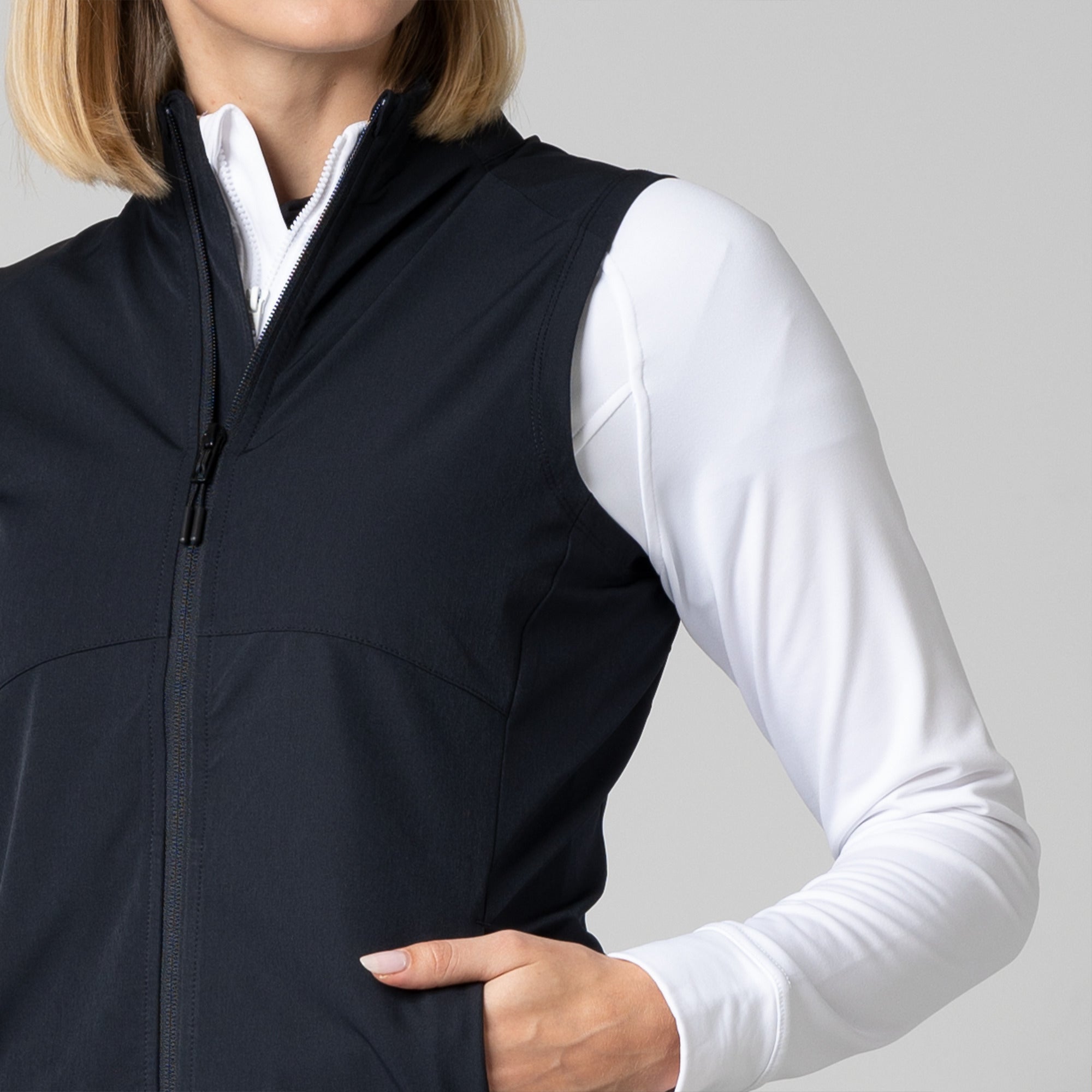 Enhance your golf attire with the Women's Zara vest, designed for those who value functionality and style on the course. This lightweight vest is crafted from a blend of 90% polyester and 10% spandex, offering flexibility and comfort without the bulk, allowing for unrestricted swings. It features water-repellent properties to keep you dry during sudden showers and includes zippered pockets for securely holding essentials like scorecards and tees. The drop tail design provides extra coverage while maintaining a sleek, flattering fit. Perfect for layering over your favorite golf polo, the Zara vest is an essential for any golfer looking to stay protected and stylish on the course.