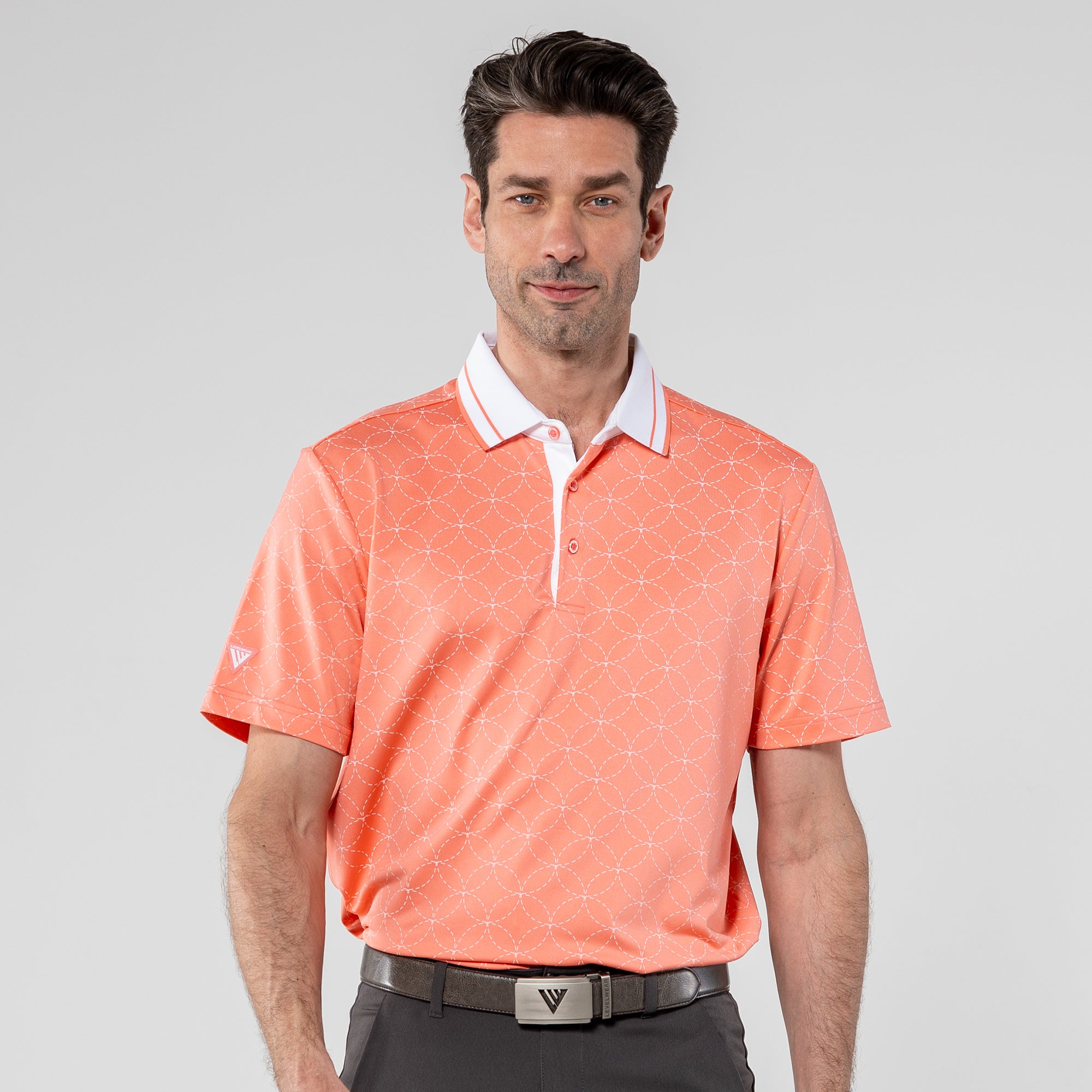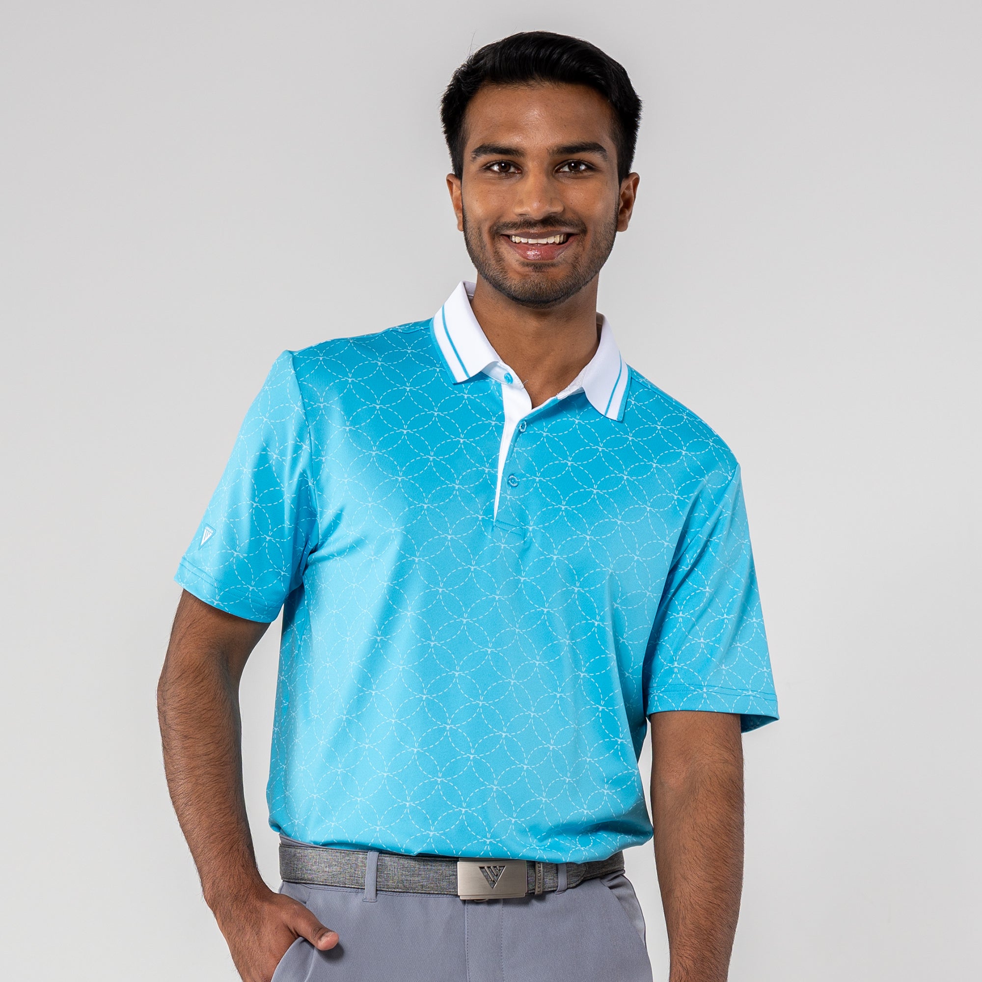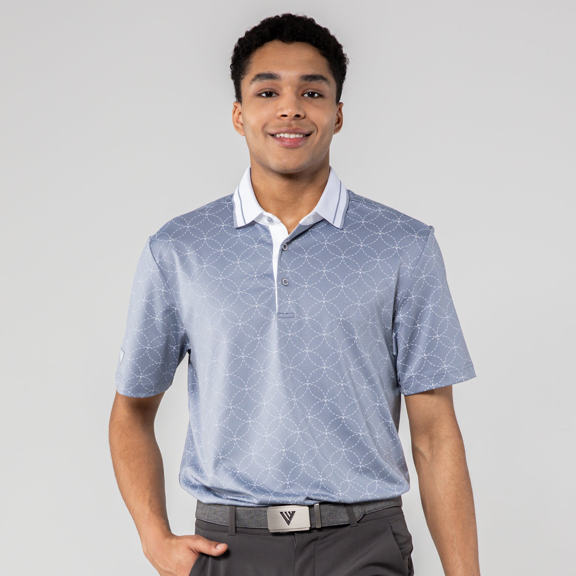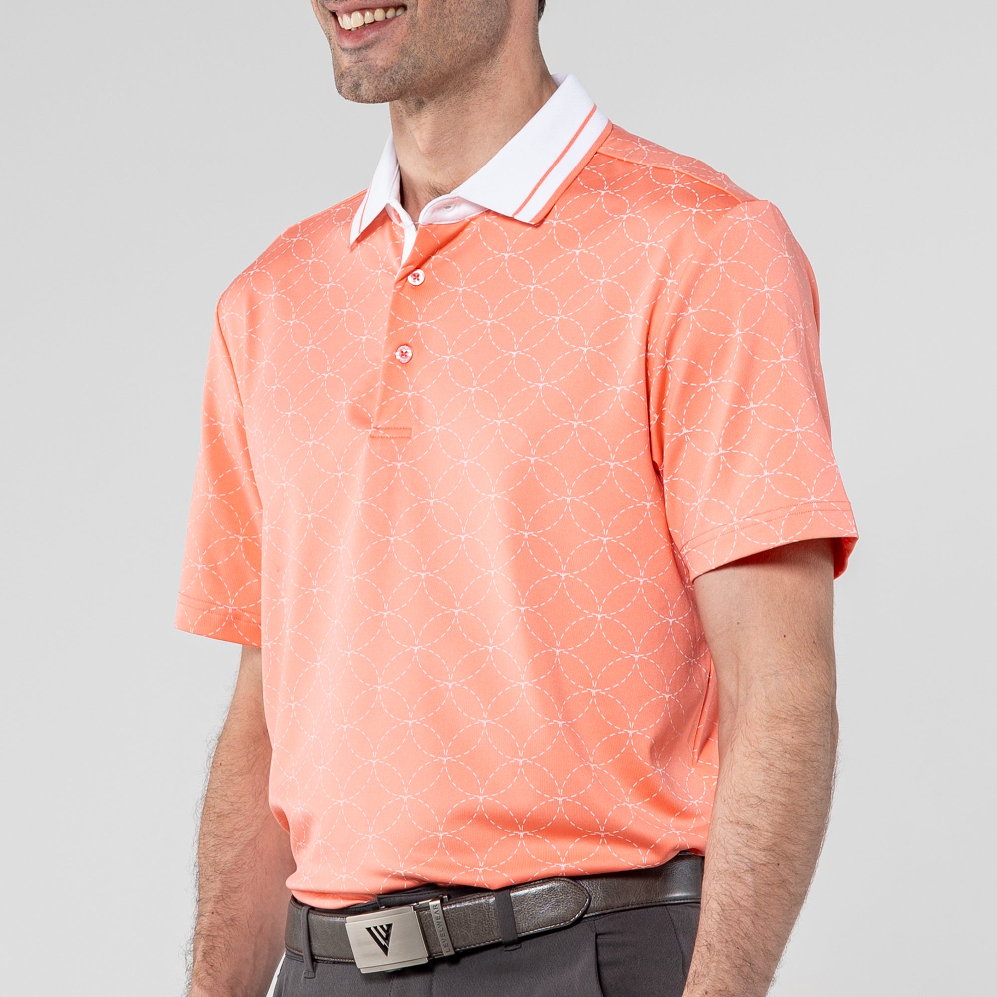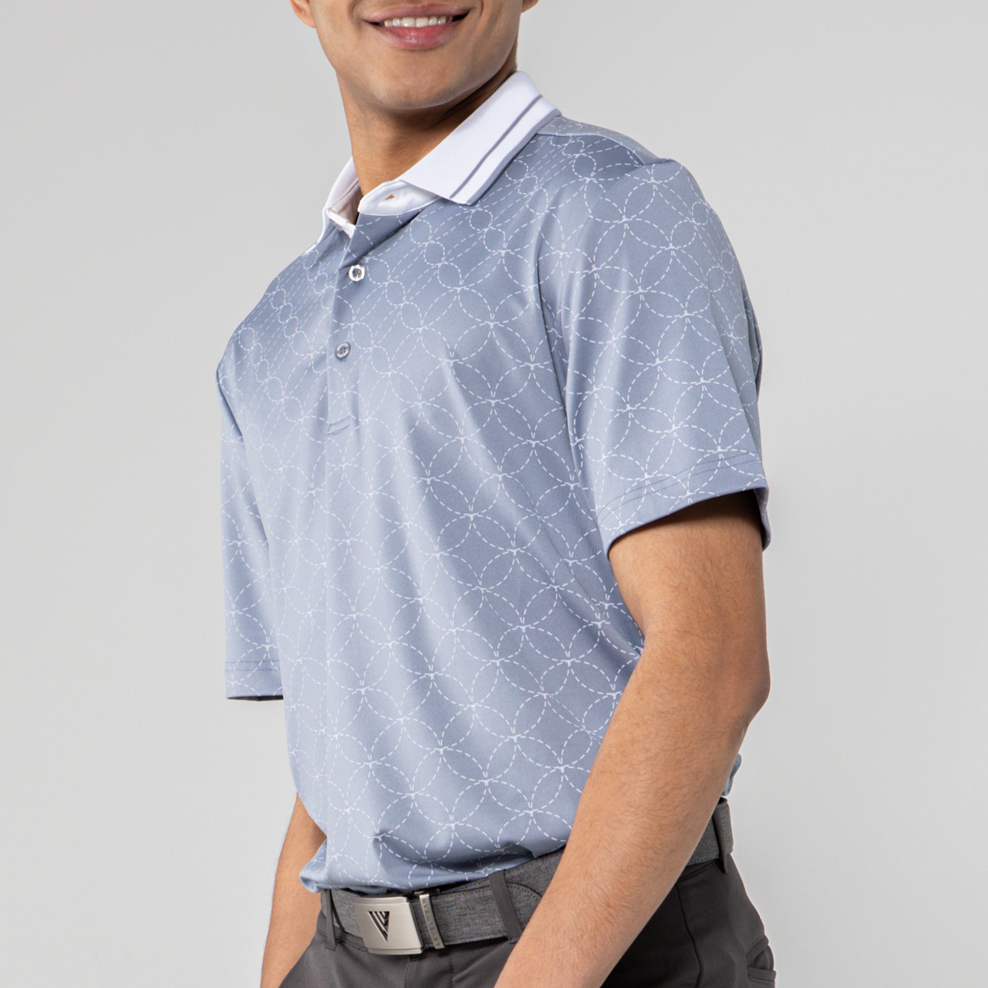 Elevate your style with the Cascade Men's Polo, featuring a funky circle pattern for a touch of unique flair. Crafted from 92% Polyester and 8% Spandex, it offers moisture-wicking and anti-bacterial properties for all-day freshness. With a flat knit collar, high-low hem detail, and contrast color collar and placket, it's the perfect blend of style and comfort.