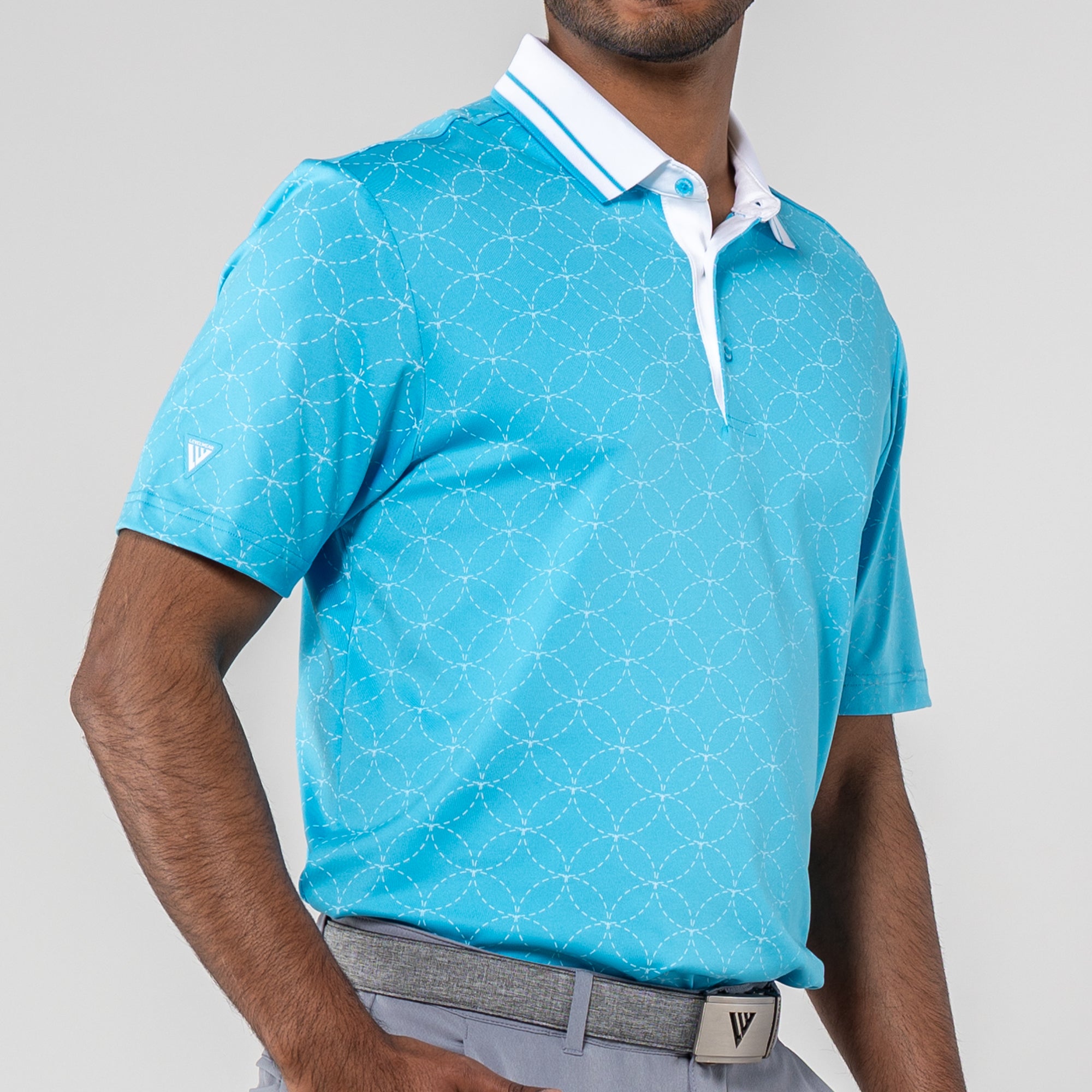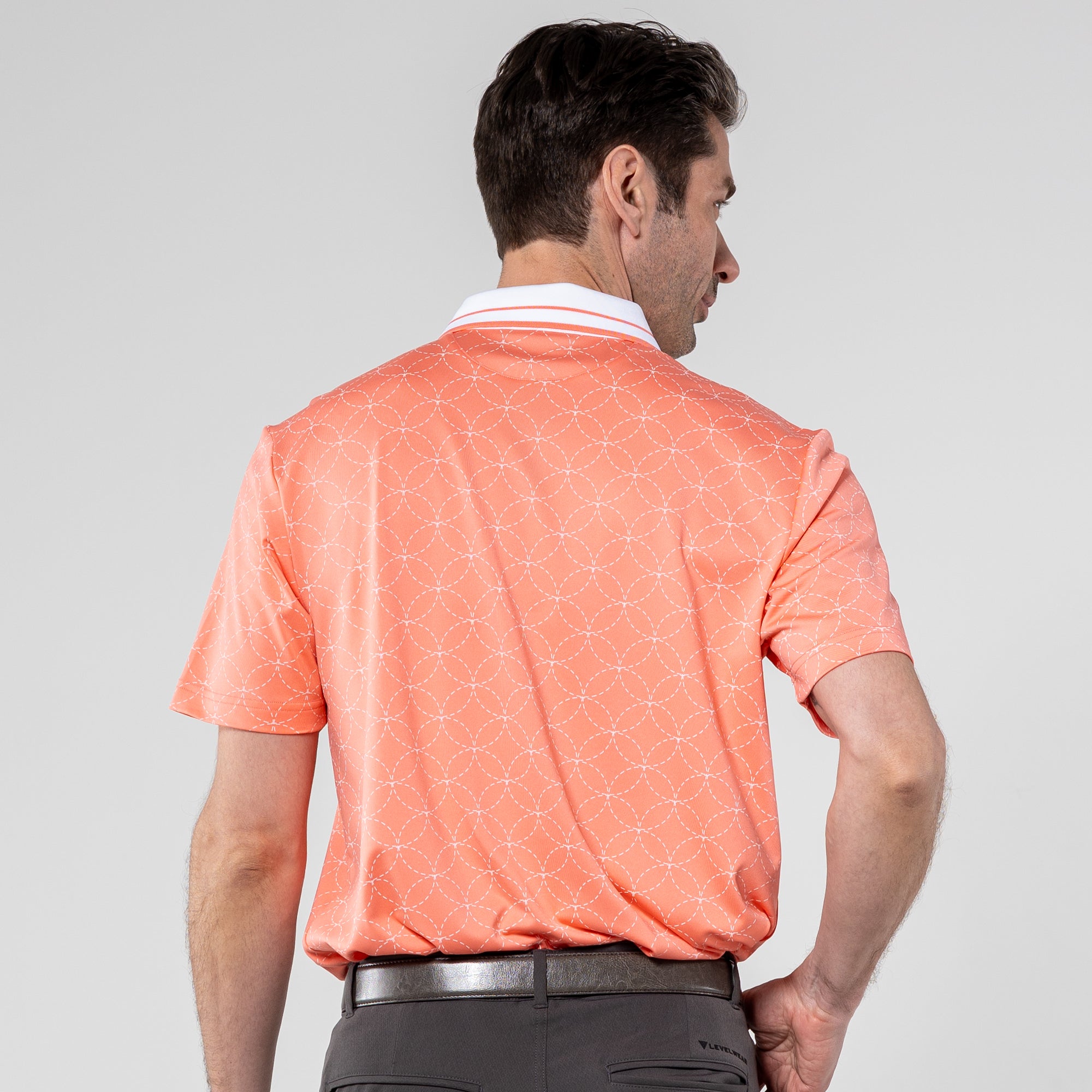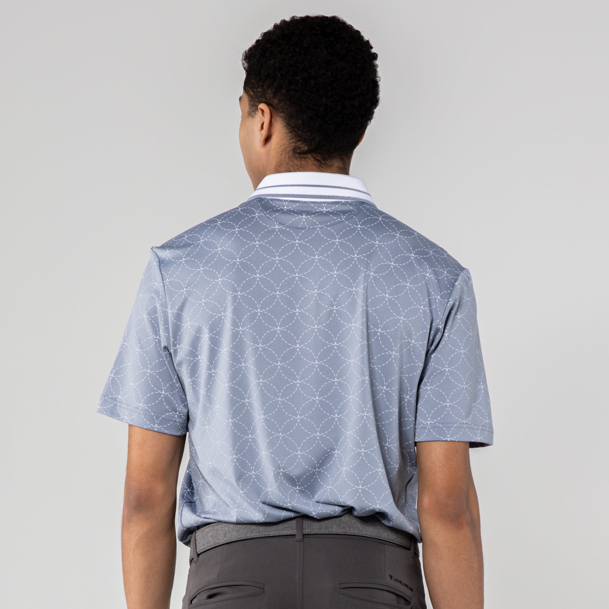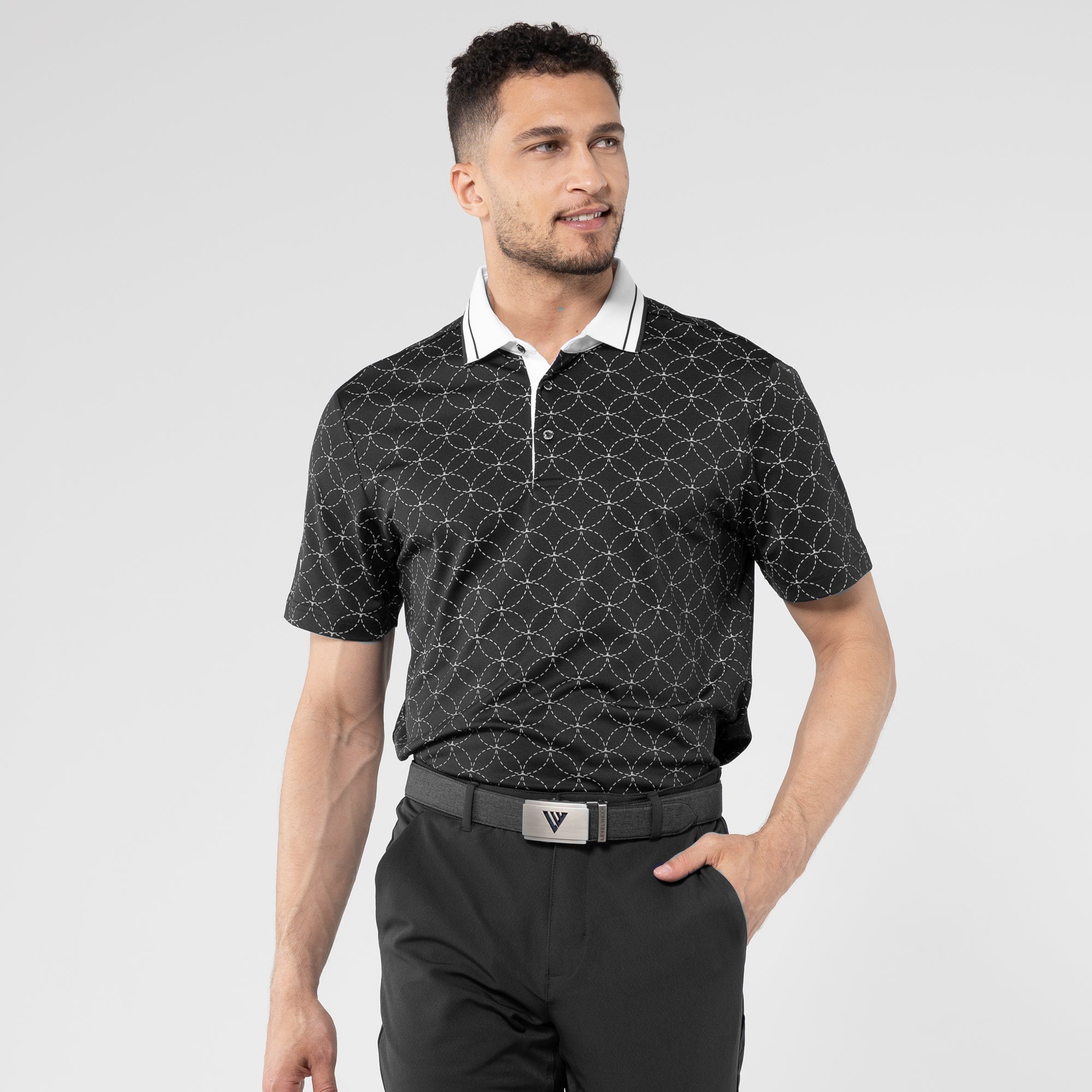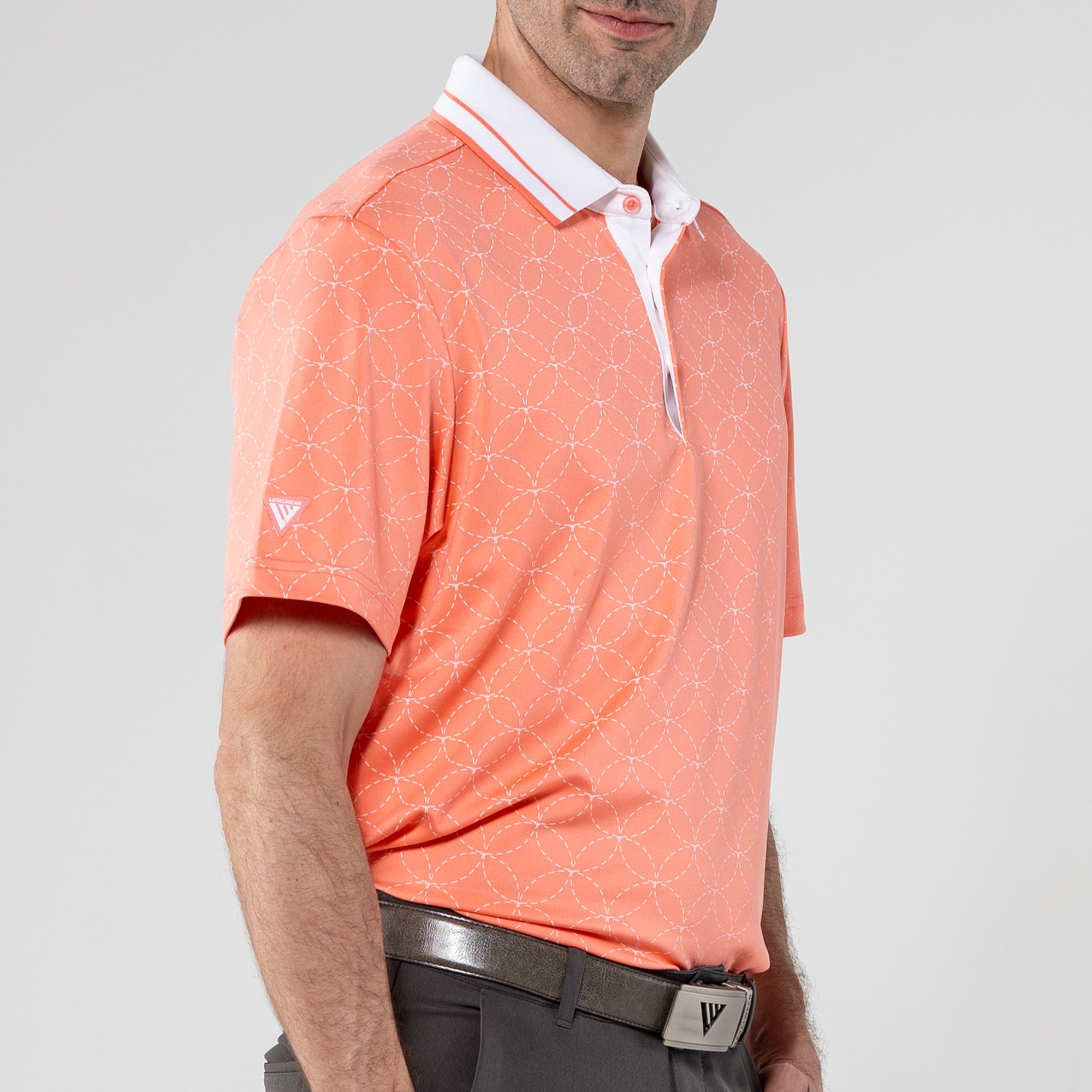 Elevate your style with the Cascade Men's Polo, featuring a funky circle pattern for a touch of unique flair. Crafted from 92% Polyester and 8% Spandex, it offers moisture-wicking and anti-bacterial properties for all-day freshness. With a flat knit collar, high-low hem detail, and contrast color collar and placket, it's the perfect blend of style and comfort.