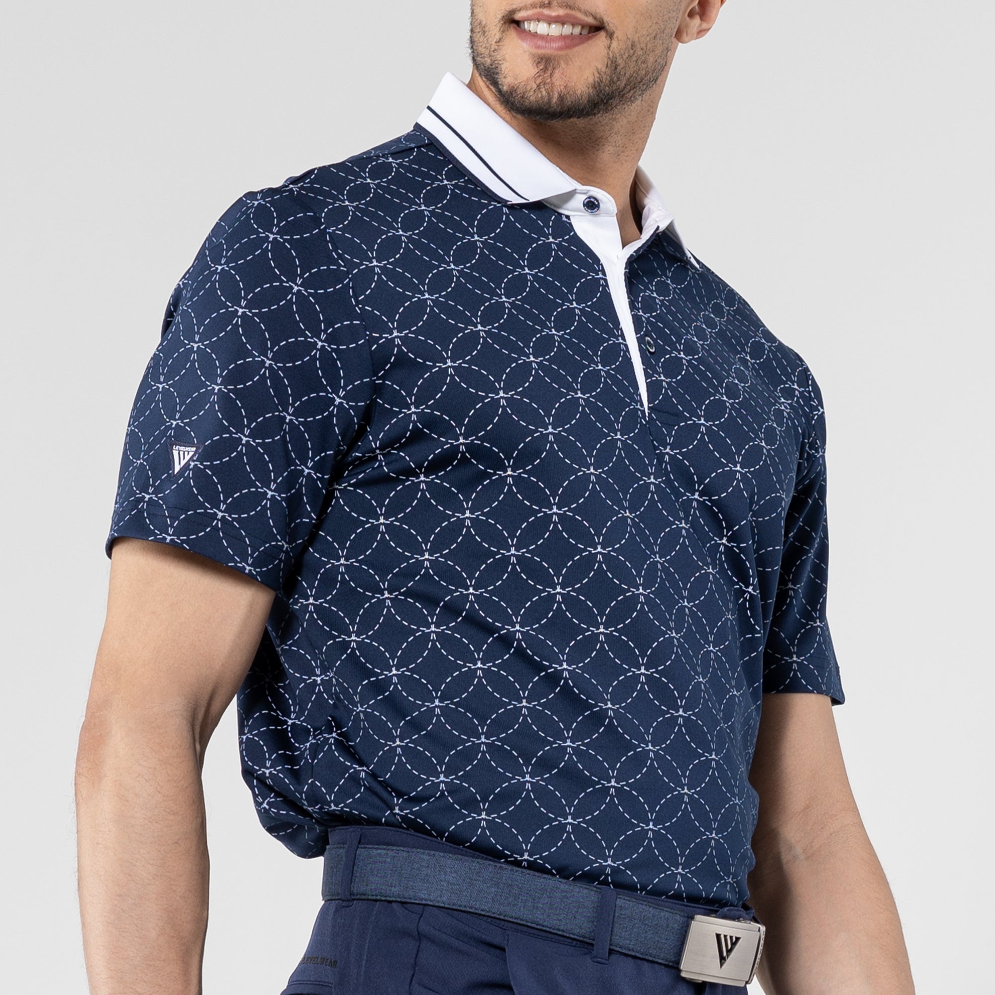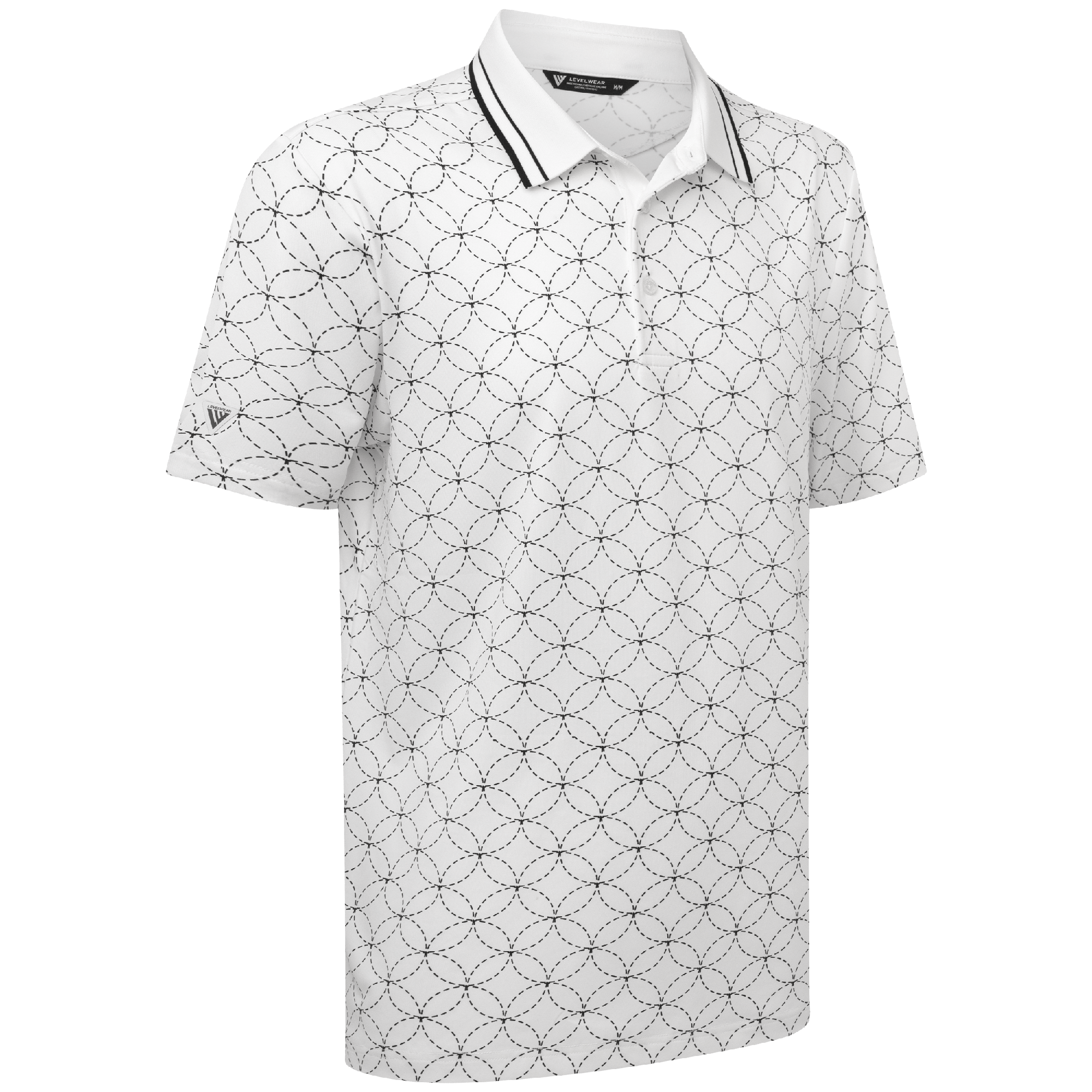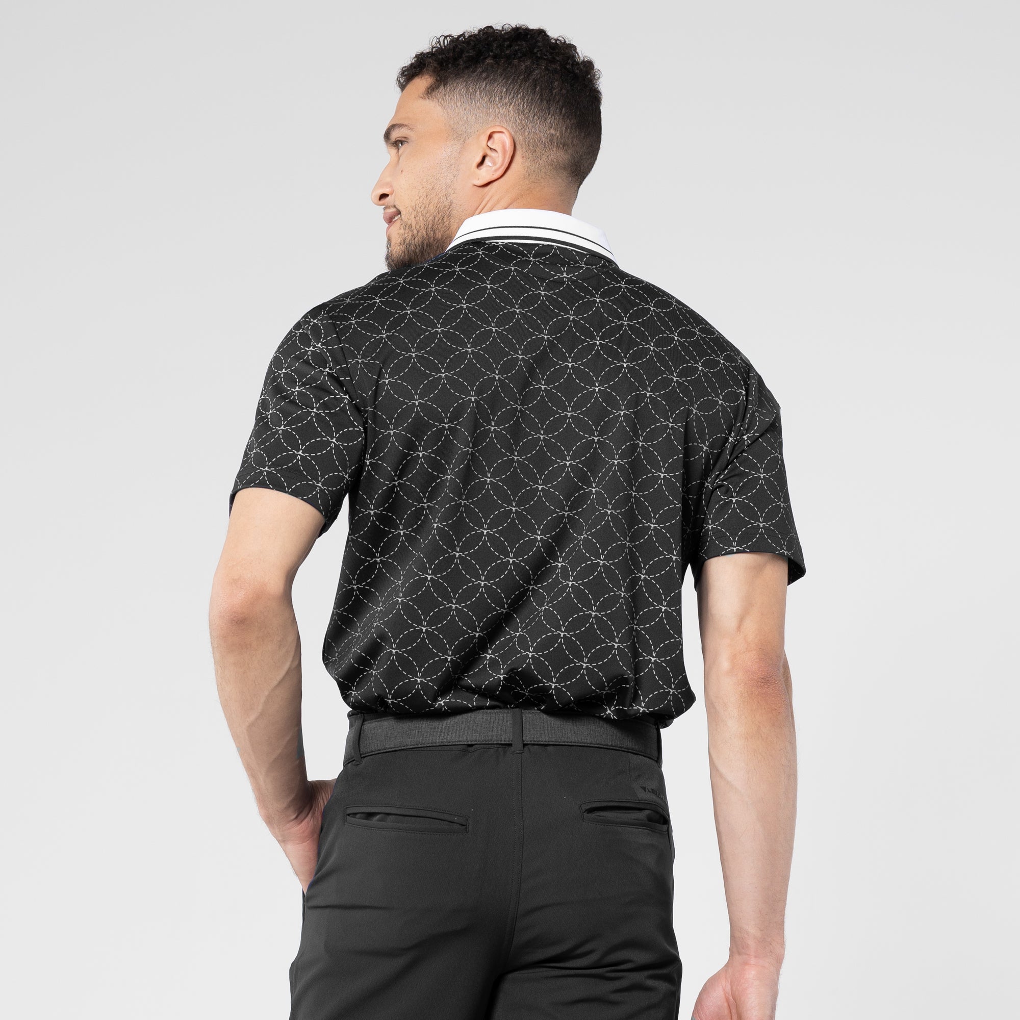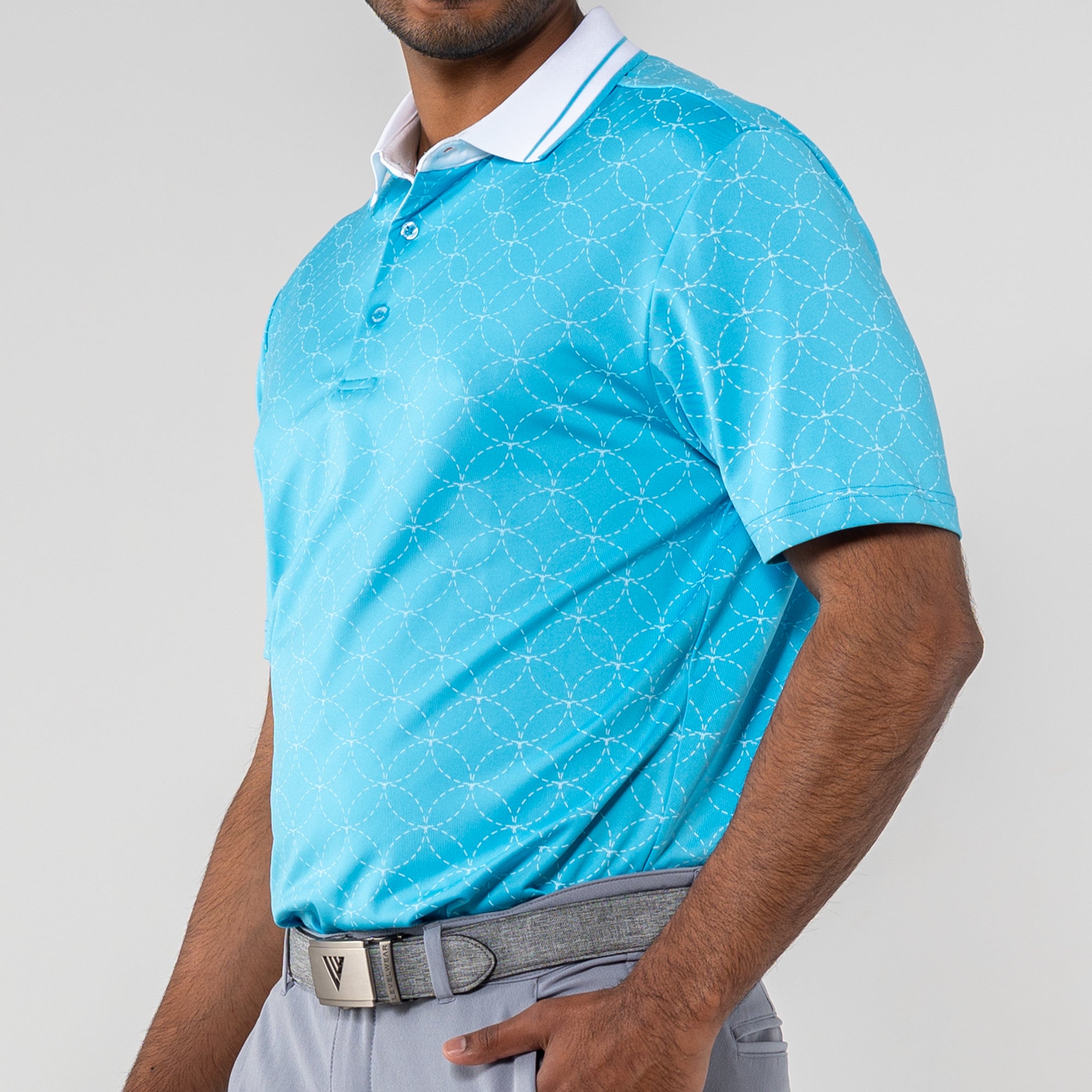 Elevate your style with the Cascade Men's Polo, featuring a funky circle pattern for a touch of unique flair. Crafted from 92% Polyester and 8% Spandex, it offers moisture-wicking and anti-bacterial properties for all-day freshness. With a flat knit collar, high-low hem detail, and contrast color collar and placket, it's the perfect blend of style and comfort.