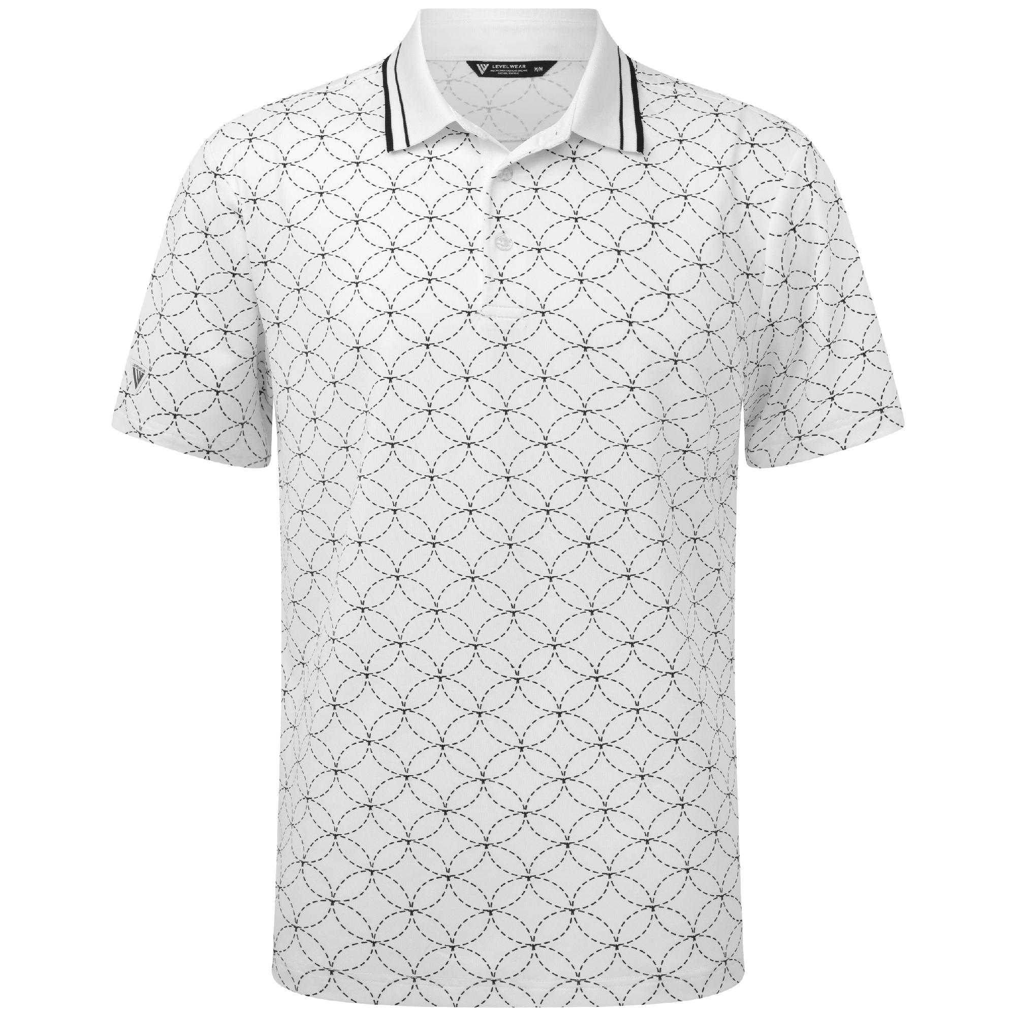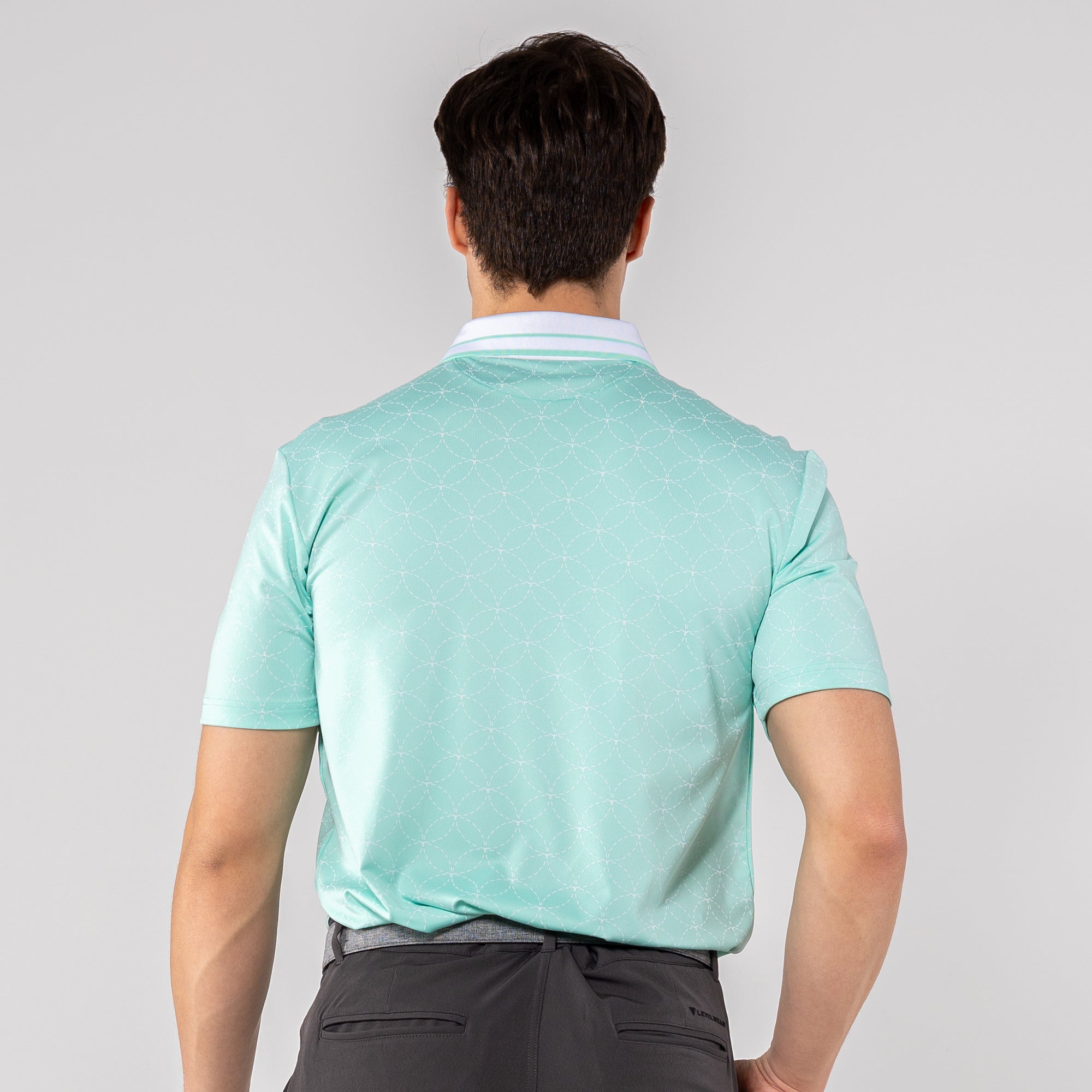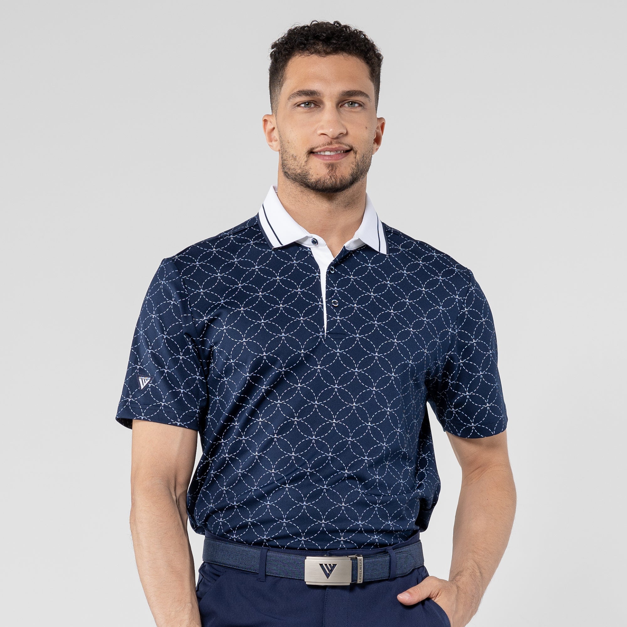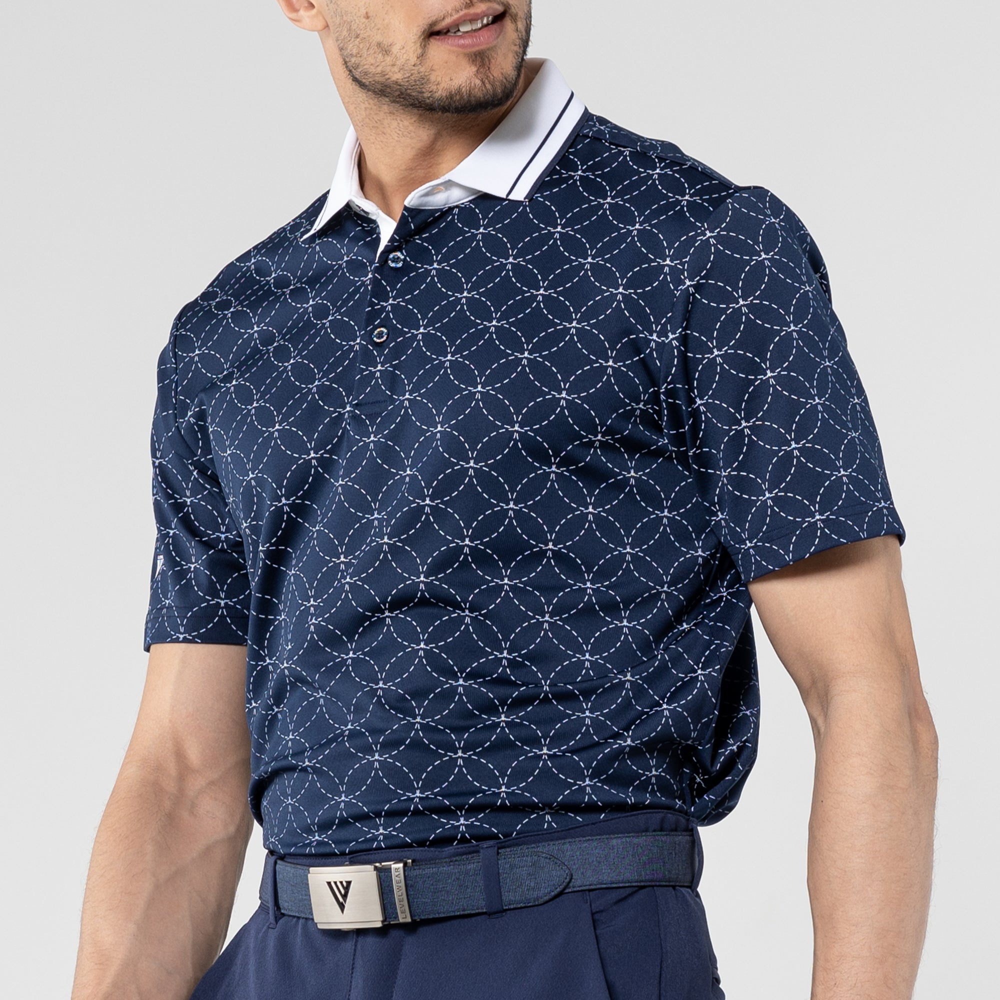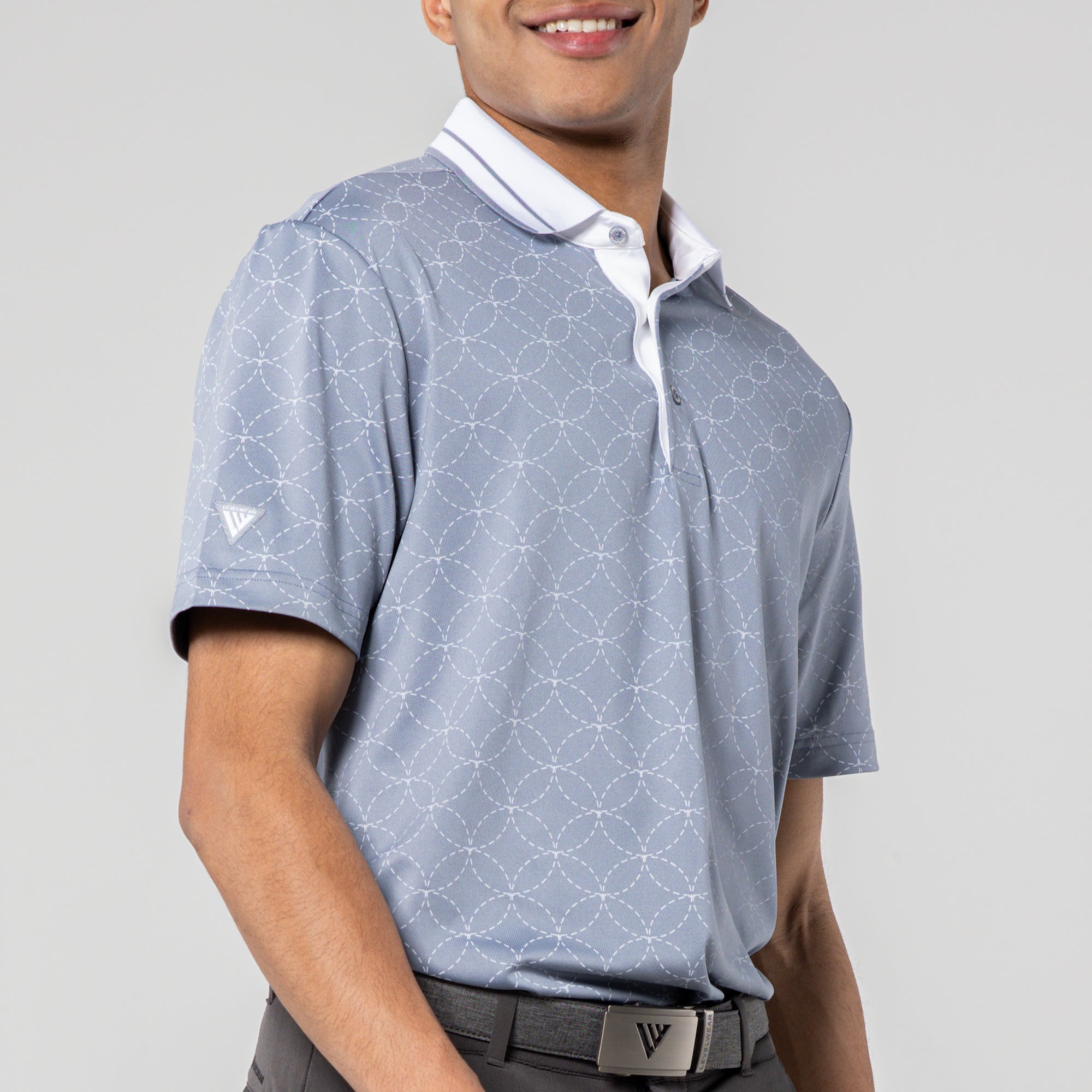Elevate your style with the Cascade Men's Polo, featuring a funky circle pattern for a touch of unique flair. Crafted from 92% Polyester and 8% Spandex, it offers moisture-wicking and anti-bacterial properties for all-day freshness. With a flat knit collar, high-low hem detail, and contrast color collar and placket, it's the perfect blend of style and comfort.