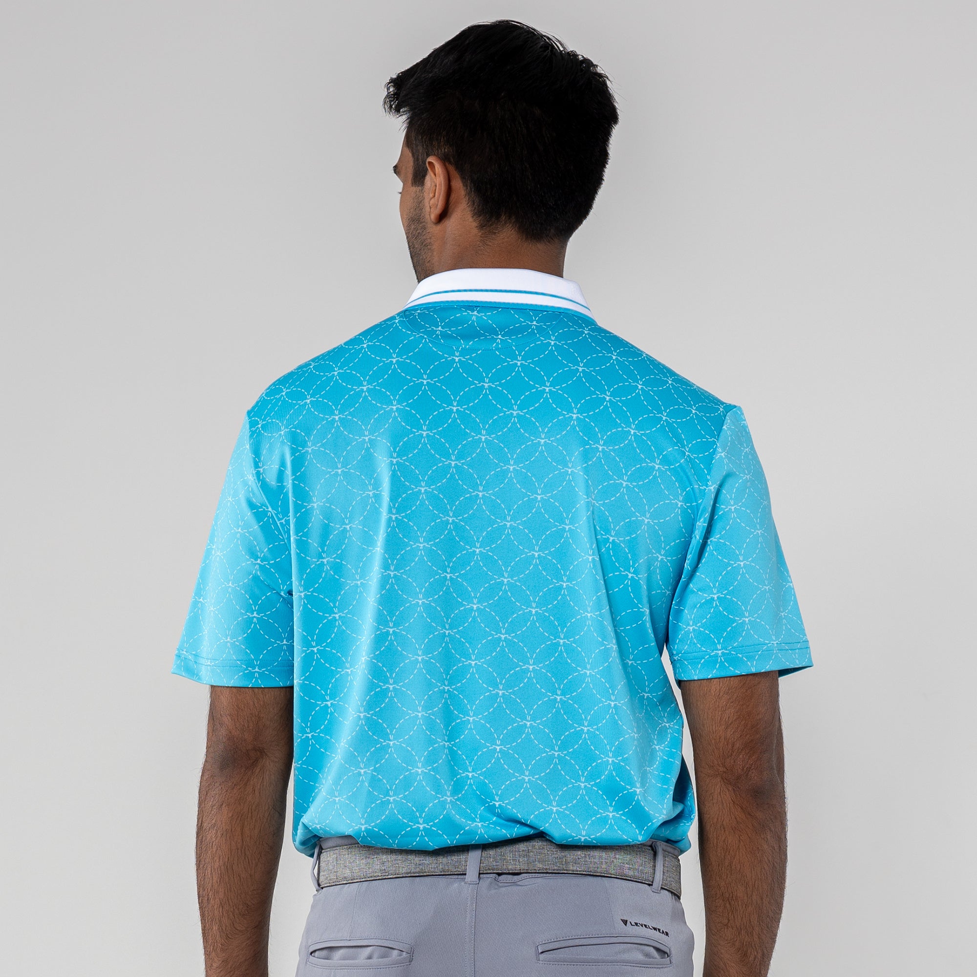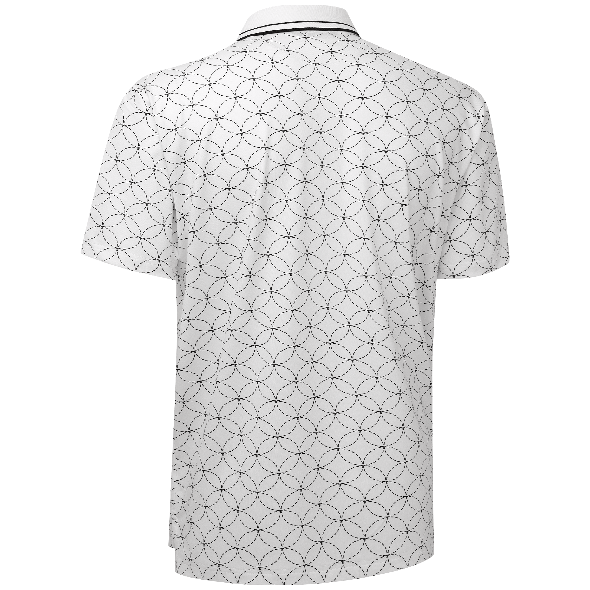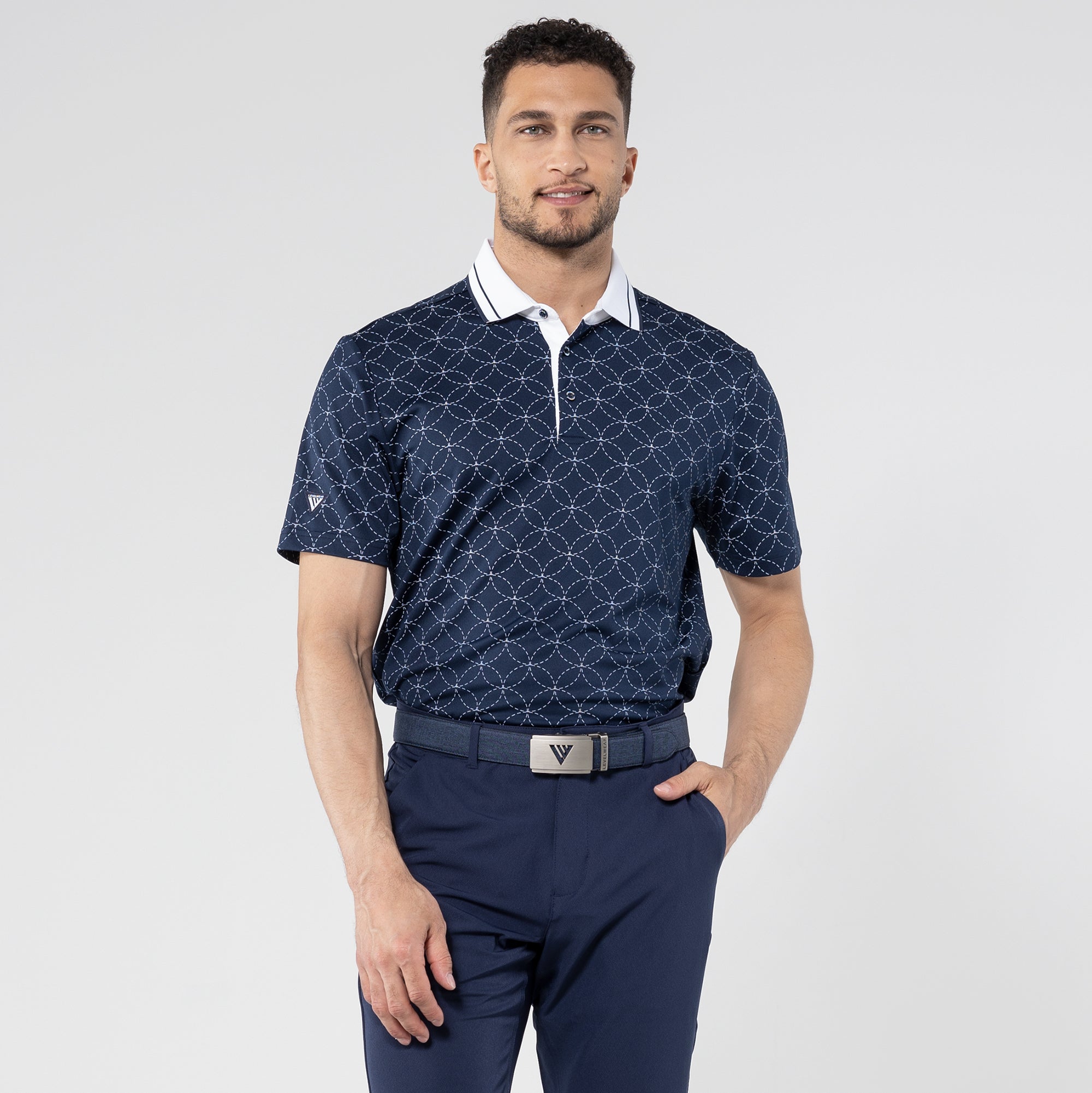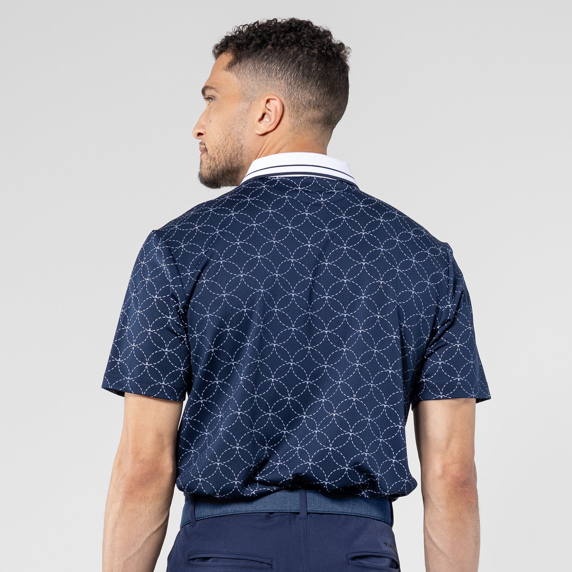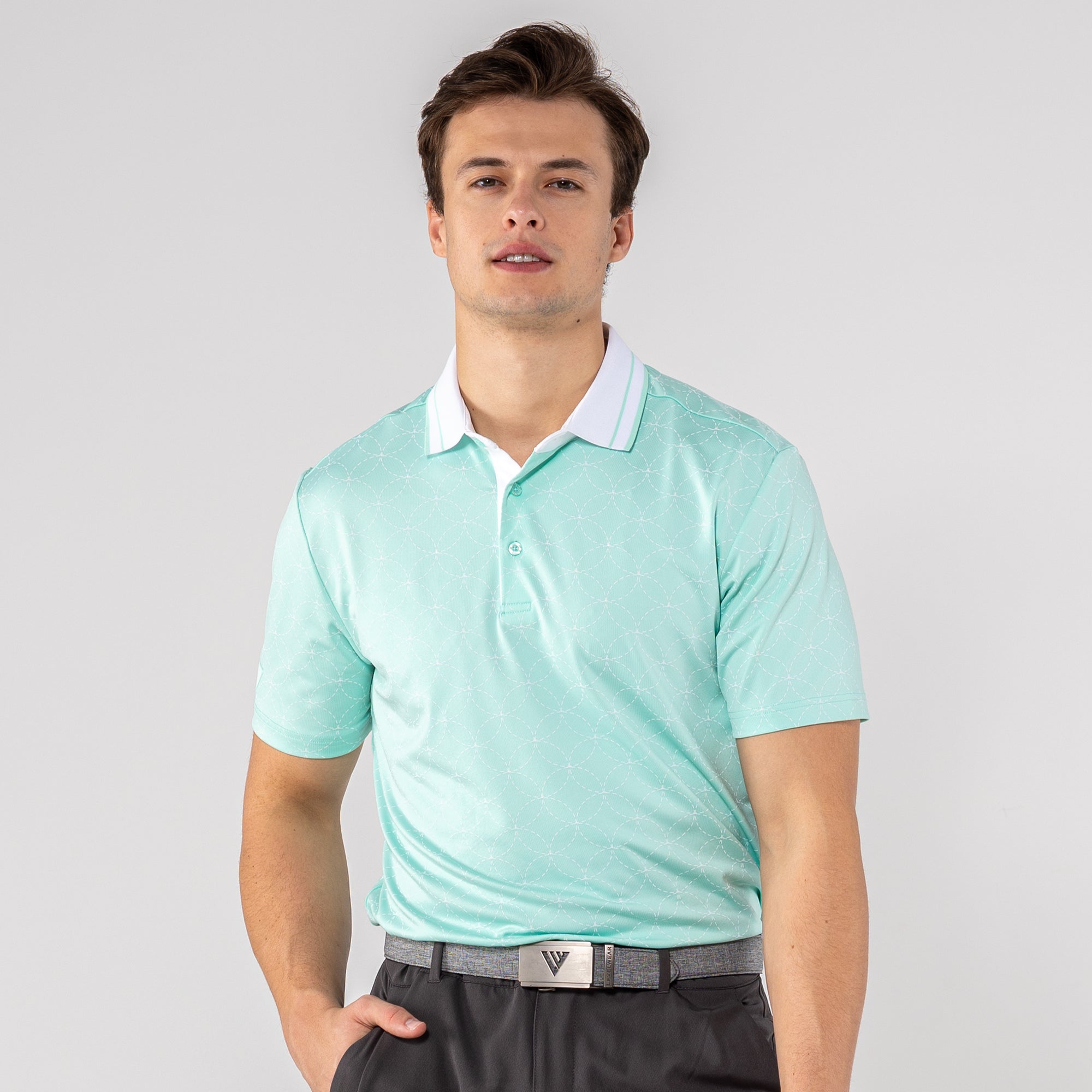 Elevate your style with the Cascade Men's Polo, featuring a funky circle pattern for a touch of unique flair. Crafted from 92% Polyester and 8% Spandex, it offers moisture-wicking and anti-bacterial properties for all-day freshness. With a flat knit collar, high-low hem detail, and contrast color collar and placket, it's the perfect blend of style and comfort.
