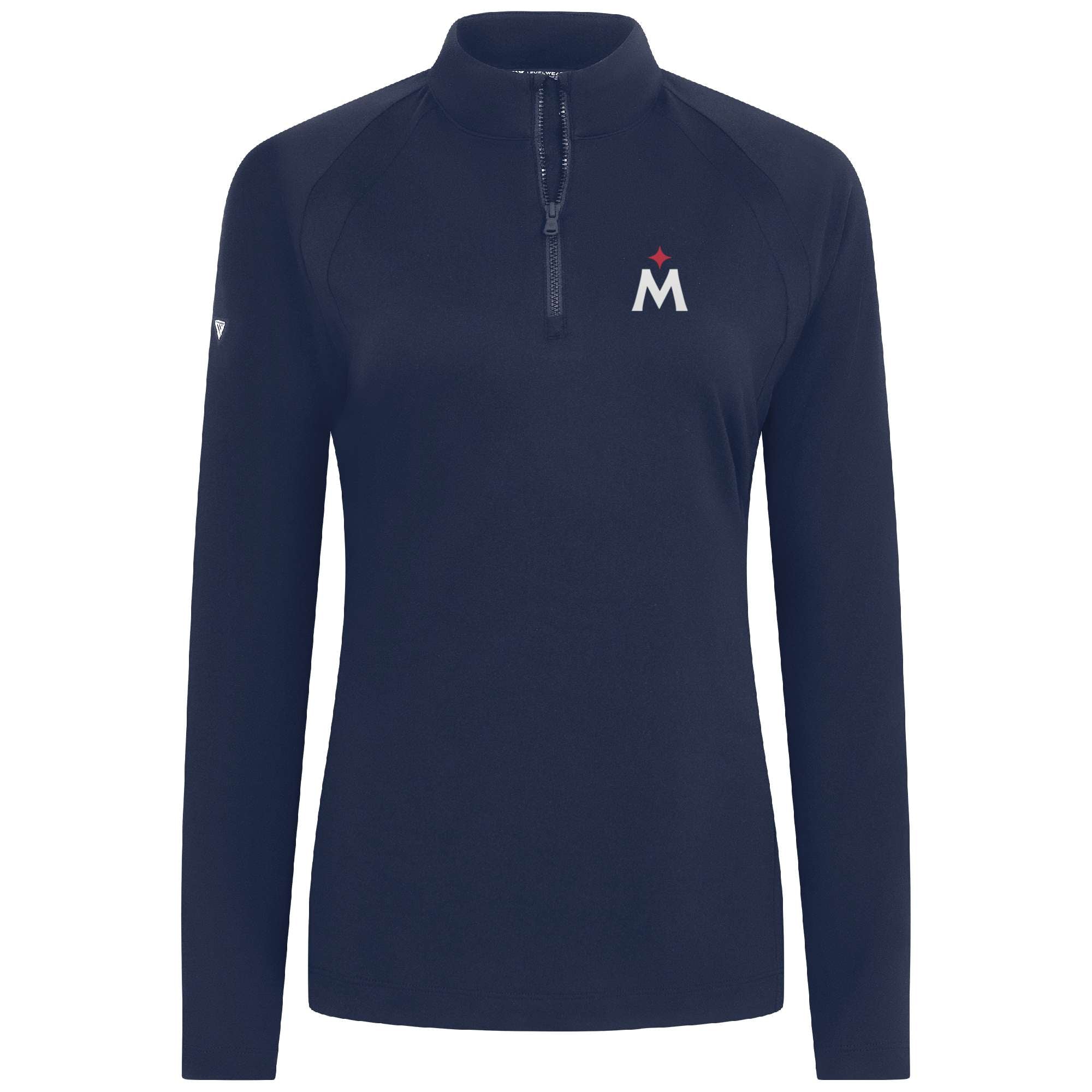 The women's Flex midlayer combines technical functionality with contemporary design, ideal for the active woman on the go. This midlayer is engineered with moisture-wicking technology to keep you dry and comfortable during vigorous activities, whether you're hitting the gym or exploring the outdoors. It features a quarter-zip closure with a contrast stand-up collar that allows for easy temperature regulation and adds a modern touch. The stylized front yoke and back yoke enhance the garment's structure, while mesh venting under the back yoke ensures optimal breathability and cooling. Finished with a high-low hem detail, this piece provides additional coverage and a flattering silhouette.