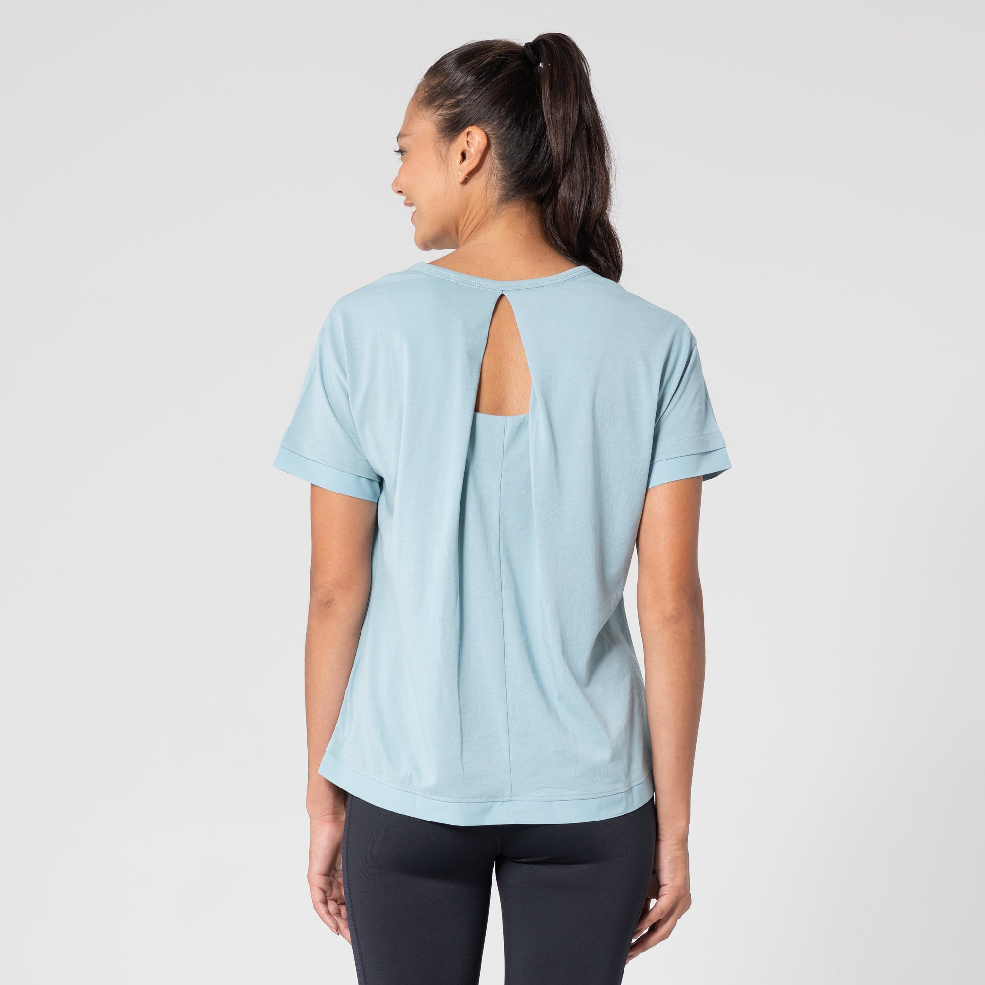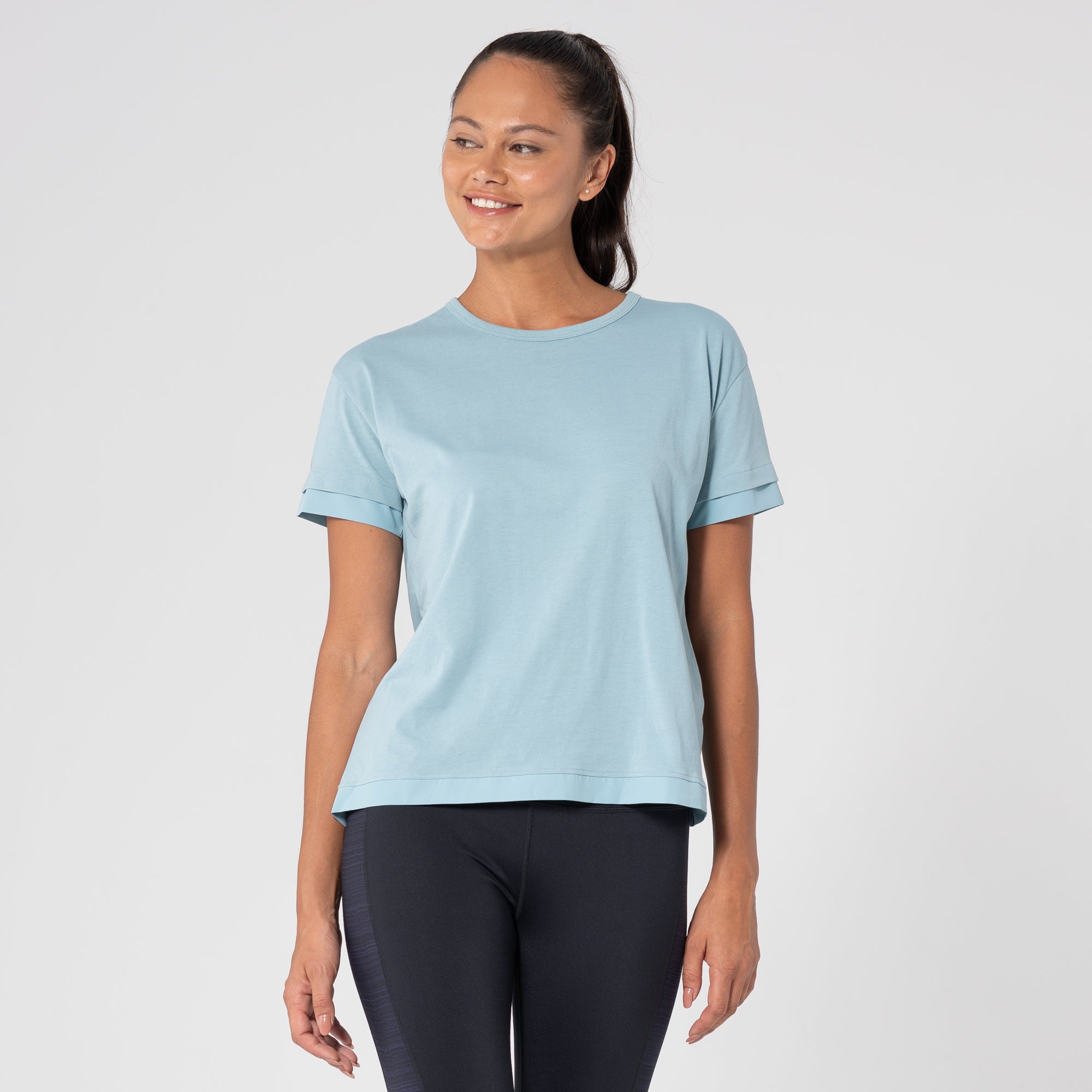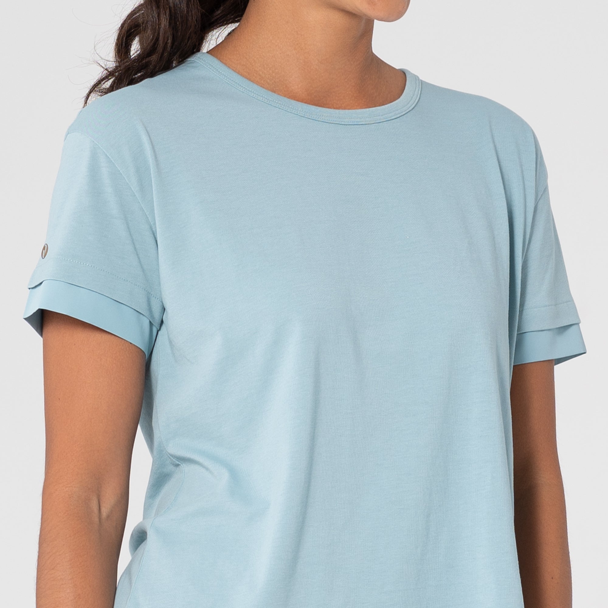 The Tulip top features a drop shoulder flowy silhouette that drapes gracefully, offering a flattering and comfortable fit for all body types. The open pleat design at the center back introduces an element of refined detail, adding visual interest and enhancing the top's airy feel. Contrasting semi-dull woven trim at the sleeve openings and body hem frames the piece with a subtle yet distinct touch, complementing the overall design. Made from a blend of 65% polyester and 35% cotton, the Tulip is soft to the touch and durable, perfect for both relaxed days and evenings out.