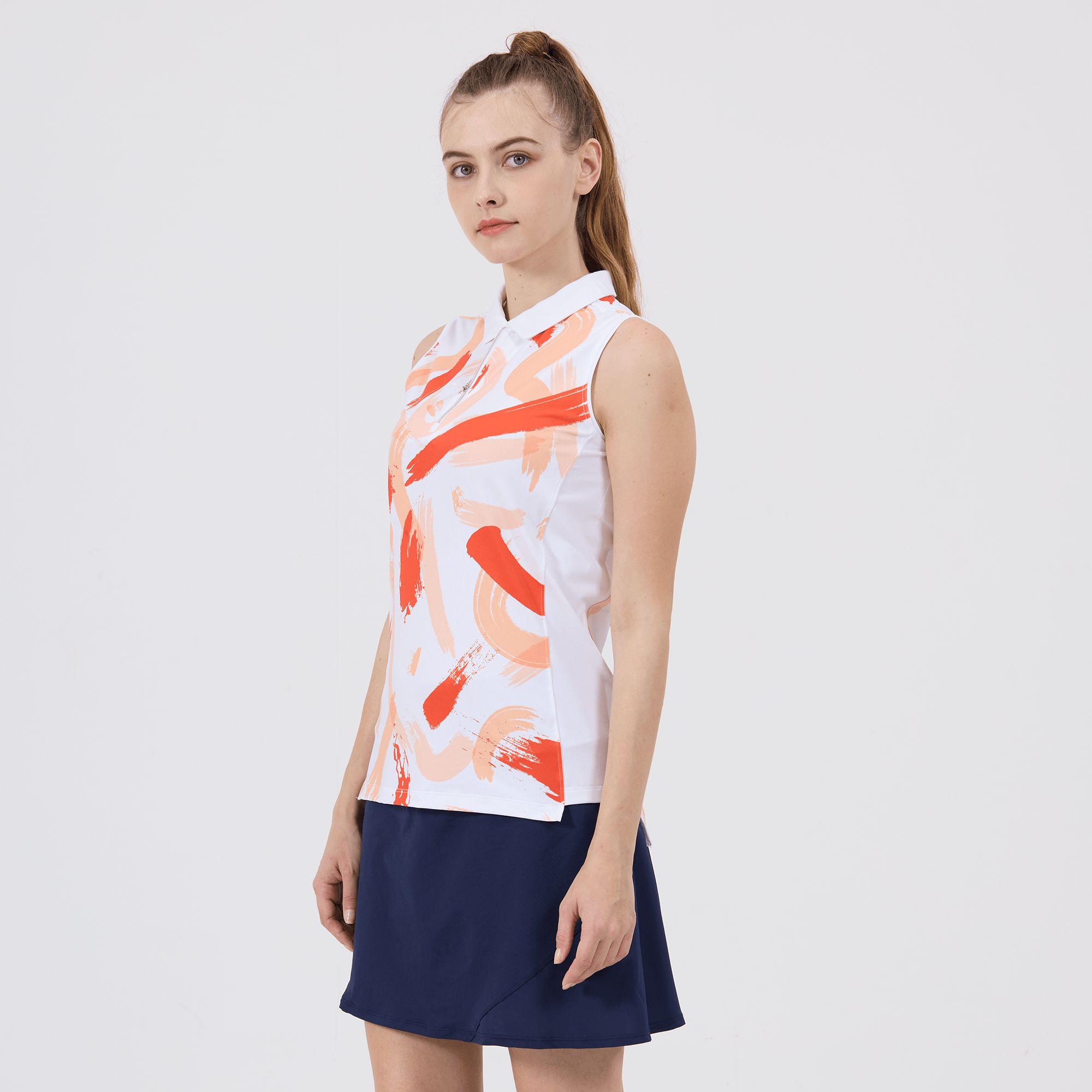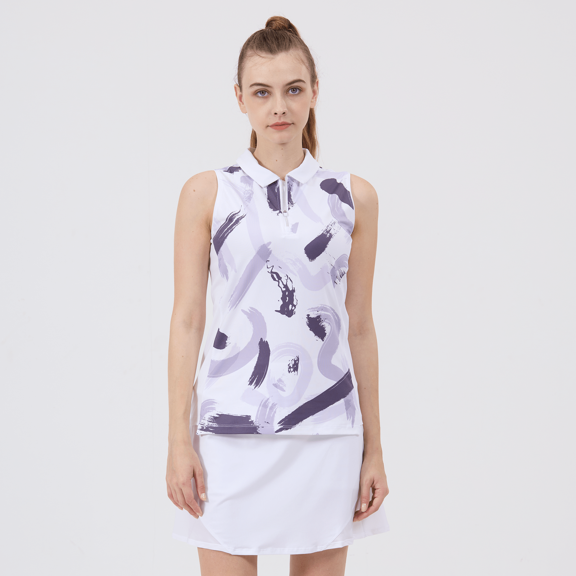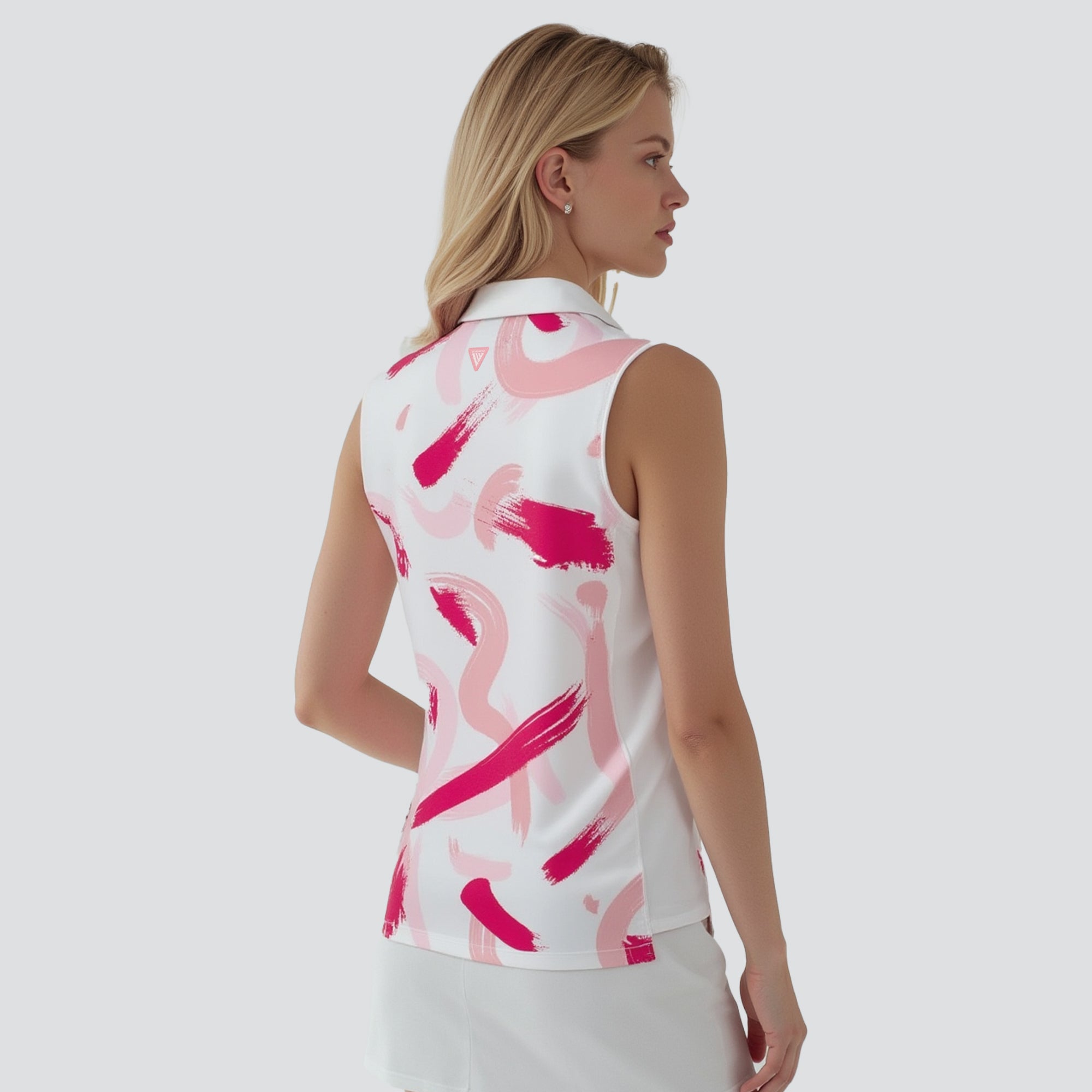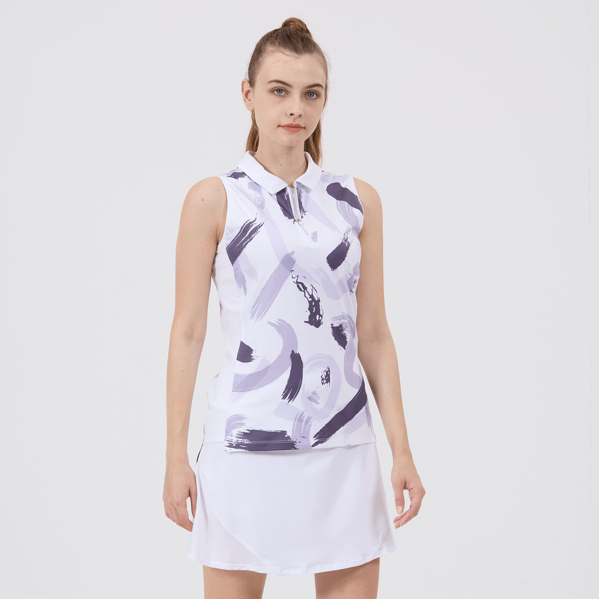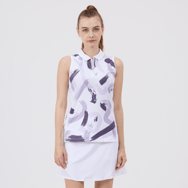 Hit the golf course in style with the women's Brush polo, engineered to deliver top performance and sun protection. This polo is crafted from a blend of 88% polyester and 12% spandex, offering a comfortable stretch fit that moves with you as you swing. It features moisture-wicking technology to keep you dry, anti-static properties to ensure a cling-free experience, and UPF 50+ to protect you from the sun's harmful rays. The design includes contrast solid side panels and a collar with a built-in collar stay for a sharp, structured look, complemented by a quarter-zip with a contrast zipper guard for adjustable coverage. Forward shoulder seams enhance mobility, and the high-low hem adds a stylish detail while providing additional coverage. Finished with a vibrant all-over print, the Brush Polo is a fashionable and functional choice for any woman looking to make a statement on the golf course.