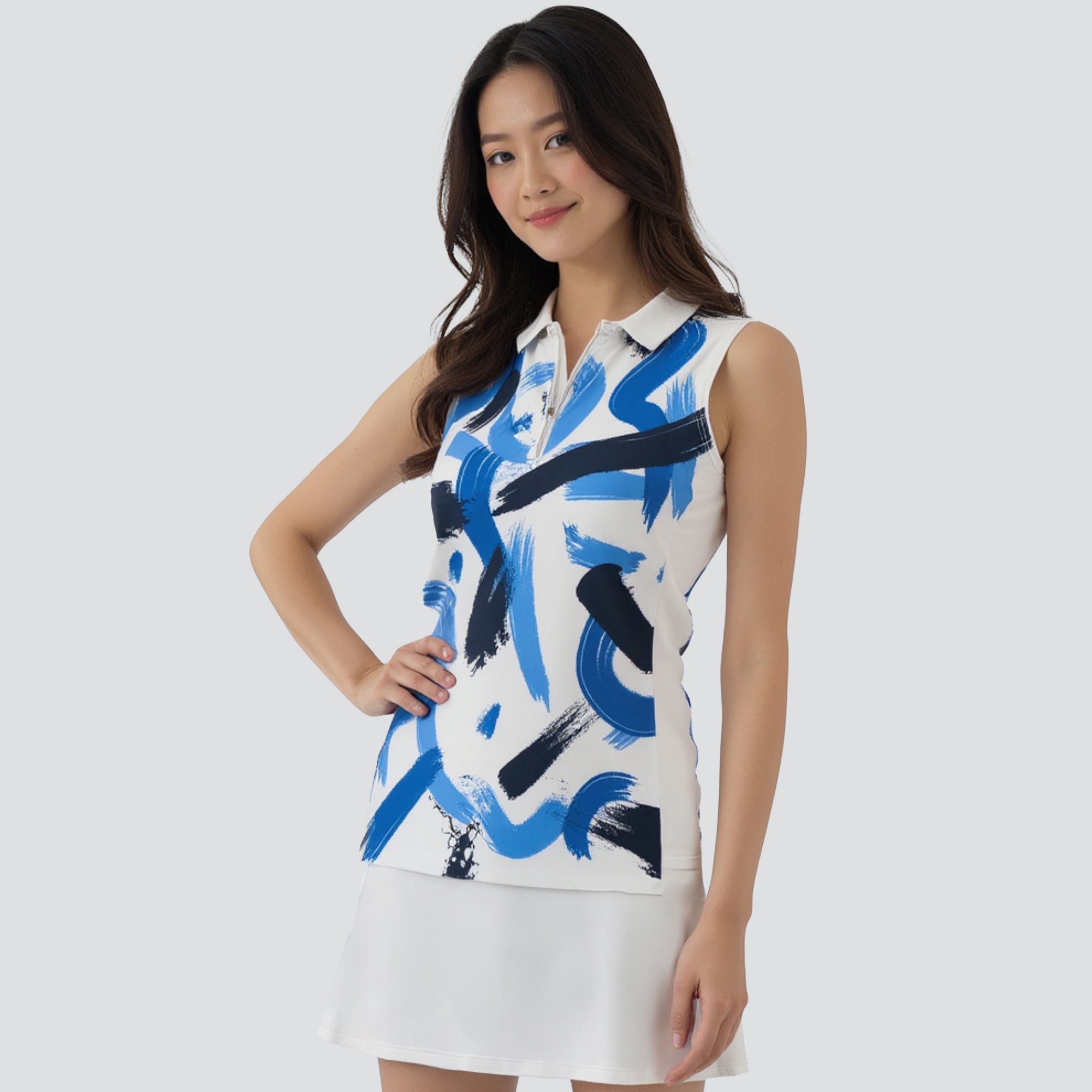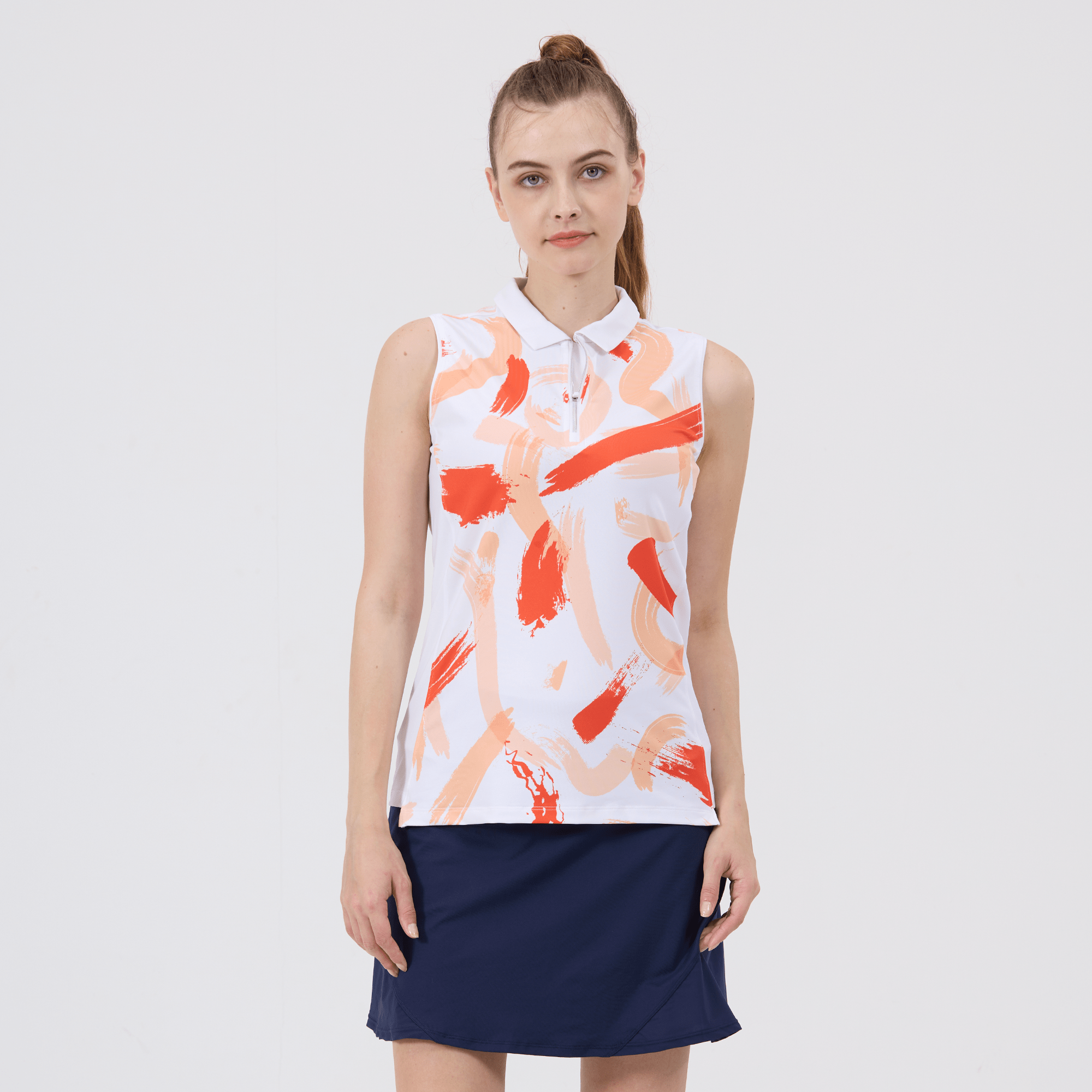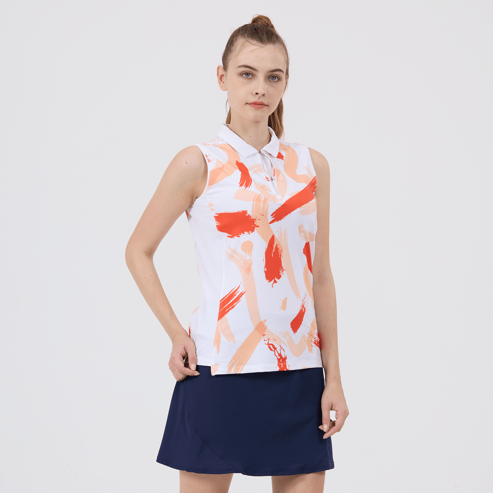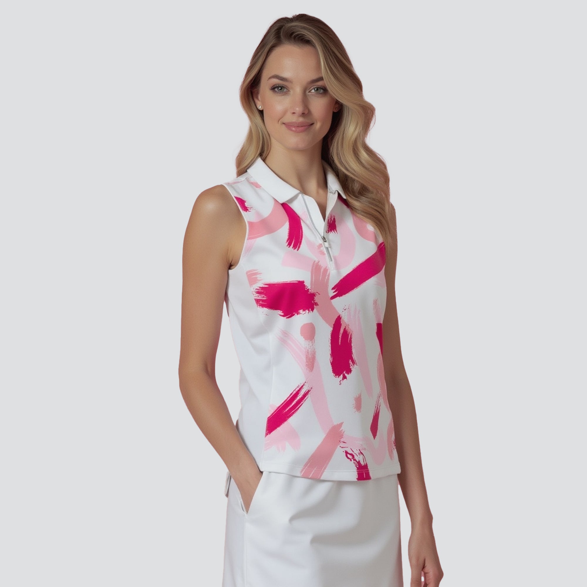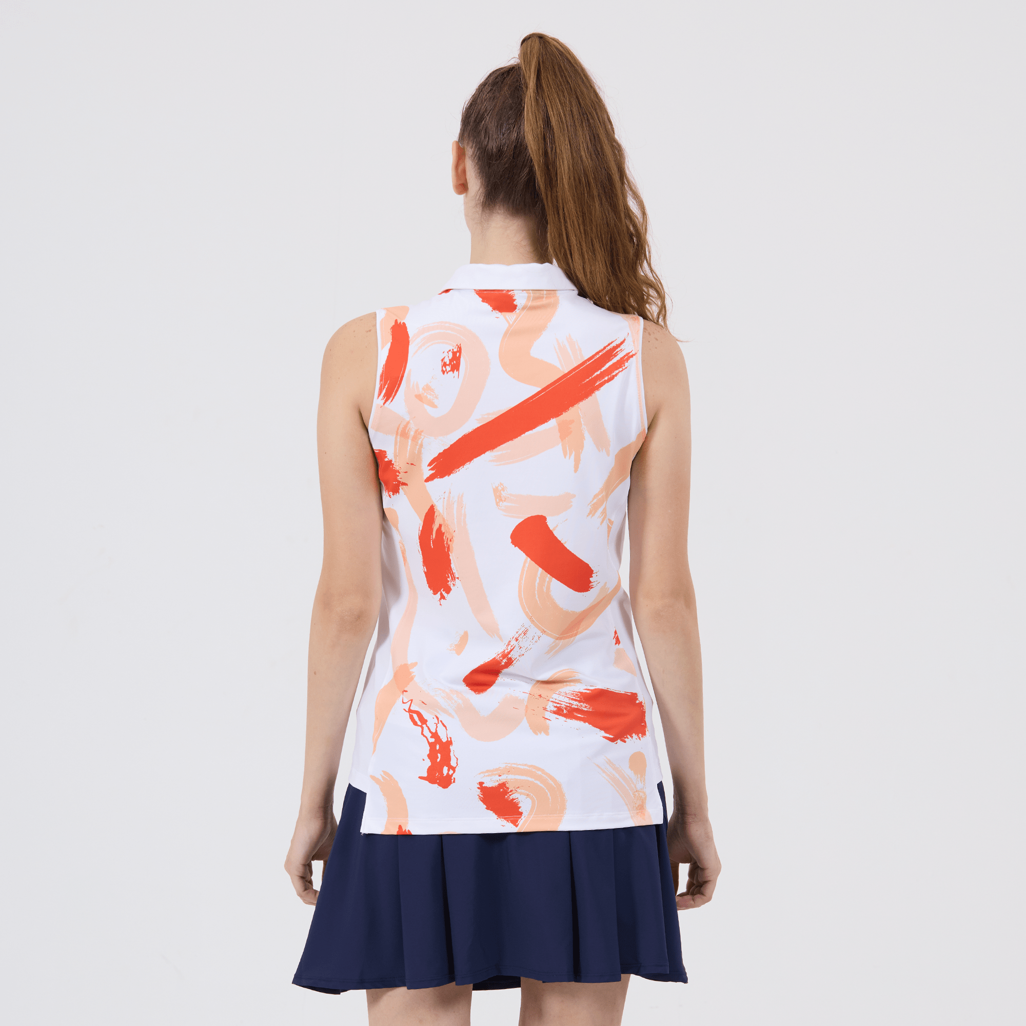 Hit the golf course in style with the women's Brush polo, engineered to deliver top performance and sun protection. This polo is crafted from a blend of 88% polyester and 12% spandex, offering a comfortable stretch fit that moves with you as you swing. It features moisture-wicking technology to keep you dry, anti-static properties to ensure a cling-free experience, and UPF 50+ to protect you from the sun's harmful rays. The design includes contrast solid side panels and a collar with a built-in collar stay for a sharp, structured look, complemented by a quarter-zip with a contrast zipper guard for adjustable coverage. Forward shoulder seams enhance mobility, and the high-low hem adds a stylish detail while providing additional coverage. Finished with a vibrant all-over print, the Brush Polo is a fashionable and functional choice for any woman looking to make a statement on the golf course.