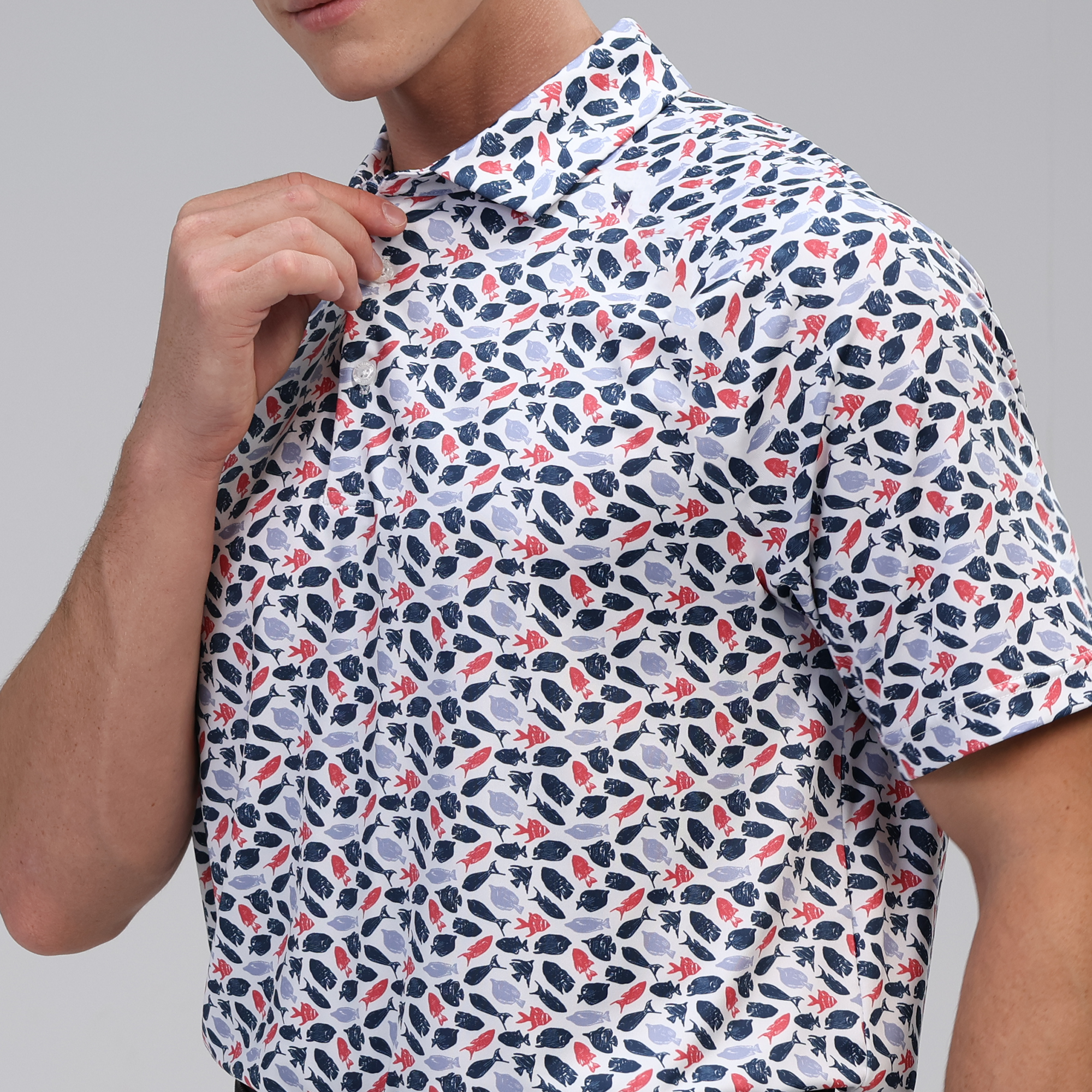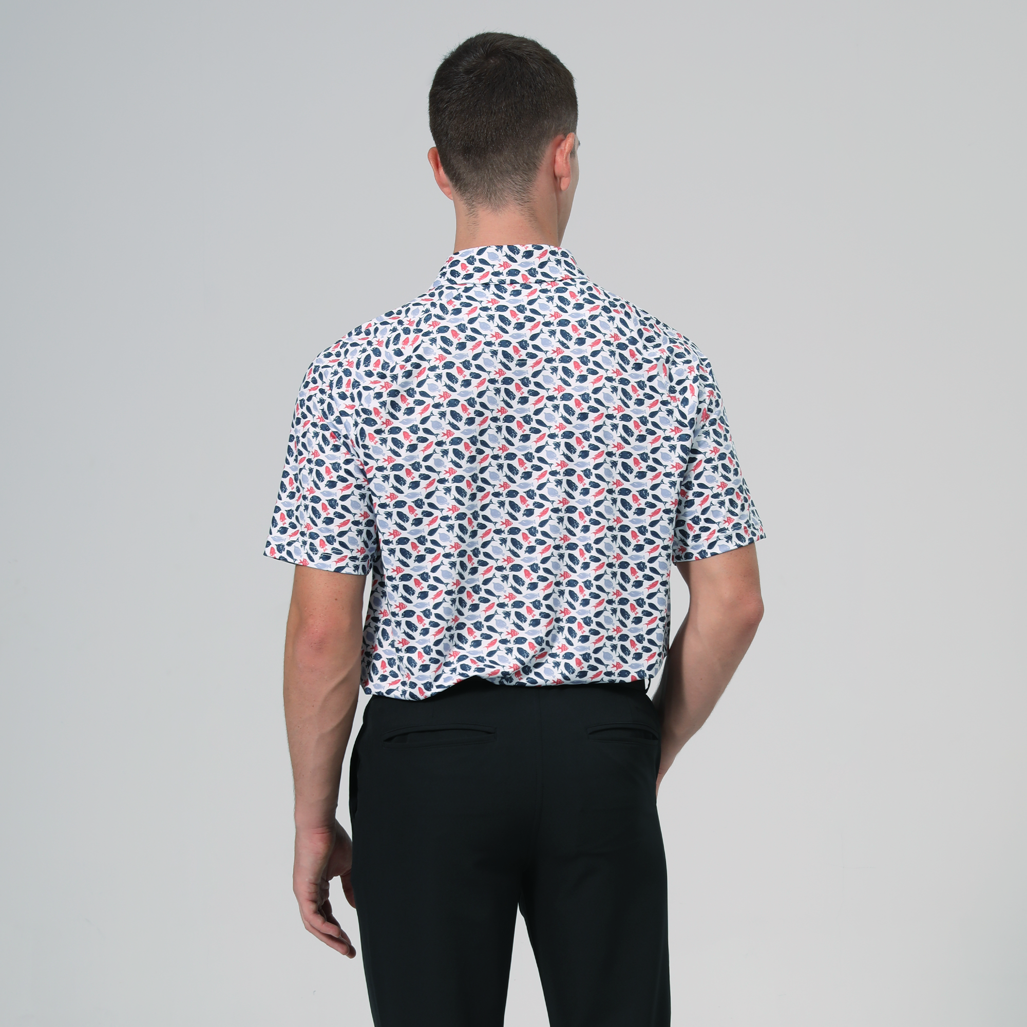 Made with moisture-wicking fabric, the Aquarium polo will keep you cool and dry during every round, while an anti-bacterial finish ensures lasting freshness. Featuring UPF 50+ protection, this polo guards against harmful sun rays, making it ideal for long days outdoors. Designed with a self-fabric collar and built-in collar stay, it maintains a crisp, polished look, and forward shoulder seams provide enhanced mobility. The high-low hem with side slits adds modern flair and extra flexibility, while the all-over print brings a vibrant touch to your golf wardrobe.
