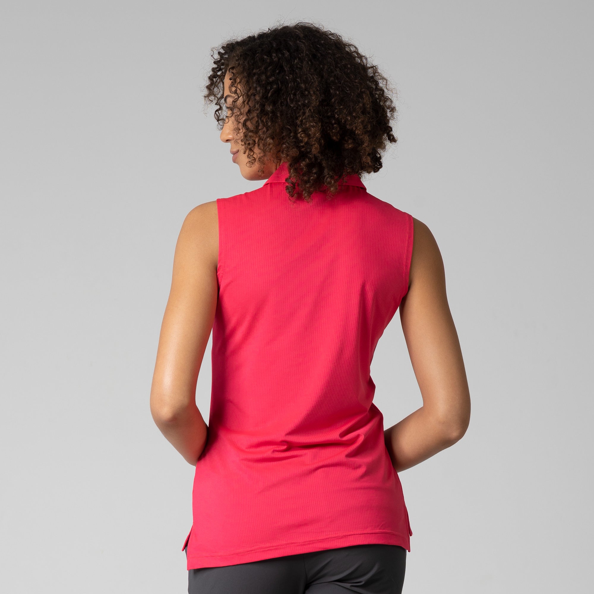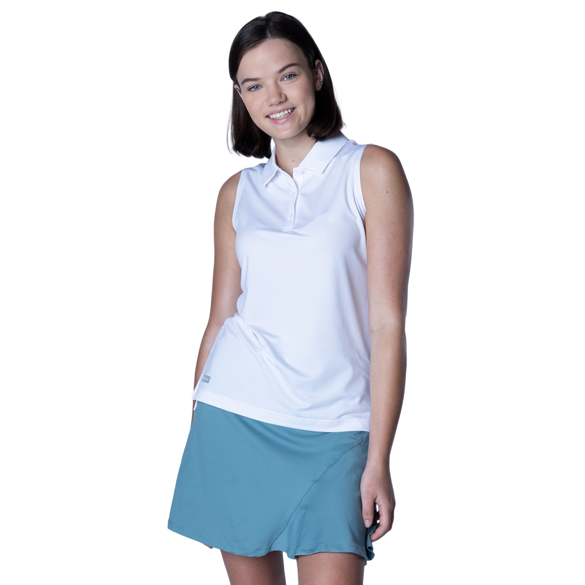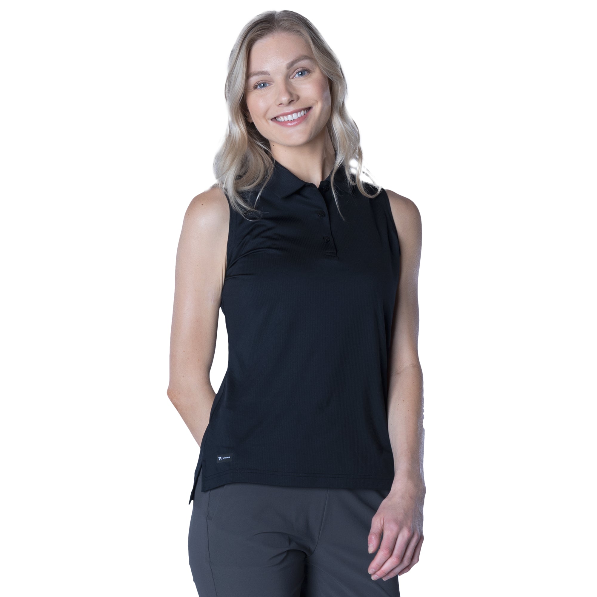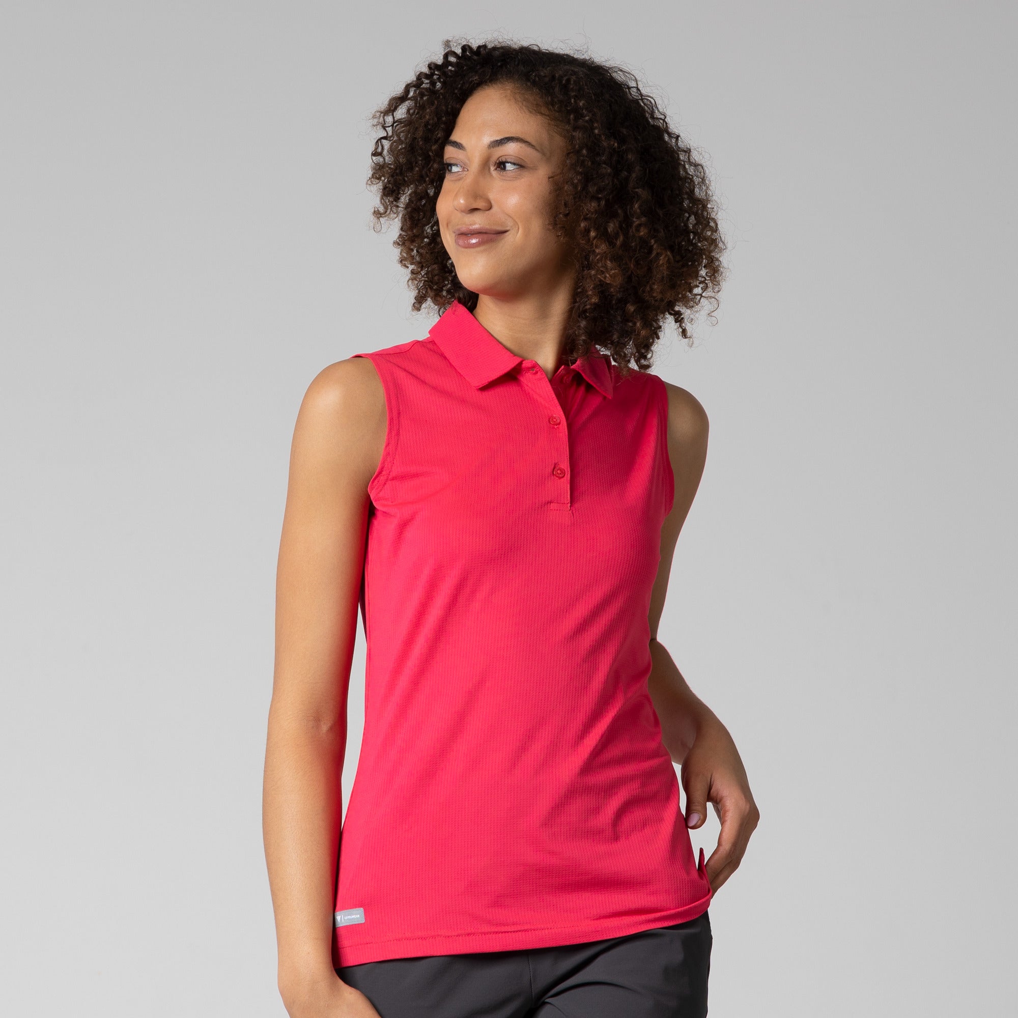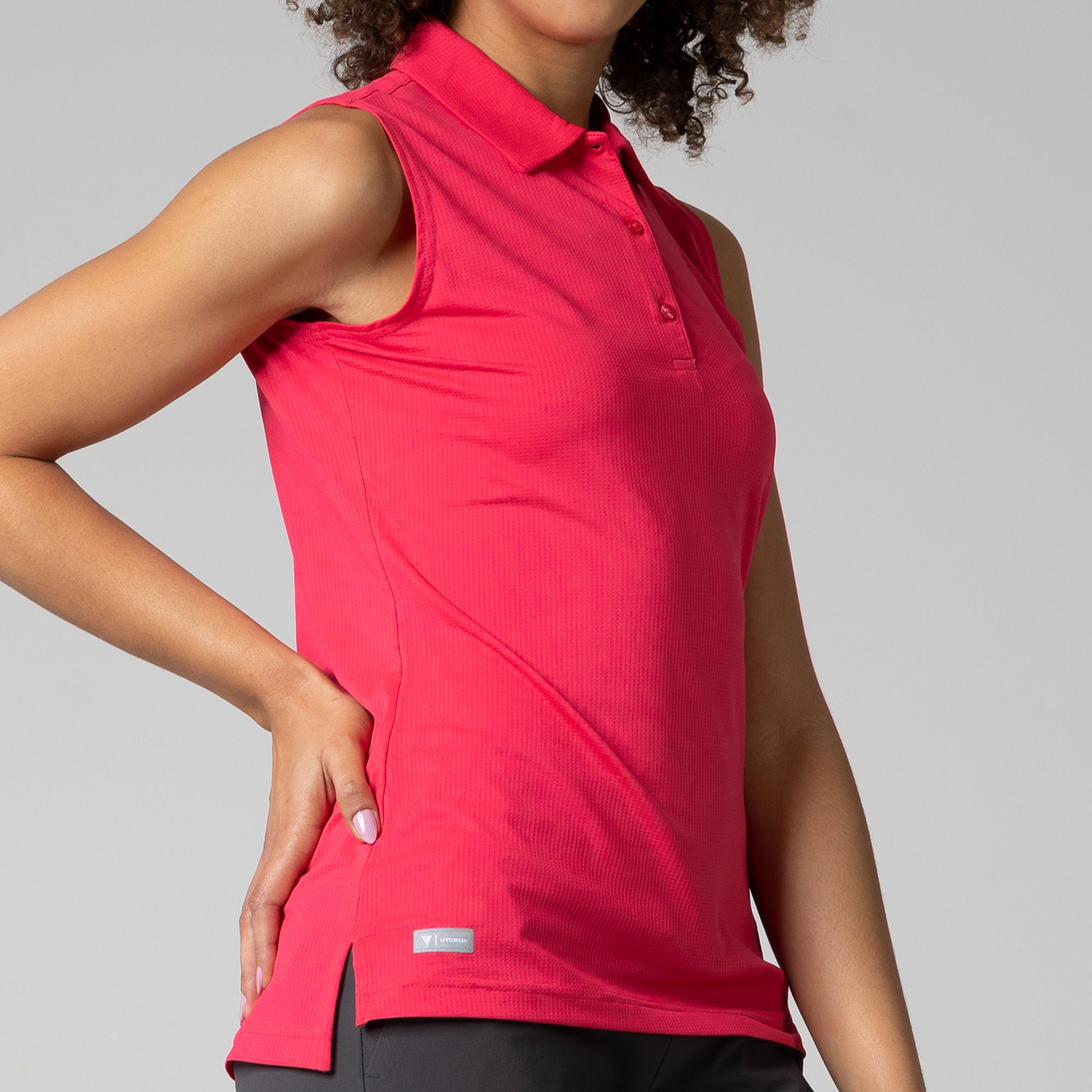 The women's Aries polo is made from a flexible blend of 92% polyester and 8% spandex, this sleeveless polo enhances movement while providing a comfortable fit. It is equipped with moisture-wicking technology that efficiently absorbs sweat, ensuring you remain dry and comfortable as you play. An anti-microbial finish prevents odor buildup, keeping you fresh from the first tee to the last hole. The self-fabric collar and three-button placket uphold a classic golf look, complemented by a modern high-low hem and side slits for added elegance and ease of movement. Perfect for a day on the greens, the Aries Polo combines performance-driven features with contemporary design to ensure you look and feel your best throughout the game.