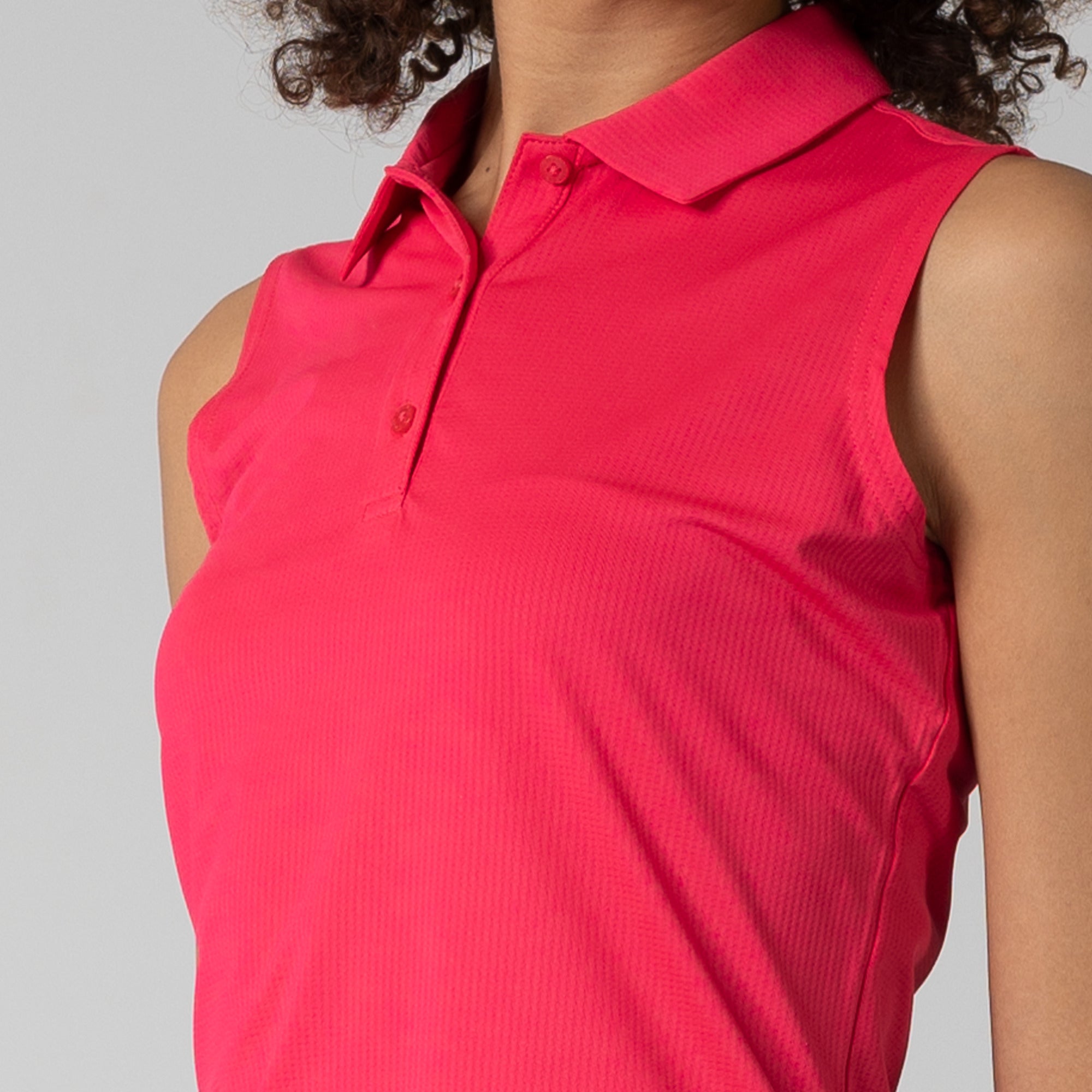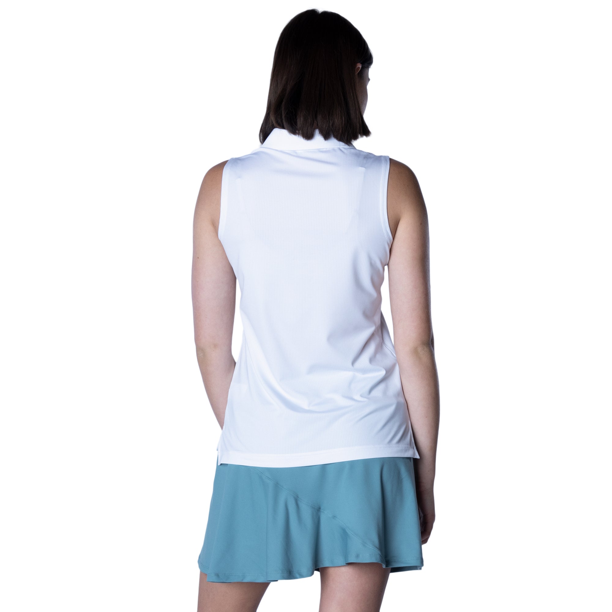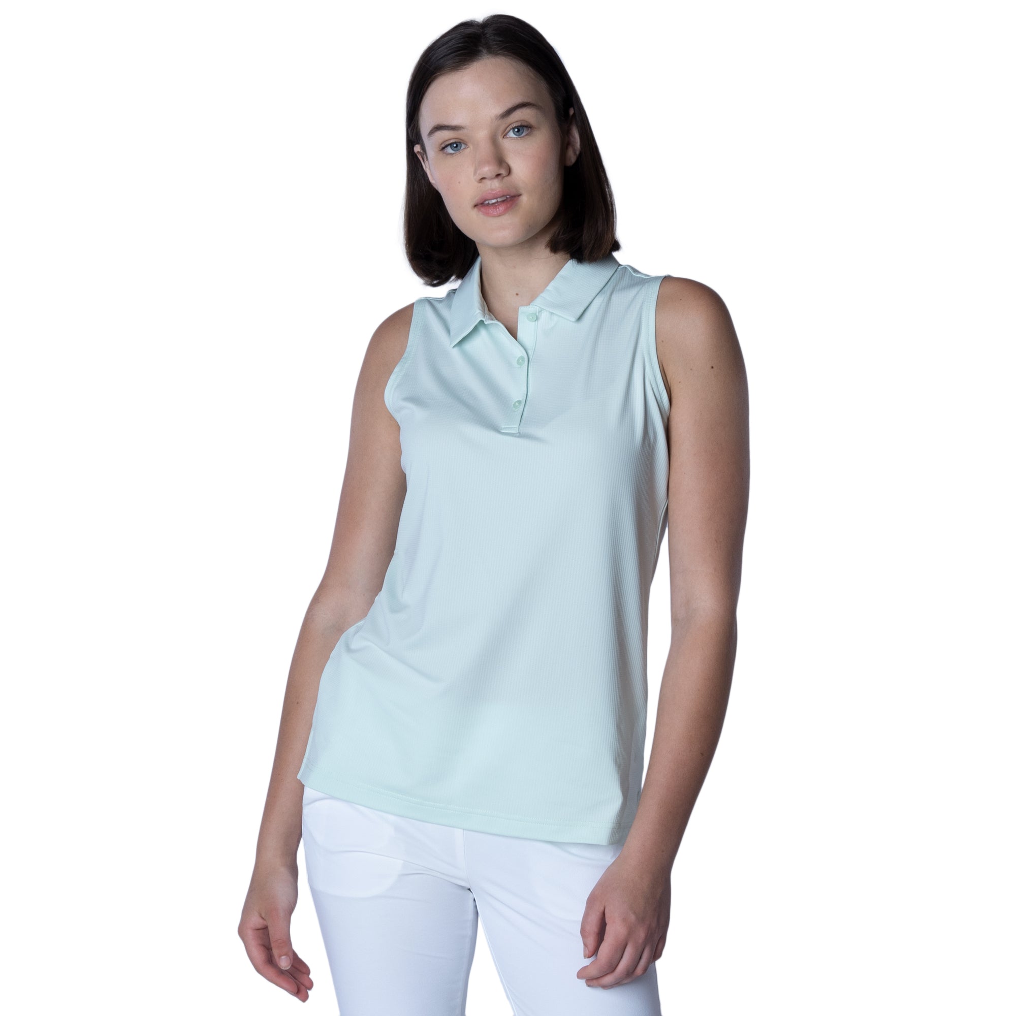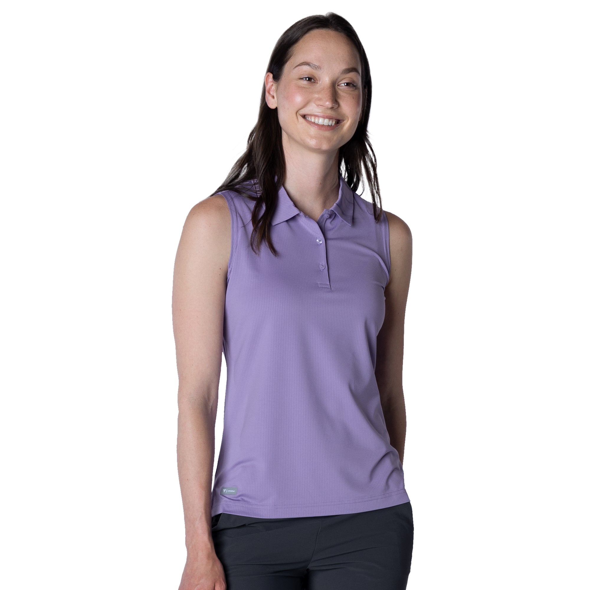 The women's Aries polo is made from a flexible blend of 92% polyester and 8% spandex, this sleeveless polo enhances movement while providing a comfortable fit. It is equipped with moisture-wicking technology that efficiently absorbs sweat, ensuring you remain dry and comfortable as you play. An anti-microbial finish prevents odor buildup, keeping you fresh from the first tee to the last hole. The self-fabric collar and three-button placket uphold a classic golf look, complemented by a modern high-low hem and side slits for added elegance and ease of movement. Perfect for a day on the greens, the Aries Polo combines performance-driven features with contemporary design to ensure you look and feel your best throughout the game.