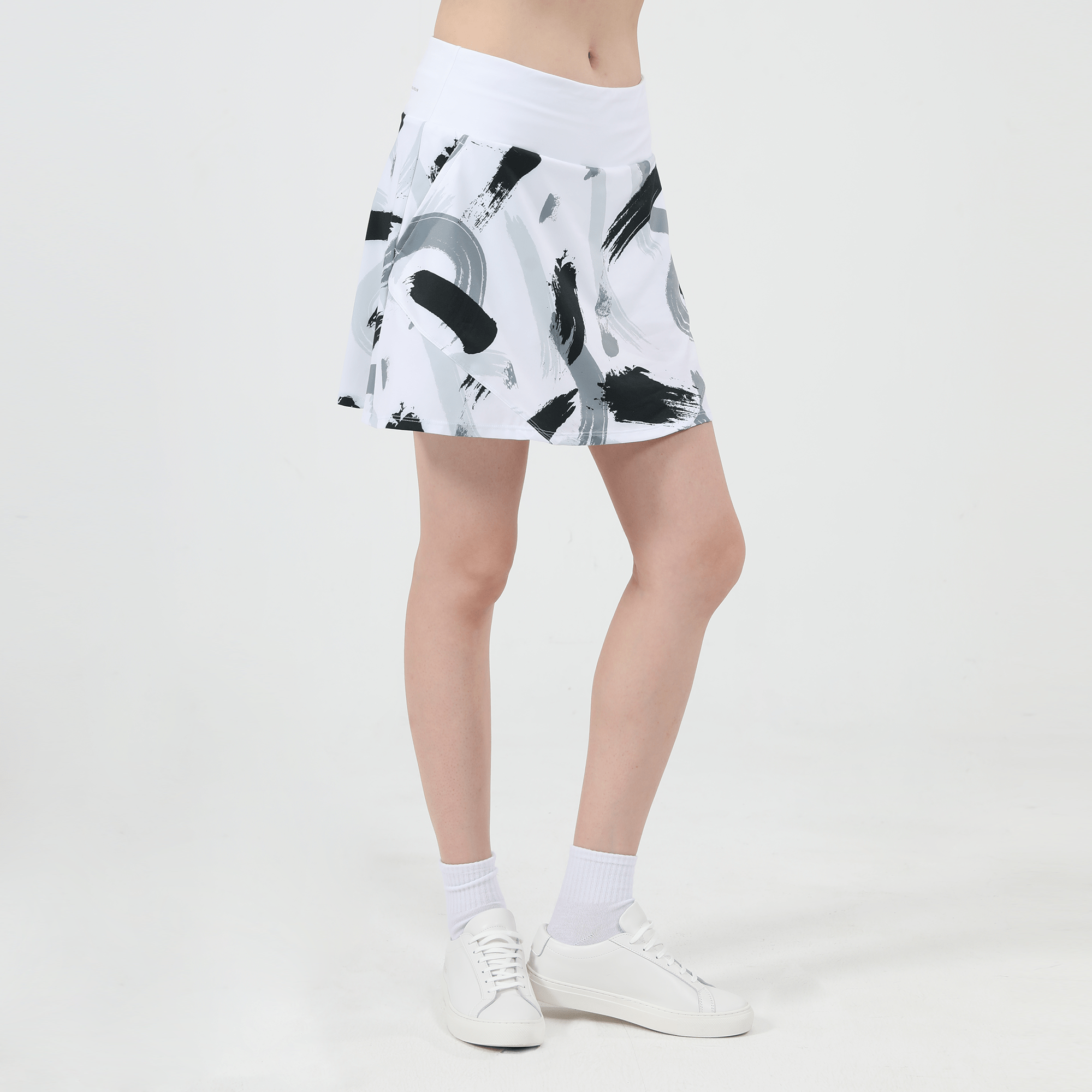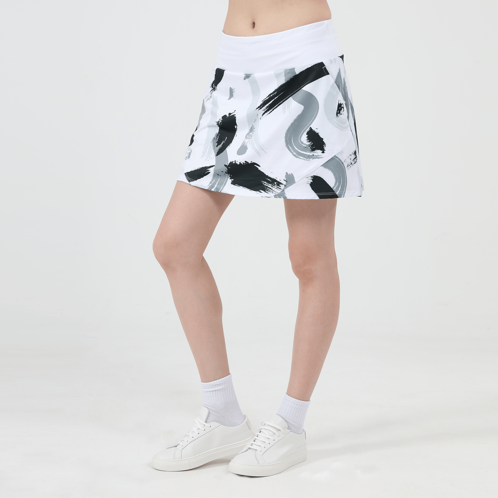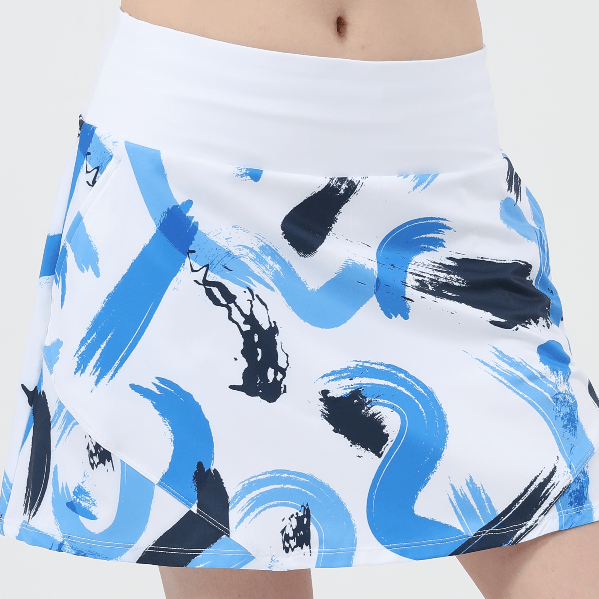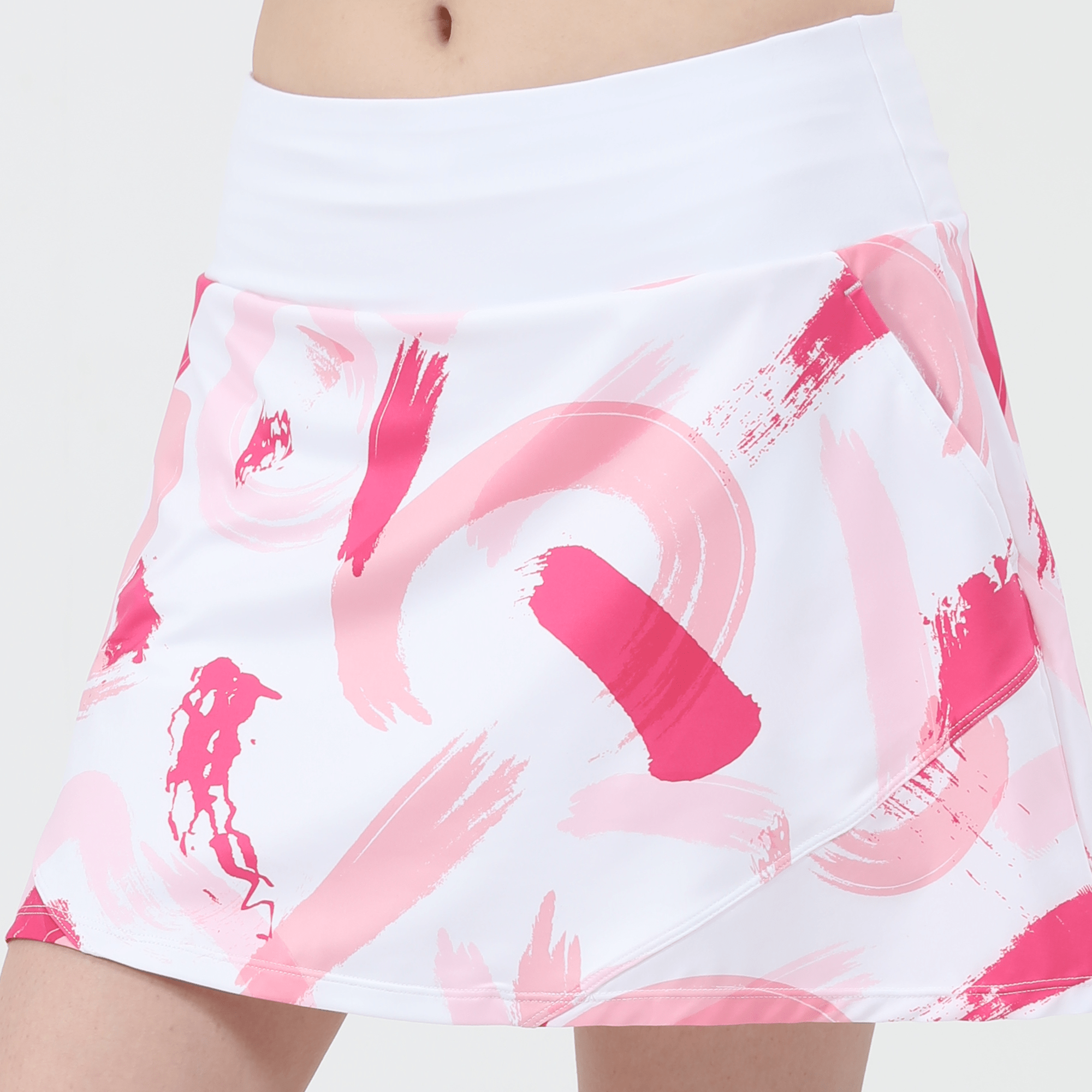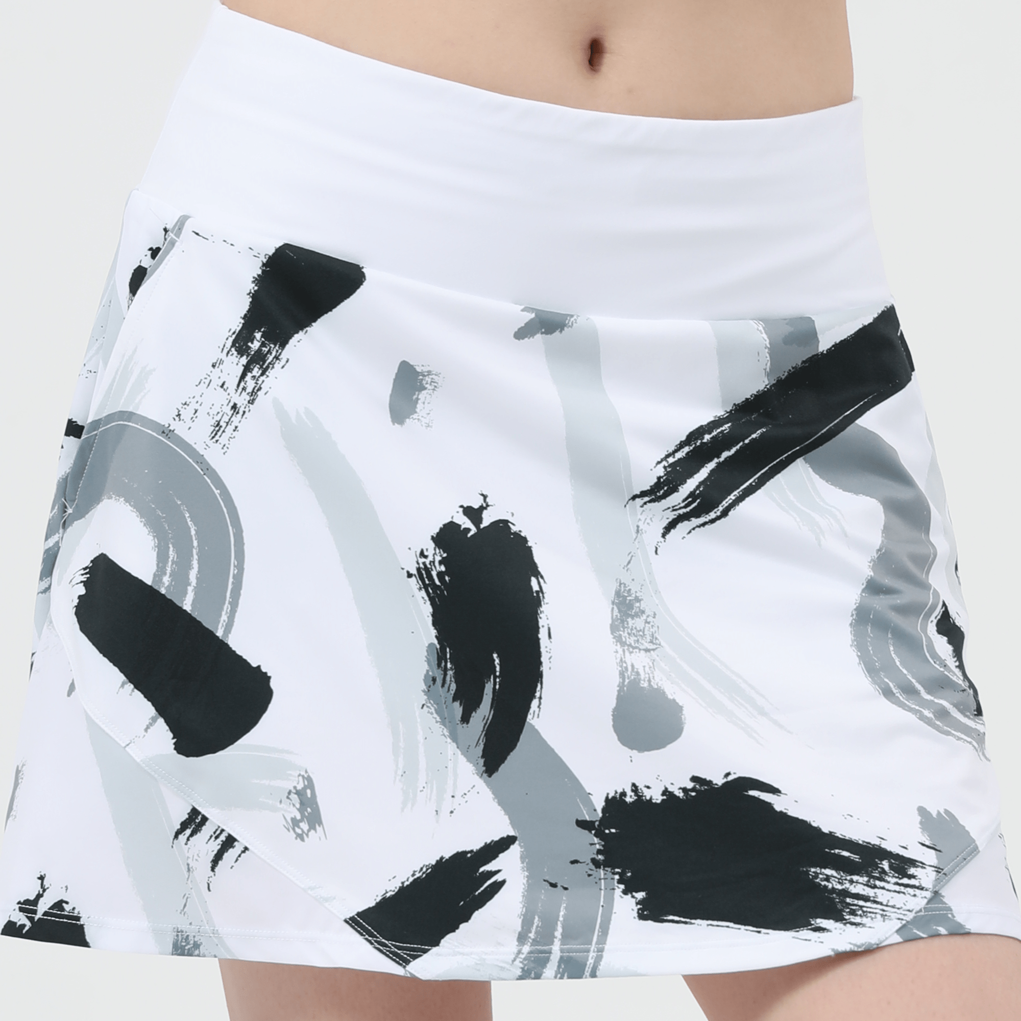 The women's Brush Skort combines visual appeal with practical design, perfectly suited for active pursuits like golf. Made from a blend of 92% polyester and 8% spandex, this skort offers flexibility and a flattering fit. The contrast extra wide waistband ensures a secure fit, while front slash pockets provide convenient storage for essentials. A pleated back enhances mobility, and hidden shorts with an elasticated waistband offer added coverage. Featuring an all-over brush stroke print and a smart 16" length at the front, which adjusts slightly by size, this skort is a versatile and essential addition to your wardrobe, blending seamlessly into athletic settings.