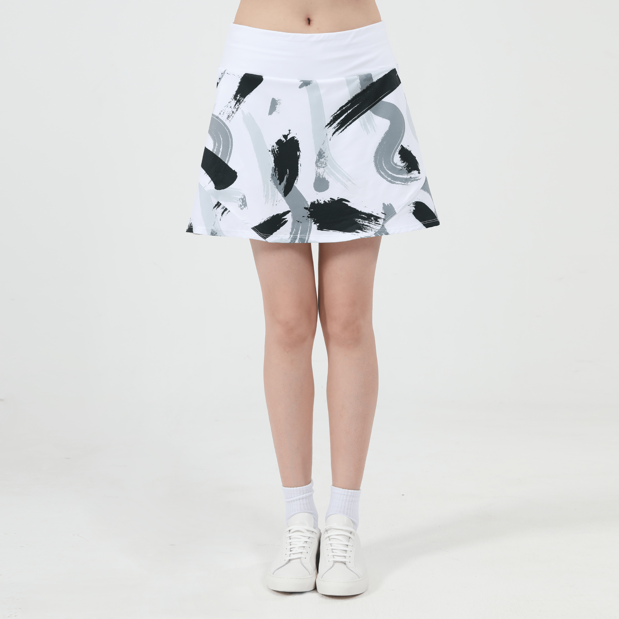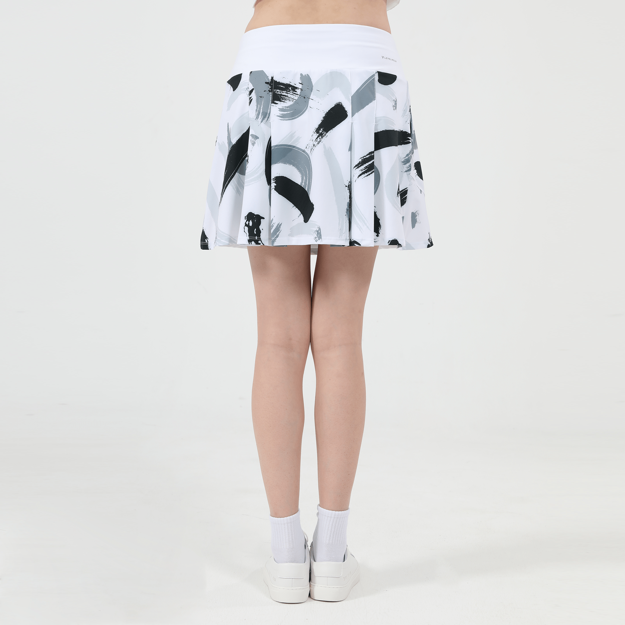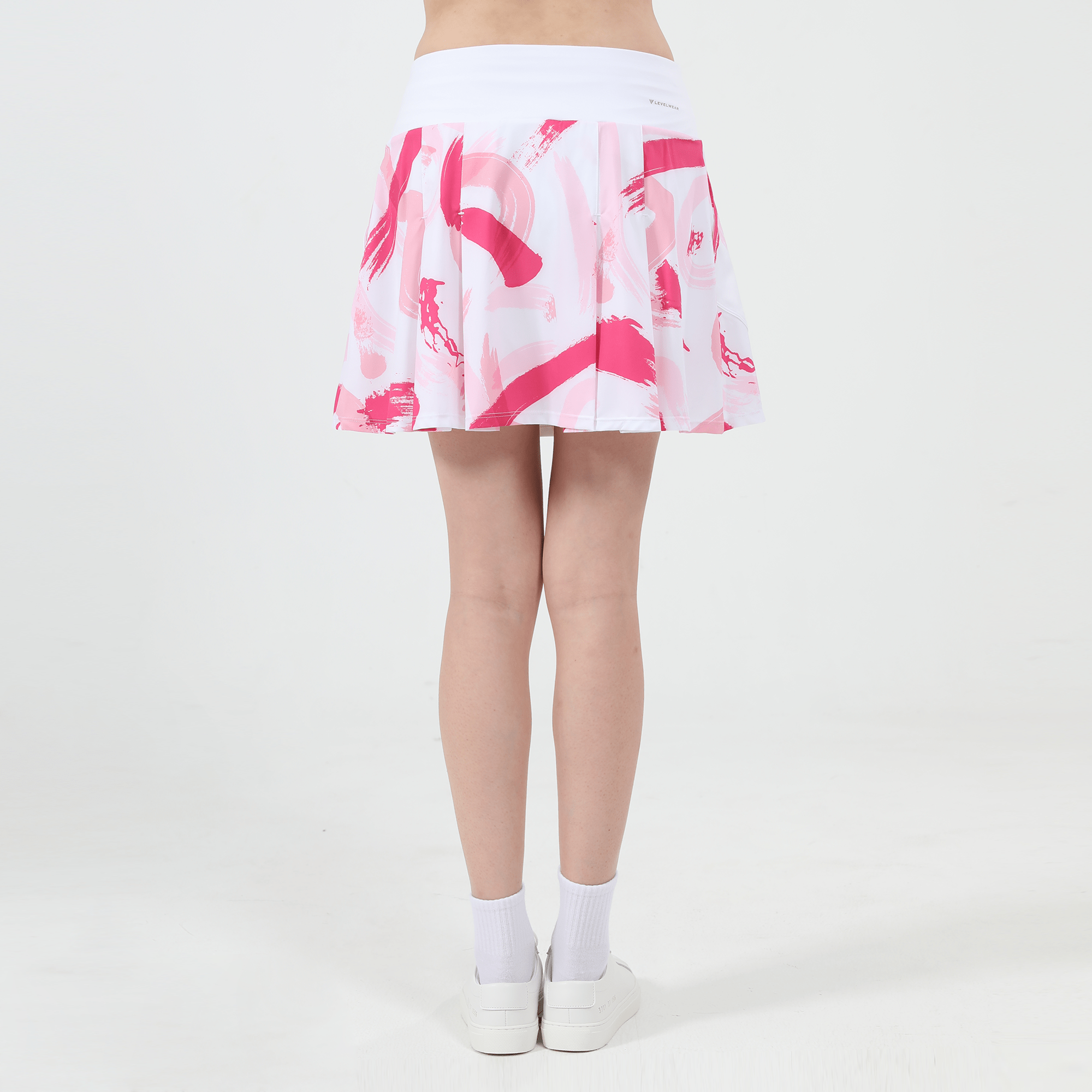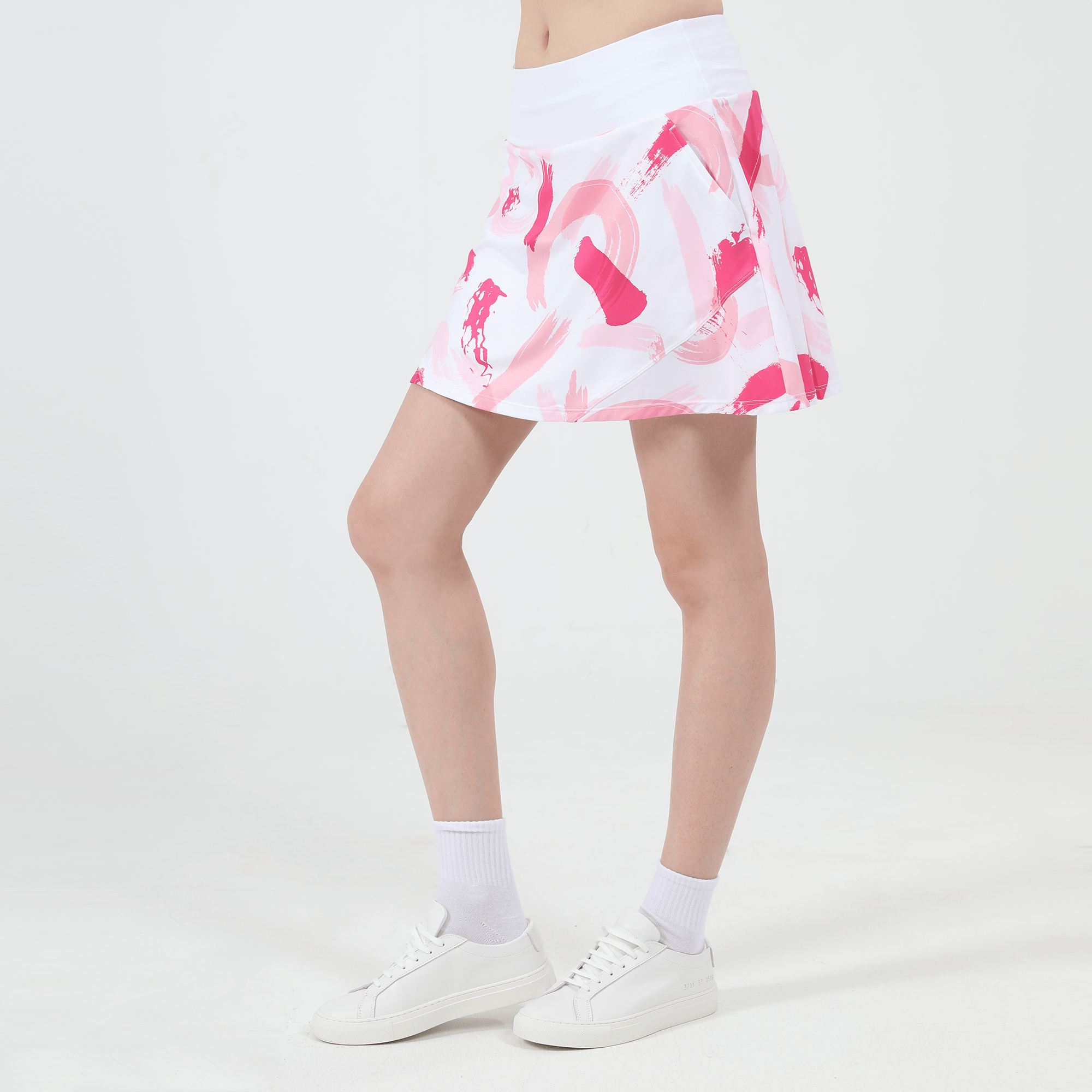The women's Brush Skort combines visual appeal with practical design, perfectly suited for active pursuits like golf. Made from a blend of 92% polyester and 8% spandex, this skort offers flexibility and a flattering fit. The contrast extra wide waistband ensures a secure fit, while front slash pockets provide convenient storage for essentials. A pleated back enhances mobility, and hidden shorts with an elasticated waistband offer added coverage. Featuring an all-over brush stroke print and a smart 16" length at the front, which adjusts slightly by size, this skort is a versatile and essential addition to your wardrobe, blending seamlessly into athletic settings.