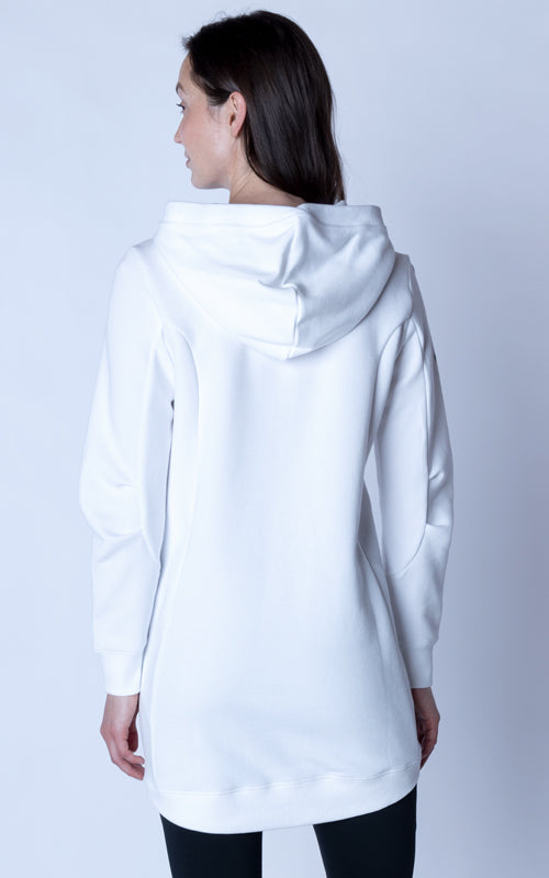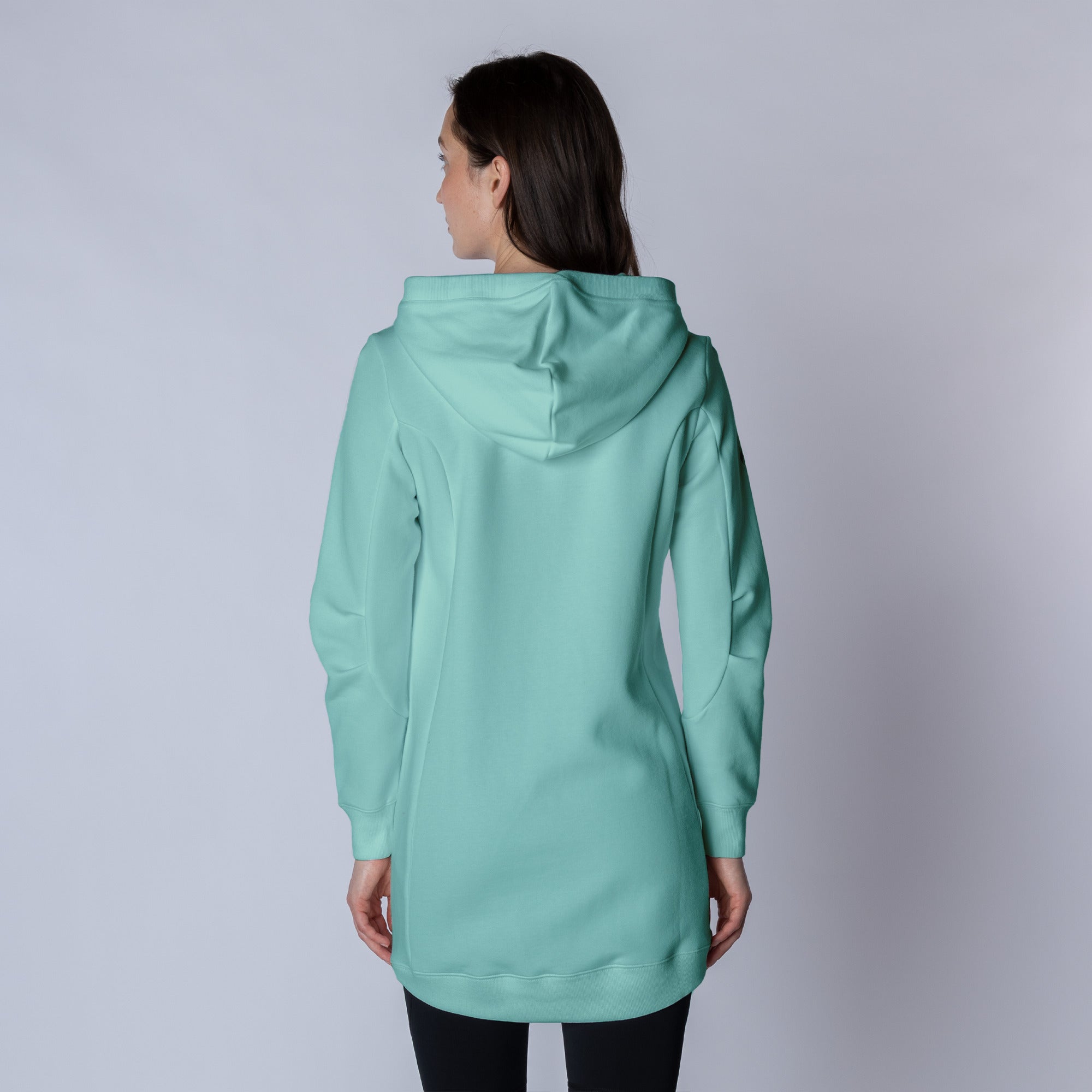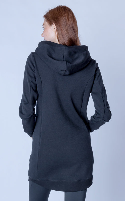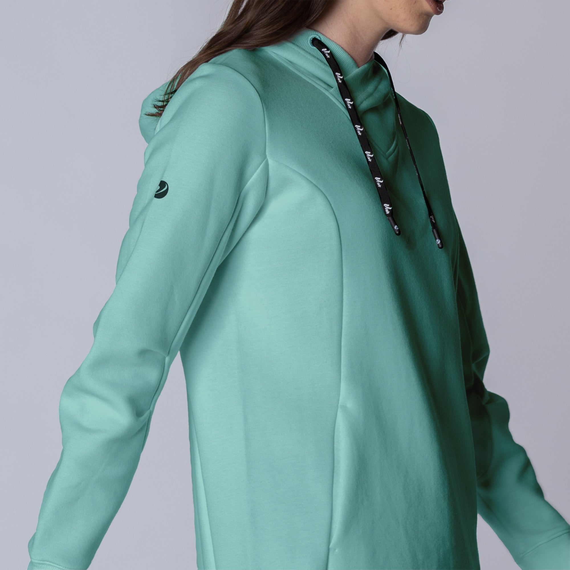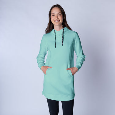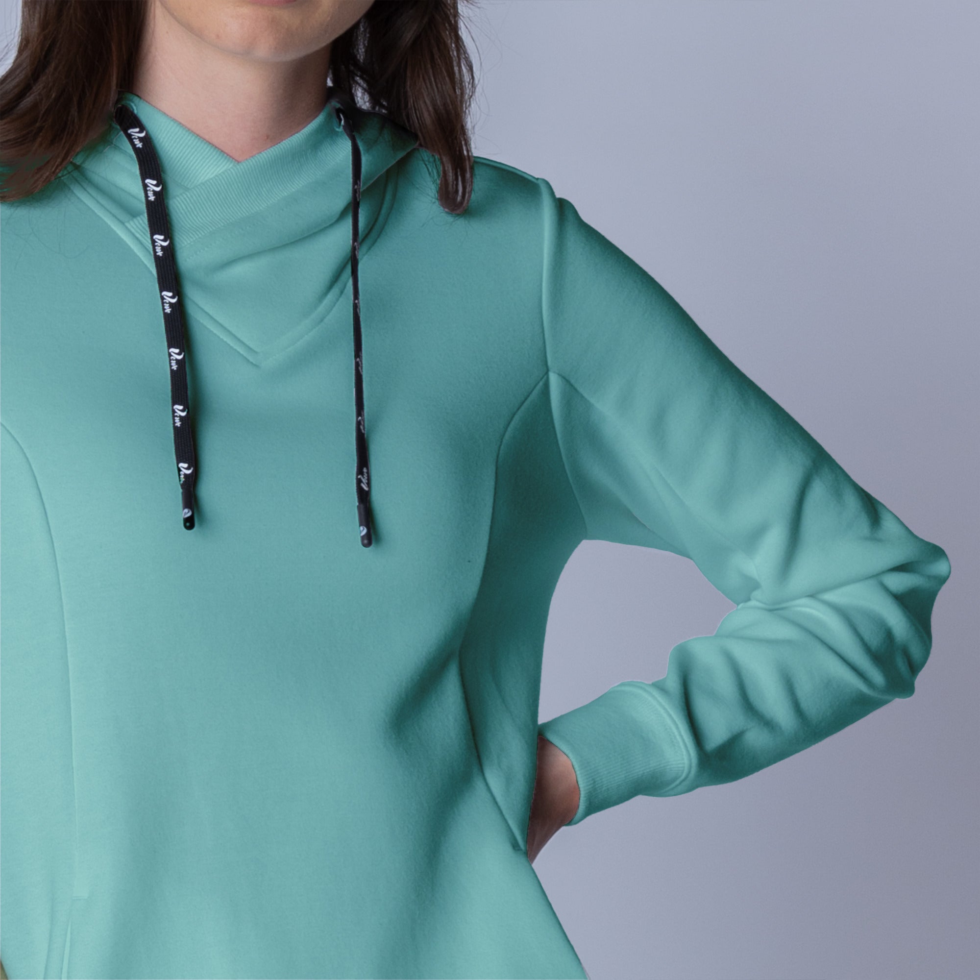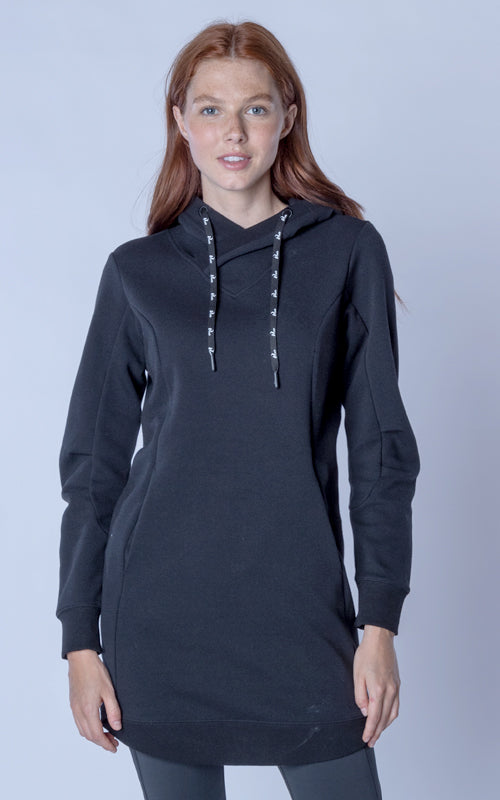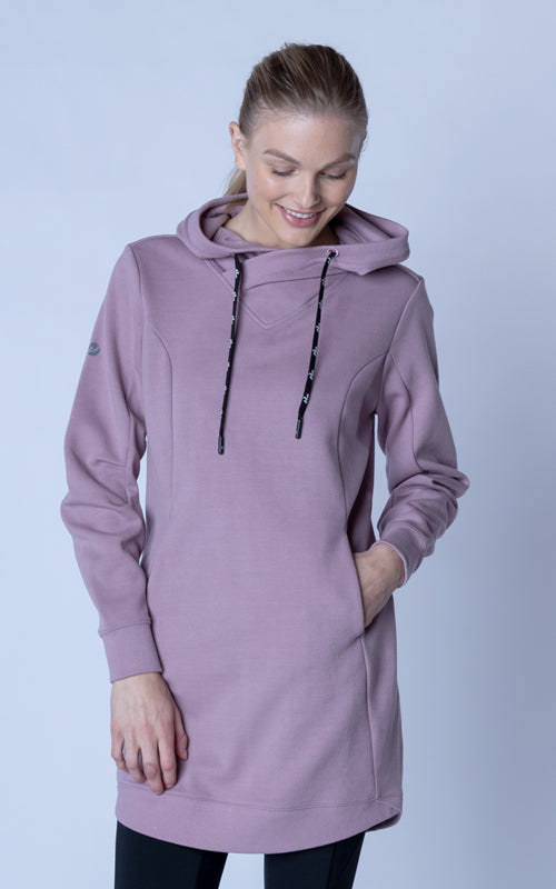 The Verve Cover Hoody is a unique fusion of comfort and contemporary style. This hoody dress is crafted from our new full-length interlock premium fleece, offering a luxurious feel and a flattering fit. The design features a raised crossover neckline and a fitted hood, enhanced with a Verve-branded drawcord for a personalized fit. Pleated sleeves add a sophisticated twist to the classic hoody silhouette, while side pockets provide convenient storage for your essentials. The ribbed hoodie opening ensures a snug feel, making this fleece dress an ideal choice for those looking for a stylish yet comfortable garment that stands out from the ordinary. Perfect for a relaxed day out or a cozy evening in, the Verve Cover Hoody blends classic casual with modern twists to elevate your wardrobe.