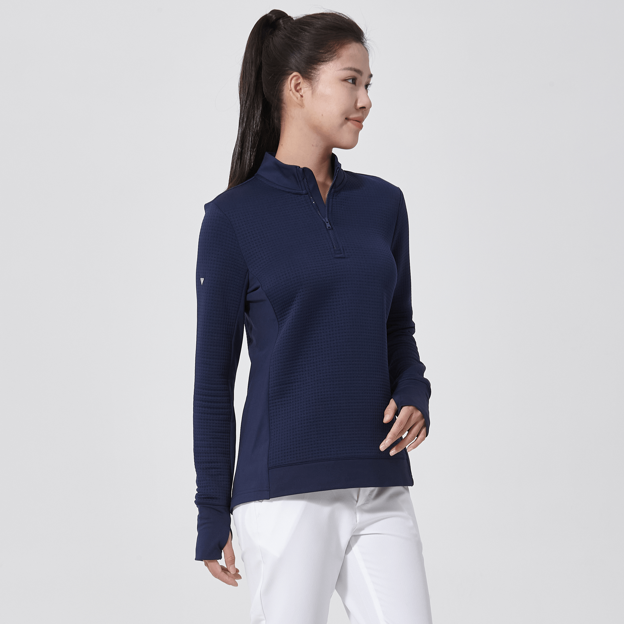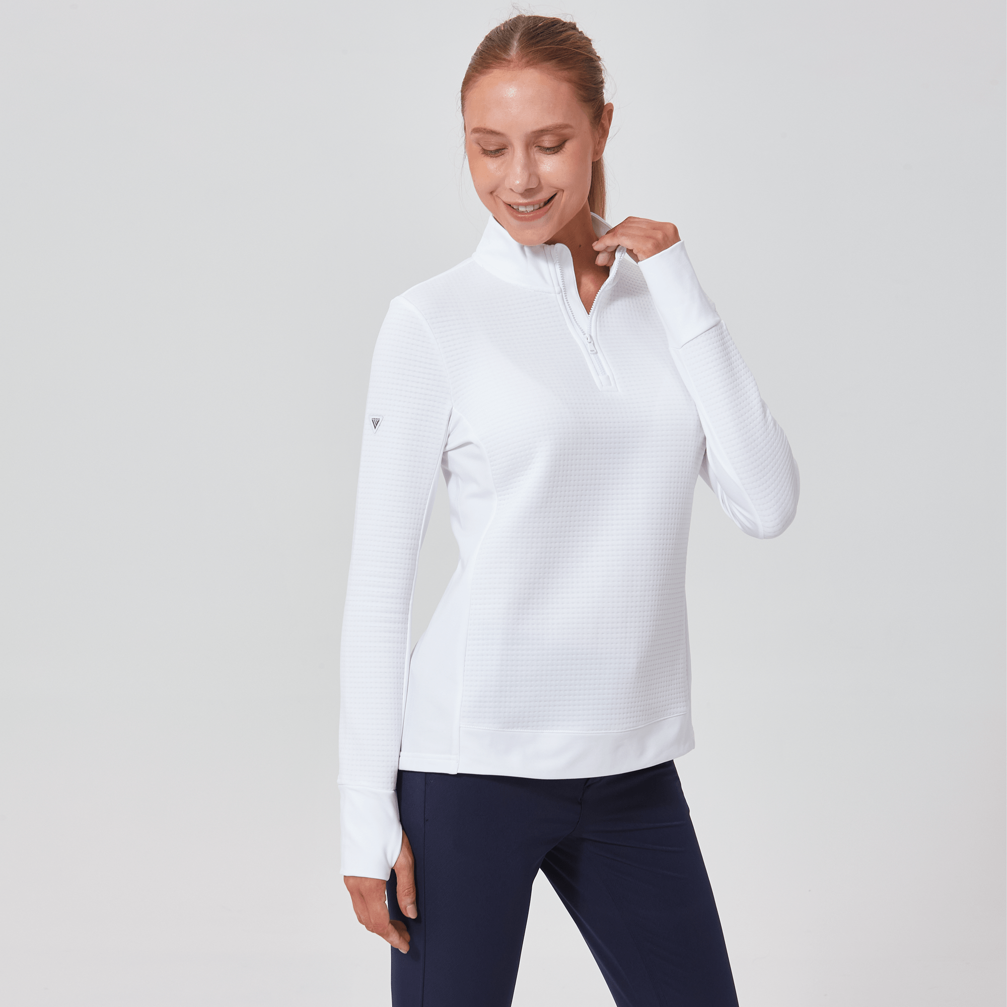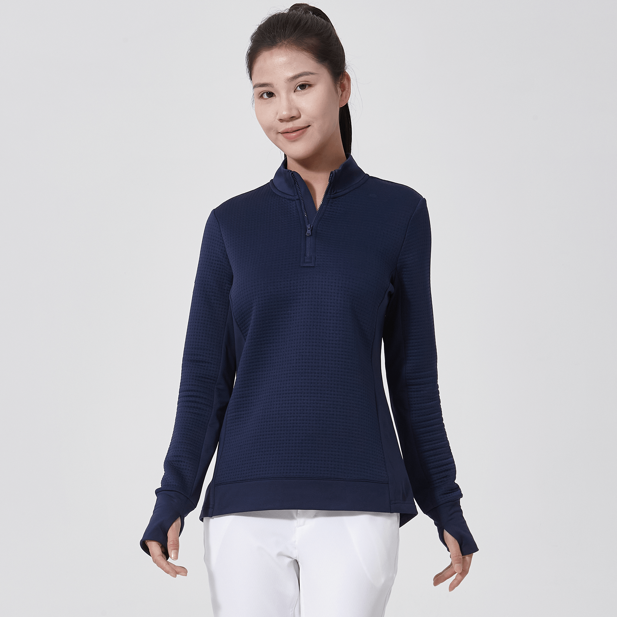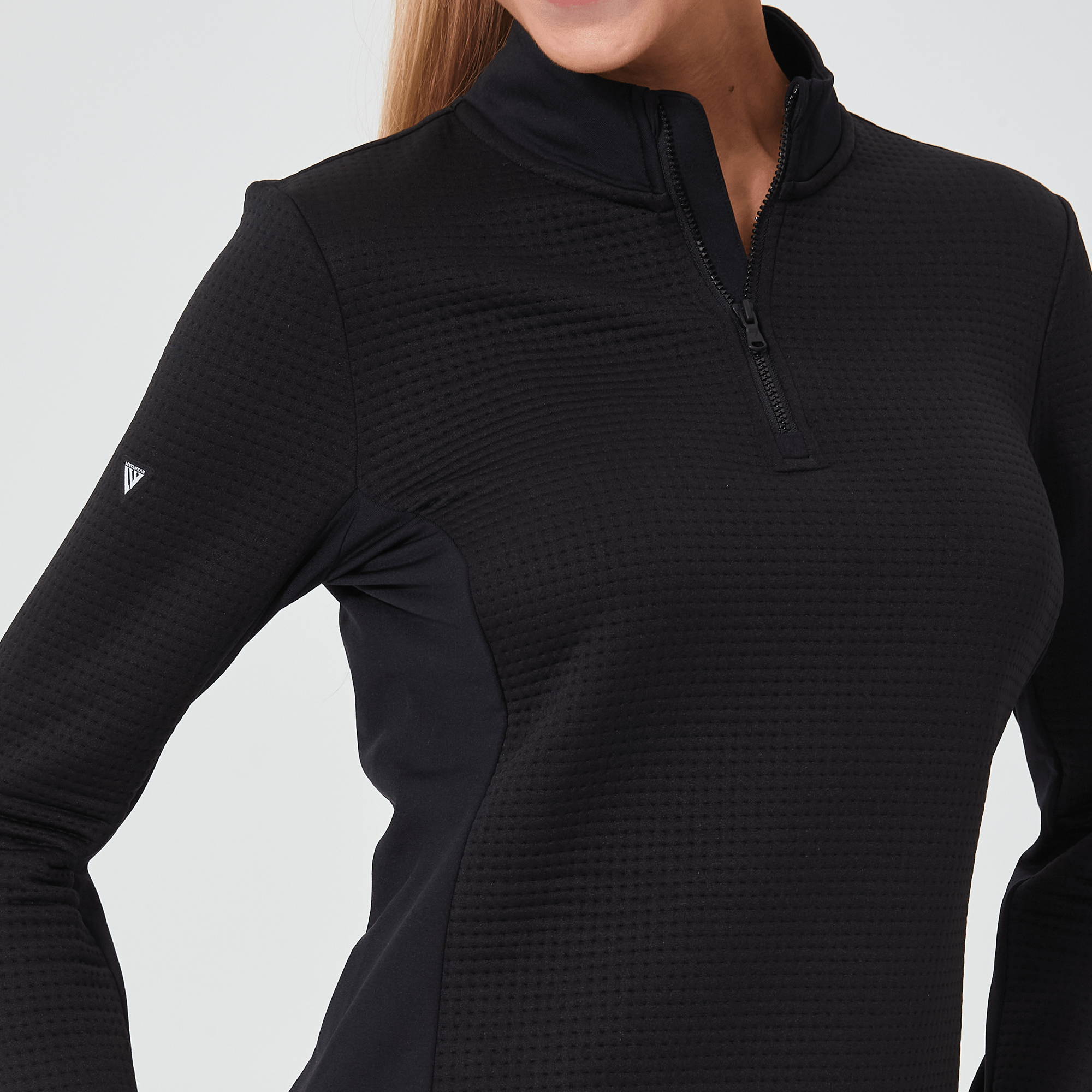 Meet the women's Cushion Quarter-Zip, meticulously crafted to meet the demands of active lifestyles. This top is made from 100% polyester jacquard fabric, which not only provides a unique texture but also brings essential performance features such as moisture-wicking to keep you dry, anti-static to reduce cling, and anti-pilling to ensure a smooth appearance over time. The quarter-zip design features a stand-up collar for adjustable coverage and style, while the thumbholes on the cuffs offer extra warmth and keep sleeves securely in place. Aesthetic contrasts in the solid collar, side panels, cuffs, and hem enhance the visual appeal and define the silhouette. Finished with a high-low hem for added coverage, the Cushion quarter-zip is an excellent choice for those seeking a functional yet stylish garment for outdoor activities, workouts, golf or casual wear.
