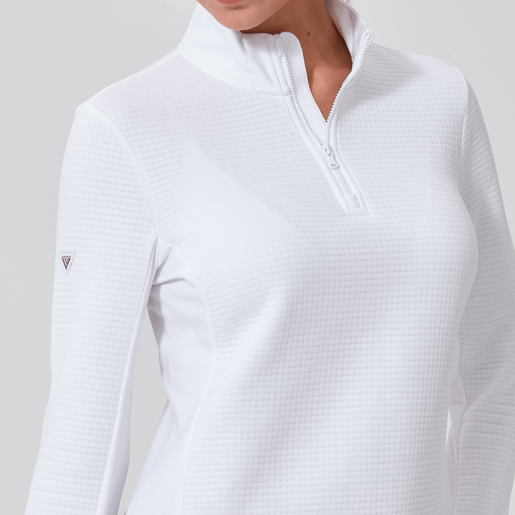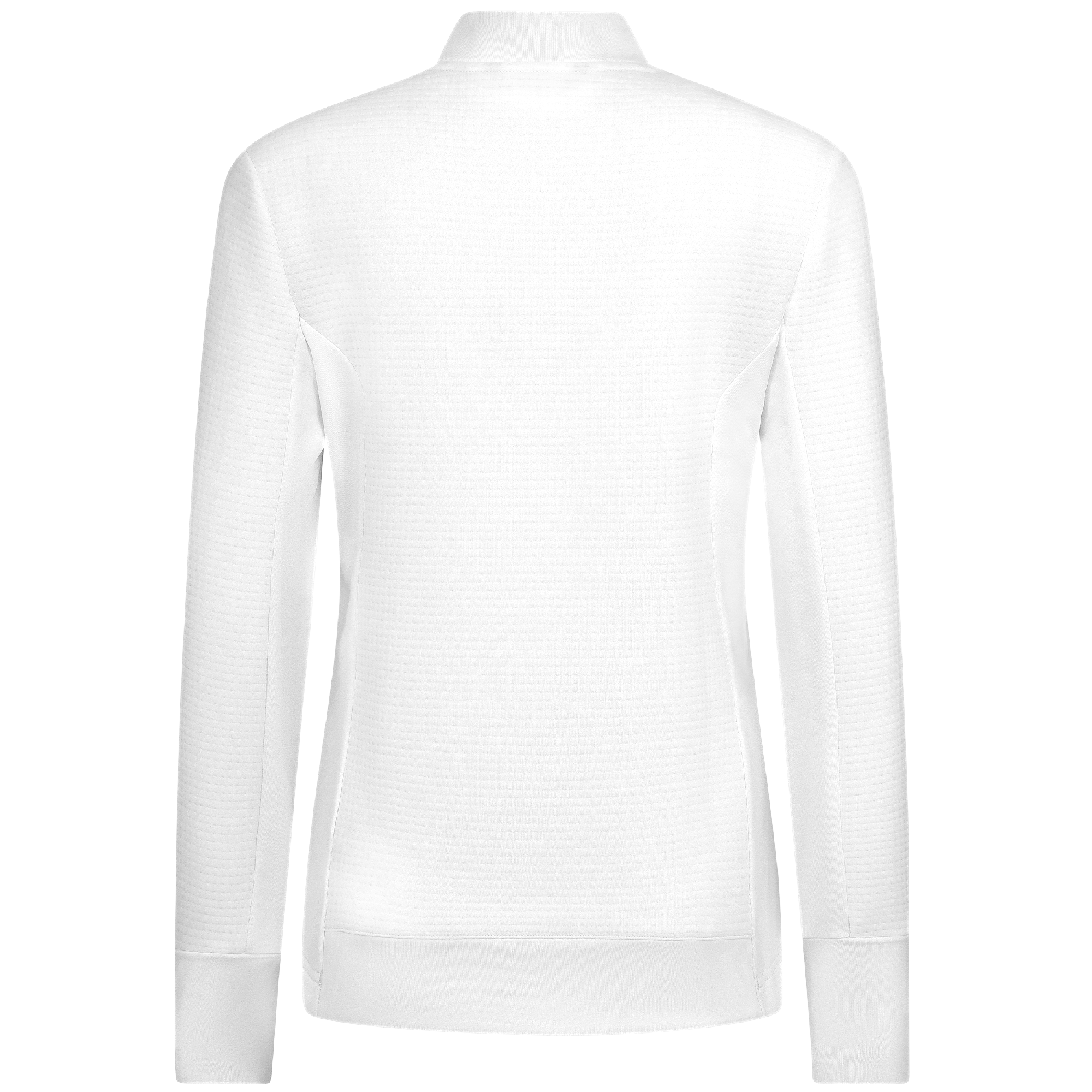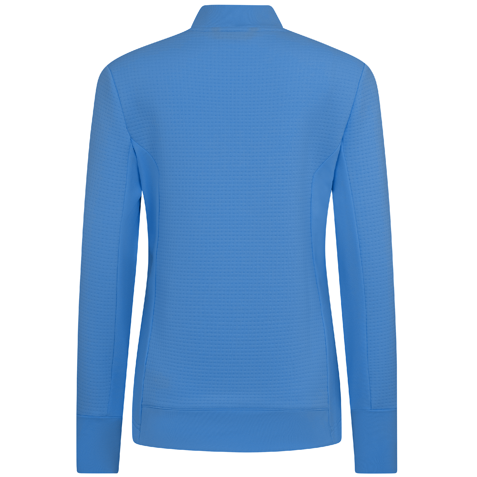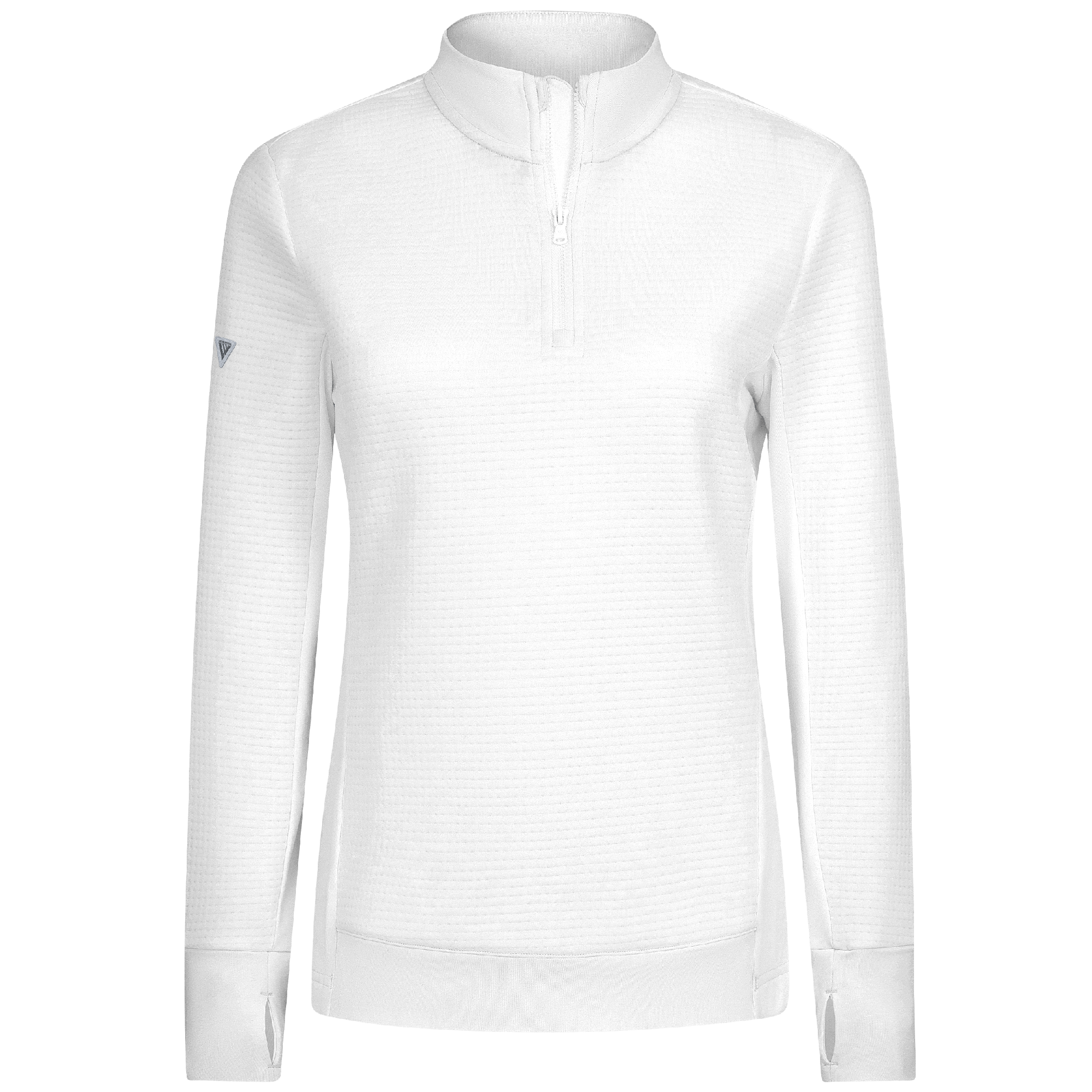 Meet the women's Cushion Quarter-Zip, meticulously crafted to meet the demands of active lifestyles. This top is made from 100% polyester jacquard fabric, which not only provides a unique texture but also brings essential performance features such as moisture-wicking to keep you dry, anti-static to reduce cling, and anti-pilling to ensure a smooth appearance over time. The quarter-zip design features a stand-up collar for adjustable coverage and style, while the thumbholes on the cuffs offer extra warmth and keep sleeves securely in place. Aesthetic contrasts in the solid collar, side panels, cuffs, and hem enhance the visual appeal and define the silhouette. Finished with a high-low hem for added coverage, the Cushion quarter-zip is an excellent choice for those seeking a functional yet stylish garment for outdoor activities, workouts, golf or casual wear.
