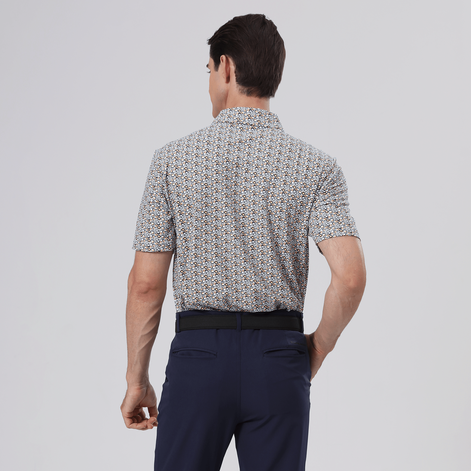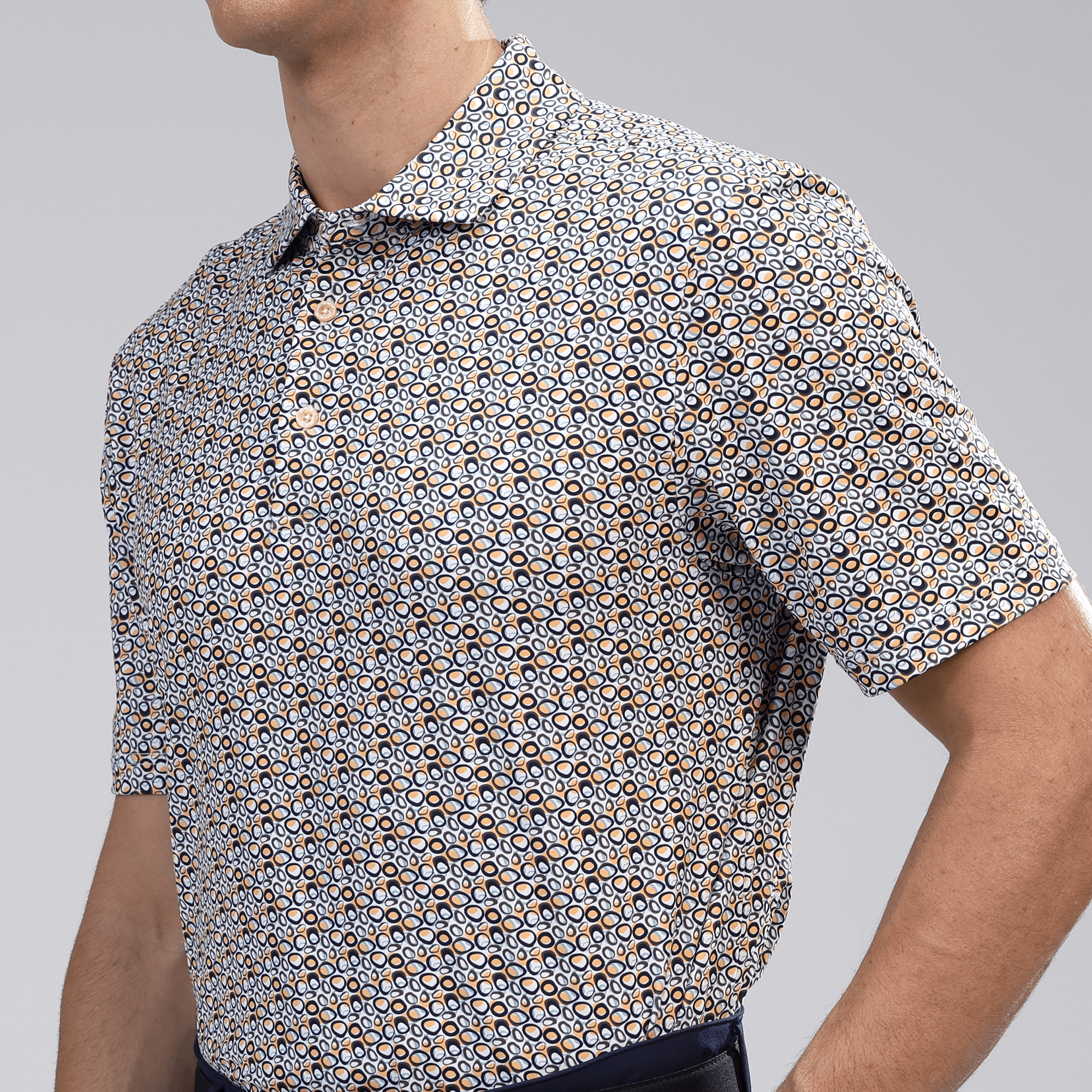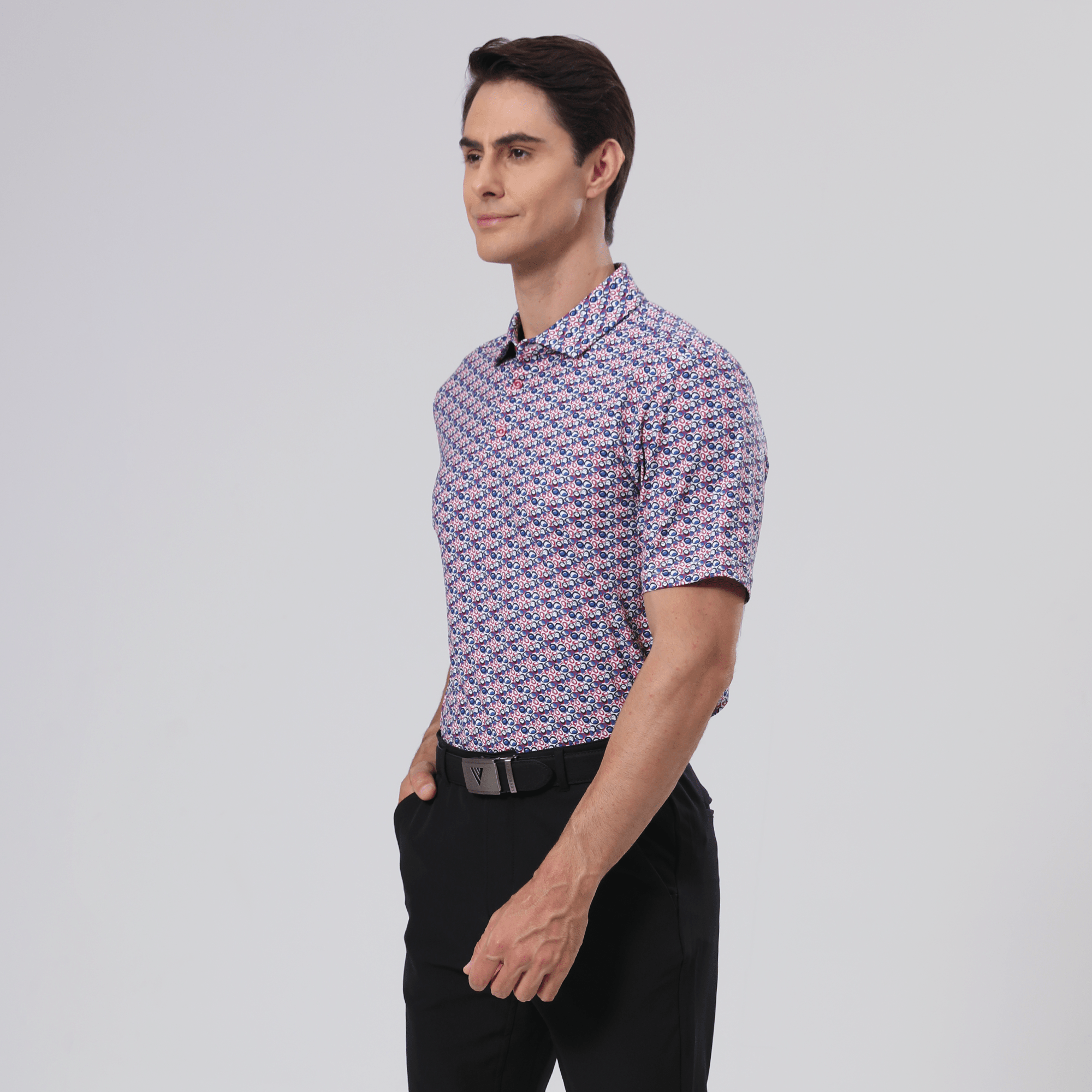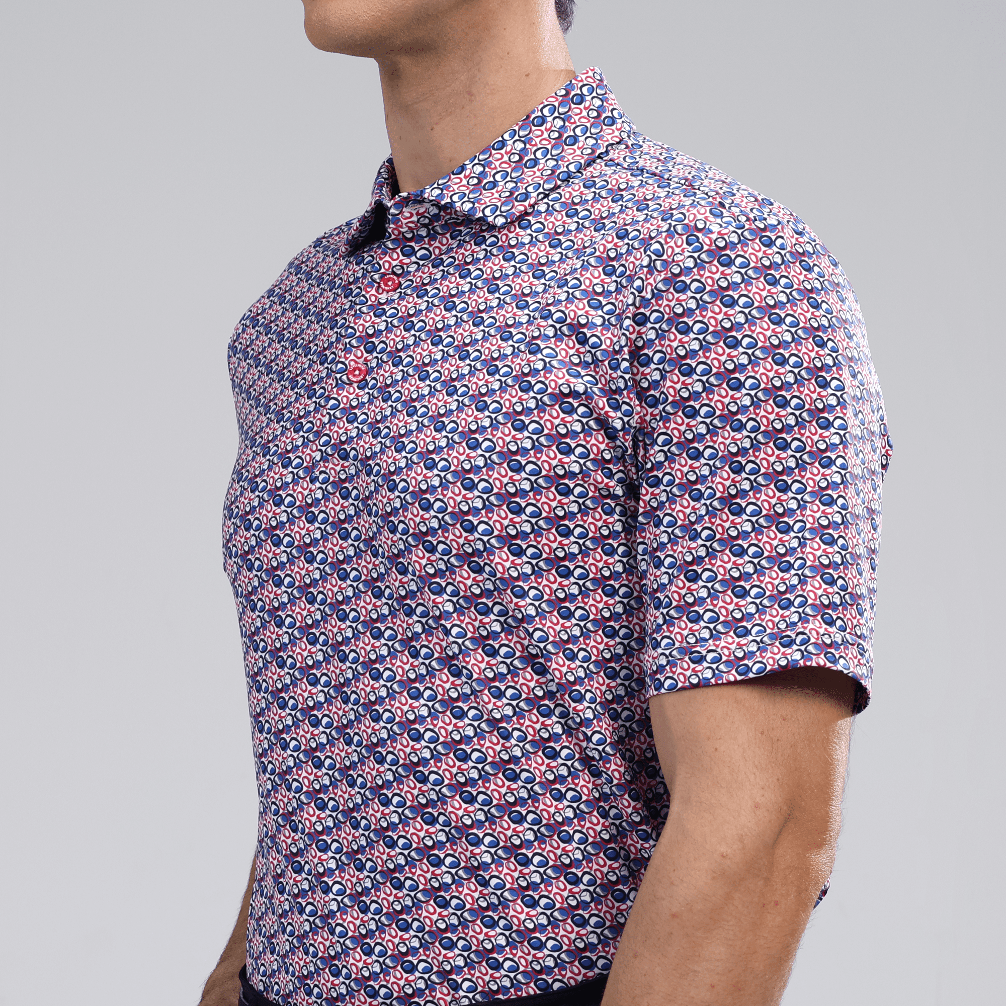 Make a striking impression on the golf course with the men's Dazzle polo, where functionality meets bold design. Crafted from a blend of 93% polyester and 7% spandex, this polo is tailored for those who demand high performance and style. It features UPF 50+ protection to shield you from the sun's harsh rays and incorporates moisture-wicking technology to ensure you remain dry and comfortable throughout your game. The self-fabric collar with a built-in collar stay keeps the polo looking sharp, while the high-low hem detail with side slits allows for greater freedom of movement during your swing. The vibrant all-over print ensures you stand out in style, making the Dazzle polo a perfect choice for golfers looking to elevate their wardrobe on the greens.
