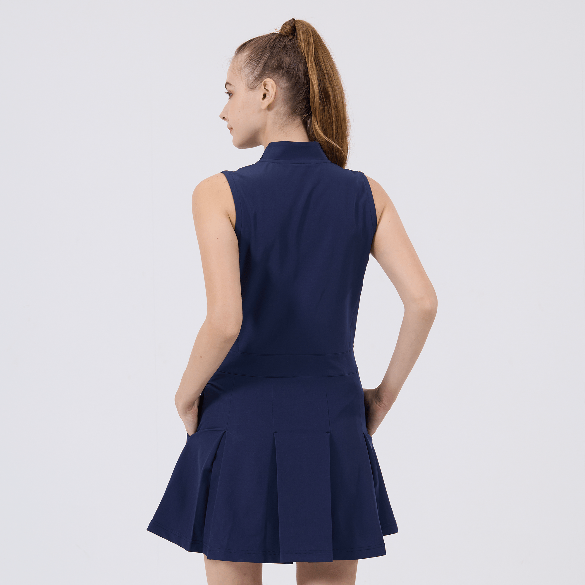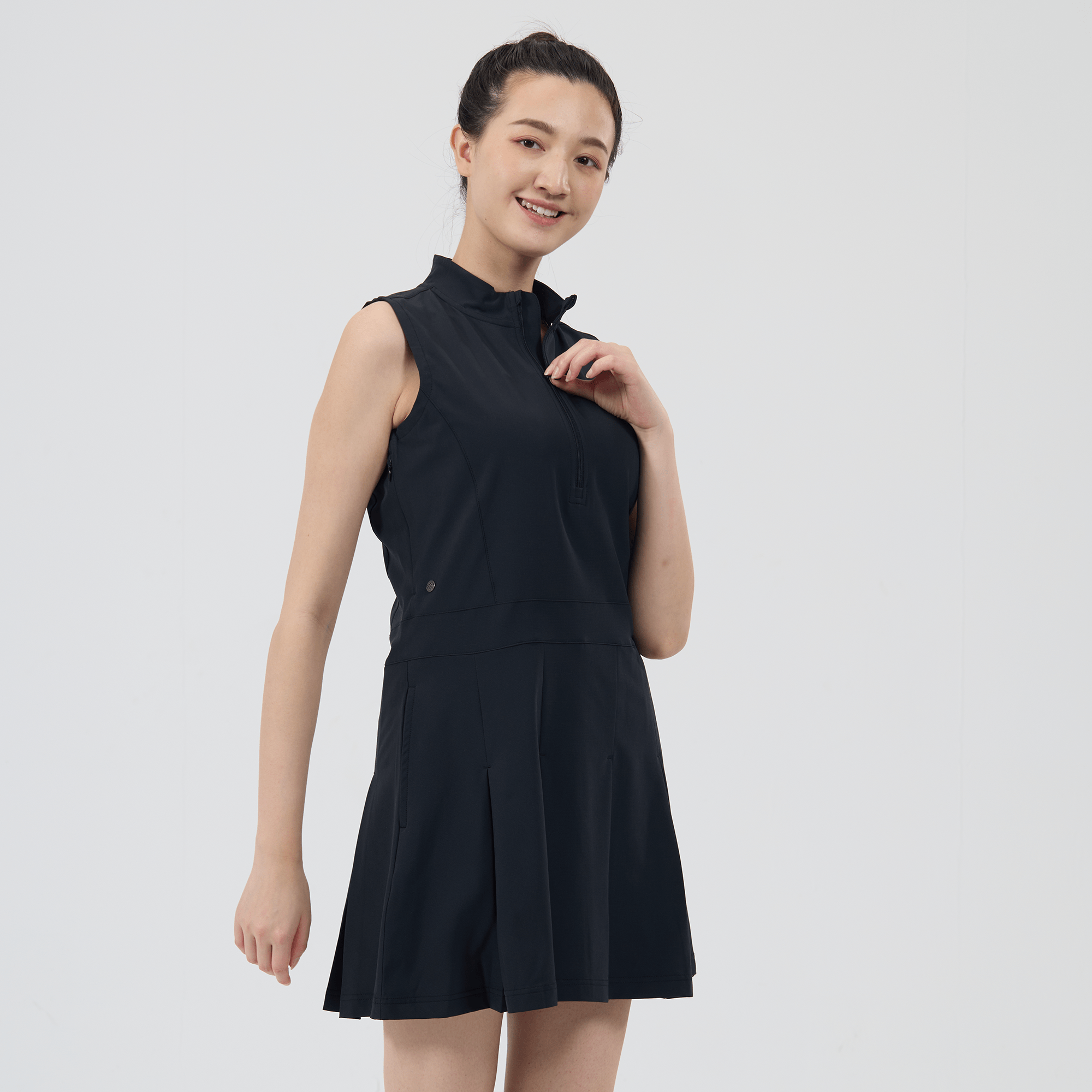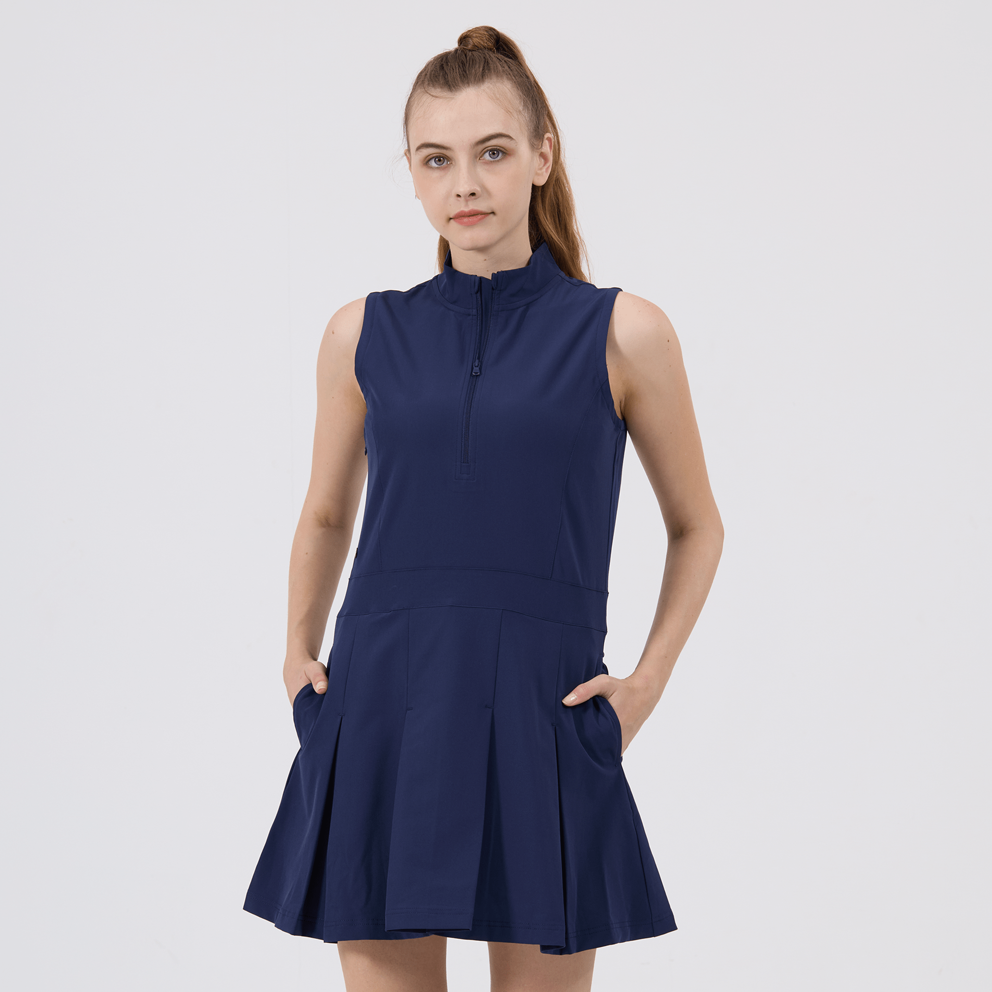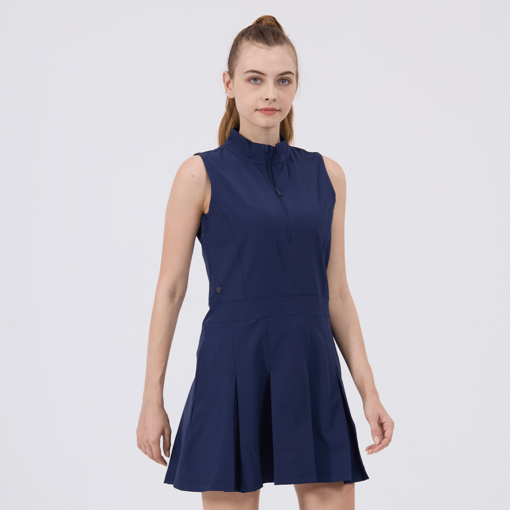 Arrive in style and confidence to the golf course with the women's Deluxe dress, designed to offer both fashion and functionality for the modern golfer. Made from a blend of 92% polyester and 8% spandex, this dress combines flexibility and comfort with moisture-wicking technology to keep you dry and anti-static properties to ensure a smooth, cling-free experience. The quarter-zip with a stand-up collar allows for adjustable coverage, while the side seam pockets provide convenient storage for small essentials. Unique to this design is the box pleat skirt which conceals hidden shorts, offering the elegance of a dress with the practicality and coverage of shorts underneath. Ideal for a sunny day on the greens, the Deluxe dress marries performance and style, making it a perfect addition to your golfing wardrobe.