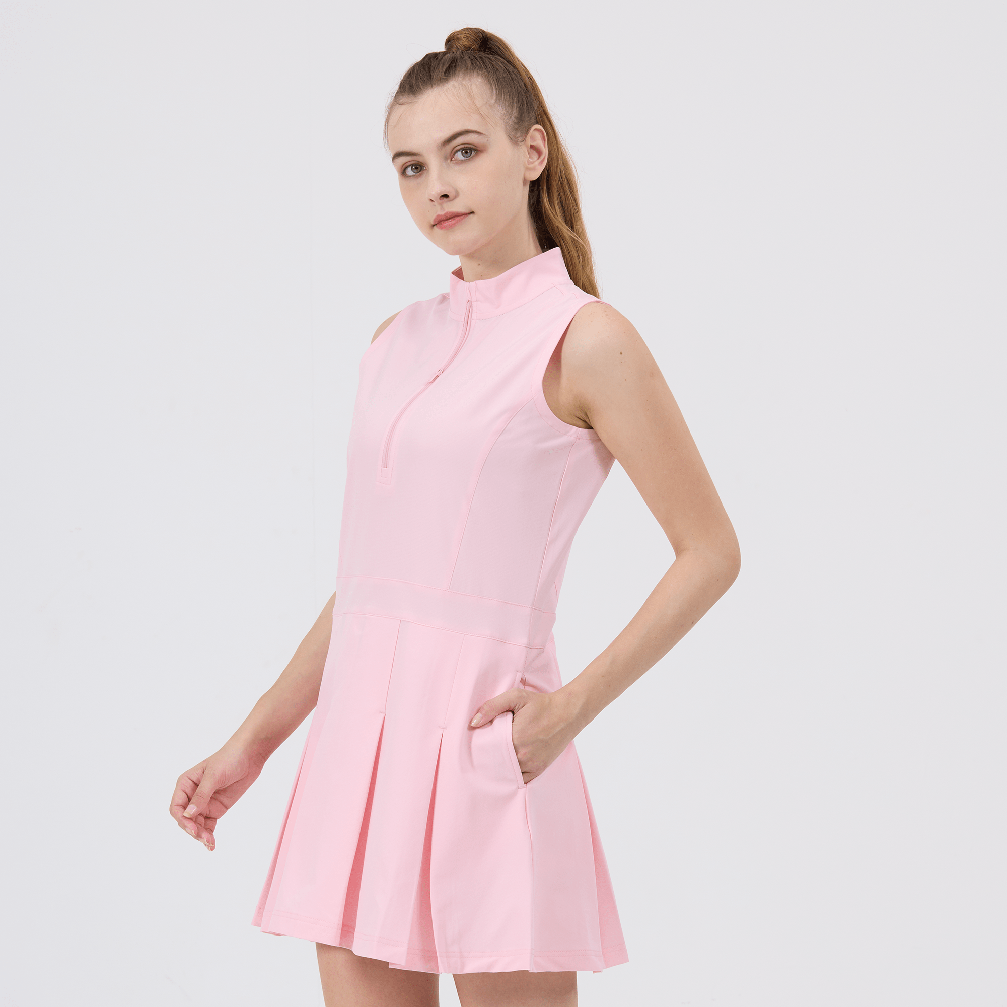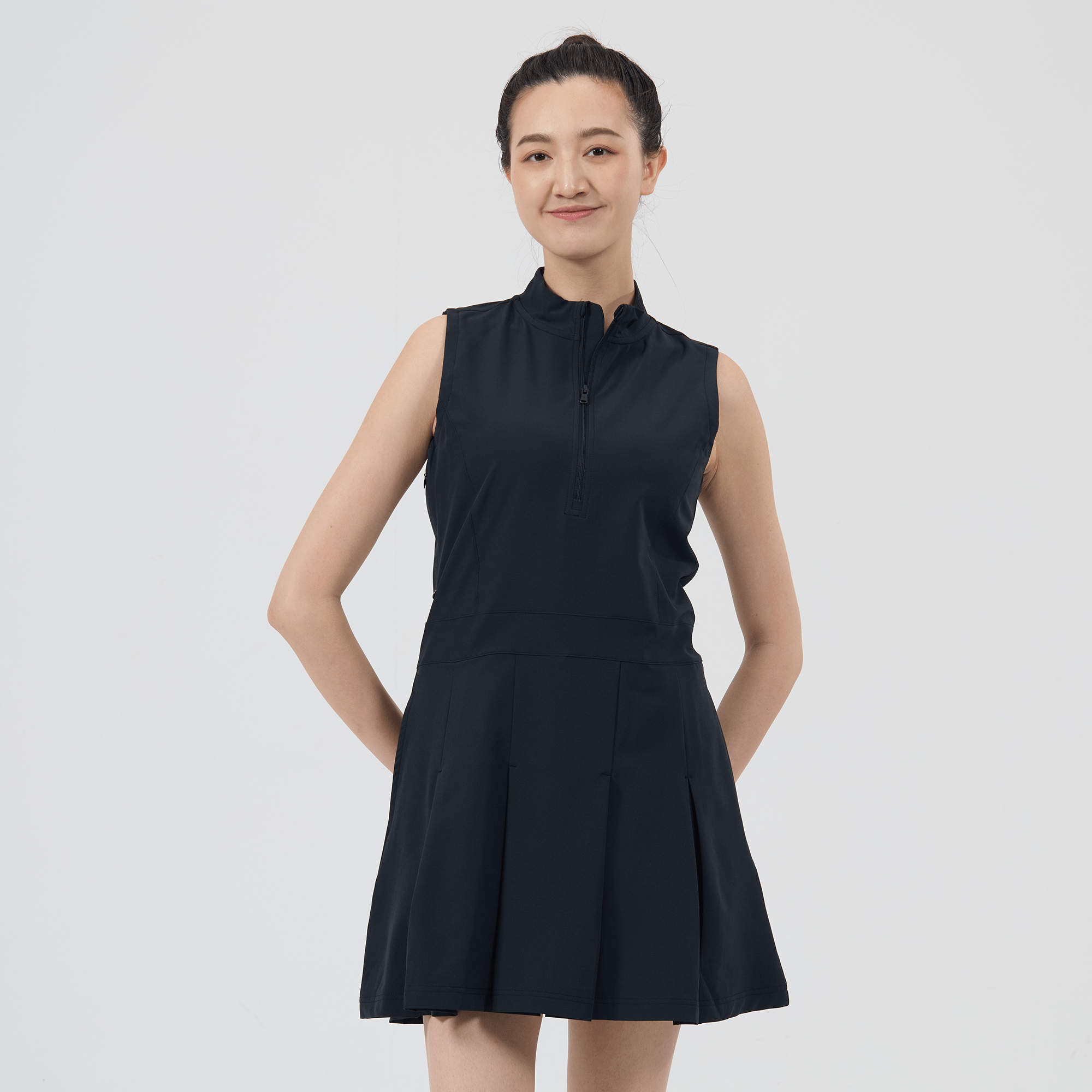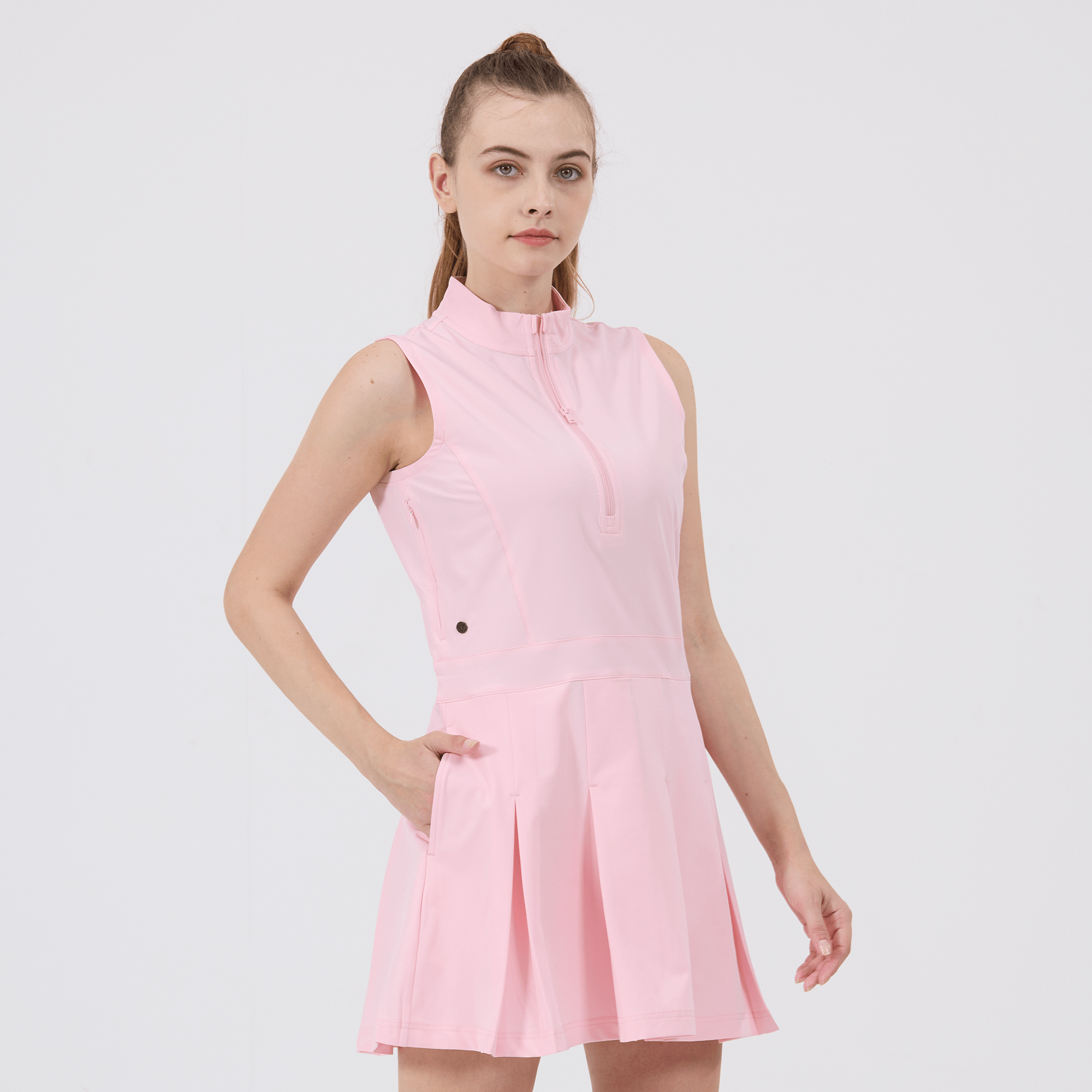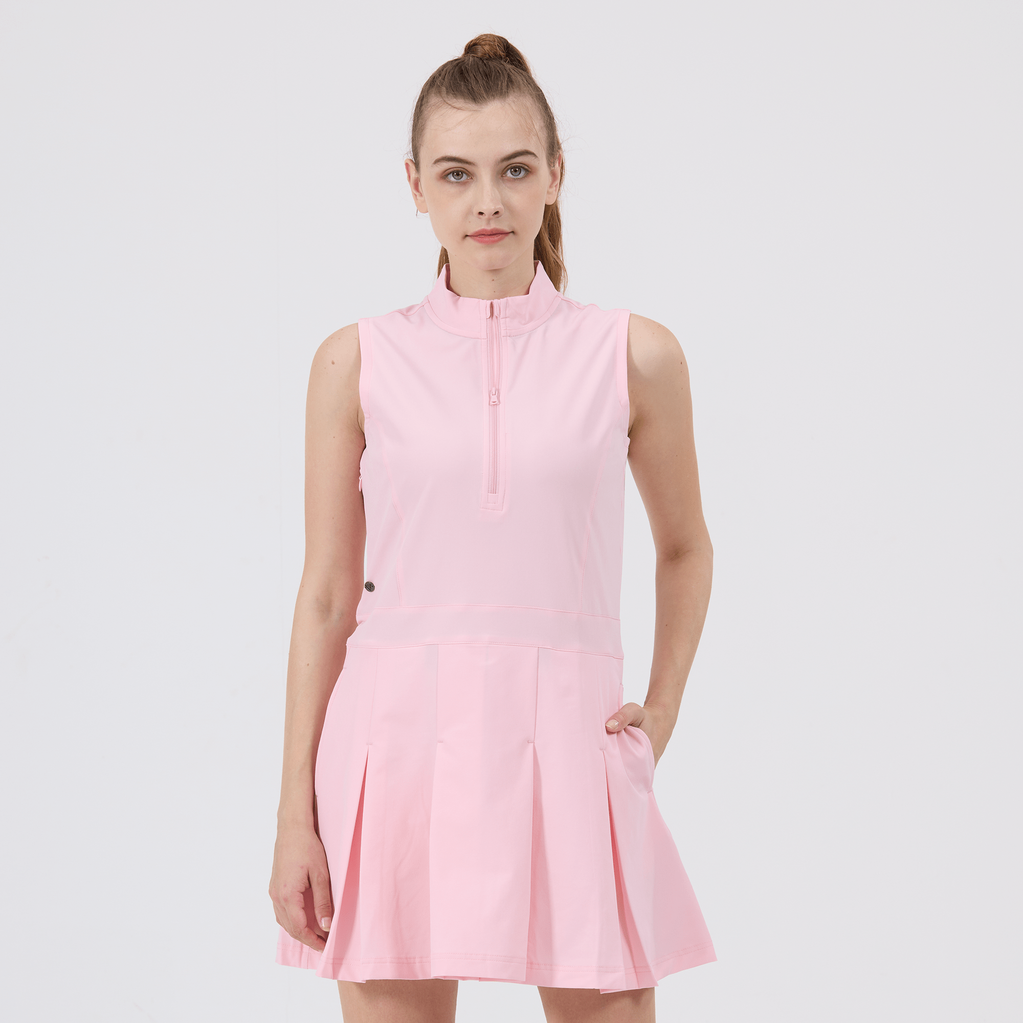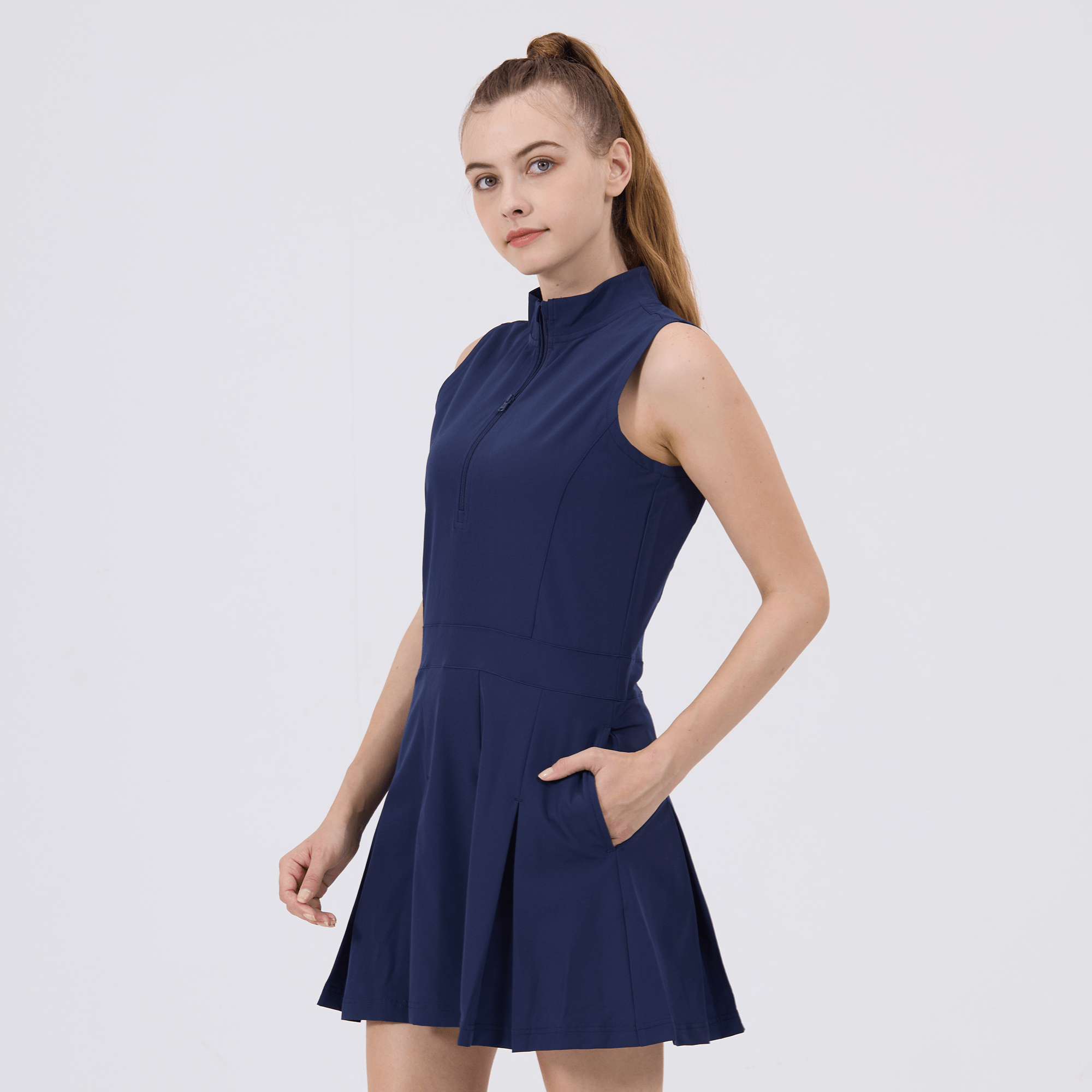 Arrive in style and confidence to the golf course with the women's Deluxe dress, designed to offer both fashion and functionality for the modern golfer. Made from a blend of 92% polyester and 8% spandex, this dress combines flexibility and comfort with moisture-wicking technology to keep you dry and anti-static properties to ensure a smooth, cling-free experience. The quarter-zip with a stand-up collar allows for adjustable coverage, while the side seam pockets provide convenient storage for small essentials. Unique to this design is the box pleat skirt which conceals hidden shorts, offering the elegance of a dress with the practicality and coverage of shorts underneath. Ideal for a sunny day on the greens, the Deluxe dress marries performance and style, making it a perfect addition to your golfing wardrobe.