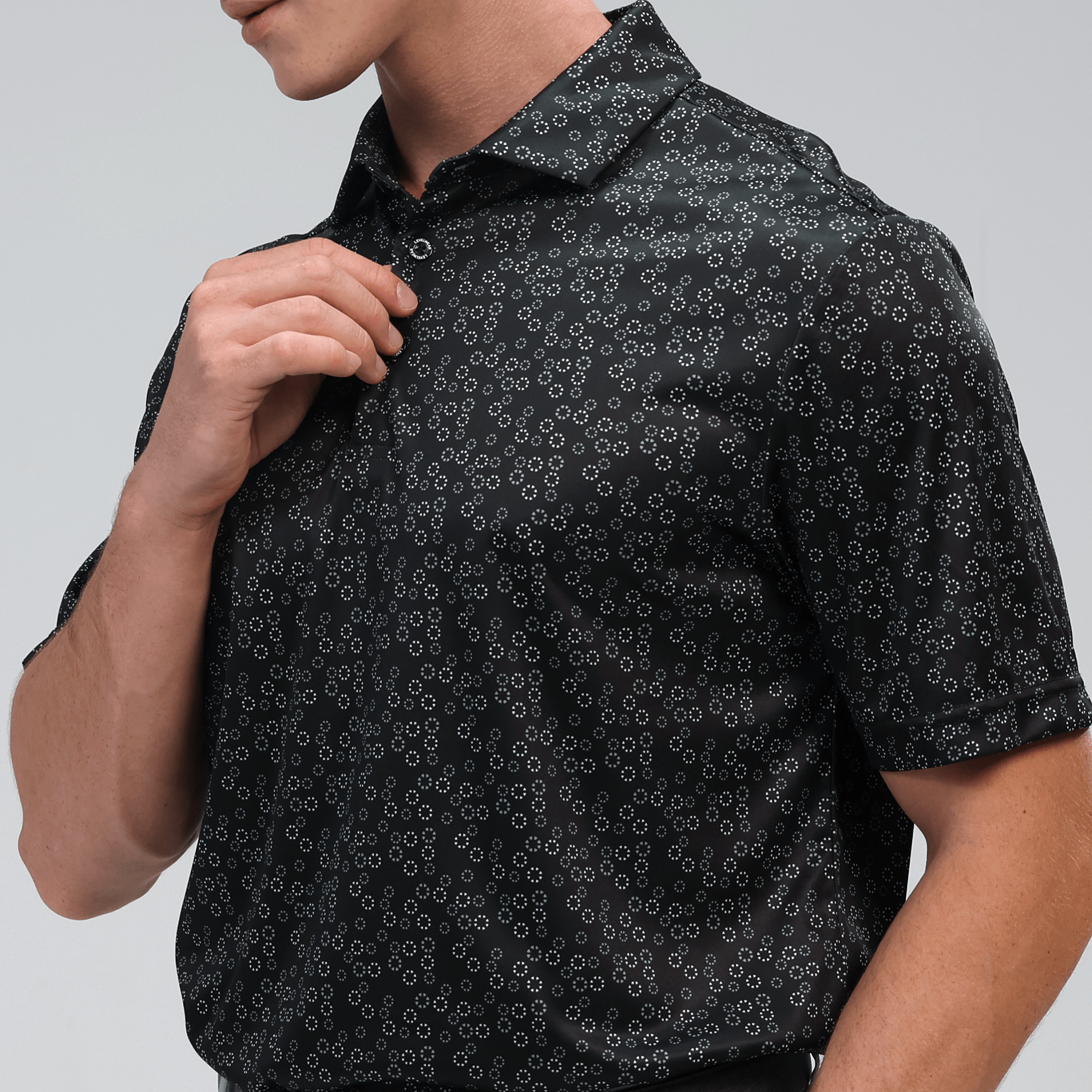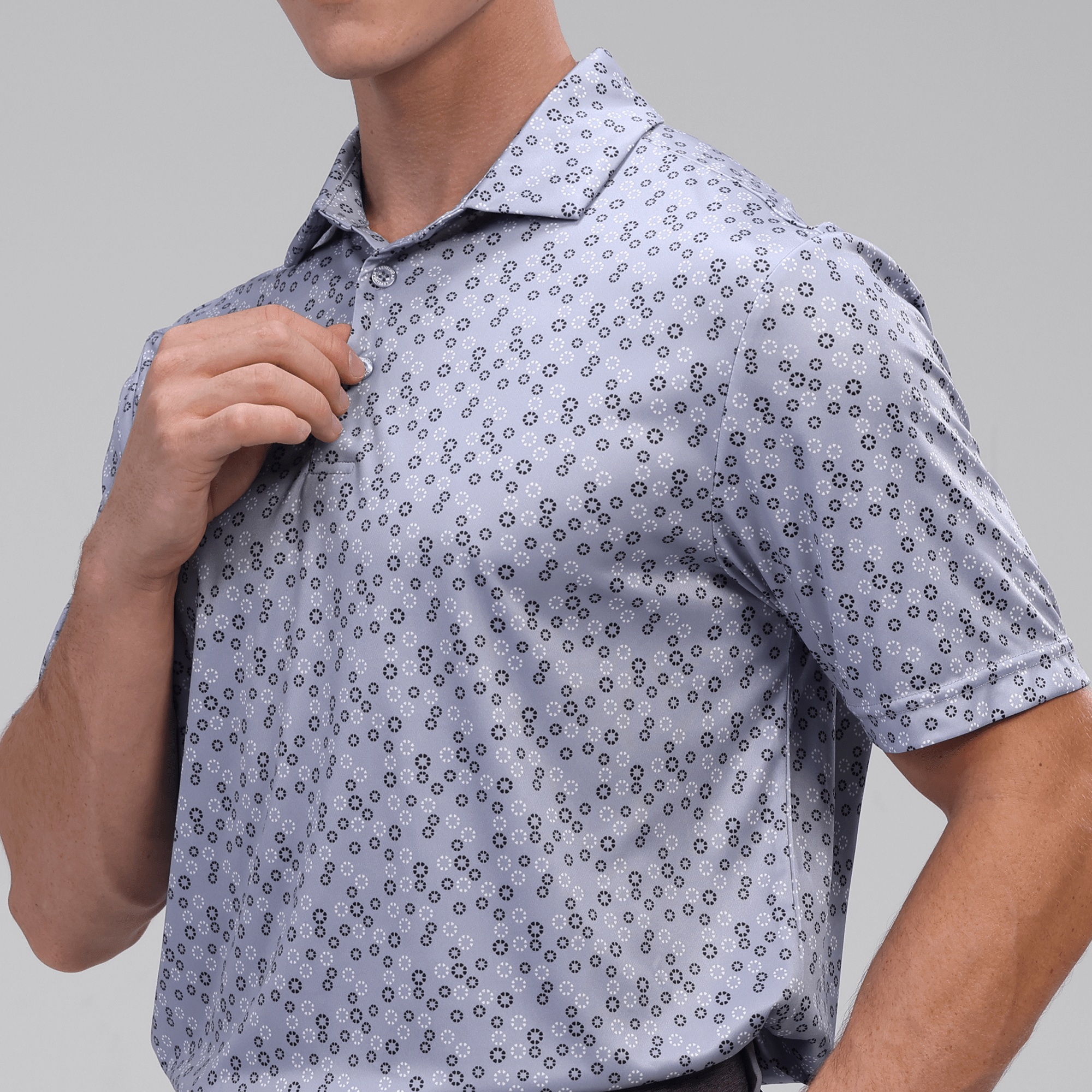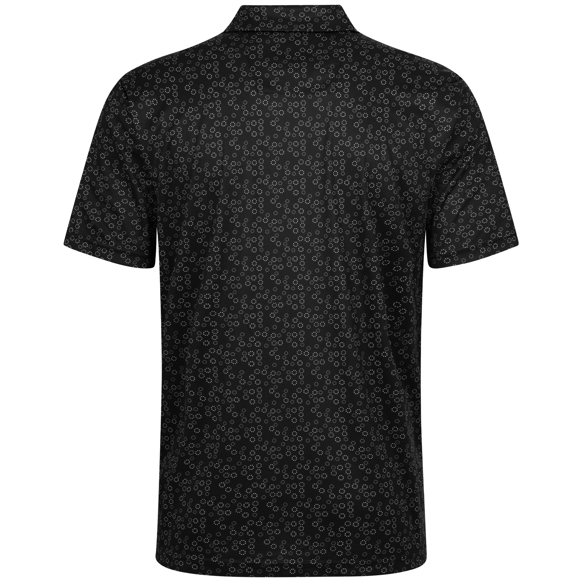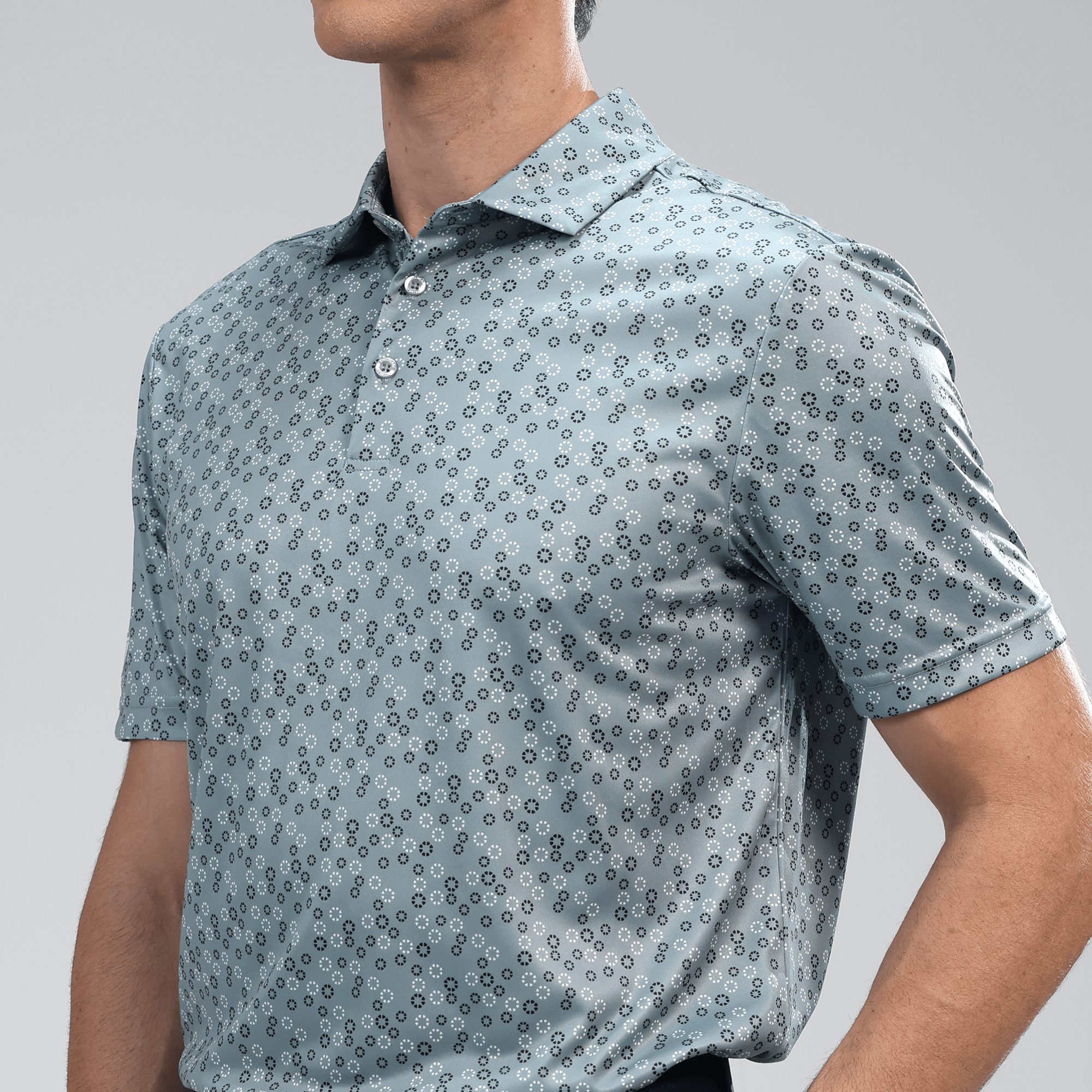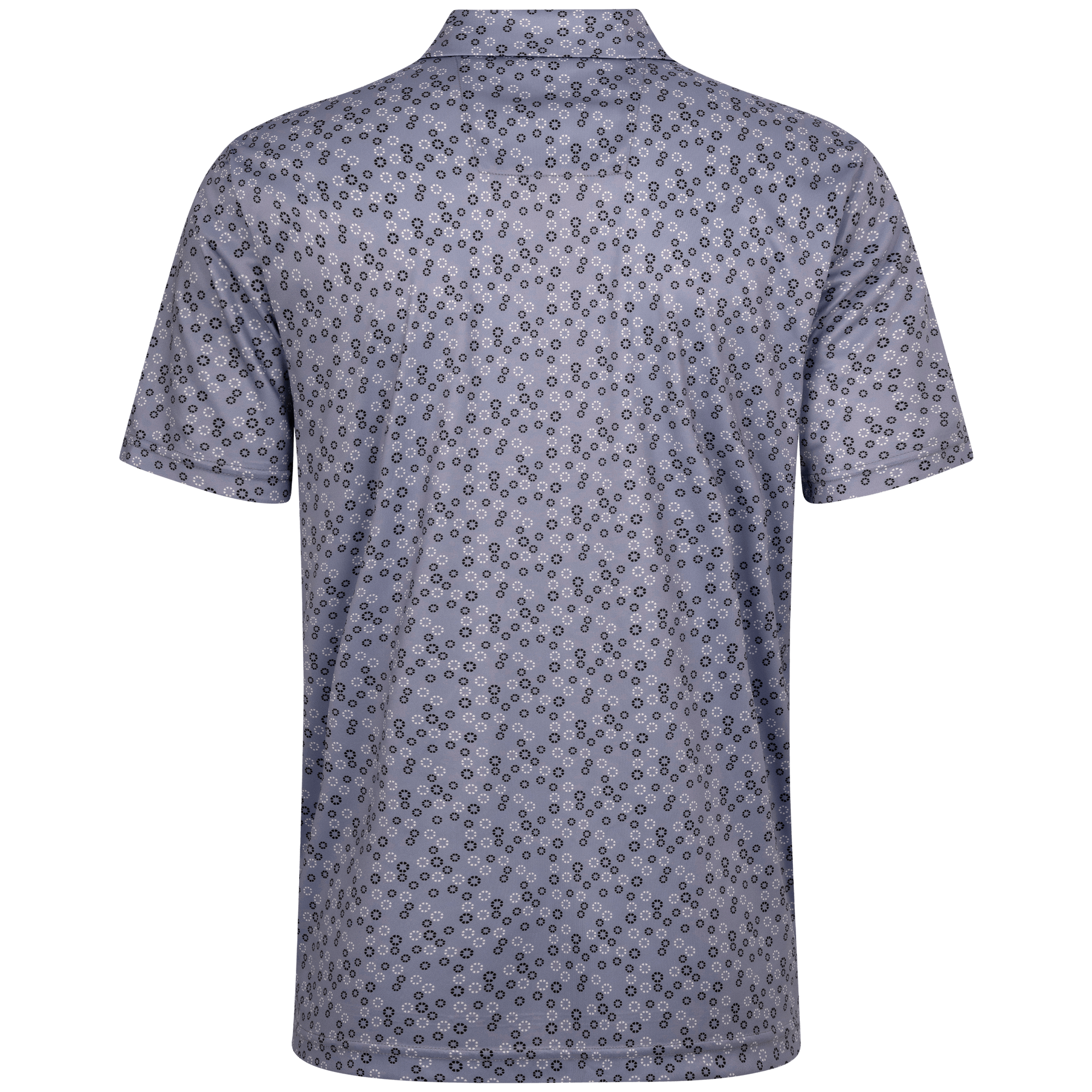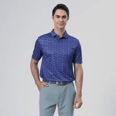 The men's Frost polo is expertly crafted for golfers who demand performance and style on the course. Made from 100% recycled polyester, this polo features advanced moisture-wicking technology that efficiently pulls sweat away from the skin, keeping you cool and dry during your game. The self-fabric collar, equipped with a built-in collar stay, ensures a polished look throughout your swing. Forward shoulder seams provide an enhanced range of motion, allowing for unrestricted movement, while the high-low hem detail with side slits adds a modern touch and extra flexibility. The all-over print lends a unique and stylish flair, making the Frost polo not just functional but also a standout piece in your golf wardrobe. Whether you're teeing off or enjoying a casual day out, this polo combines eco-friendly materials with thoughtful design to keep you looking sharp and feeling great.