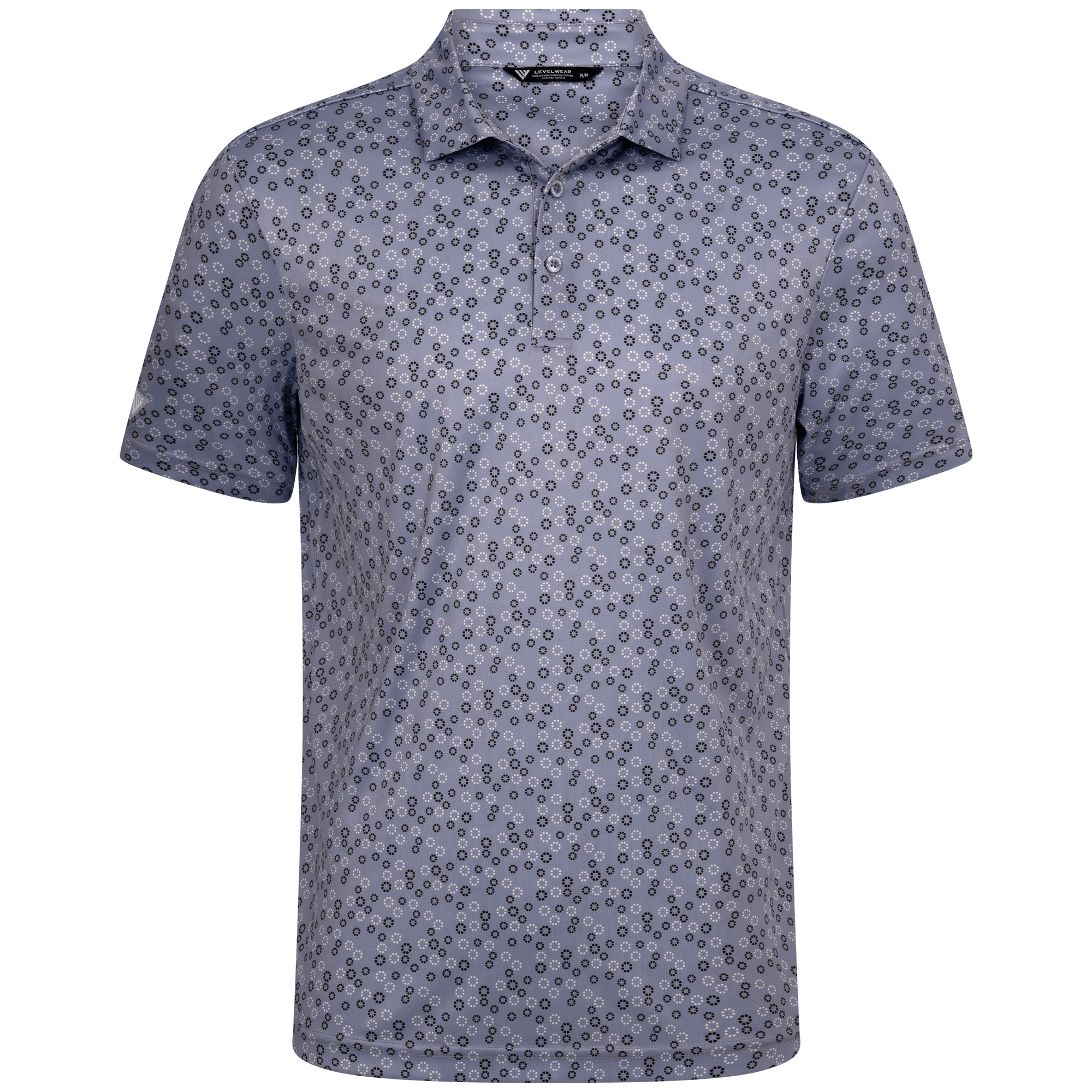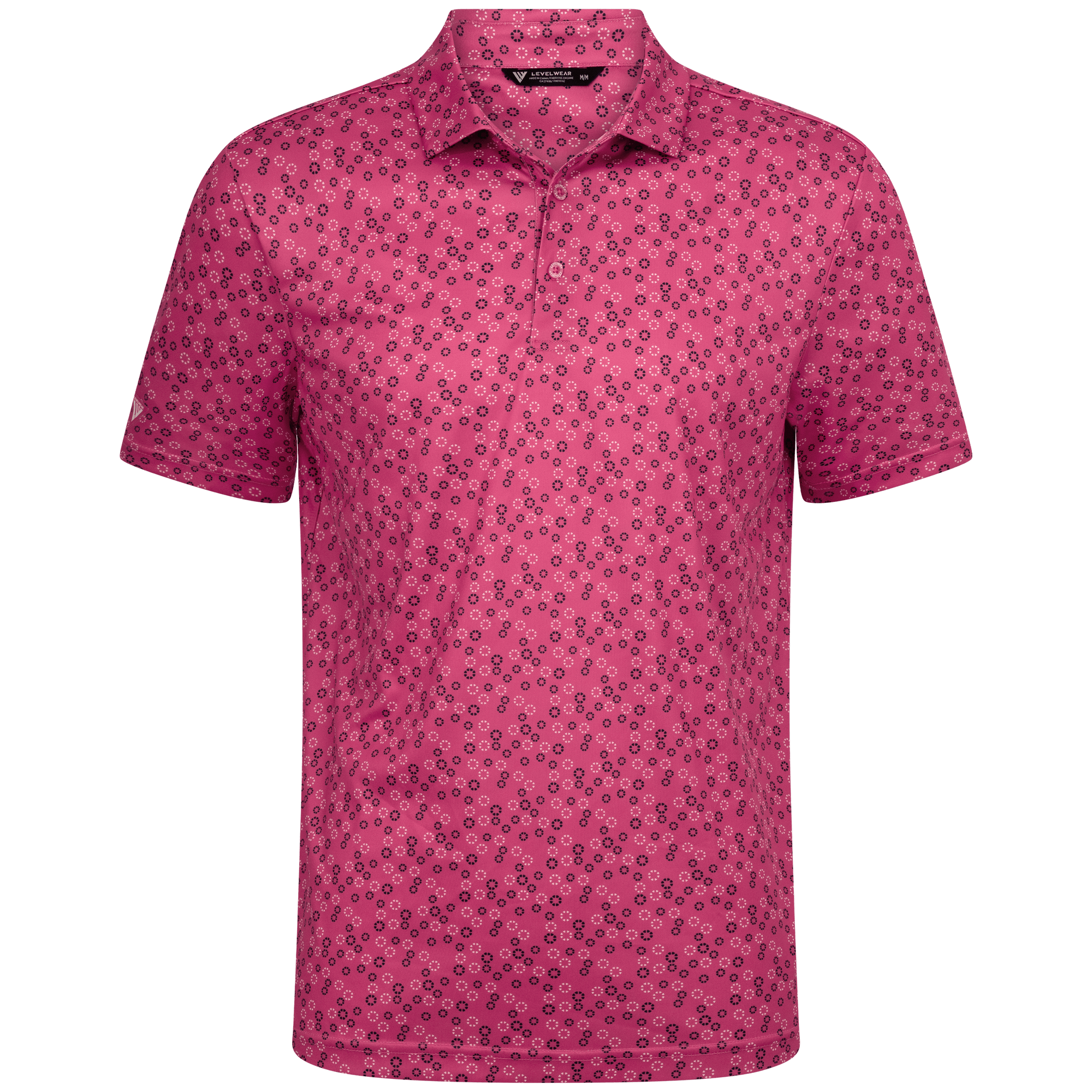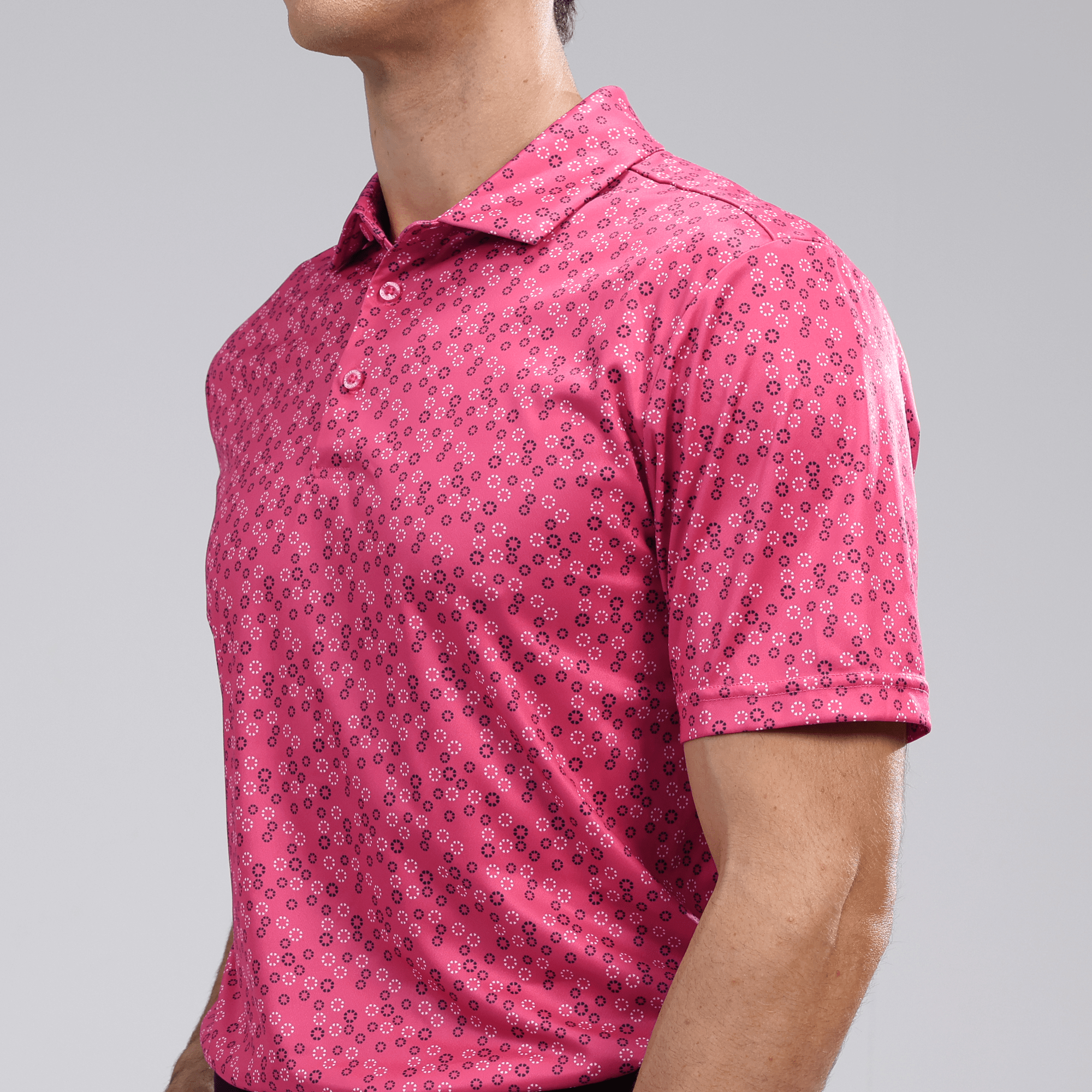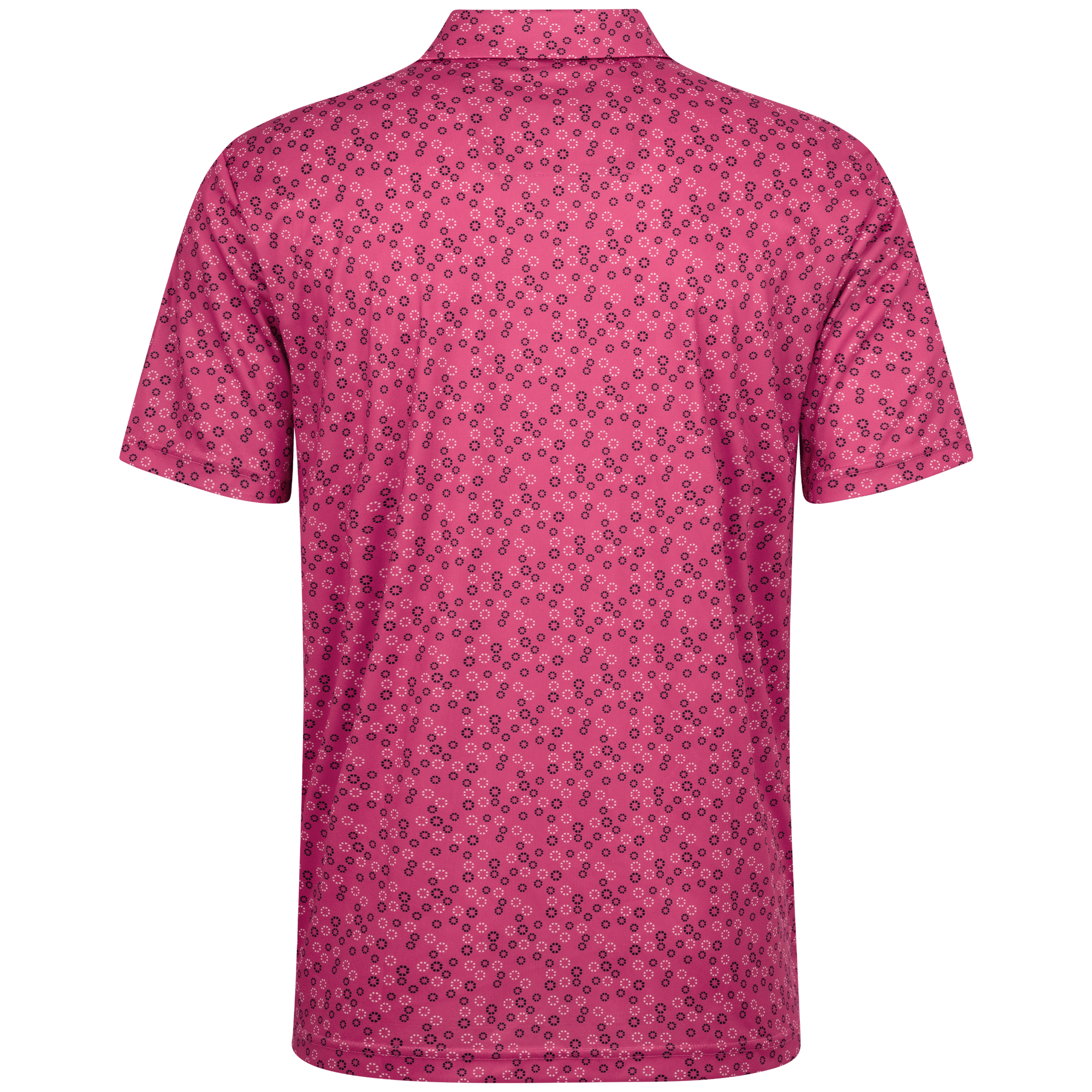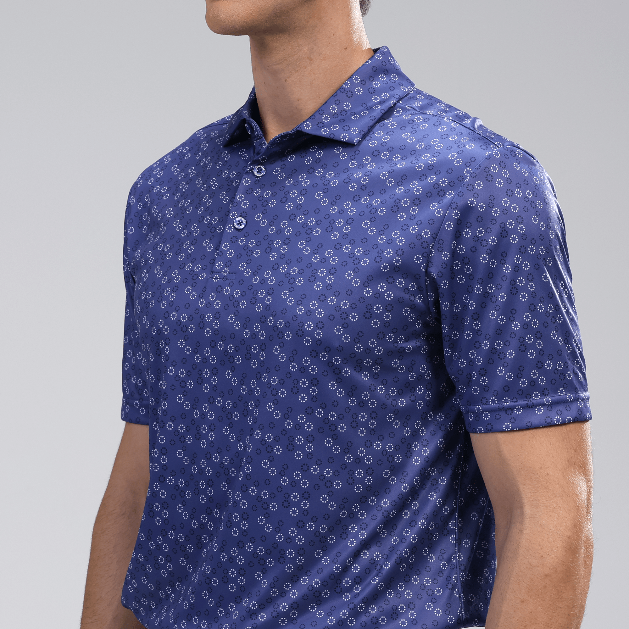 The men's Frost polo is expertly crafted for golfers who demand performance and style on the course. Made from 100% recycled polyester, this polo features advanced moisture-wicking technology that efficiently pulls sweat away from the skin, keeping you cool and dry during your game. The self-fabric collar, equipped with a built-in collar stay, ensures a polished look throughout your swing. Forward shoulder seams provide an enhanced range of motion, allowing for unrestricted movement, while the high-low hem detail with side slits adds a modern touch and extra flexibility. The all-over print lends a unique and stylish flair, making the Frost polo not just functional but also a standout piece in your golf wardrobe. Whether you're teeing off or enjoying a casual day out, this polo combines eco-friendly materials with thoughtful design to keep you looking sharp and feeling great.