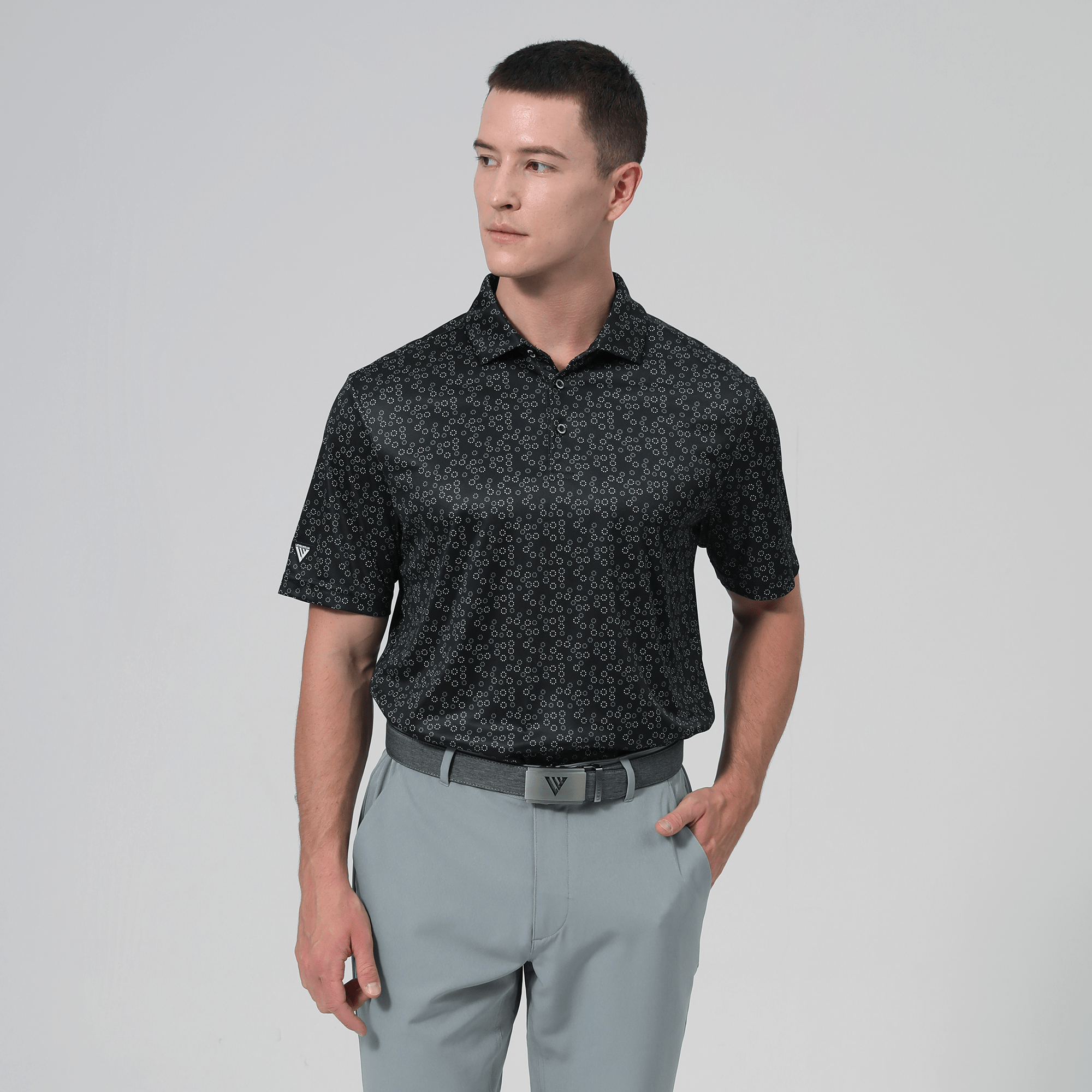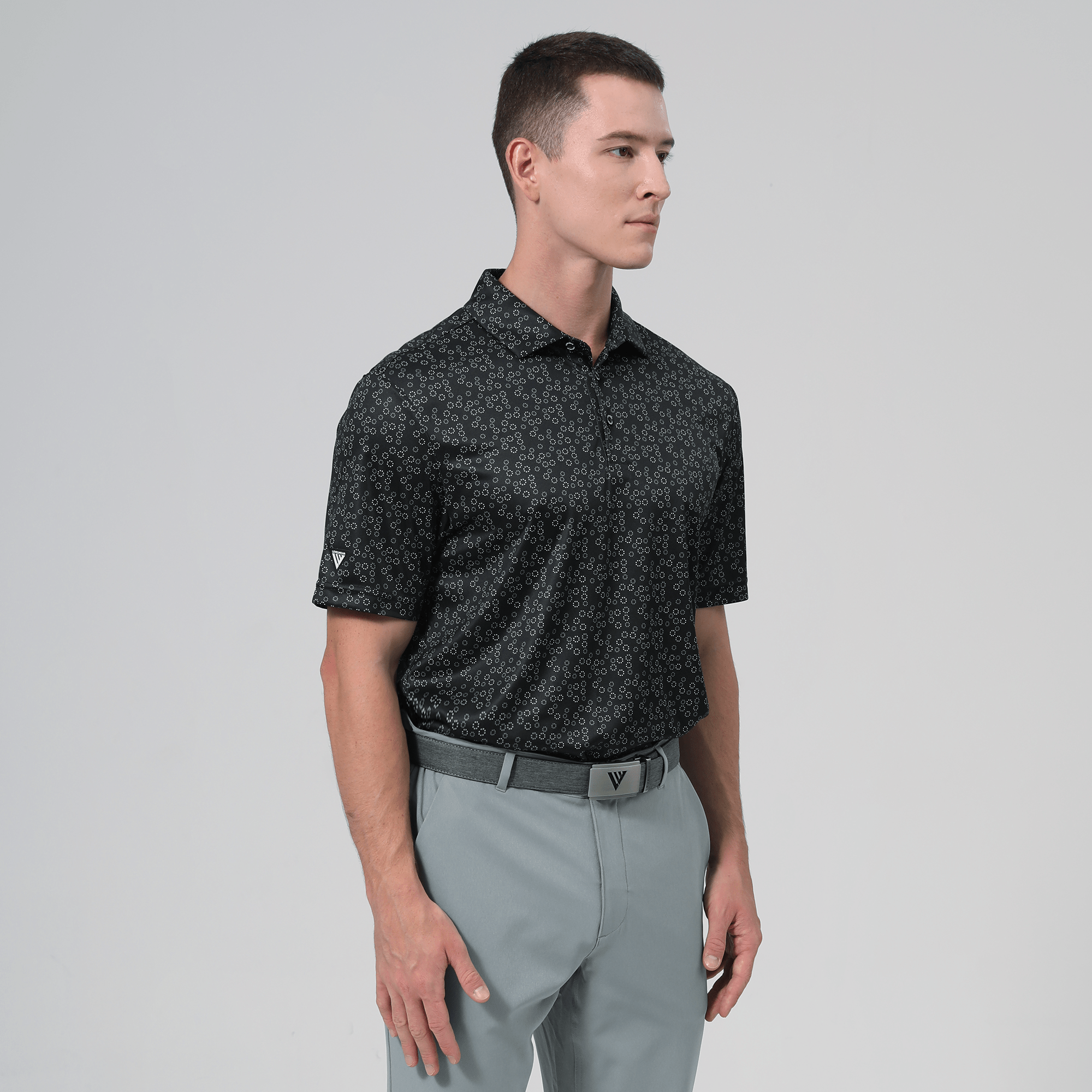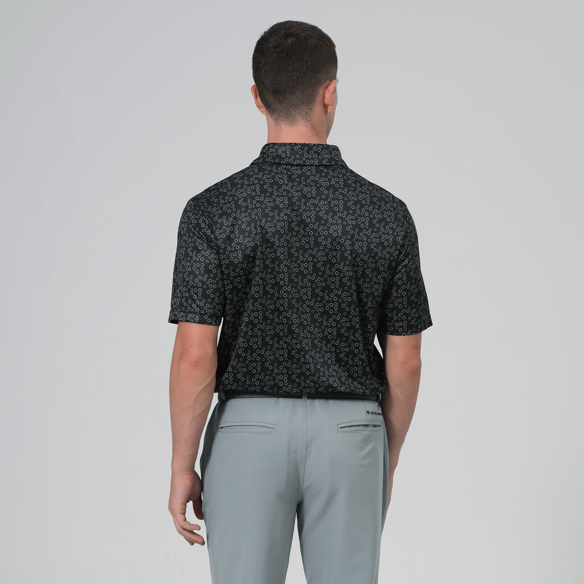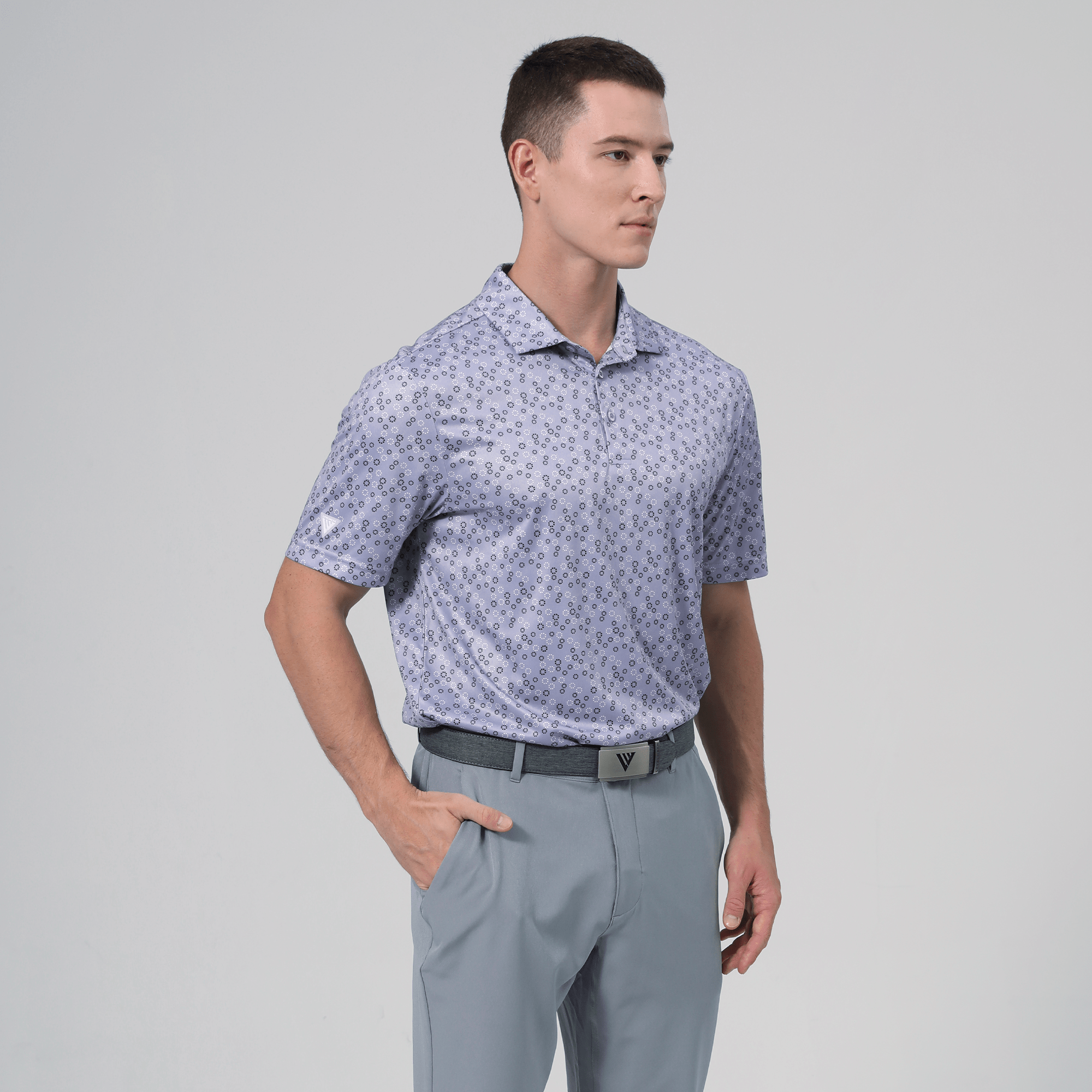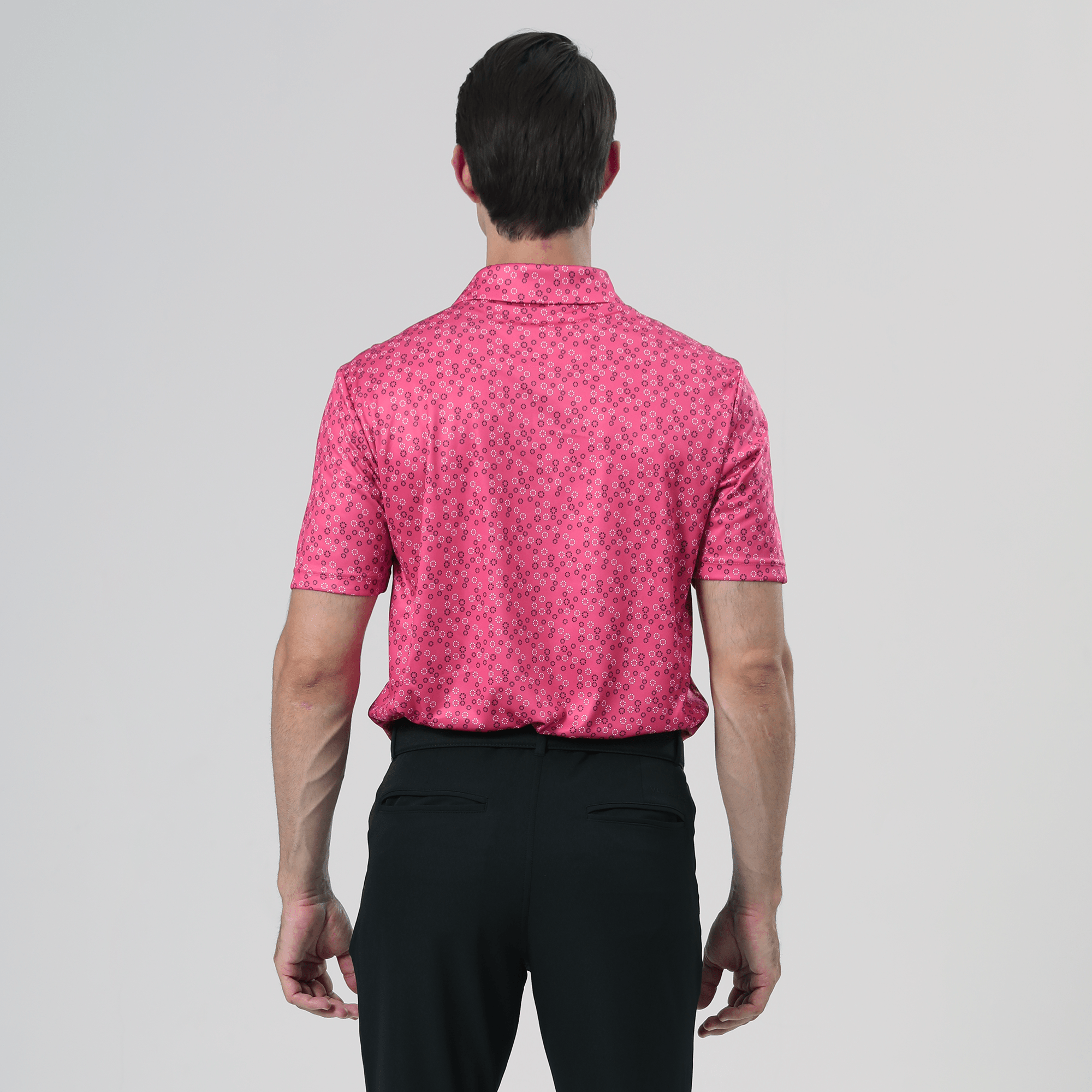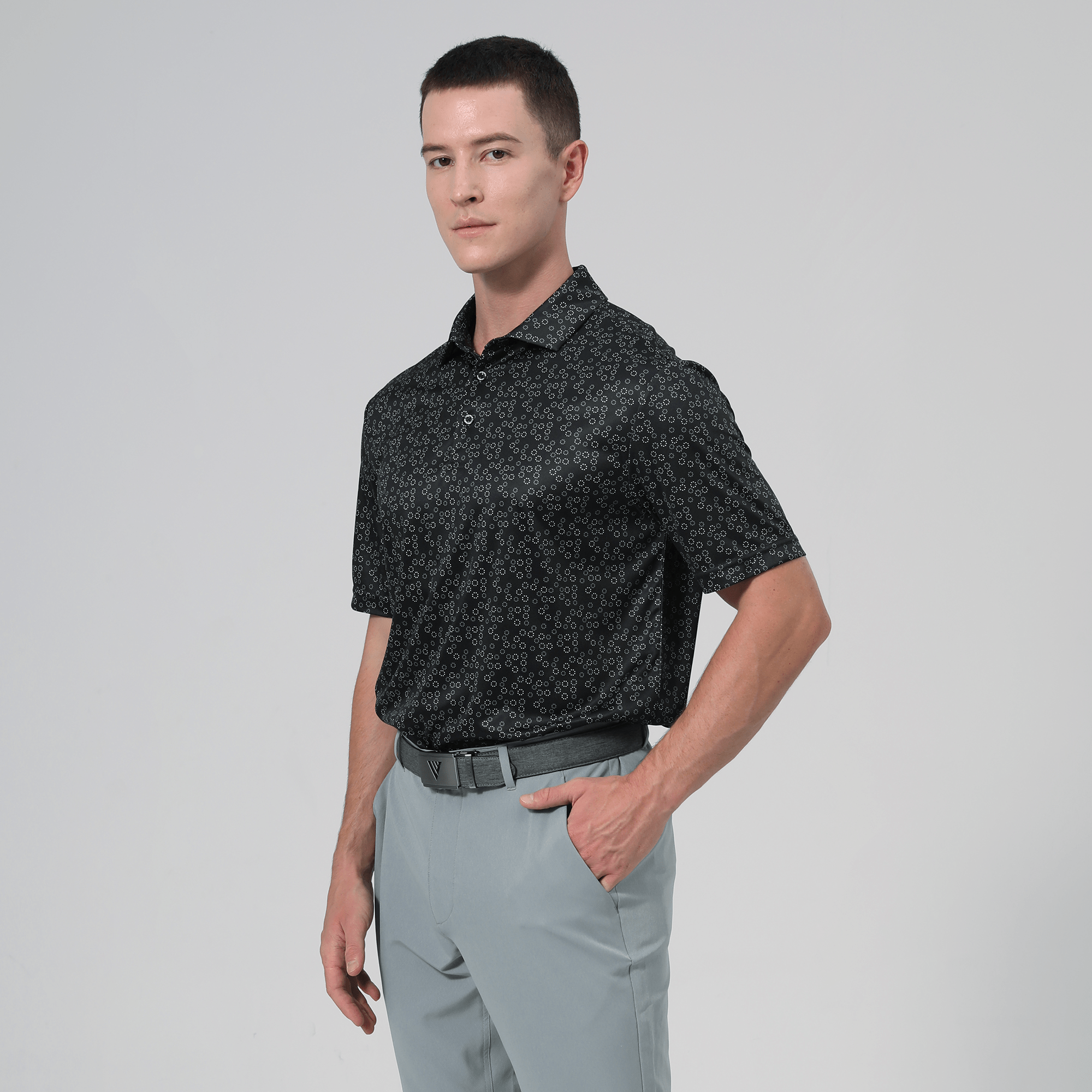 The men's Frost polo is expertly crafted for golfers who demand performance and style on the course. Made from 100% recycled polyester, this polo features advanced moisture-wicking technology that efficiently pulls sweat away from the skin, keeping you cool and dry during your game. The self-fabric collar, equipped with a built-in collar stay, ensures a polished look throughout your swing. Forward shoulder seams provide an enhanced range of motion, allowing for unrestricted movement, while the high-low hem detail with side slits adds a modern touch and extra flexibility. The all-over print lends a unique and stylish flair, making the Frost polo not just functional but also a standout piece in your golf wardrobe. Whether you're teeing off or enjoying a casual day out, this polo combines eco-friendly materials with thoughtful design to keep you looking sharp and feeling great.