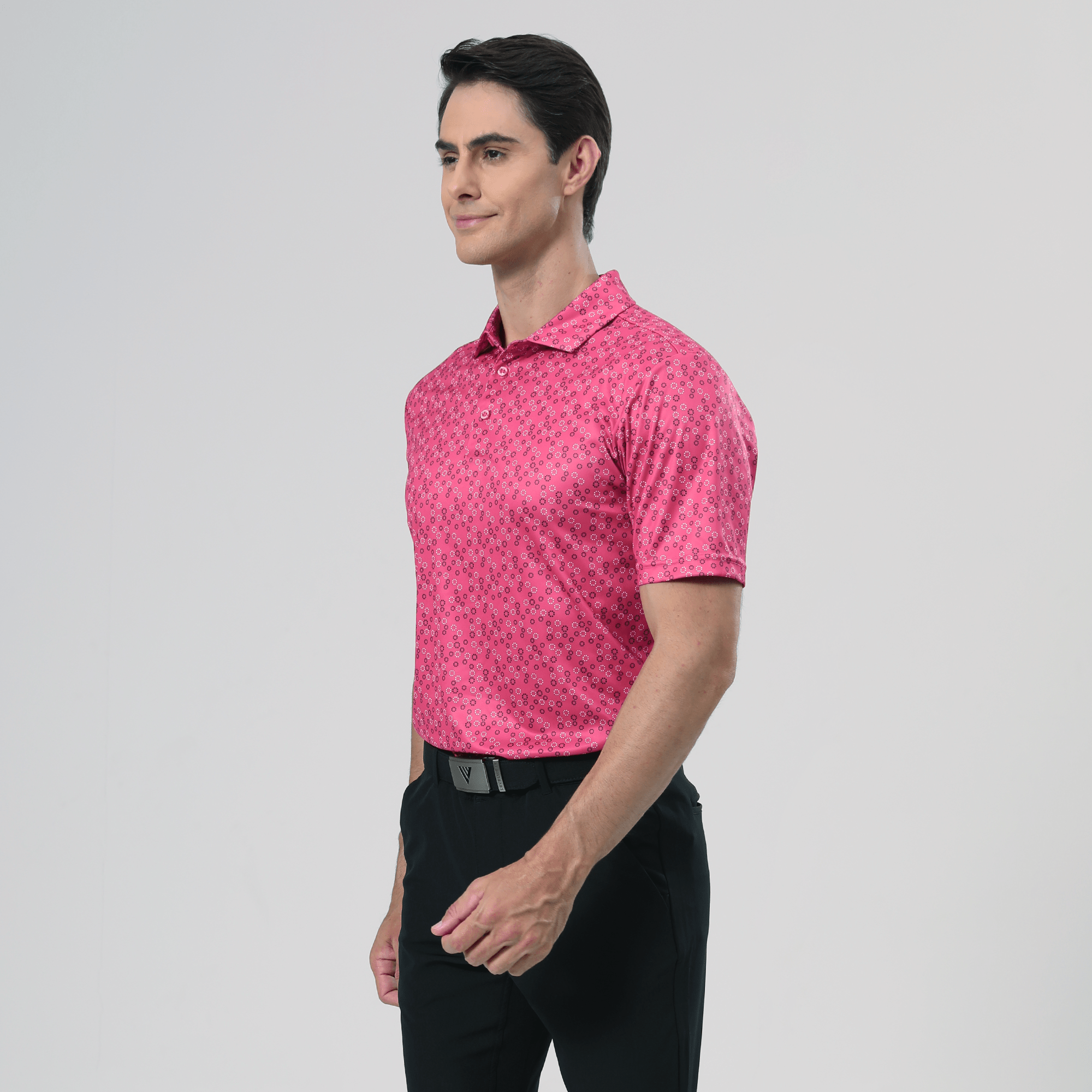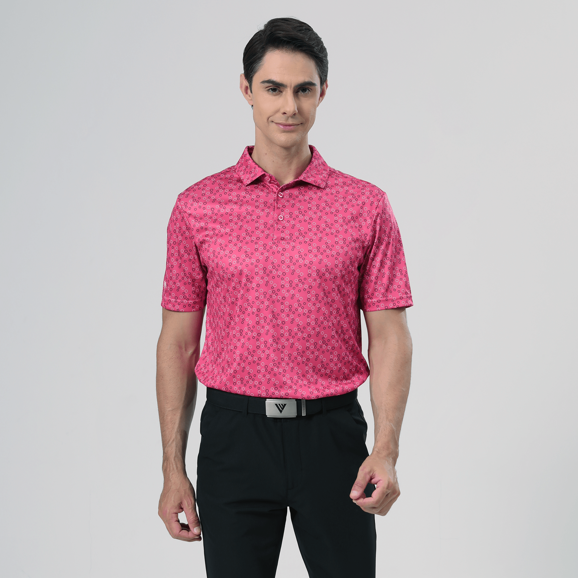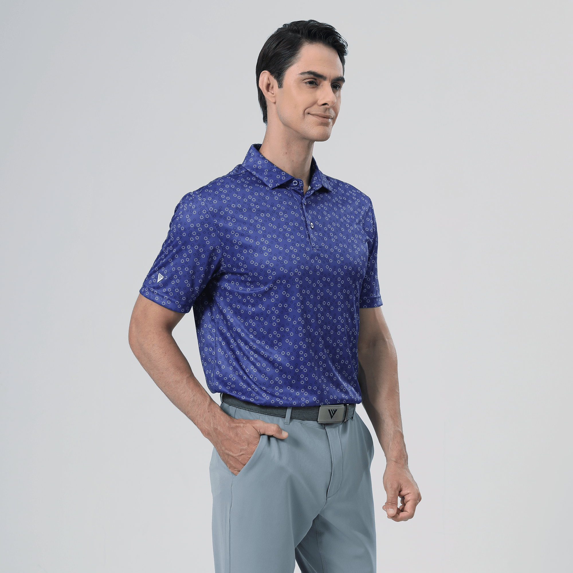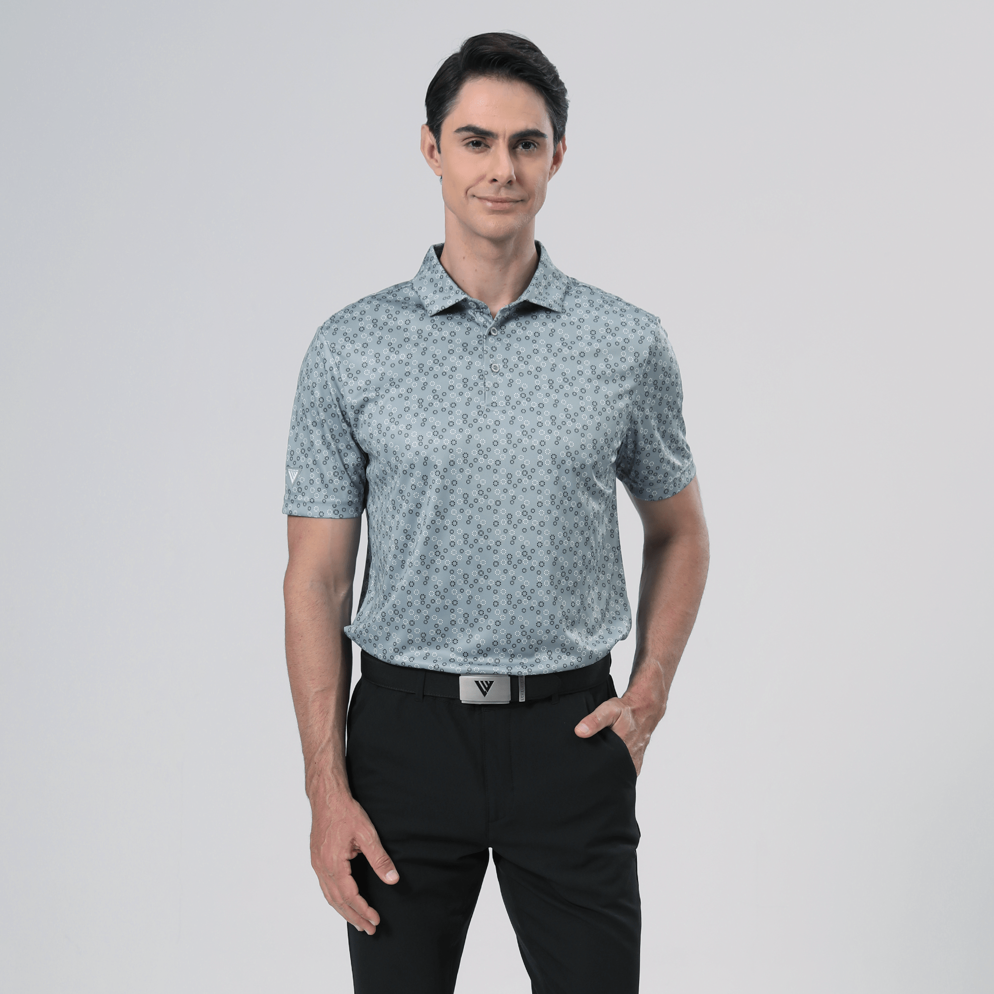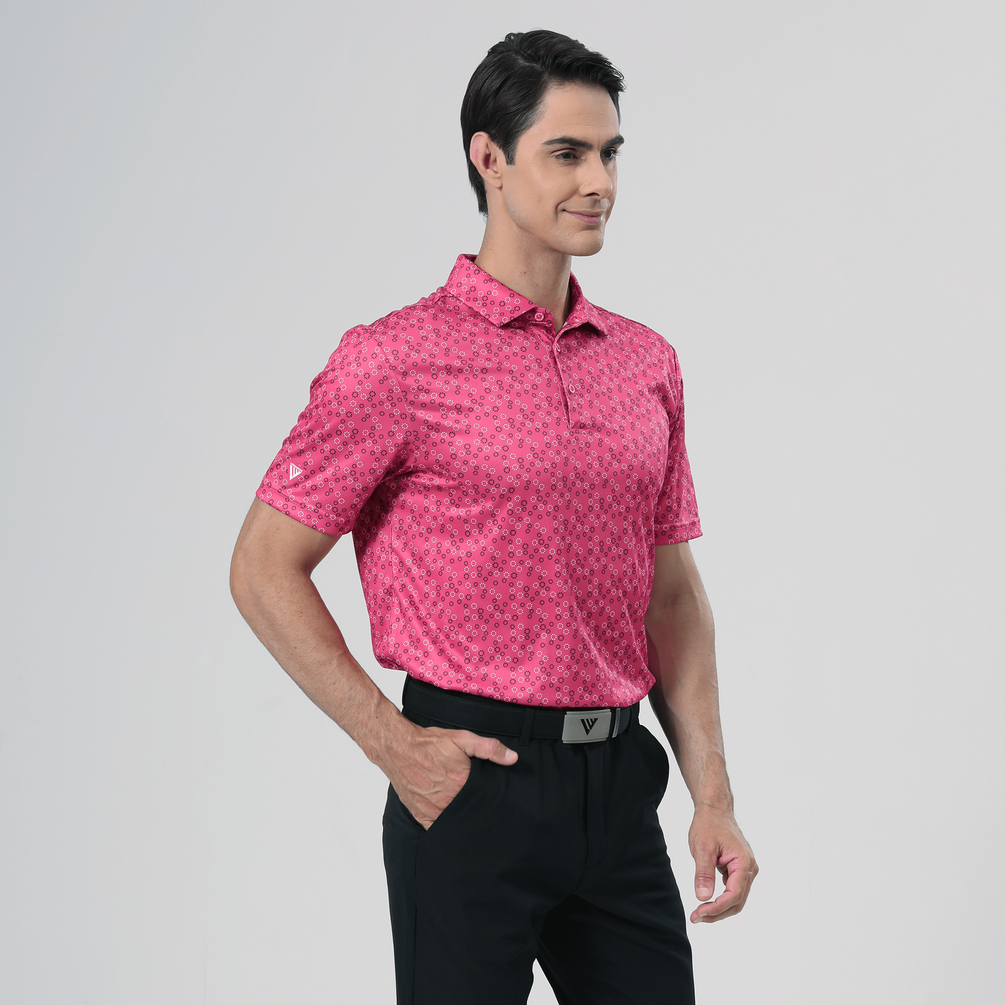 The men's Frost polo is expertly crafted for golfers who demand performance and style on the course. Made from 100% recycled polyester, this polo features advanced moisture-wicking technology that efficiently pulls sweat away from the skin, keeping you cool and dry during your game. The self-fabric collar, equipped with a built-in collar stay, ensures a polished look throughout your swing. Forward shoulder seams provide an enhanced range of motion, allowing for unrestricted movement, while the high-low hem detail with side slits adds a modern touch and extra flexibility. The all-over print lends a unique and stylish flair, making the Frost polo not just functional but also a standout piece in your golf wardrobe. Whether you're teeing off or enjoying a casual day out, this polo combines eco-friendly materials with thoughtful design to keep you looking sharp and feeling great.