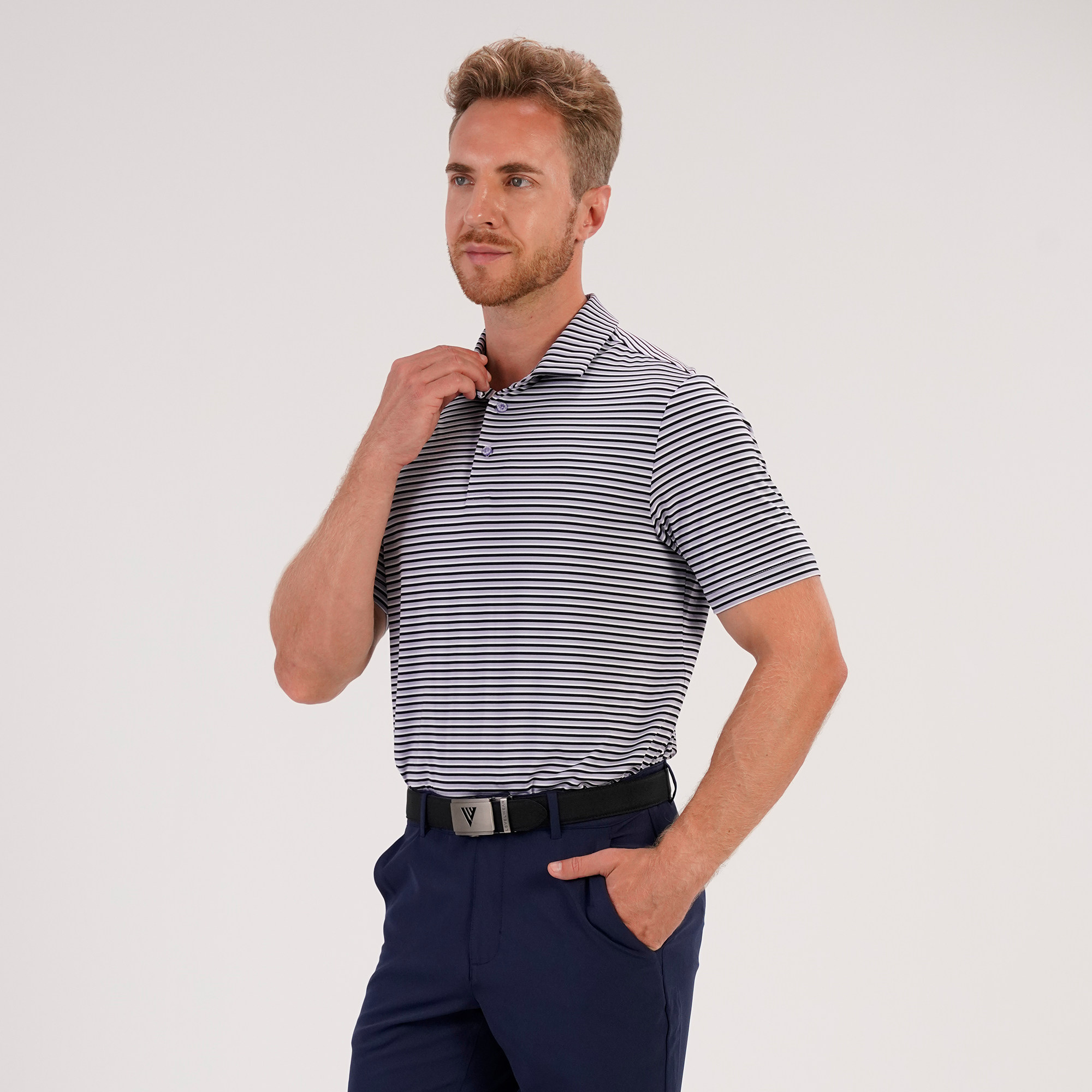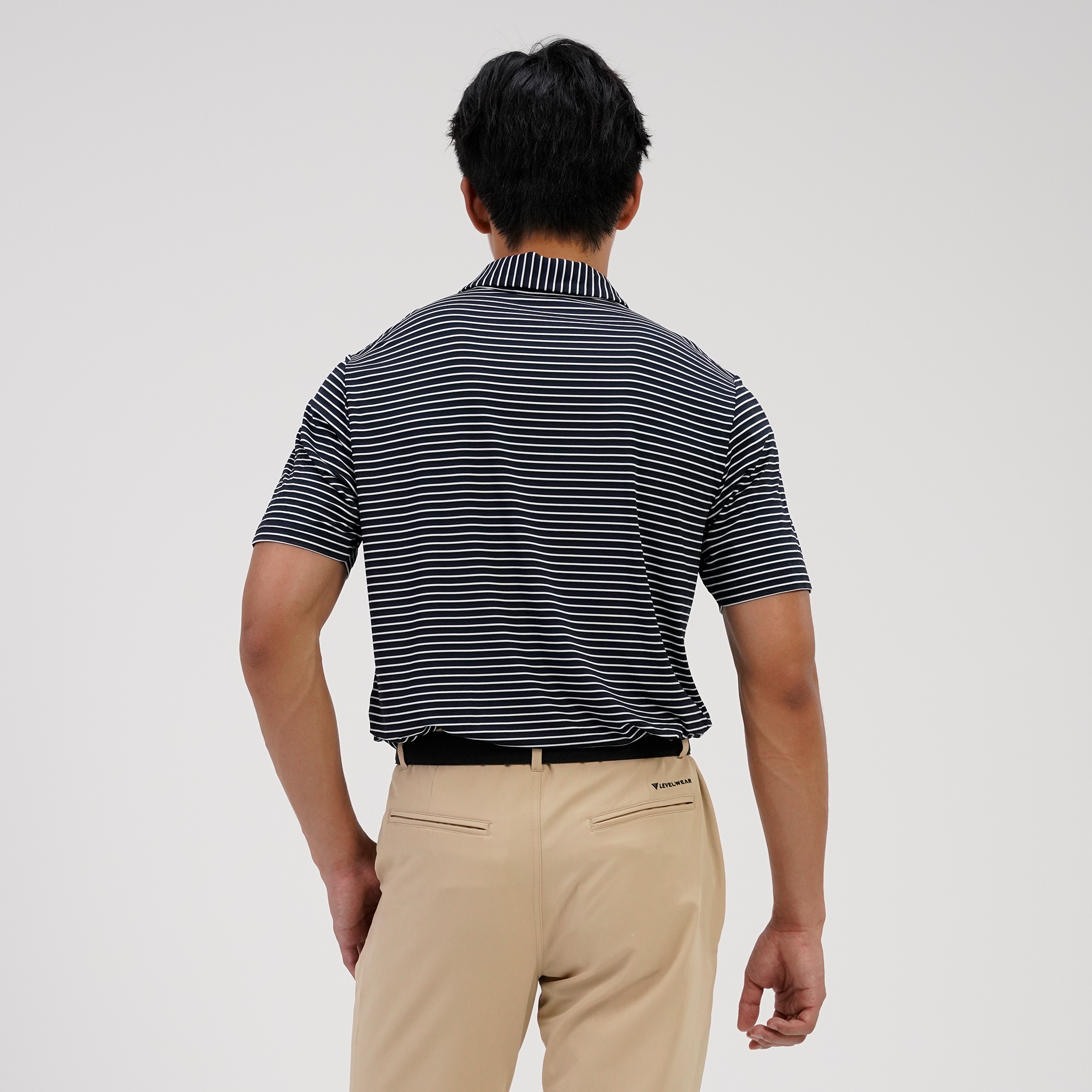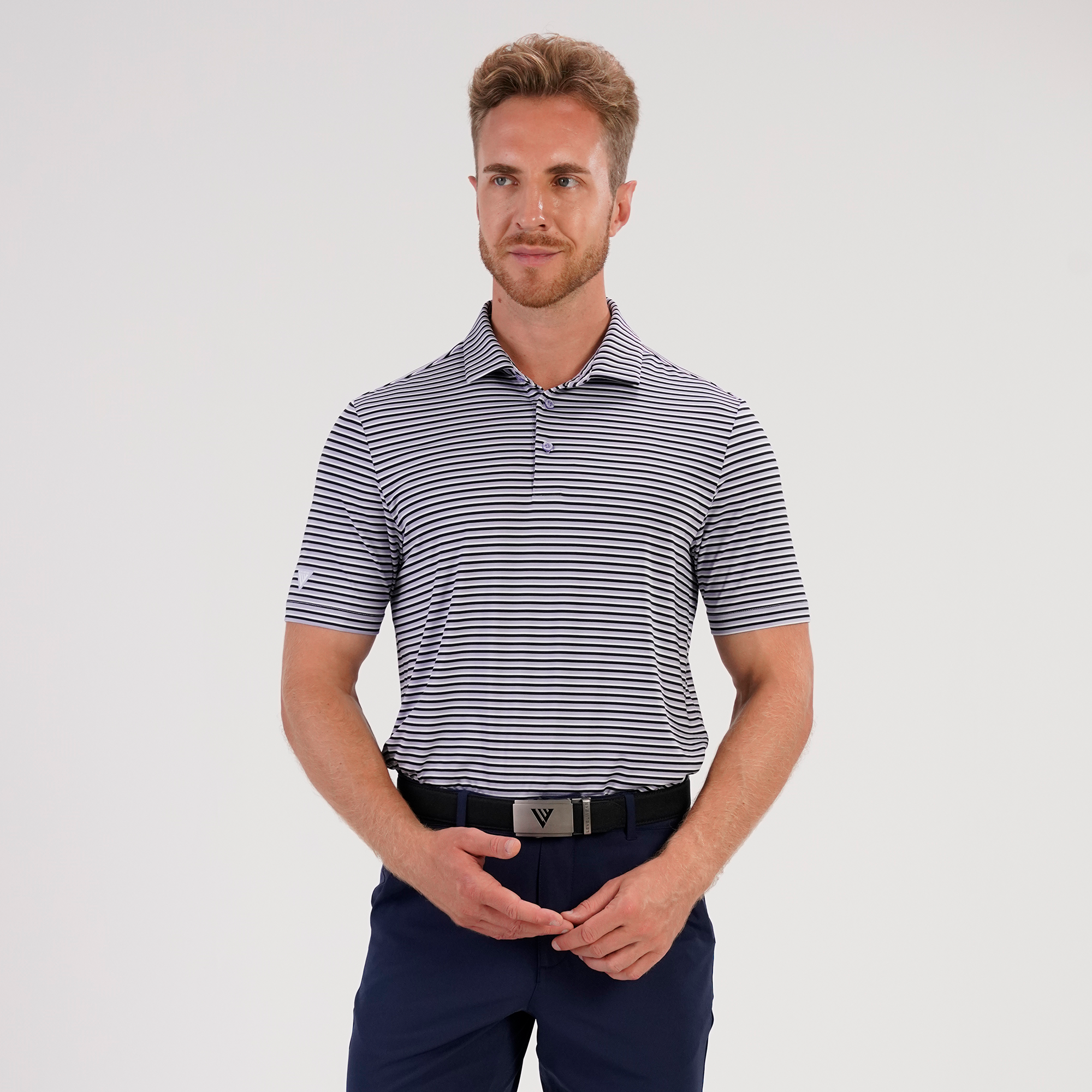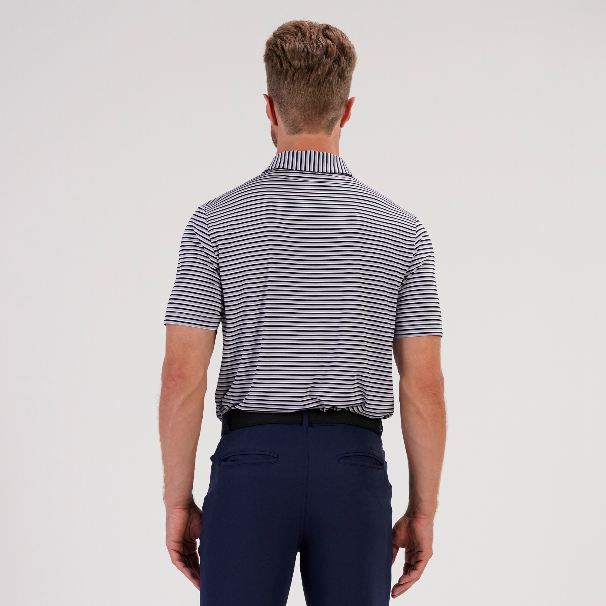 Engineered for comfort and performance, the Horize Polo features a breathable, moisture-wicking fabric blend with anti-bacterial properties. Designed with a self-fabric collar and built-in collar stay, forward shoulder seams, and a high-low hem with side slits for mobility. The yarn-dyed stripe pattern adds a clean, modern edge.