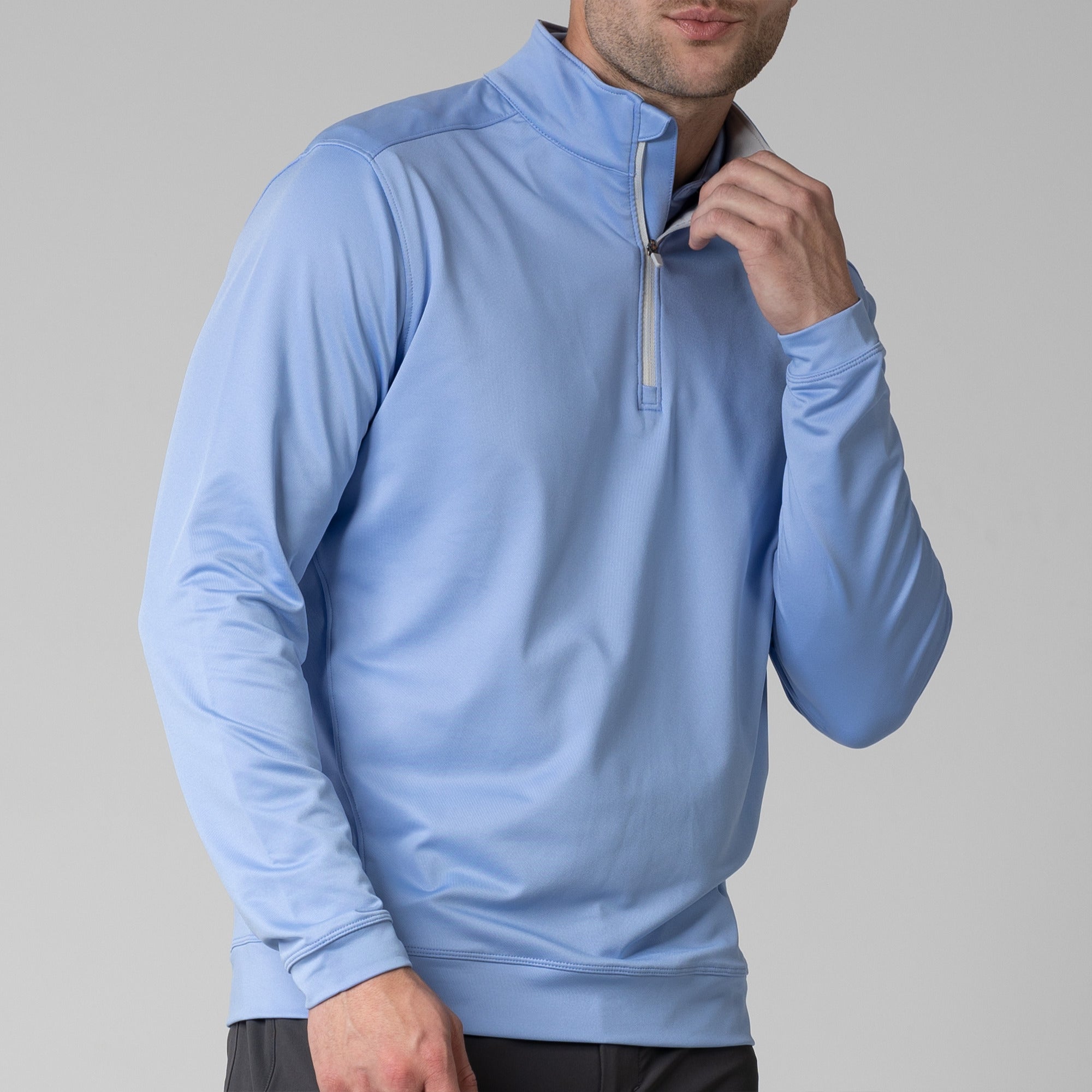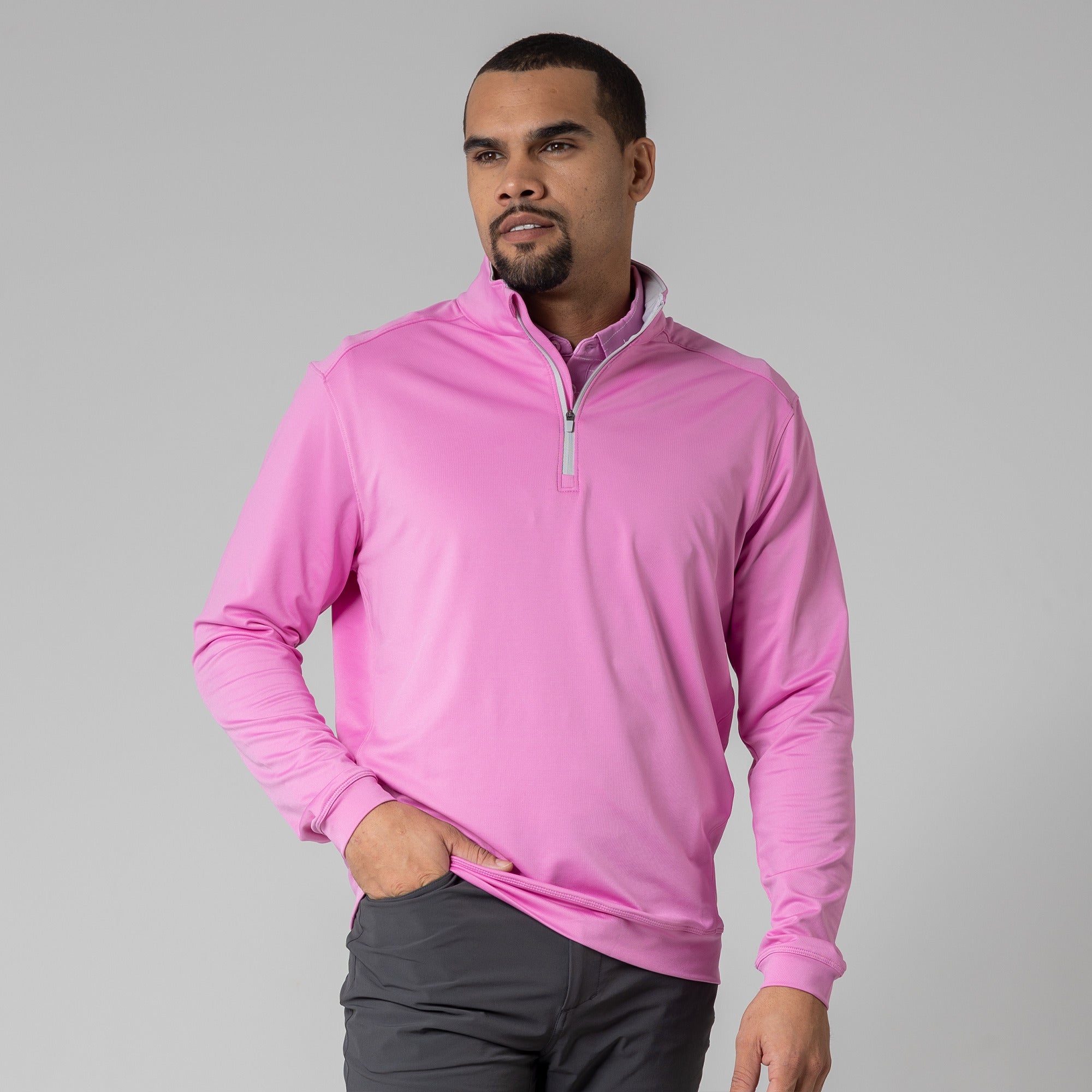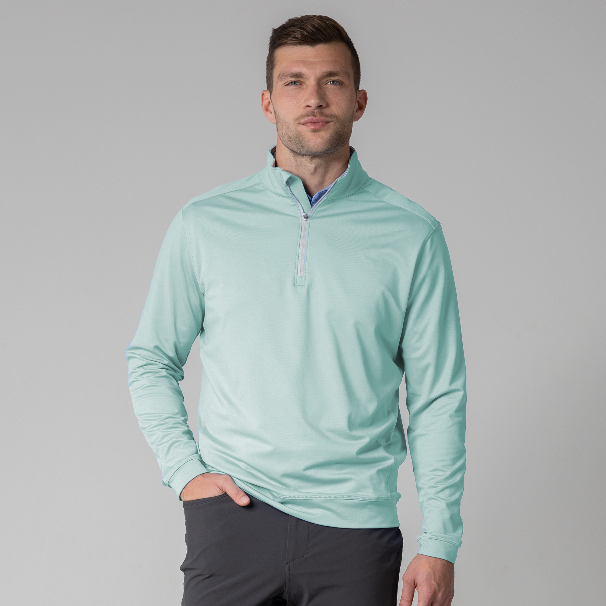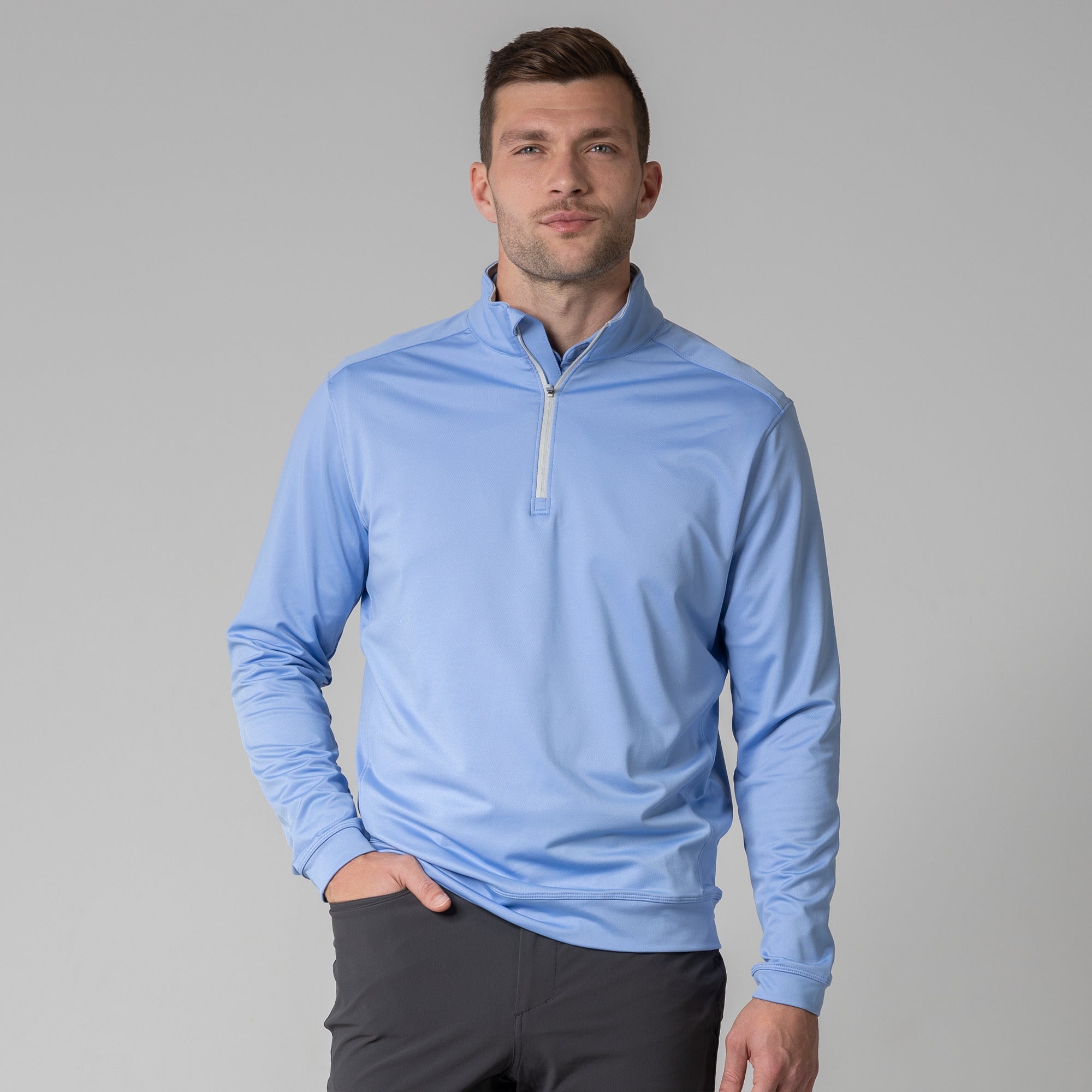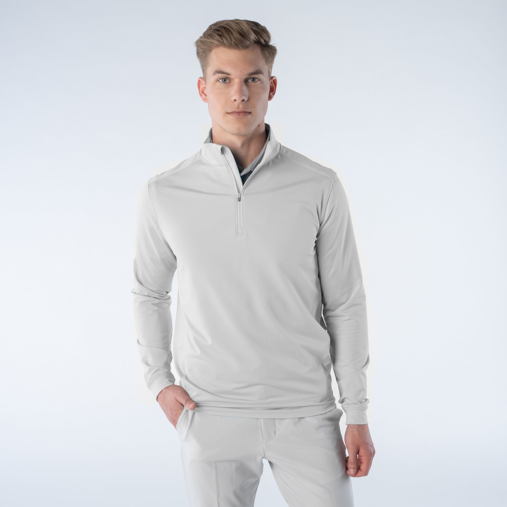Enhance your golf attire with the Direct midlayer, a premium quarter-zip pullover designed for practical use on the course. Crafted from a flexible blend of 92% polyester and 8% elastane, this midlayer ensures ease of movement and comfort during your golf rounds. It features a mock neck with a contrasting inside collar, and a banded hem and cuffs for a secure fit that stays in place through your swings. Perfect for cooler days on the green or casual wear off the course, this pullover is a versatile staple in any golfer's wardrobe.
