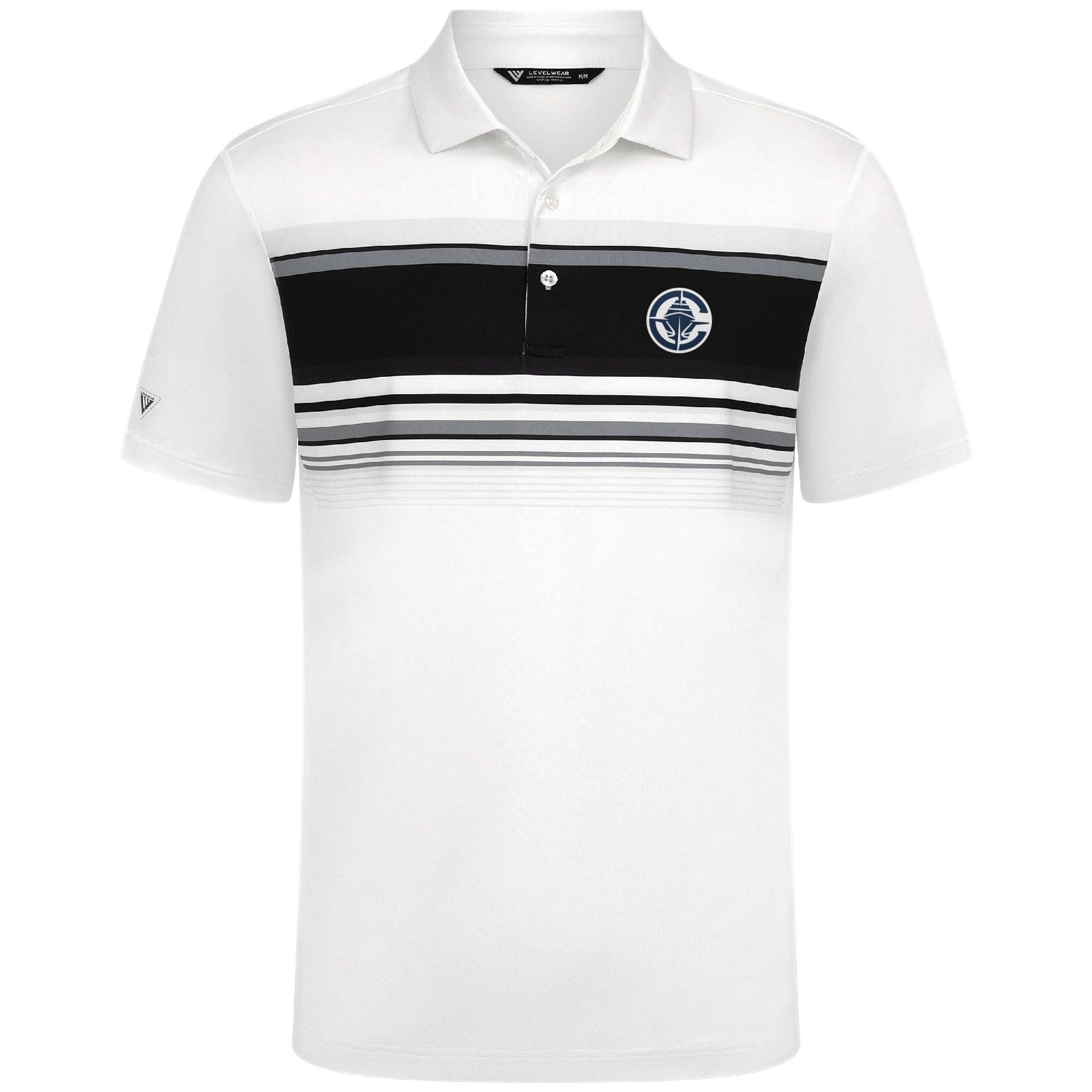 Elevate your game with the Onward men's polo, designed for avid golfers. This shirt features UPF50+ protection and moisture-wicking technology to keep you dry and shielded on sunny days. Its anti-bacterial properties ensure lasting freshness during play. The stylish stripe print across the front chest and a neat self-fabric collar with a built-in collar stay enhance its sophisticated and classic appearance. Tailored with a high-low hem and side slits for greater mobility, this polo is made from 92% recycled polyester and 8% spandex, blending eco-conscious fashion with functional design.