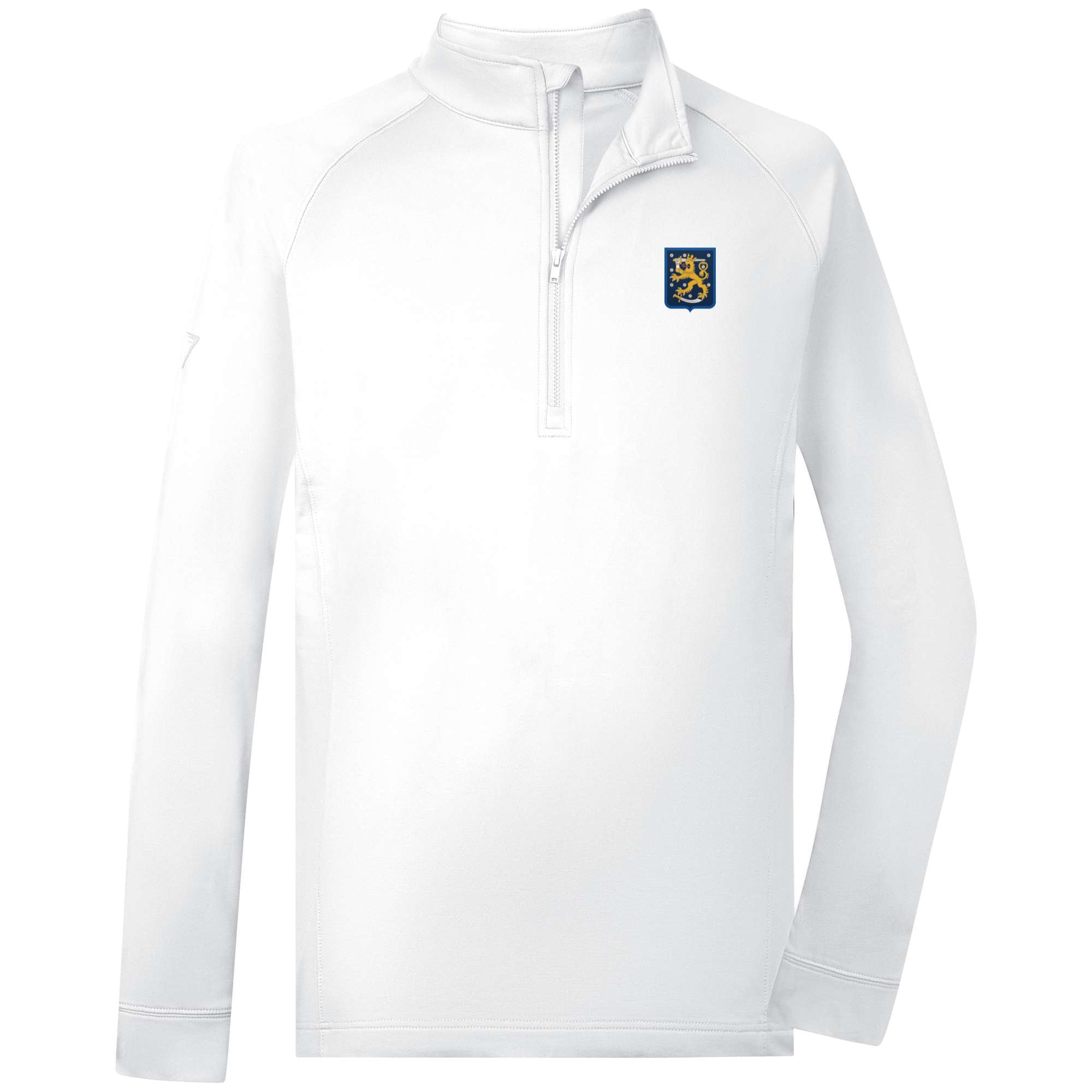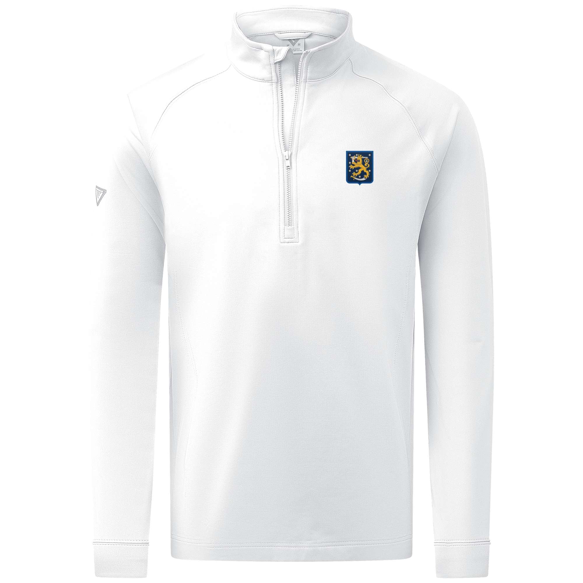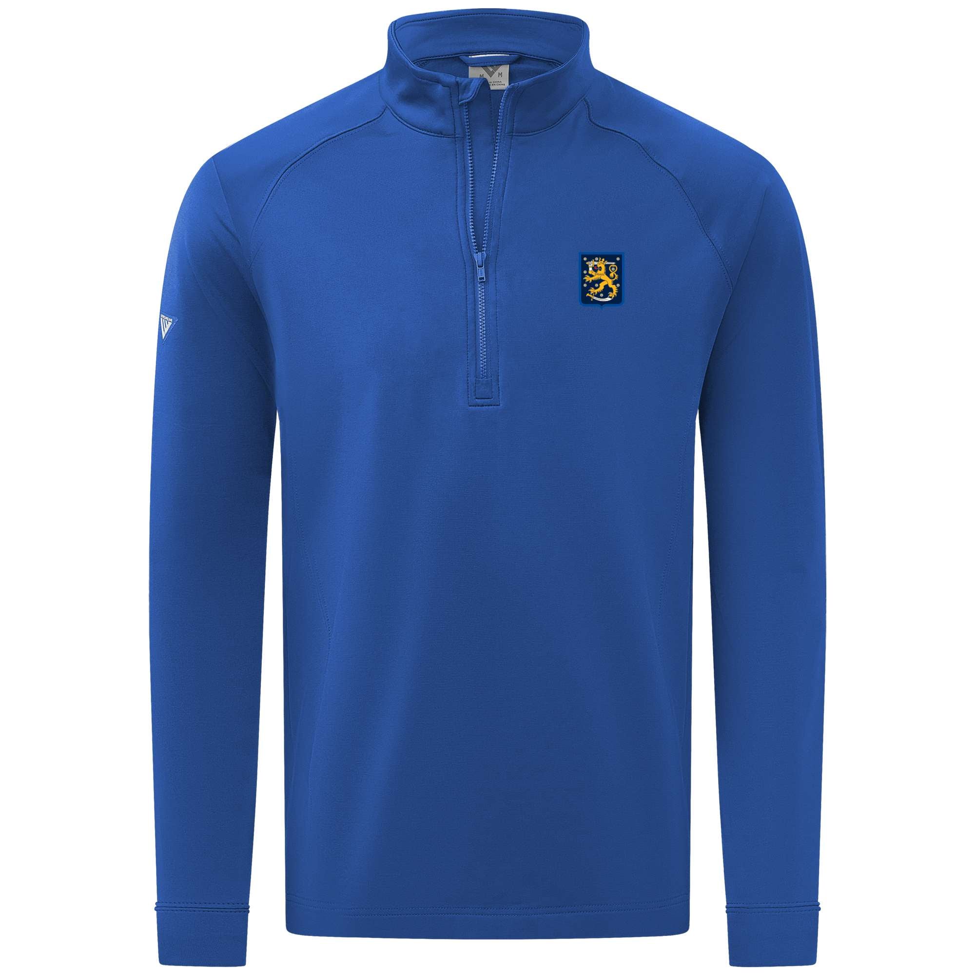 Experience the unexpected warmth of the Calibre mid-layer, a men's mid-weight quarter-zip pullover that combines enhanced functionality with refined simplicity. This garment features a mock neck topped with a durable vislon zipper and is crafted with raglan sleeves to facilitate unrestricted movement. The interior is brushed for a supremely comfortable feel. It is tailored with banded cuffs for a snug fit, engineered side panels for a streamlined look, and underarm perforated venting holes for optimal breathability, ensuring that it keeps you warm without sacrificing comfort or mobility.