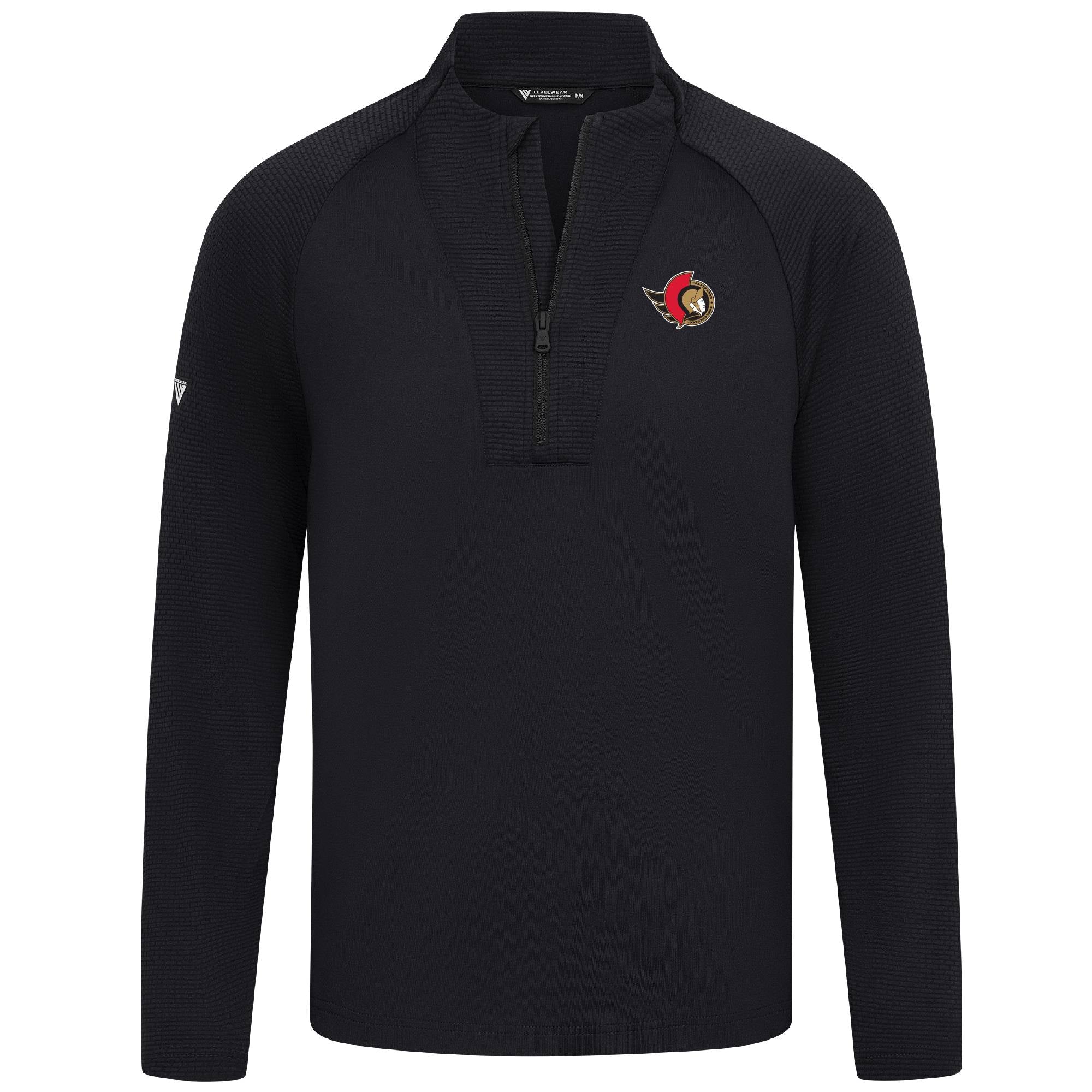Level up your activewear with the dynamic design of our latest quarter-zip, crafted from 100% polyester for durability and comfort. This top features moisture-wicking technology to ensure you stay dry and comfortable during intense activities, whether you're hitting the gym, golf course or the trails. The unique brick pattern contrast on the sleeves, collar, and zipper guard adds a bold touch to the classic design. The quarter-zip with a stand-up collar allows for easy temperature regulation and a stylish fit, while forward side seams and a high-low hem detail enhance the silhouette, offering both freedom of movement and a flattering fit. Raglan sleeves complete the design, providing an athletic appearance and additional mobility. This versatile piece is perfect for anyone looking to combine function and style in their workout wardrobe.